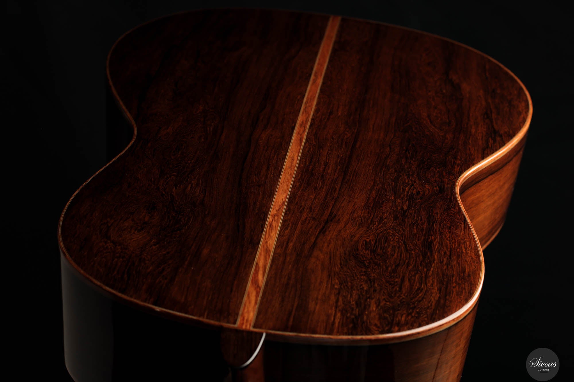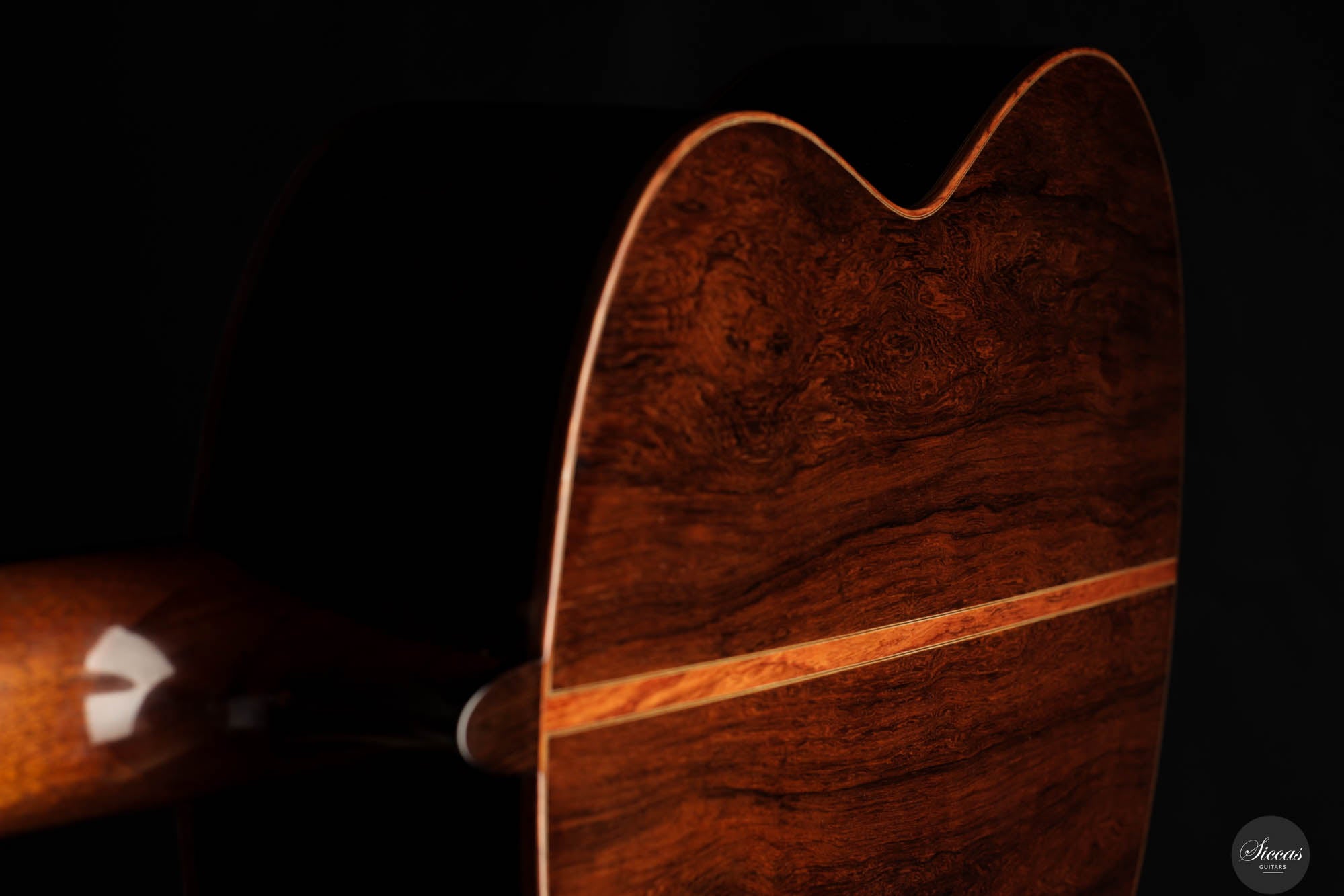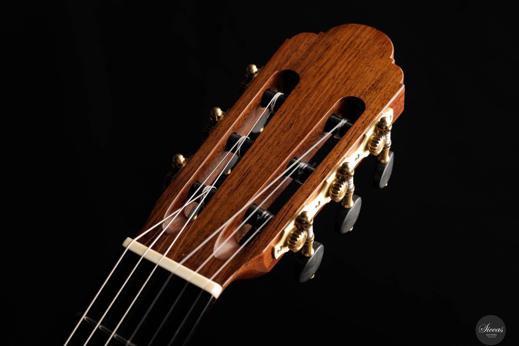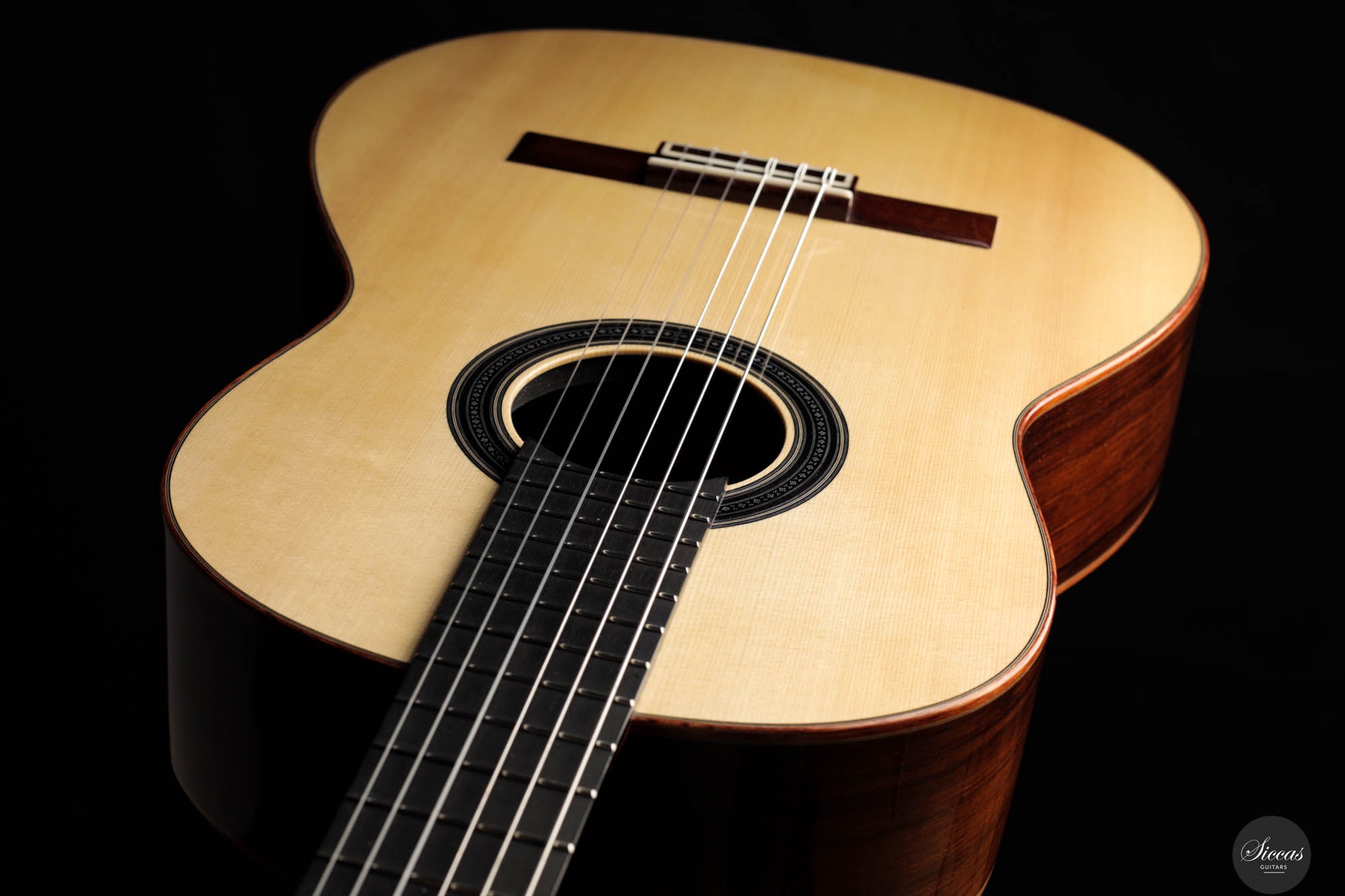 Diese brandneue Gitarre, gefertigt von Hugues Boivin, verkörpert die akribische Liebe zum Detail und die künstlerische Ausdruckskraft, die seine Arbeit auszeichnet. Hugues, bekannt für seine Präzision und seinen Perfektionismus, hat eine Gitarre geschaffen, die nicht nur geschmackvolle Verzierungen aufweist, sondern auch eine präzise Handwerkskunst. Sie ist traditionell mit 7 Fächerbeleistungen und einem Querbalken hinter dem Steg konstruiert. Die Rosette ist sorgfältig ausgewählt, um die Farbe der Fichtendecke zu ergänzen, was die ästhetische Anziehungskraft erhöht. Die Verwendung von auffälligem Madagaskar-Rosenholz steigert weiterhin den Luxus und Wert der Gitarre. Akustisch ist die Gitarre ausgewogen, mit den klaren, gleichmäßigen Höhen, die für französische Gitarren typisch sind, und liefert einen eleganten Klang, den Musiker zu schätzen wissen.