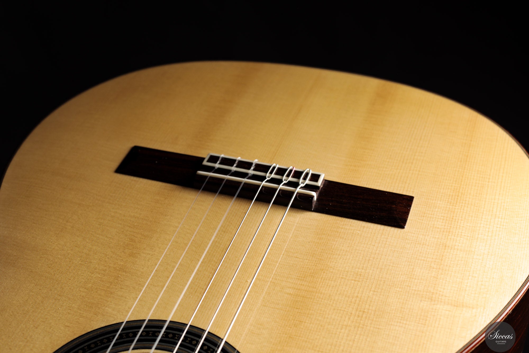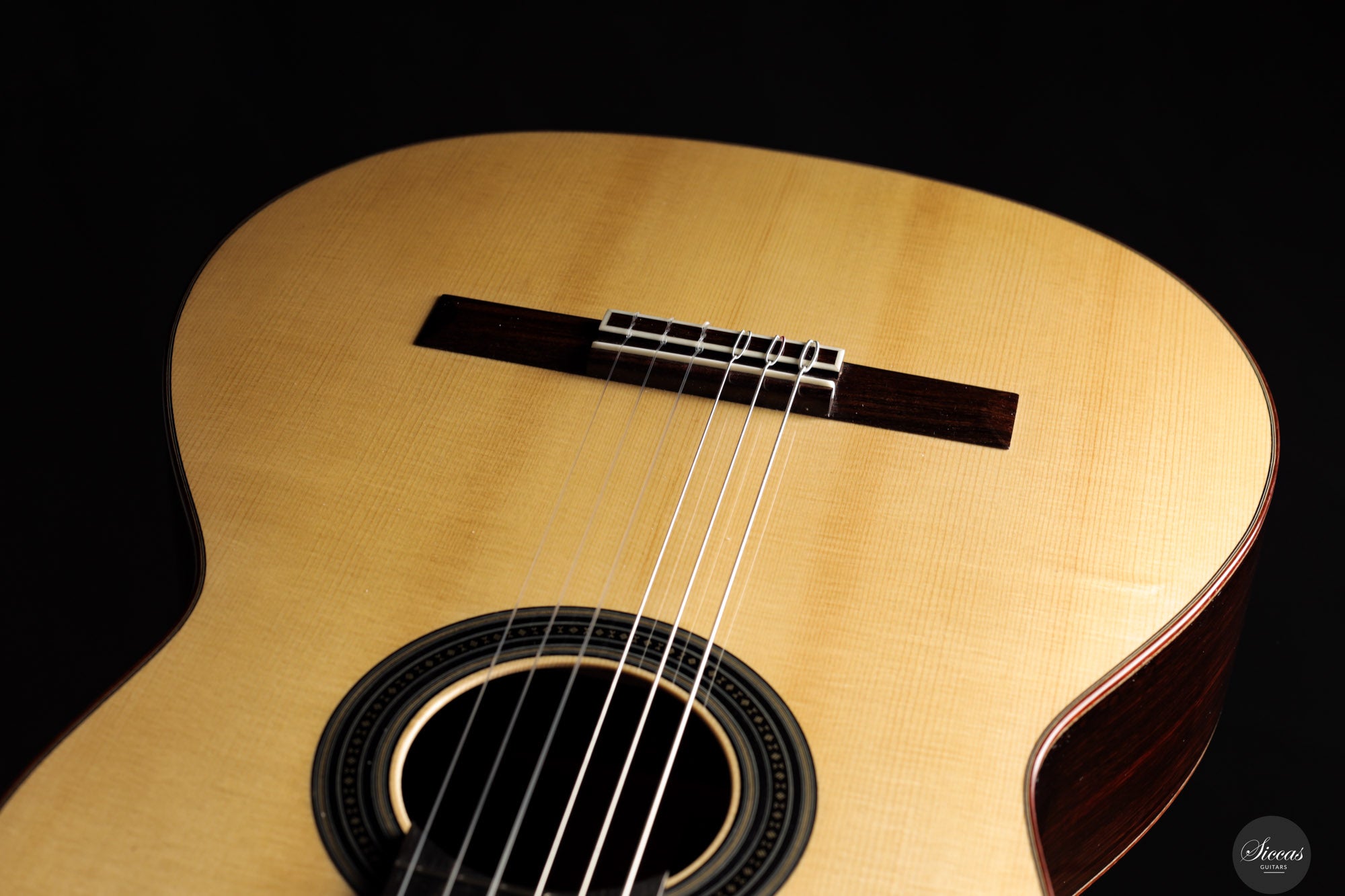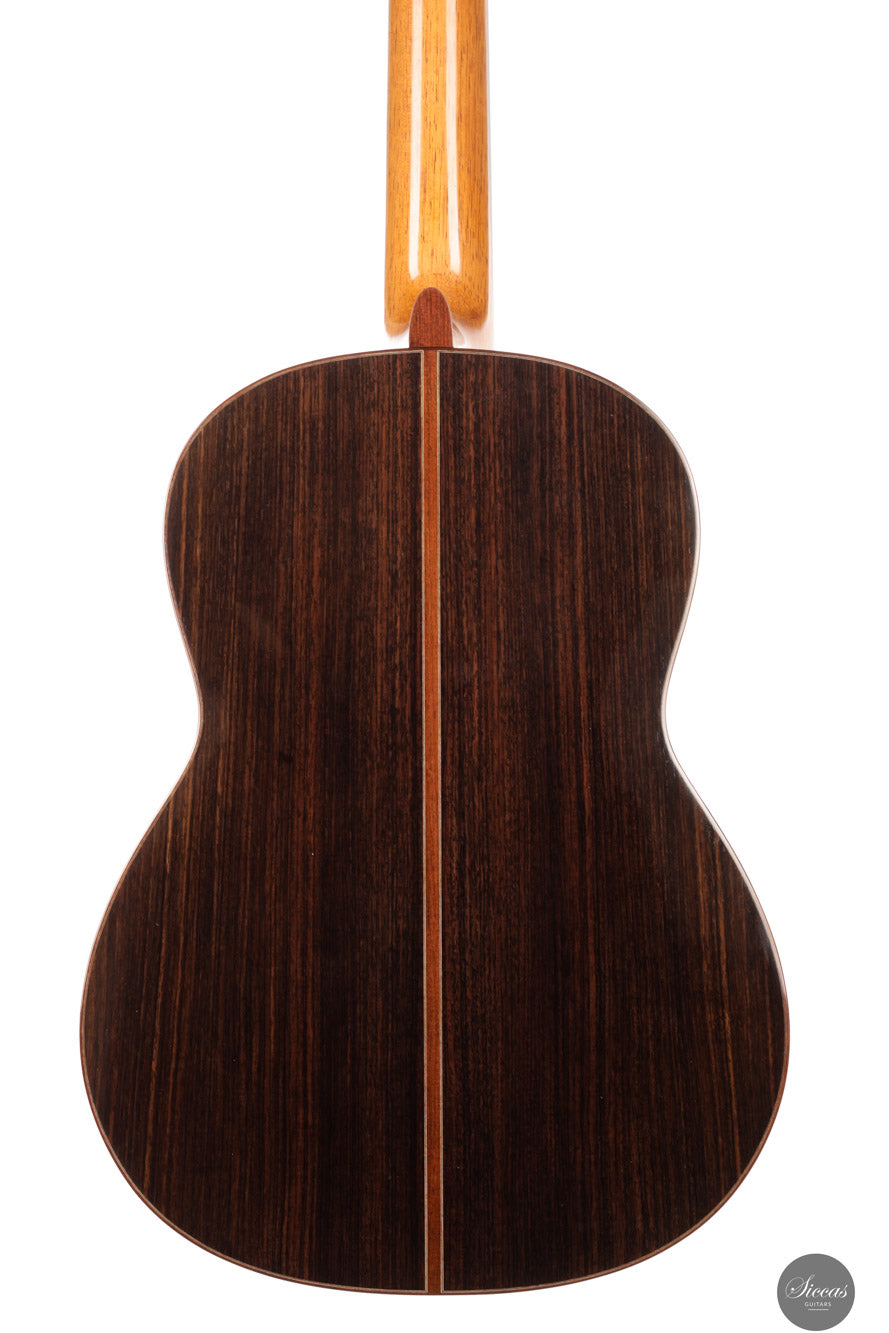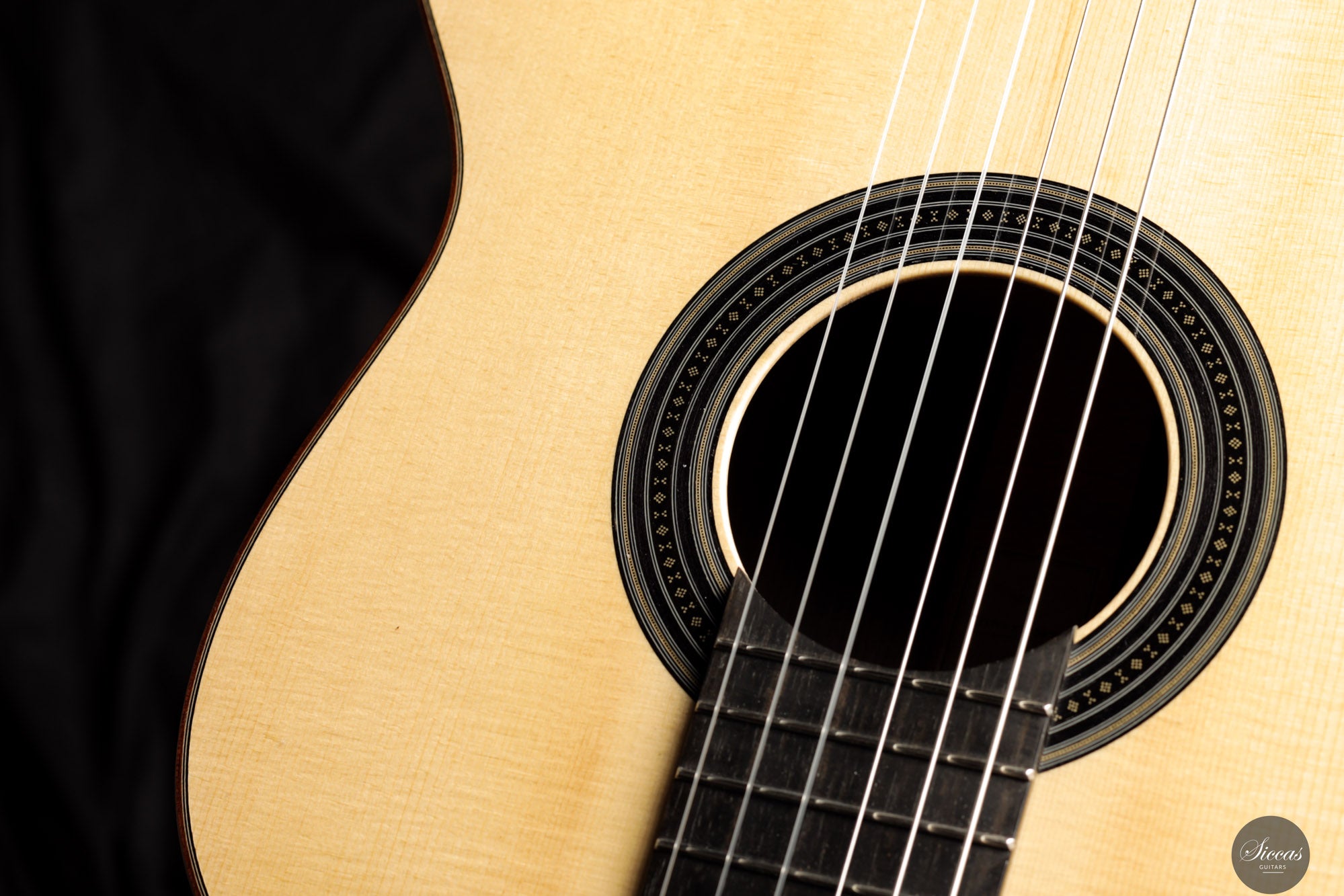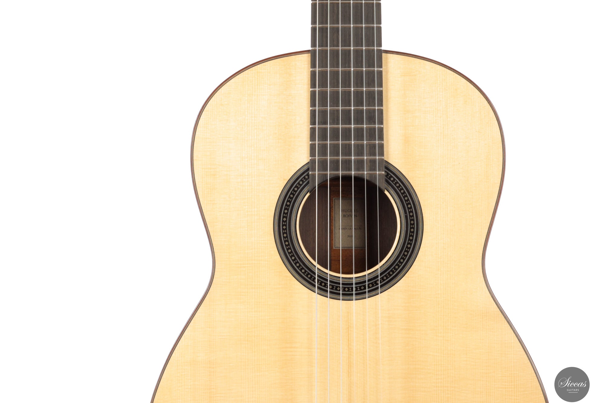 Diese Konzertgitarre, vollendet im Jahr 2025, wurde nach traditionellen Methoden gebaut und spiegelt Hugues Boivins disziplinierte, detailorientierte Herangehensweise wider. Die Konstruktion folgt einem klassischen Fächerbeleistungssystem mit sieben Fächerleisten und einem Querbalken hinter der Brücke, was sowohl Stabilität als auch klangliche Klarheit bietet. Die Fichtendecke ist mit Zargen und Boden aus indischem Palisander kombiniert – eine bewährte Verbindung, die artikulierte Höhen und einen klar definierten Bass hervorbringt. Die Rosette wurde mit Sorgfalt ausgewählt und harmoniert optisch mit der Farbe und Textur der Decke. Die Schellackpolitur betont die natürliche Maserung und schafft eine akustisch reaktionsfreudige Oberfläche. Der Hals besitzt eine Sattelbreite von 51,5 mm und eine Mensur von 650 mm, was für traditionelle Spielbarkeit und gleichmäßige Saitenabstände sorgt. Klanglich ist das Instrument ausgewogen und fokussiert. Die Höhen sind klar und kontrolliert, während die Bässe mit Definition statt übermäßiger Resonanz unterstützen. Die Ansprache ist direkt und belohnt präzise Artikulation – ideal für Repertoire, das von Klarheit und dynamischer Kontrolle profitiert. Die Perona-Mechaniken arbeiten präzise und unterstreichen die schlichte Eleganz des gesamten Designs.Regelmäßige Pflege verlängert die Lebensdauer des Instruments