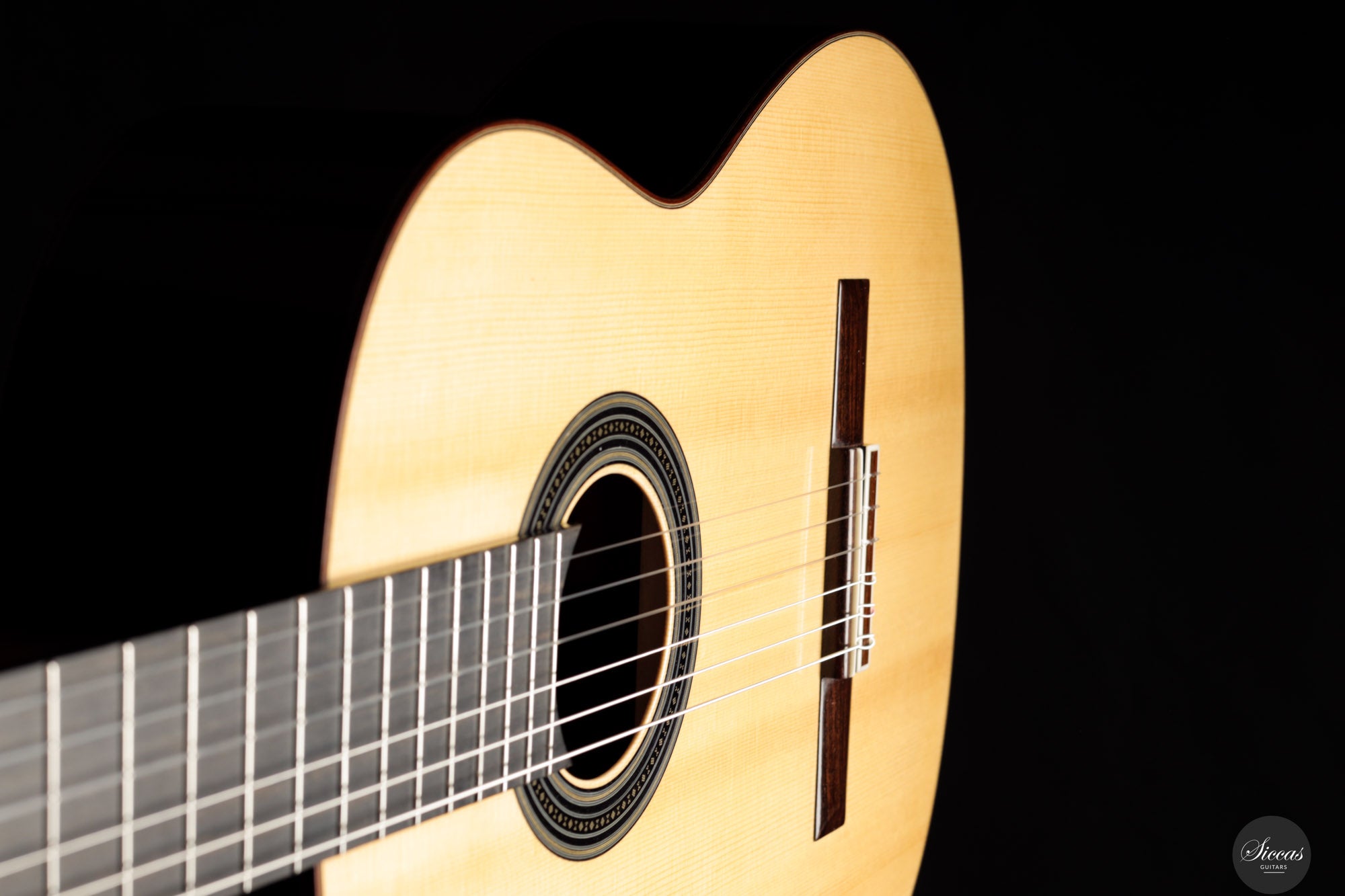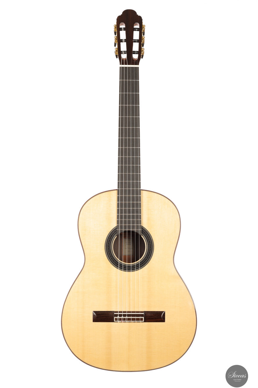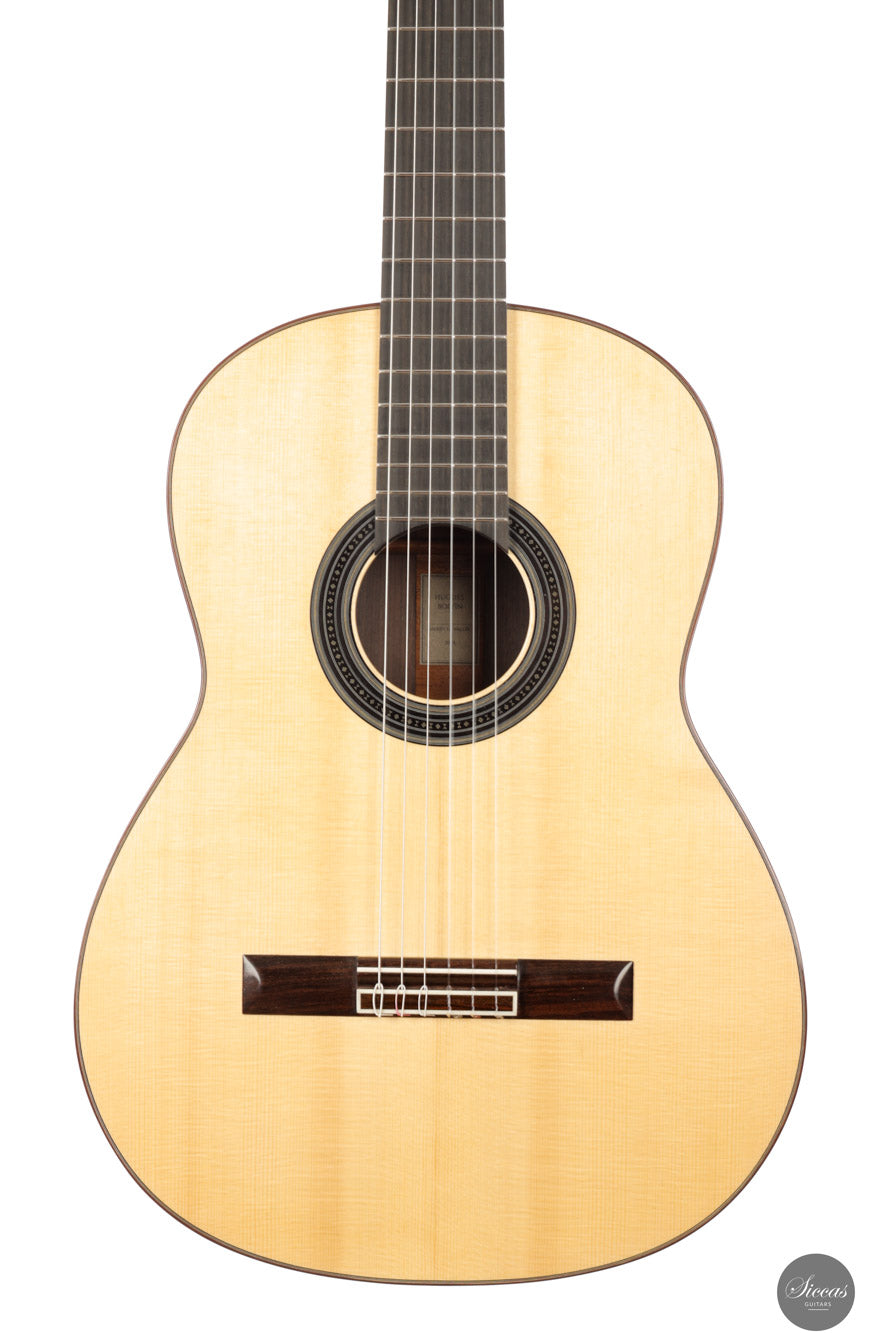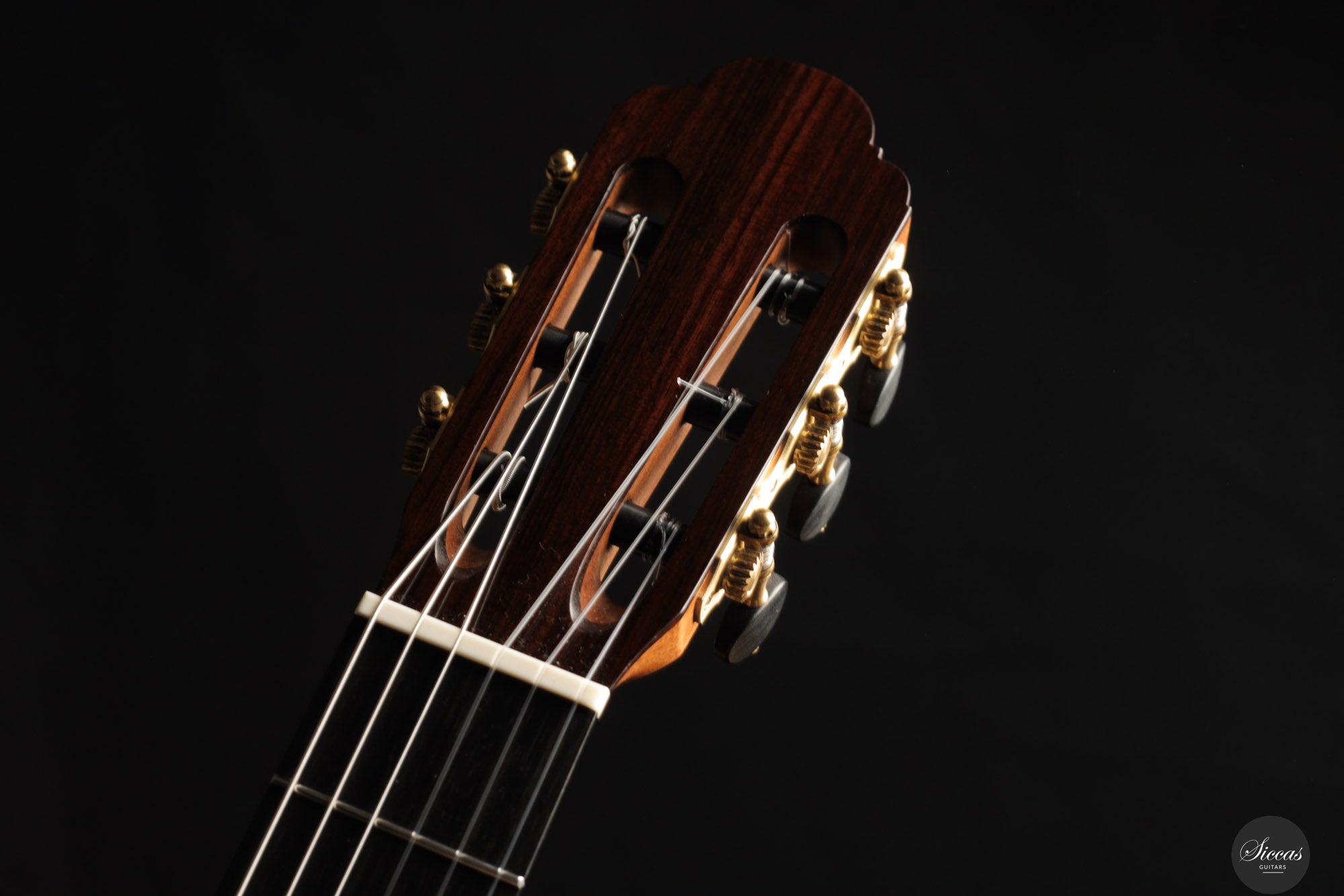 Diese Konzertgitarre, vollendet im Jahr 2025, wurde nach traditionellen Methoden gebaut und spiegelt Hugues Boivins disziplinierte, detailorientierte Herangehensweise wider. Die Konstruktion folgt einem klassischen Fächerbeleistungssystem mit sieben Fächerleisten und einem Querbalken hinter der Brücke, was sowohl Stabilität als auch klangliche Klarheit bietet. Die Fichtendecke ist mit Zargen und Boden aus indischem Palisander kombiniert – eine bewährte Verbindung, die artikulierte Höhen und einen klar definierten Bass hervorbringt. Die Rosette wurde mit Sorgfalt ausgewählt und harmoniert optisch mit der Farbe und Textur der Decke. Die Schellackpolitur betont die natürliche Maserung und schafft eine akustisch reaktionsfreudige Oberfläche. Der Hals besitzt eine Sattelbreite von 51,5 mm und eine Mensur von 650 mm, was für traditionelle Spielbarkeit und gleichmäßige Saitenabstände sorgt. Klanglich ist das Instrument ausgewogen und fokussiert. Die Höhen sind klar und kontrolliert, während die Bässe mit Definition statt übermäßiger Resonanz unterstützen. Die Ansprache ist direkt und belohnt präzise Artikulation – ideal für Repertoire, das von Klarheit und dynamischer Kontrolle profitiert. Die Perona-Mechaniken arbeiten präzise und unterstreichen die schlichte Eleganz des gesamten Designs.Regelmäßige Pflege verlängert die Lebensdauer des Instruments