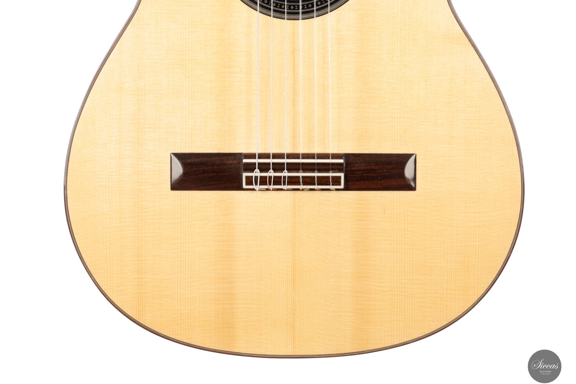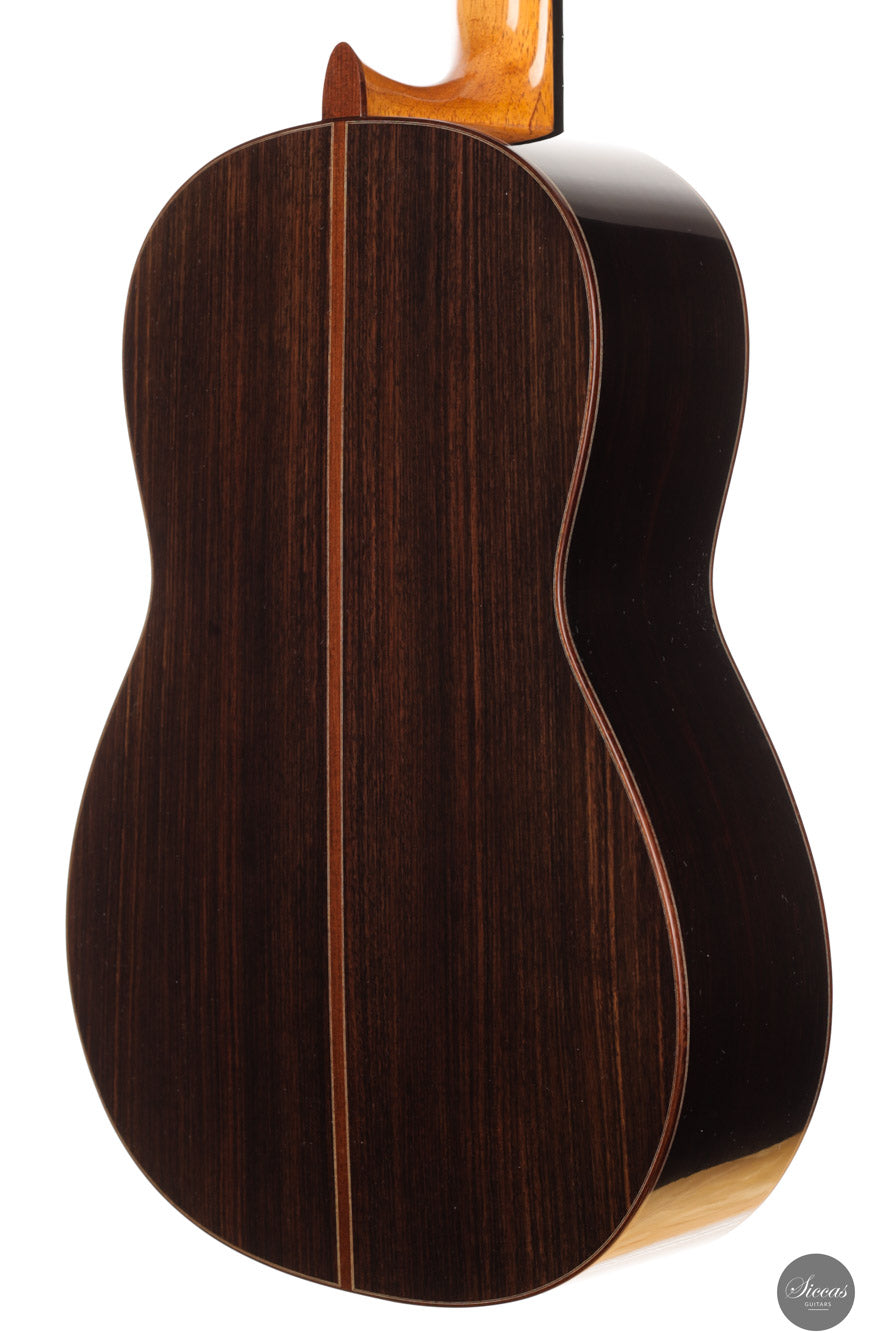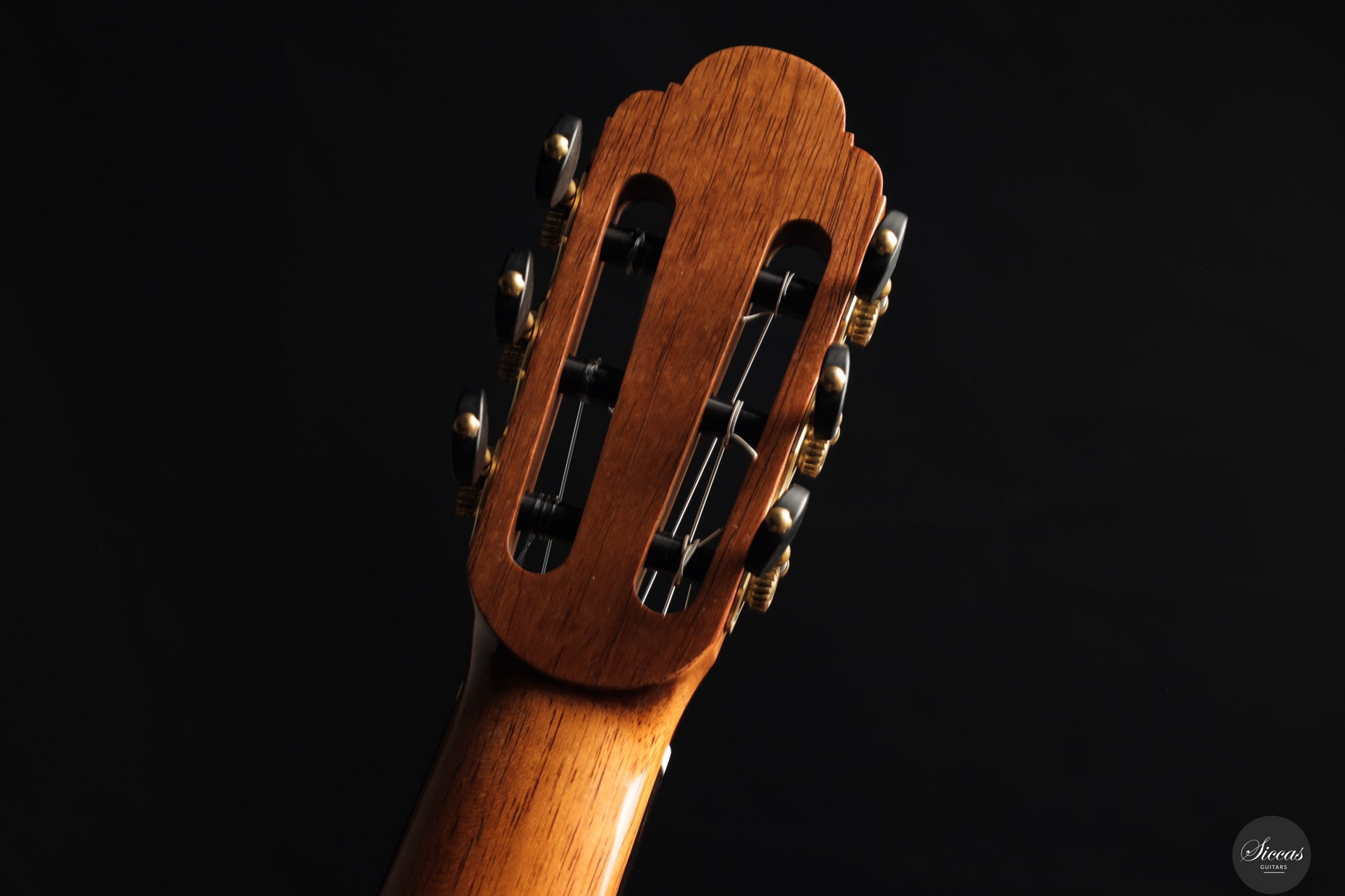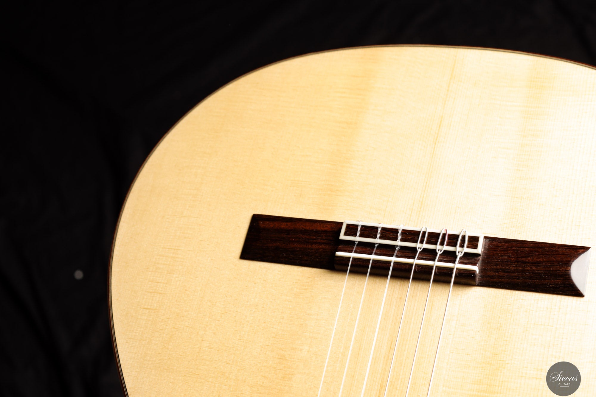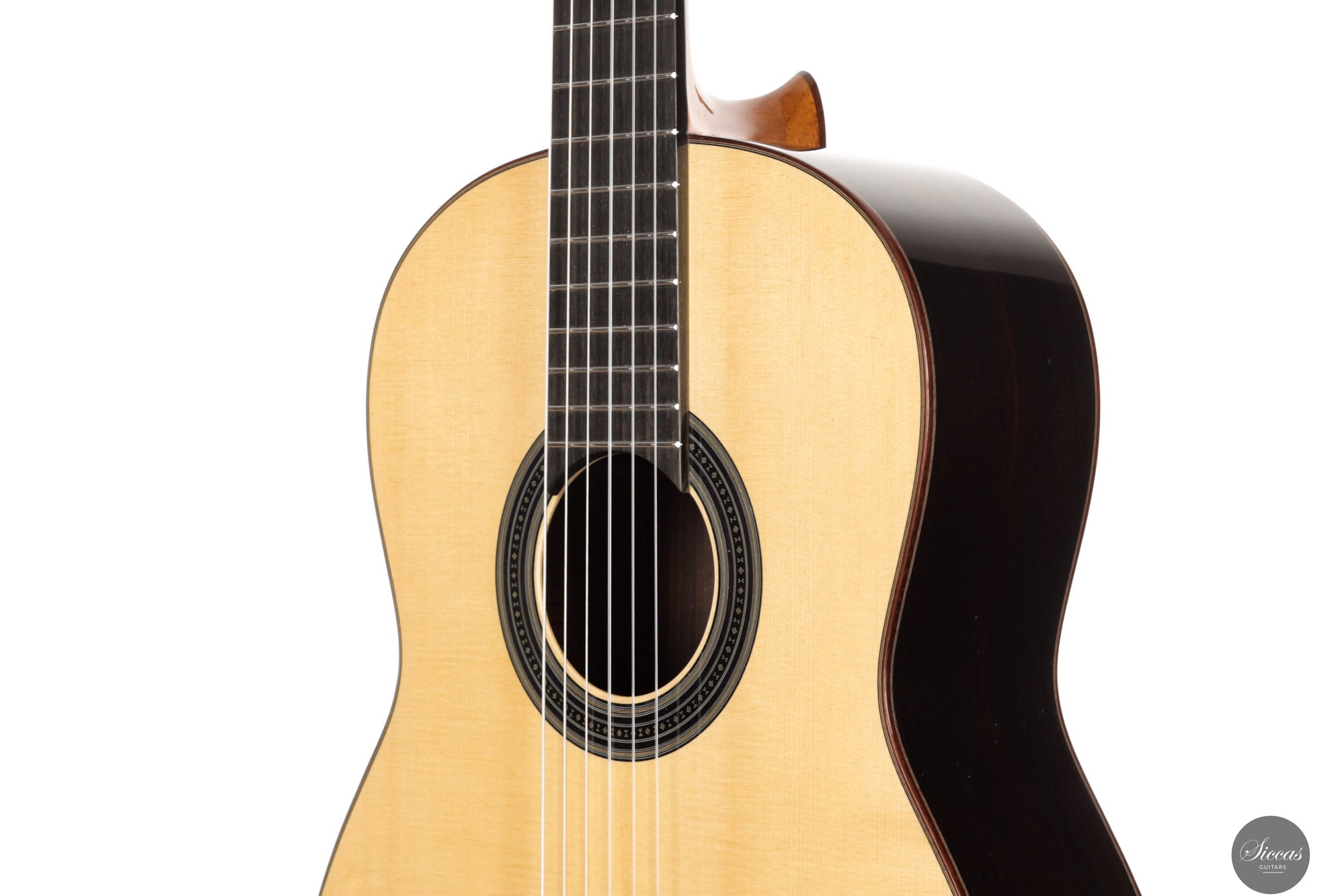 Diese Konzertgitarre, vollendet im Jahr 2025, wurde nach traditionellen Methoden gebaut und spiegelt Hugues Boivins disziplinierte, detailorientierte Herangehensweise wider. Die Konstruktion folgt einem klassischen Fächerbeleistungssystem mit sieben Fächerleisten und einem Querbalken hinter der Brücke, was sowohl Stabilität als auch klangliche Klarheit bietet. Die Fichtendecke ist mit Zargen und Boden aus indischem Palisander kombiniert – eine bewährte Verbindung, die artikulierte Höhen und einen klar definierten Bass hervorbringt. Die Rosette wurde mit Sorgfalt ausgewählt und harmoniert optisch mit der Farbe und Textur der Decke. Die Schellackpolitur betont die natürliche Maserung und schafft eine akustisch reaktionsfreudige Oberfläche. Der Hals besitzt eine Sattelbreite von 51,5 mm und eine Mensur von 650 mm, was für traditionelle Spielbarkeit und gleichmäßige Saitenabstände sorgt. Klanglich ist das Instrument ausgewogen und fokussiert. Die Höhen sind klar und kontrolliert, während die Bässe mit Definition statt übermäßiger Resonanz unterstützen. Die Ansprache ist direkt und belohnt präzise Artikulation – ideal für Repertoire, das von Klarheit und dynamischer Kontrolle profitiert. Die Perona-Mechaniken arbeiten präzise und unterstreichen die schlichte Eleganz des gesamten Designs.Regelmäßige Pflege verlängert die Lebensdauer des Instruments