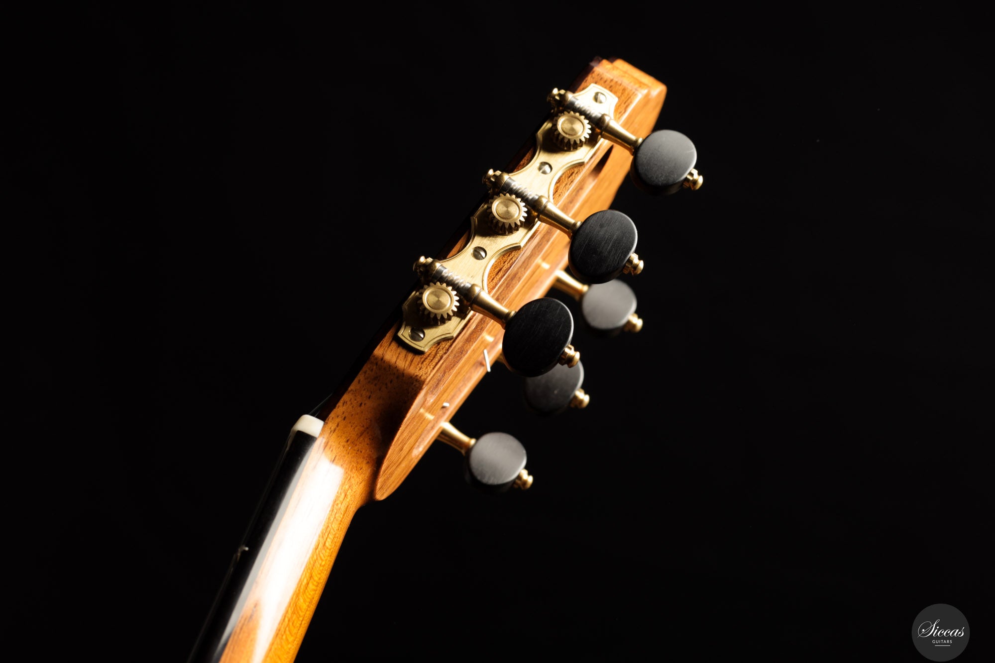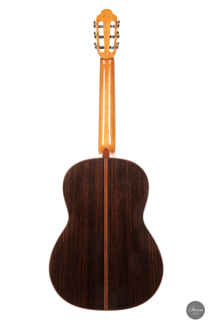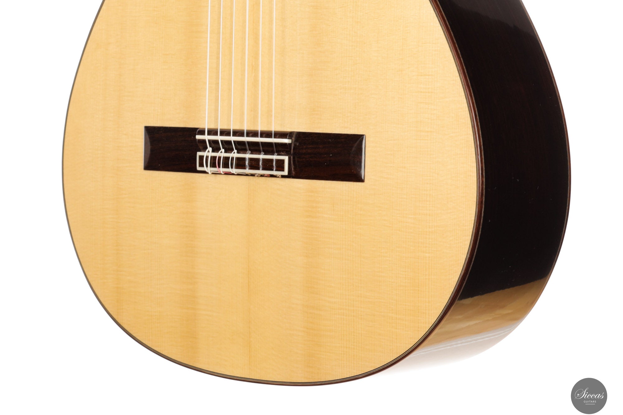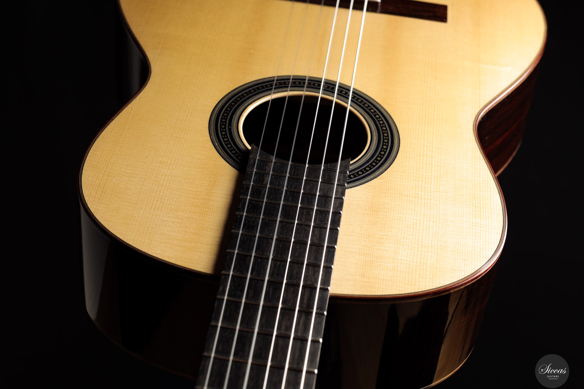 Diese Konzertgitarre, vollendet im Jahr 2025, wurde nach traditionellen Methoden gebaut und spiegelt Hugues Boivins disziplinierte, detailorientierte Herangehensweise wider. Die Konstruktion folgt einem klassischen Fächerbeleistungssystem mit sieben Fächerleisten und einem Querbalken hinter der Brücke, was sowohl Stabilität als auch klangliche Klarheit bietet. Die Fichtendecke ist mit Zargen und Boden aus indischem Palisander kombiniert – eine bewährte Verbindung, die artikulierte Höhen und einen klar definierten Bass hervorbringt. Die Rosette wurde mit Sorgfalt ausgewählt und harmoniert optisch mit der Farbe und Textur der Decke. Die Schellackpolitur betont die natürliche Maserung und schafft eine akustisch reaktionsfreudige Oberfläche. Der Hals besitzt eine Sattelbreite von 51,5 mm und eine Mensur von 650 mm, was für traditionelle Spielbarkeit und gleichmäßige Saitenabstände sorgt. Klanglich ist das Instrument ausgewogen und fokussiert. Die Höhen sind klar und kontrolliert, während die Bässe mit Definition statt übermäßiger Resonanz unterstützen. Die Ansprache ist direkt und belohnt präzise Artikulation – ideal für Repertoire, das von Klarheit und dynamischer Kontrolle profitiert. Die Perona-Mechaniken arbeiten präzise und unterstreichen die schlichte Eleganz des gesamten Designs.Regelmäßige Pflege verlängert die Lebensdauer des Instruments