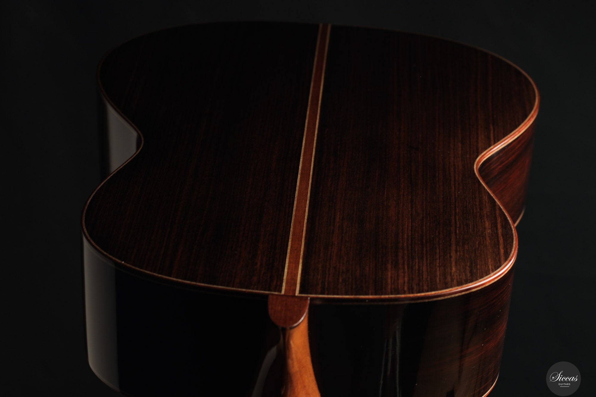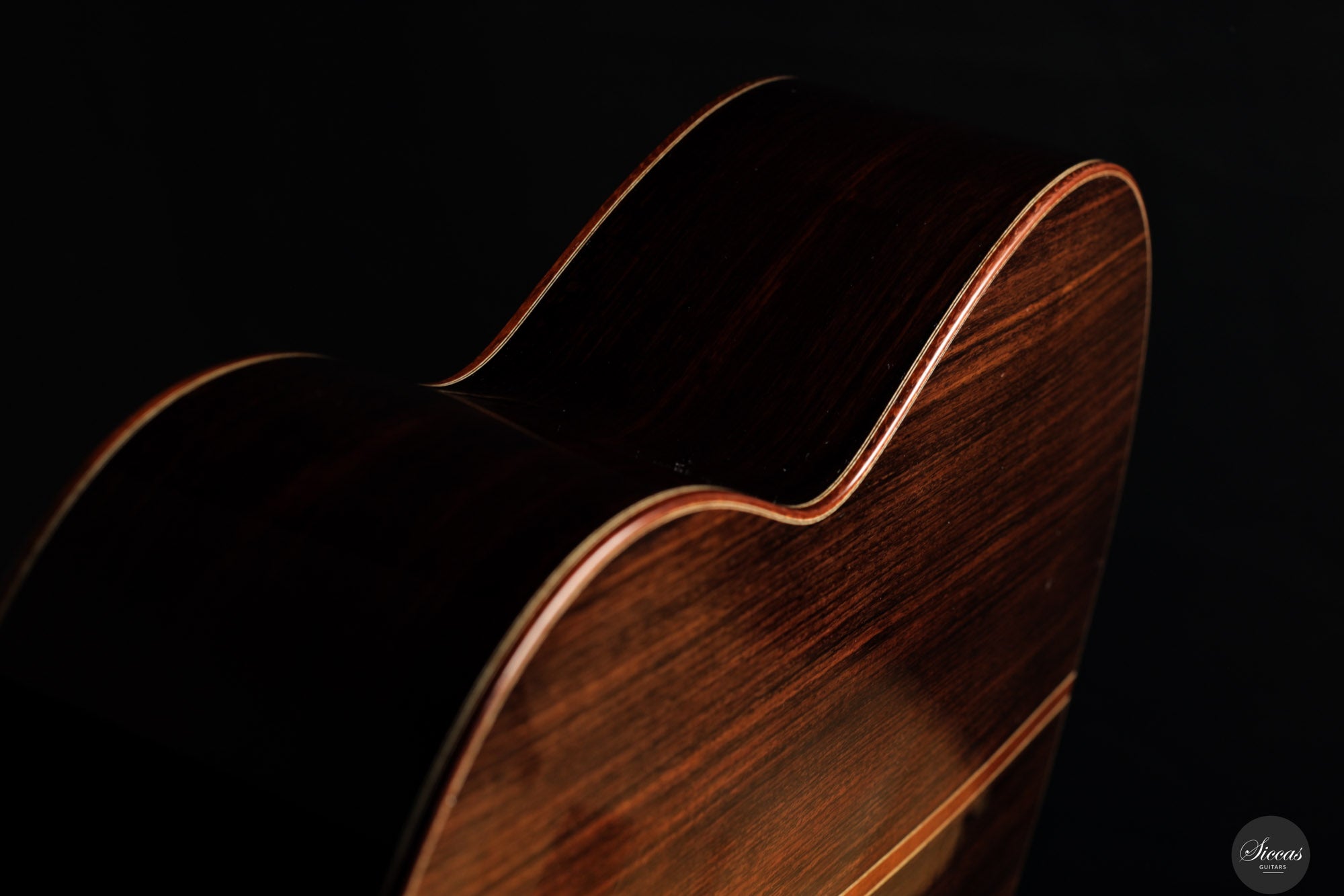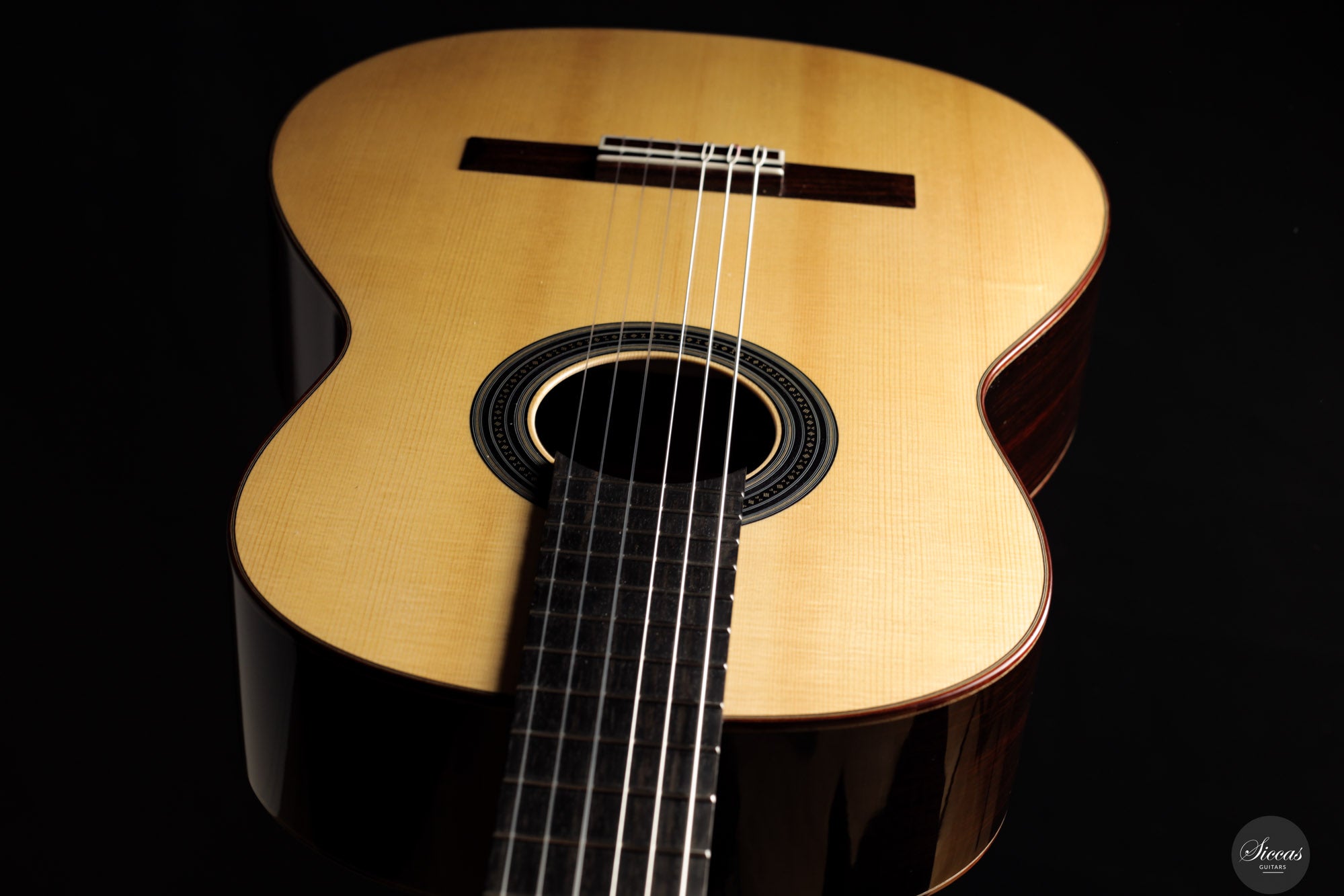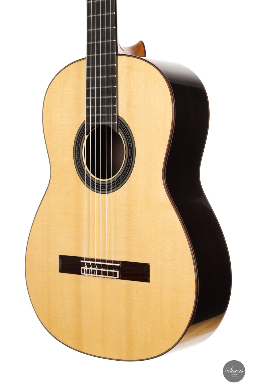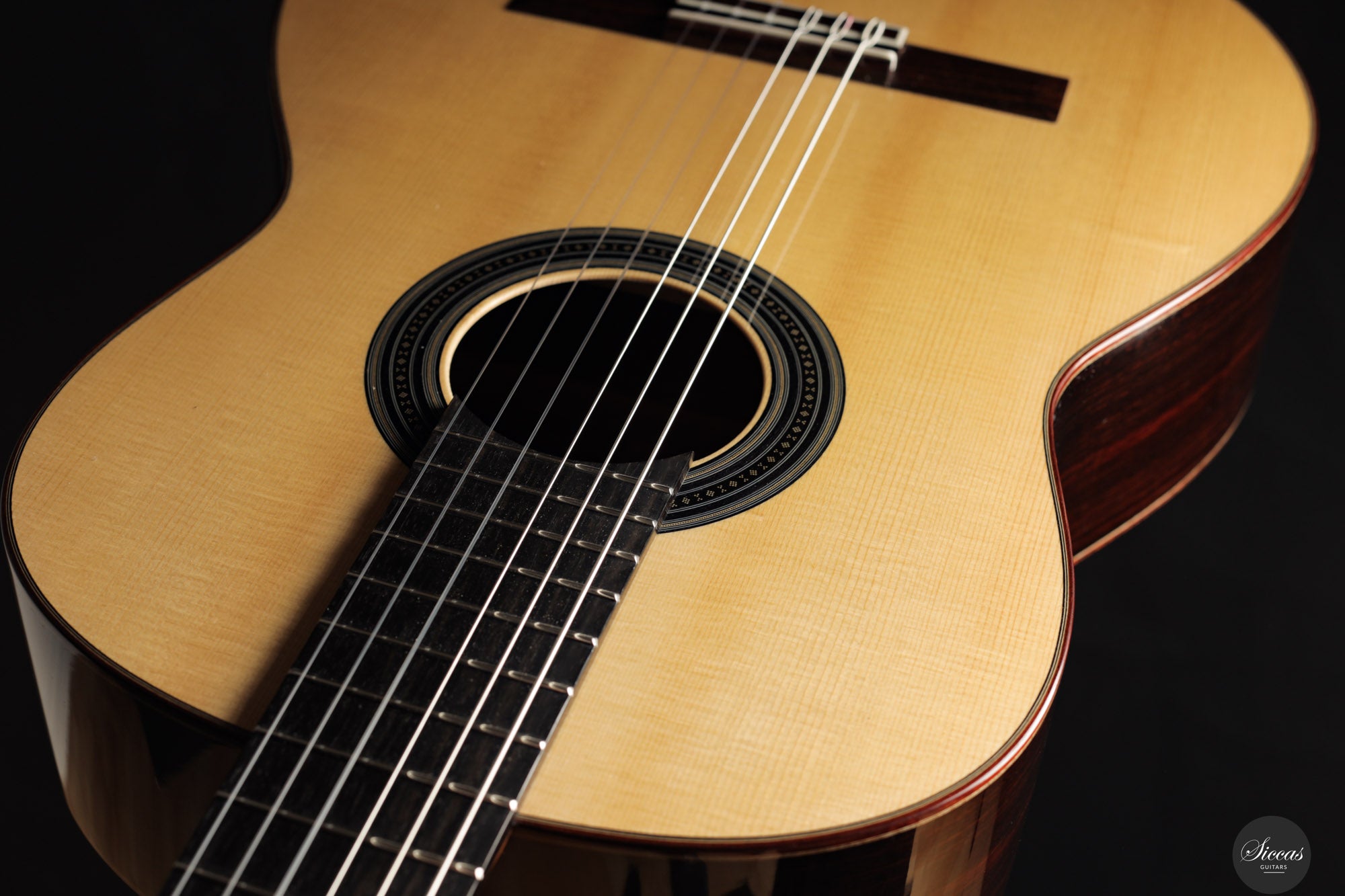 Diese Konzertgitarre, vollendet im Jahr 2025, wurde nach traditionellen Methoden gebaut und spiegelt Hugues Boivins disziplinierte, detailorientierte Herangehensweise wider. Die Konstruktion folgt einem klassischen Fächerbeleistungssystem mit sieben Fächerleisten und einem Querbalken hinter der Brücke, was sowohl Stabilität als auch klangliche Klarheit bietet. Die Fichtendecke ist mit Zargen und Boden aus indischem Palisander kombiniert – eine bewährte Verbindung, die artikulierte Höhen und einen klar definierten Bass hervorbringt. Die Rosette wurde mit Sorgfalt ausgewählt und harmoniert optisch mit der Farbe und Textur der Decke. Die Schellackpolitur betont die natürliche Maserung und schafft eine akustisch reaktionsfreudige Oberfläche. Der Hals besitzt eine Sattelbreite von 51,5 mm und eine Mensur von 650 mm, was für traditionelle Spielbarkeit und gleichmäßige Saitenabstände sorgt. Klanglich ist das Instrument ausgewogen und fokussiert. Die Höhen sind klar und kontrolliert, während die Bässe mit Definition statt übermäßiger Resonanz unterstützen. Die Ansprache ist direkt und belohnt präzise Artikulation – ideal für Repertoire, das von Klarheit und dynamischer Kontrolle profitiert. Die Perona-Mechaniken arbeiten präzise und unterstreichen die schlichte Eleganz des gesamten Designs.Regelmäßige Pflege verlängert die Lebensdauer des Instruments