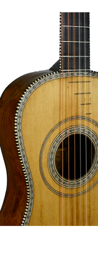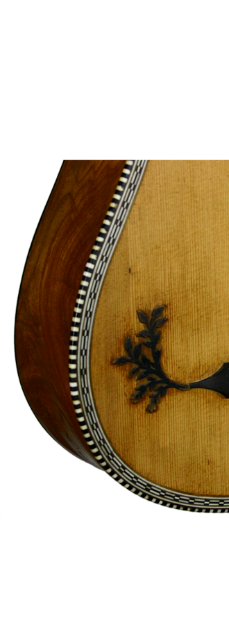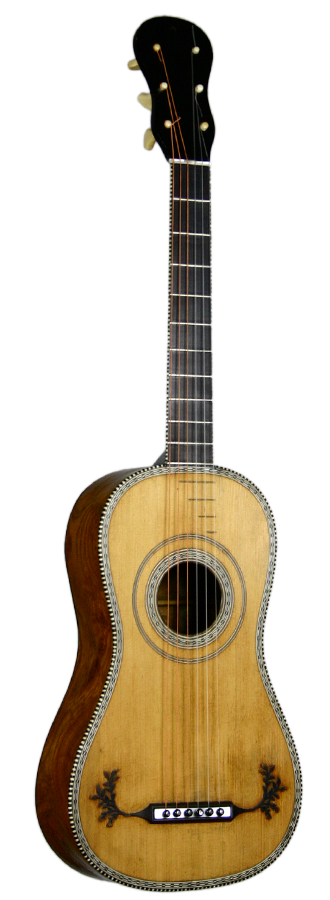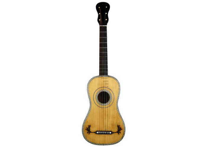 Claude Hyppolite Collin (ca. 1785-1864) lernte bei Jean Baptiste Vuillaumes Vater in Mirecourt und arbeitete in Paris als Gitarrenbauer. Von einem handeschrieben Papier weiß man, dass er in der Rue des Fossés Nr. 7 in Montmartre seine Werkstatt hatte. Auf einem anderen Papierstück aus dem Jahr 1807 steht die Abkürzung "md", was für "merchant luthier" steht und bedeutet, dass er mit Musikinstrumenten gehandelt hat. Diese kaufte er in Mirecourt und verkaufte sie in Paris. Wiederum von einem weiteren Schriftstück kann man erfahren, dass er circa im Jahr 1830 einen großes und wichtiges Musikaliengeschäft bei der "Pres la Place ds Victoires" betrieb. Dies ist ein wichtiges Detail, denn es ist die Adresse von René Lacôte, sehr nah bei Chanot und Vuillaume und auch nicht weit entfernt vom Pariser Konservatorium. Collin kehrte 1823 nach Mirecourt zurück, denn dort war er zu Hause und umgeben von Freunden, Kollegen und Händlern. Auch zog er es vor von Mirecourt aus die Geschäfte in Paris zu regeln. Diese Gitarre wurde ca. 1820 gebaut. Die Decke ist aus Fichte. Der Boden ist dreiteilig und ist wie die Zargen aus Esche. Die Gitarre ist in sehr gutem Zustand und einwandfrei bespielbar.