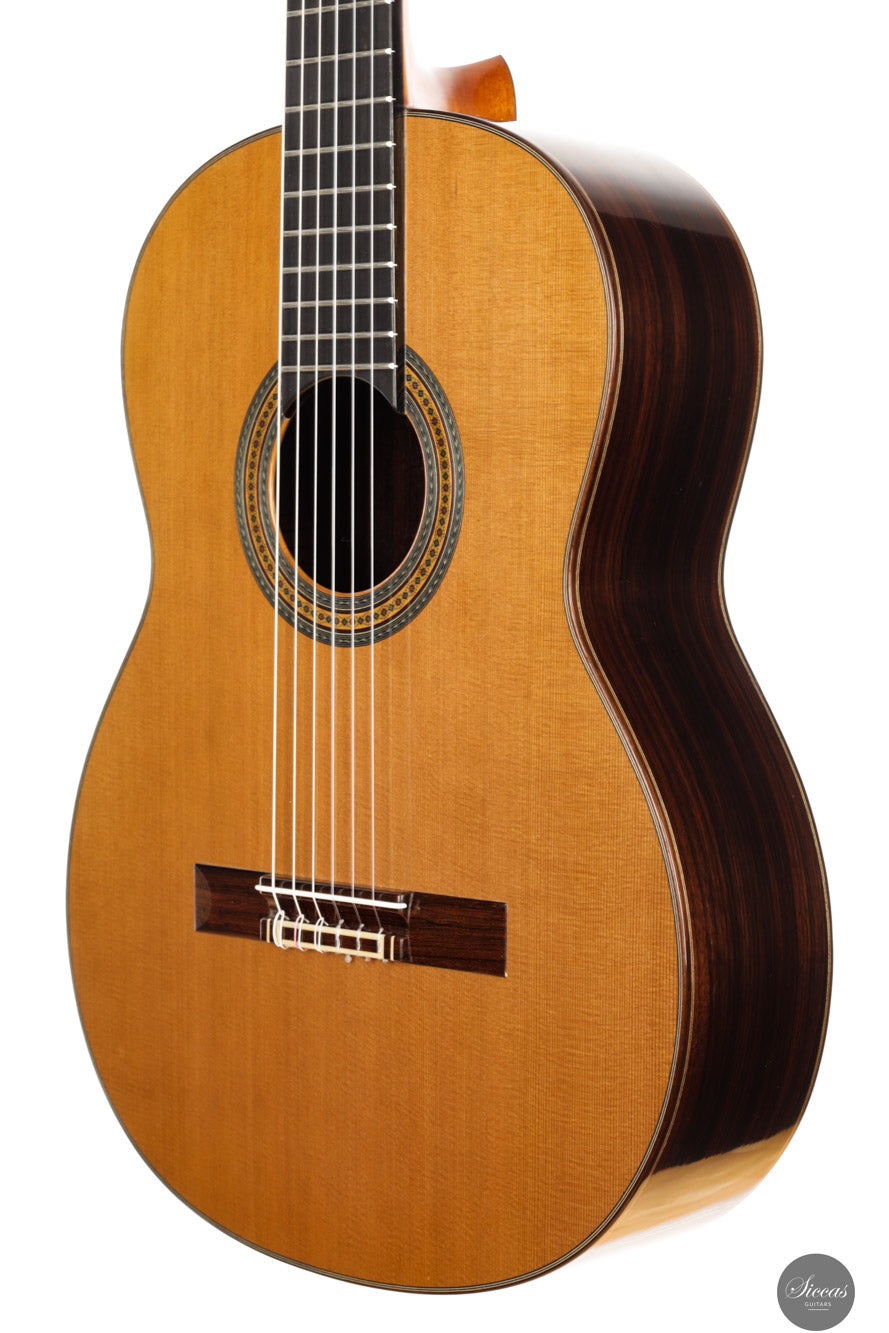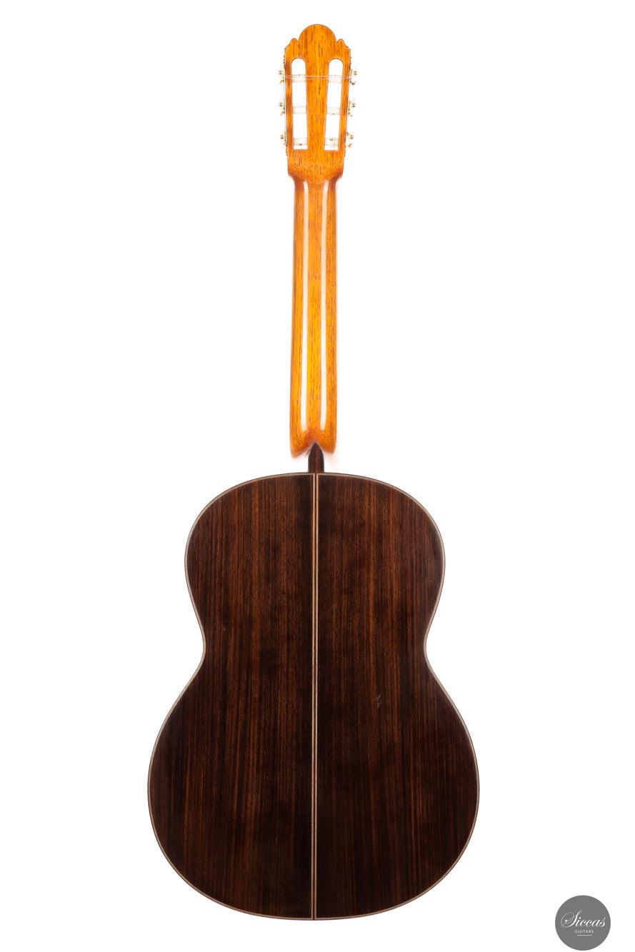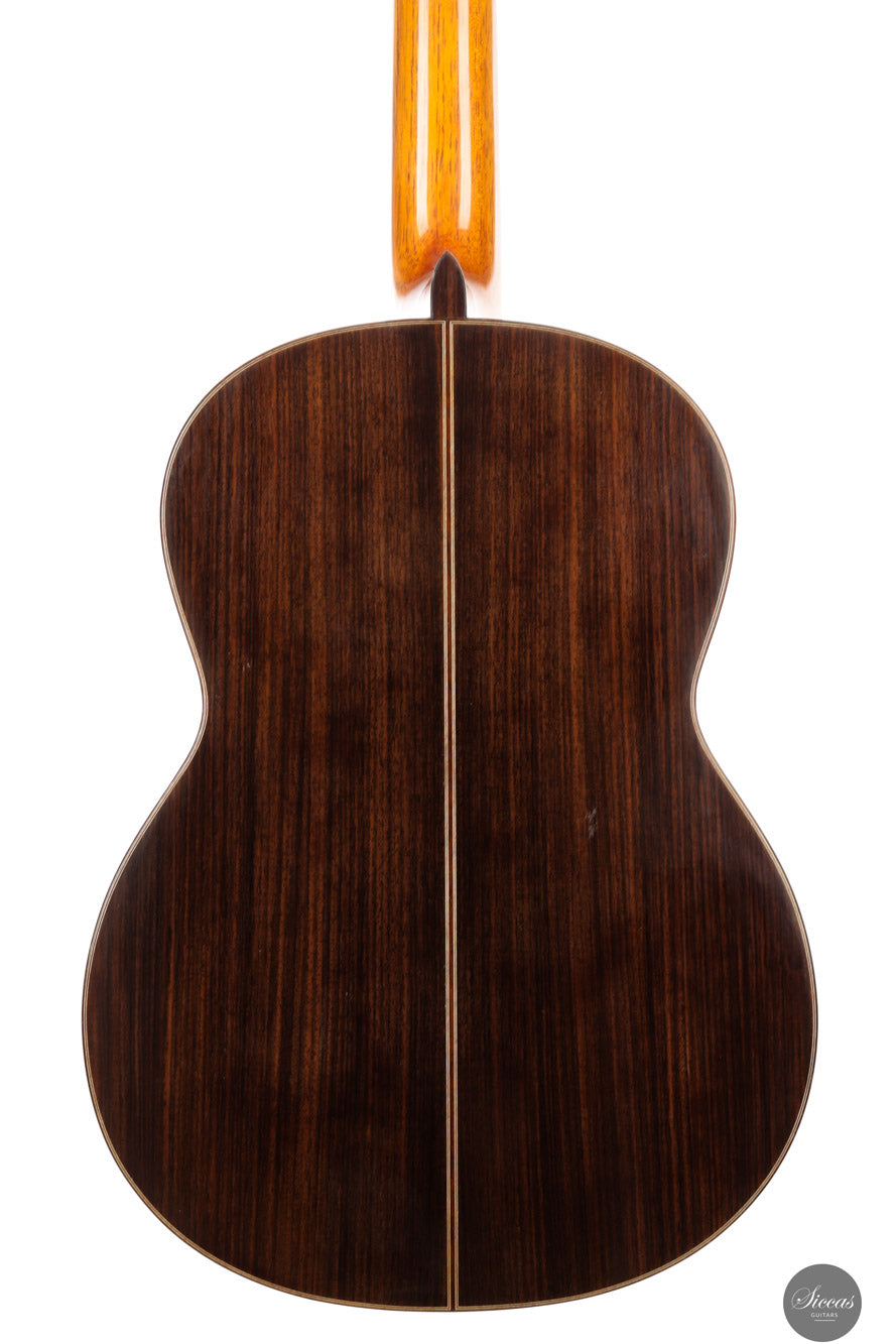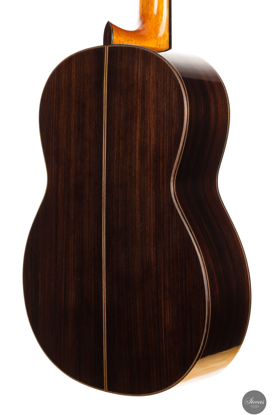 Diese Gitarre von Ignacio Fleta aus dem Jahr 2018 ist ein wahrhaft außergewöhnliches und seltenes Instrument, das die besten Traditionen eines der bedeutendsten spanischen Gitarrenbauer verkörpert. Gebaut in der legendären Werkstatt in Barcelona, steht diese Gitarre für das höchste Niveau in Bezug auf Handwerkskunst, Klang und Ausdrucksstärke, für das der Name Fleta weltweit bekannt ist. Die Diskant-Saiten beeindrucken durch ihre Wärme, Dunkelheit und Rundheit, mit einem gesanglichen und lyrischen Charakter, der besonders gut auf Vibrato der linken Hand anspricht. Jeder Ton hat Ausdruck und Tiefe – ideal für ausdrucksstarkes Spiel. Der Bassbereich ist kräftig und resonant, bleibt jedoch stets ausgewogen und trägt zu einem breiten und tiefen Klangbild bei. Die Gitarre überzeugt zudem durch eine beeindruckende Lautstärke und Projektion – sie ist ein wahres Konzertinstrument, das in jeder Spielsituation brilliert, ob solistisch oder im Ensemble. Sie verbindet autoritative Klangkraft mit klanglicher Raffinesse.