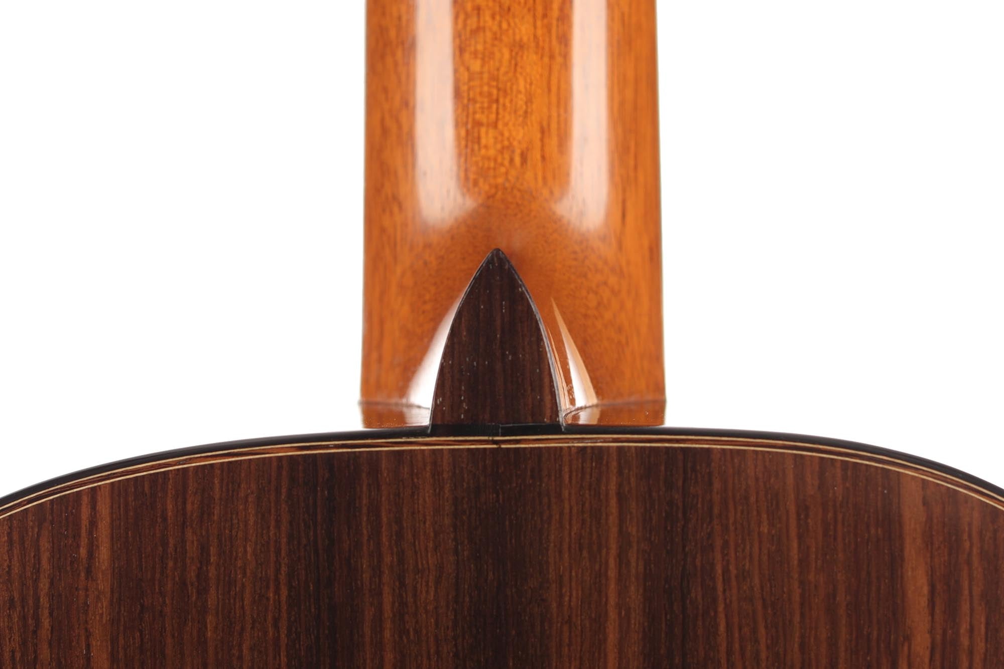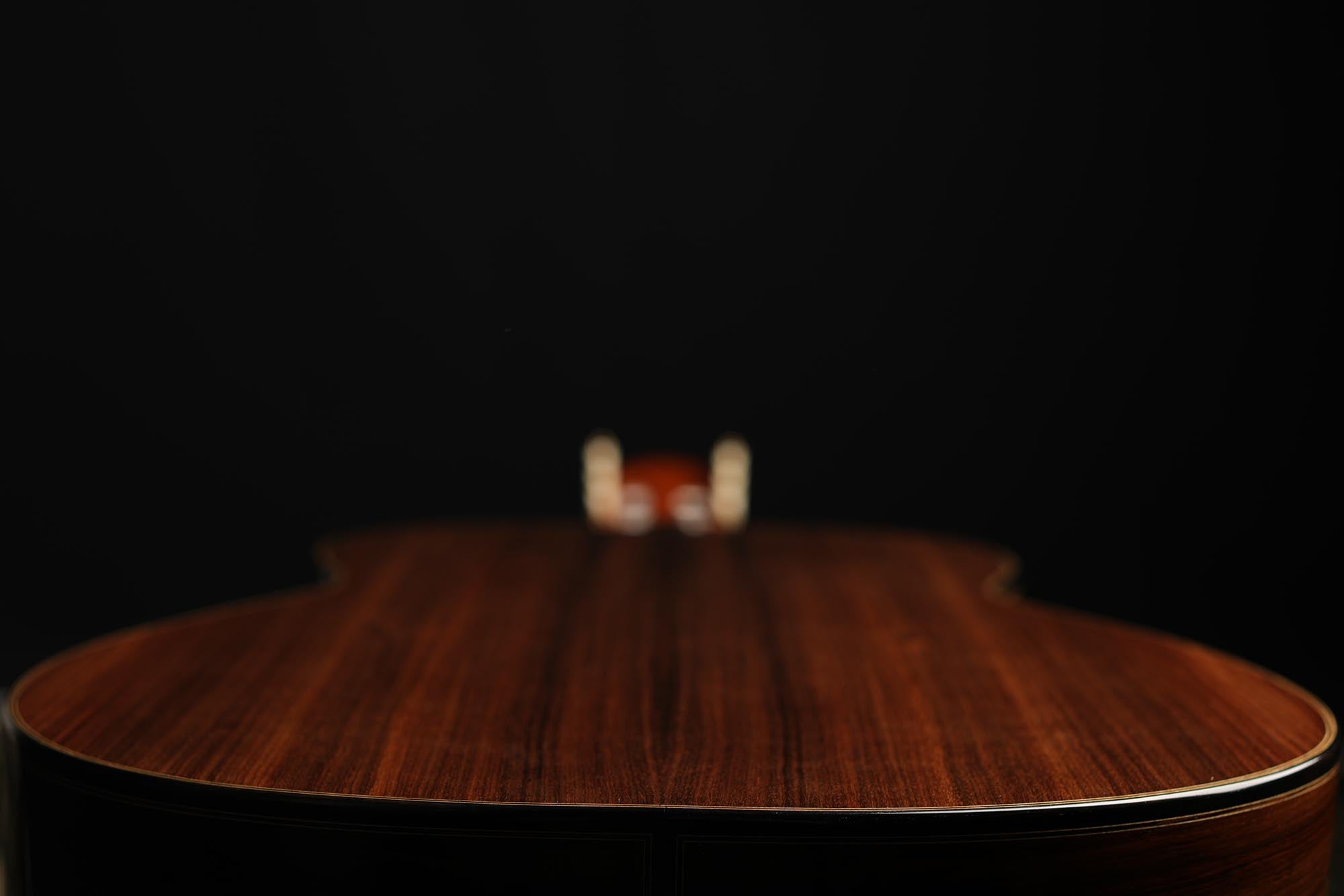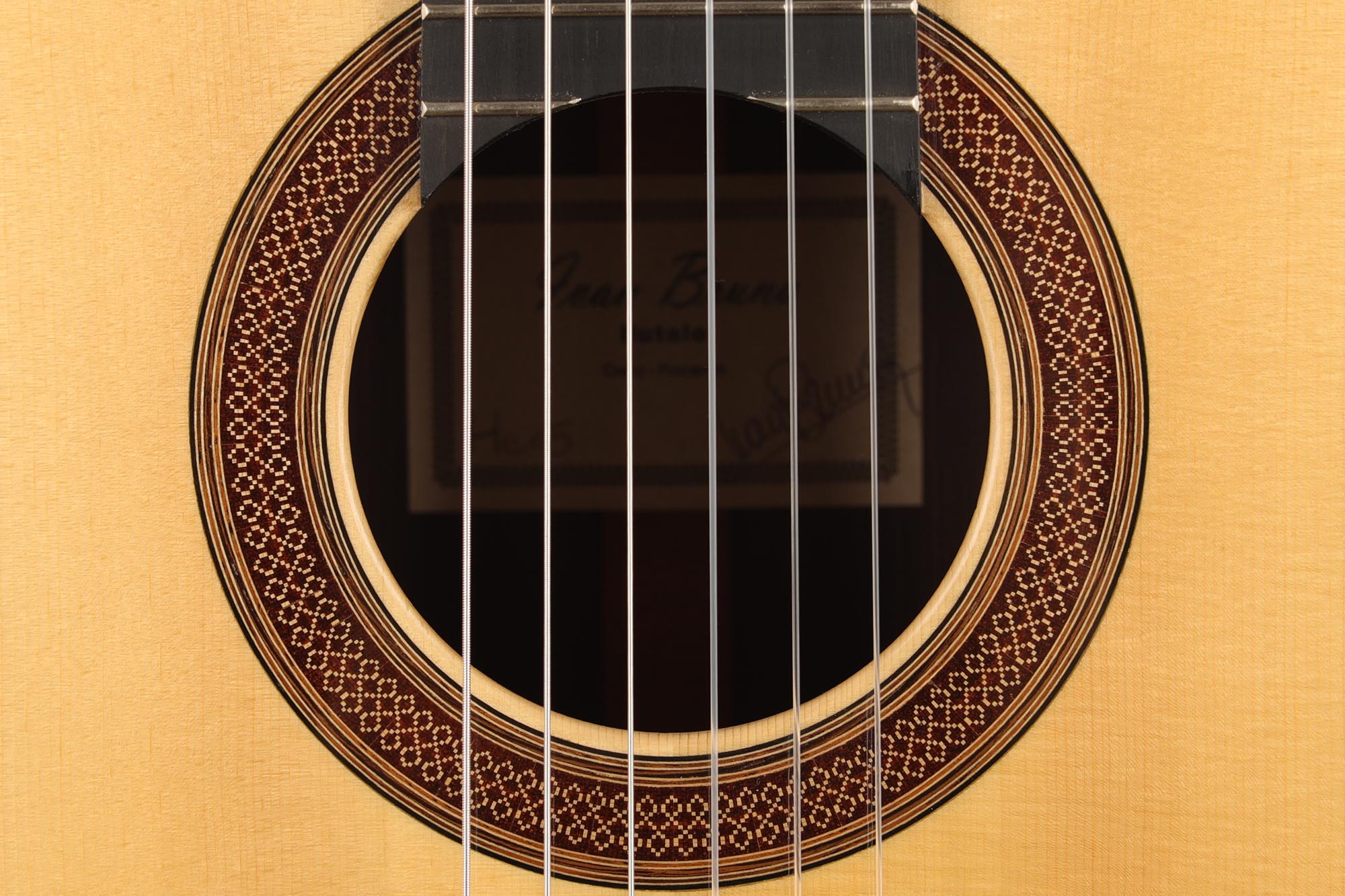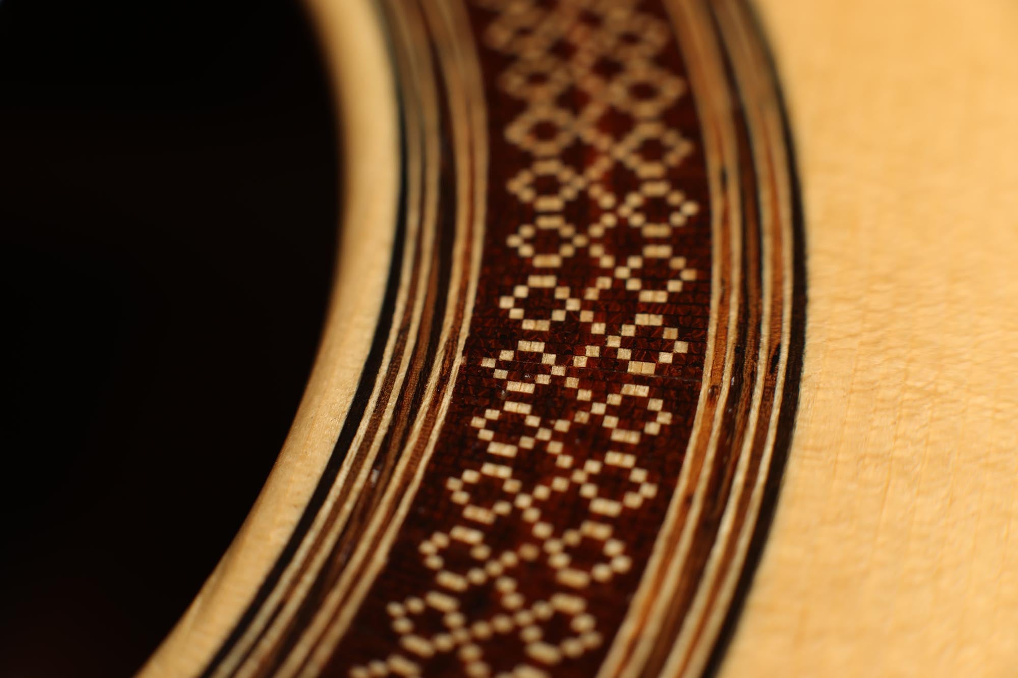 Dieses wunderschöne, 2017 gebaute Instrument hat eine typisch italienischen Stilistik. Ivan Bruna's Gitarren folgen in ihrem Aussehen einer genauen Richtlinie, aber alle haben einzigartige Eigenschaften. Diese hier hat einen sehr interessanten Boden aus indischem Palisander, wobei zwei Augen im Holz ihr einen besonderen Charme verleihen. Wie immer erinnert die filigrane Rosette an das äußere Motiv des Etiketts und umgekehrt. Der Vorbesitzer dieser traditionell gebauten Gitarre hat den Schellack auffrischen lassen, da regelmäßig und gerne gespielt hat, so dass sie sich in einem sehr guten Zustand befindet.