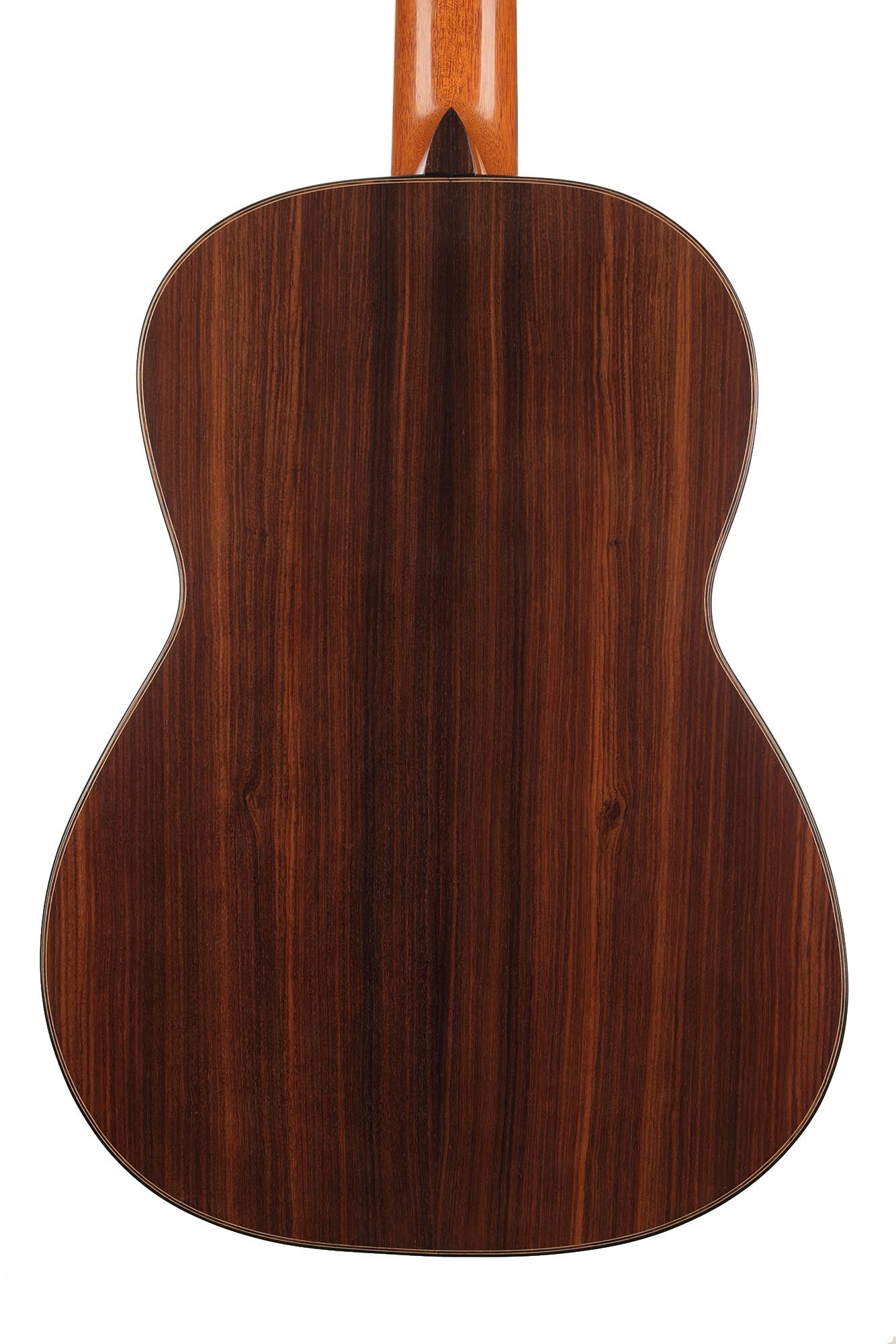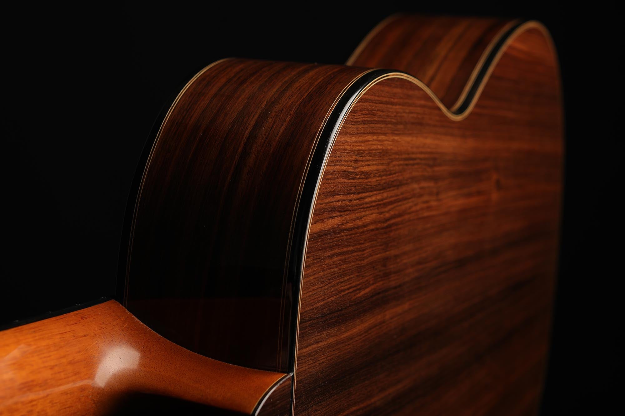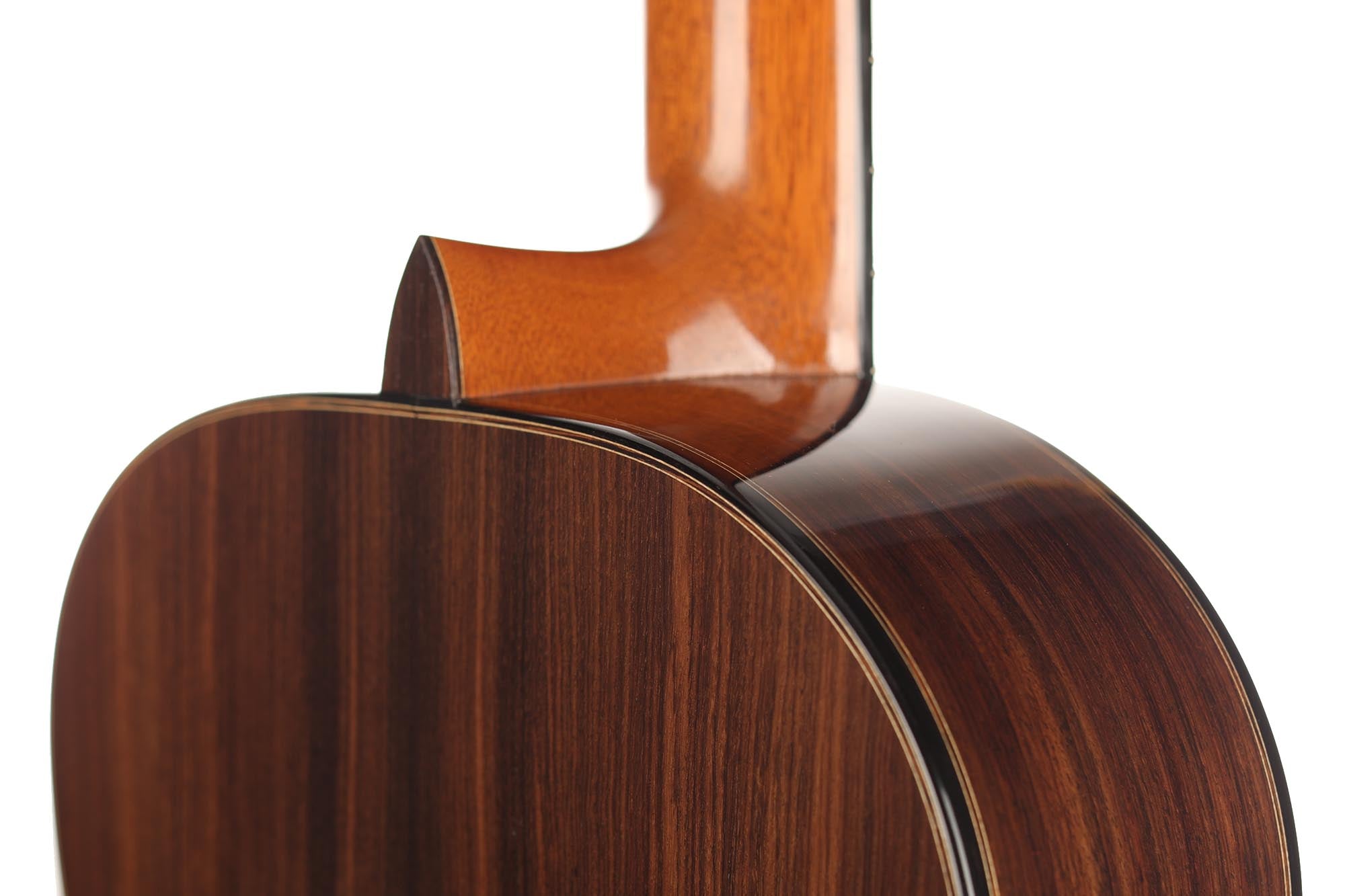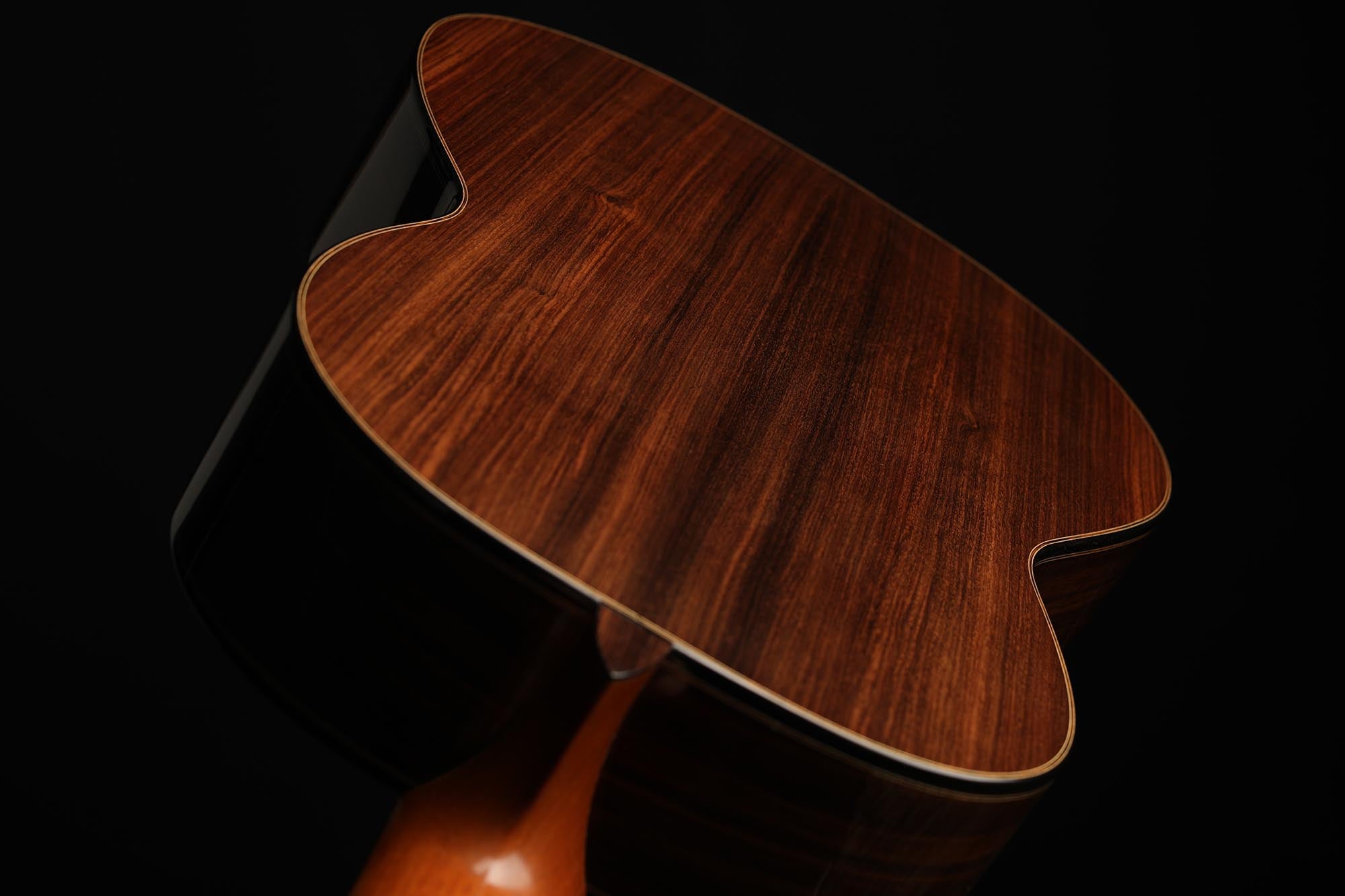 Dieses wunderschöne, 2017 gebaute Instrument hat eine typisch italienischen Stilistik. Ivan Bruna's Gitarren folgen in ihrem Aussehen einer genauen Richtlinie, aber alle haben einzigartige Eigenschaften. Diese hier hat einen sehr interessanten Boden aus indischem Palisander, wobei zwei Augen im Holz ihr einen besonderen Charme verleihen. Wie immer erinnert die filigrane Rosette an das äußere Motiv des Etiketts und umgekehrt. Der Vorbesitzer dieser traditionell gebauten Gitarre hat den Schellack auffrischen lassen, da regelmäßig und gerne gespielt hat, so dass sie sich in einem sehr guten Zustand befindet.