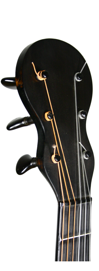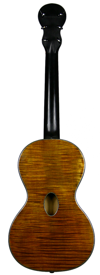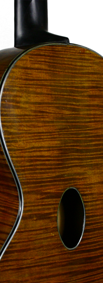Jean Joseph Honoré Derazeys (1794-1883) Karriere ist typisch für die eines Instrumentenbauers in Mirecourt. Nach seiner Ausbildung in verschiedenen Werkstätten in Mirecourt und später in Paris, fiel seine Arbeit Jean-Baptiste Vuillaume auf der ihn daraufhin als Geigenbauer in Paris einstellte. Von dieser Zeit an baute Honoré Derazey außerordentlich gute Violinen für die Firma Vuillaume. Im Jahr 1840 verließ er Paris und ging zurück nach Mirecourt. Dort arbeitete dennoch weiterhin für Jean-Baptiste Vuillaume. Dank seiner Erfahrung und Fertigkeiten übernahm er das Management einer Intrumentenmanufaktur in welcher auch dekorierte Violinen gebaut wurden, die inspiriert waren von der Arbeit des berühmten Geigenbauers Duiffopruggar. In dieser Fabrik wurden auch Gitarren im Panormo Stil für den Englischen Markt gebaut. Im Jahr 1862 übernahm er die Firma Nicolas, die zu jener Zeit die wichtigste Instrumentenbaumanufaktur war. Honoré Derazey gewann einige Preise und Erwähnungen wie z.B. in den 'Paris Great Exhibitions' von 1839 und 1844. Im Jahr 1951 war er besonders erfolgreich als er in London den ersten Preis gewann und auch in den Jahren 1855 und 1862 erneut geehrt wurde. Diese Gitarre hat einen doppelten Boden aus Fichtenholz. Die Decke ist aus Fichte, Boden und Zargen sind aus Bergahorn gefertigt. Im Boden befindet sich ein ovales Schallloch.