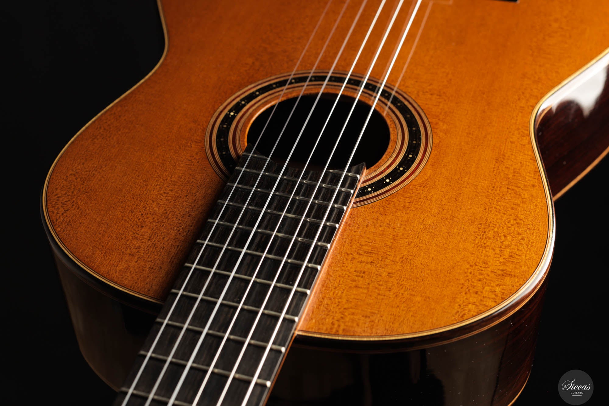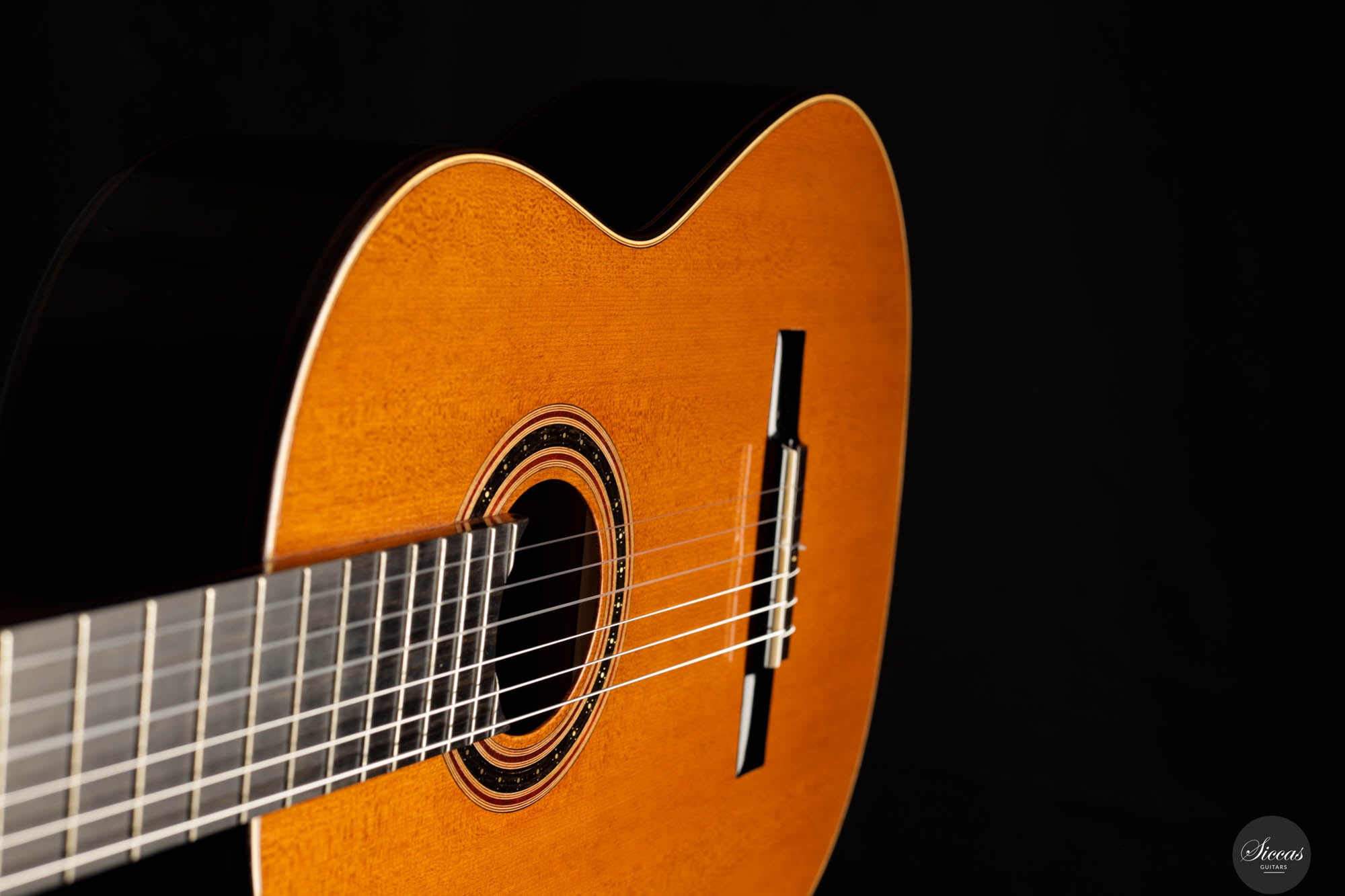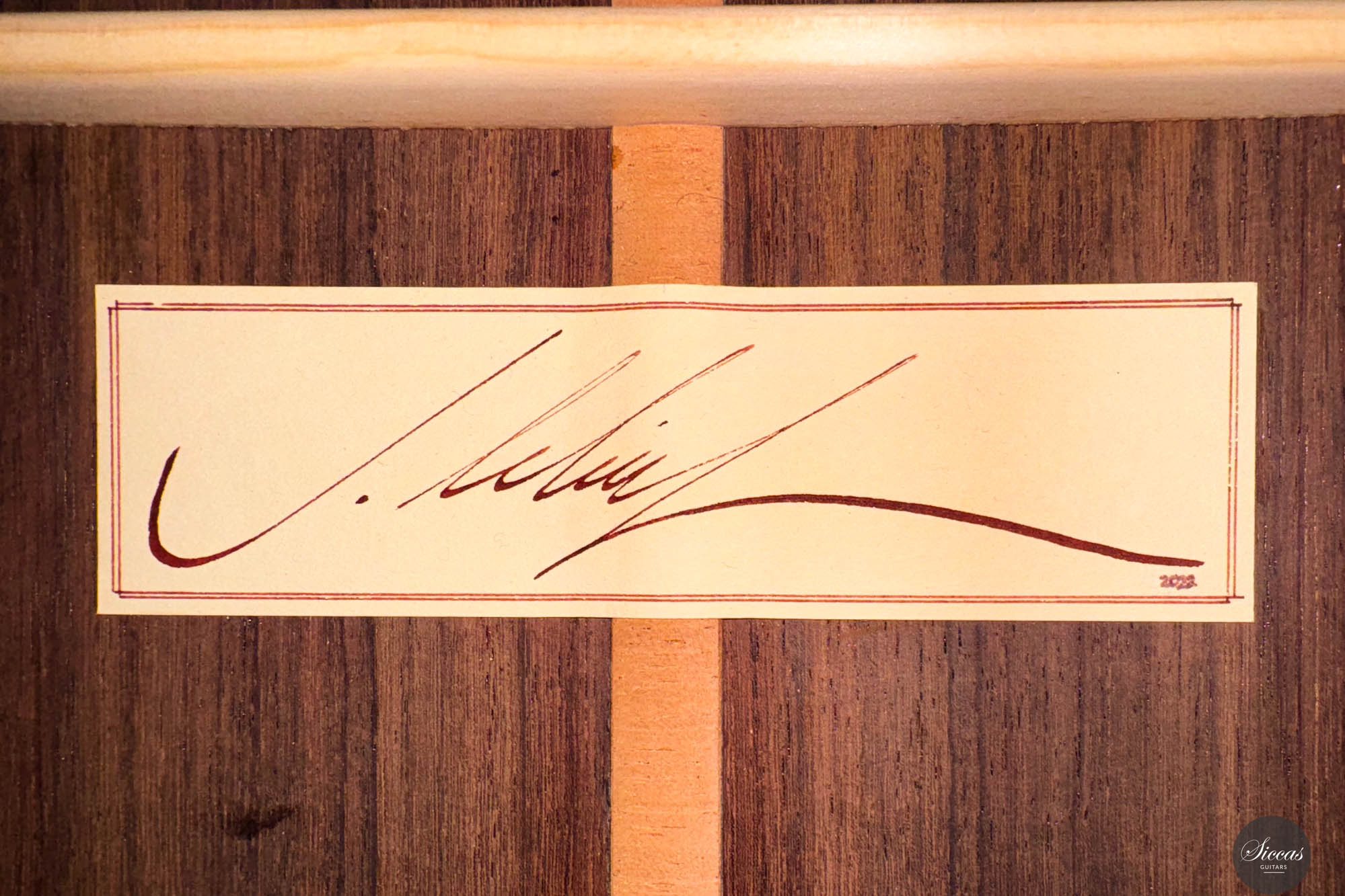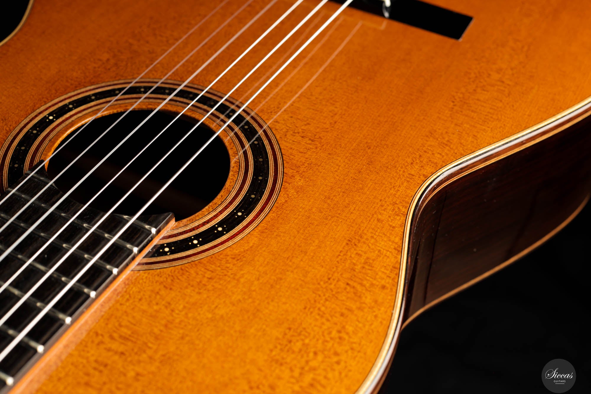 This instrument is a marvel to play, offering exceptional playability that can captivate any guitarist. It features a tiny, strategically placed cleat near the heel on the side, a subtle addition that Jakob incorporates routinely as a preventative measure against potential structural issues. This detail underscores his meticulous approach to durability without compromising the guitar’s aesthetic or sound quality. For enthusiasts and professional musicians alike, owning a Jakob Lebisch guitar means experiencing the blend of artistry and engineering that makes his guitars not just instruments, but true works of art. This particular guitar, free from any structural problems, is a dream to play and a testament to Jakob’s innovative craftsmanship and visionary approach to guitar building.