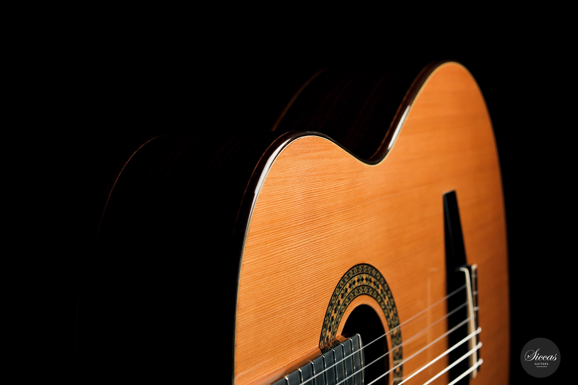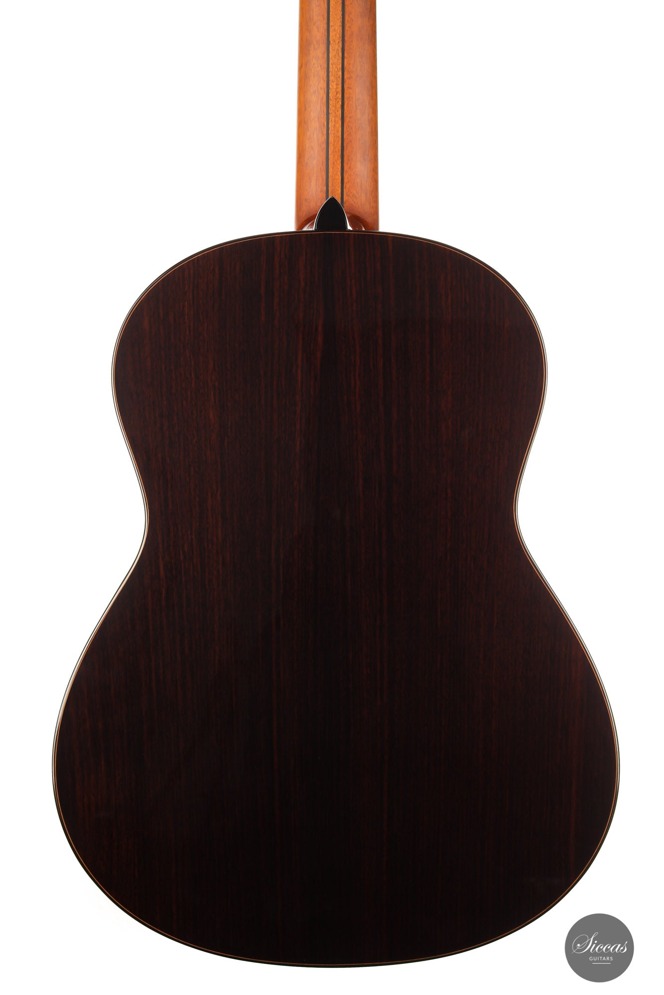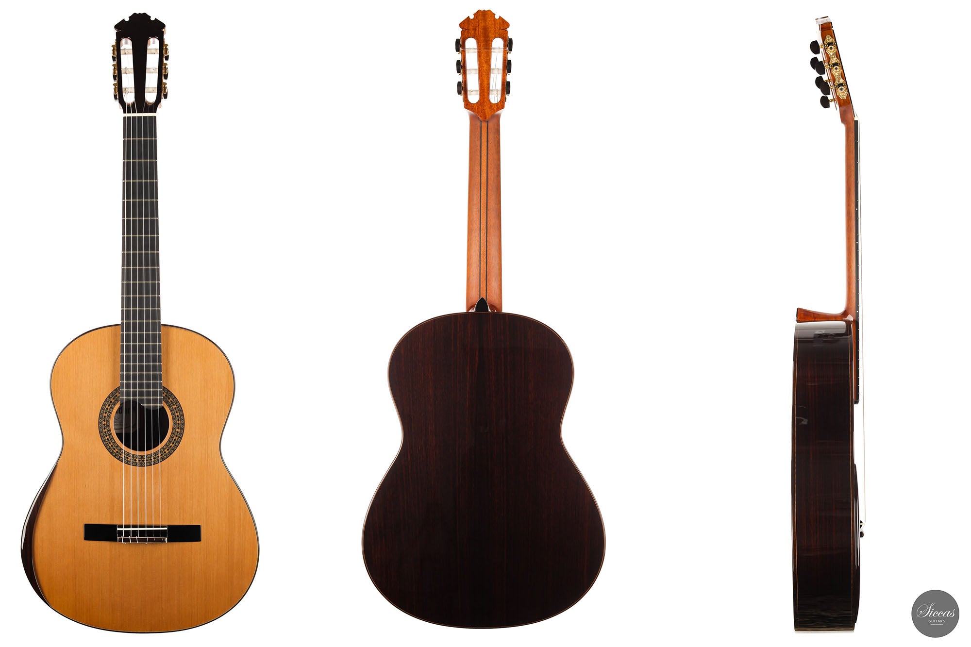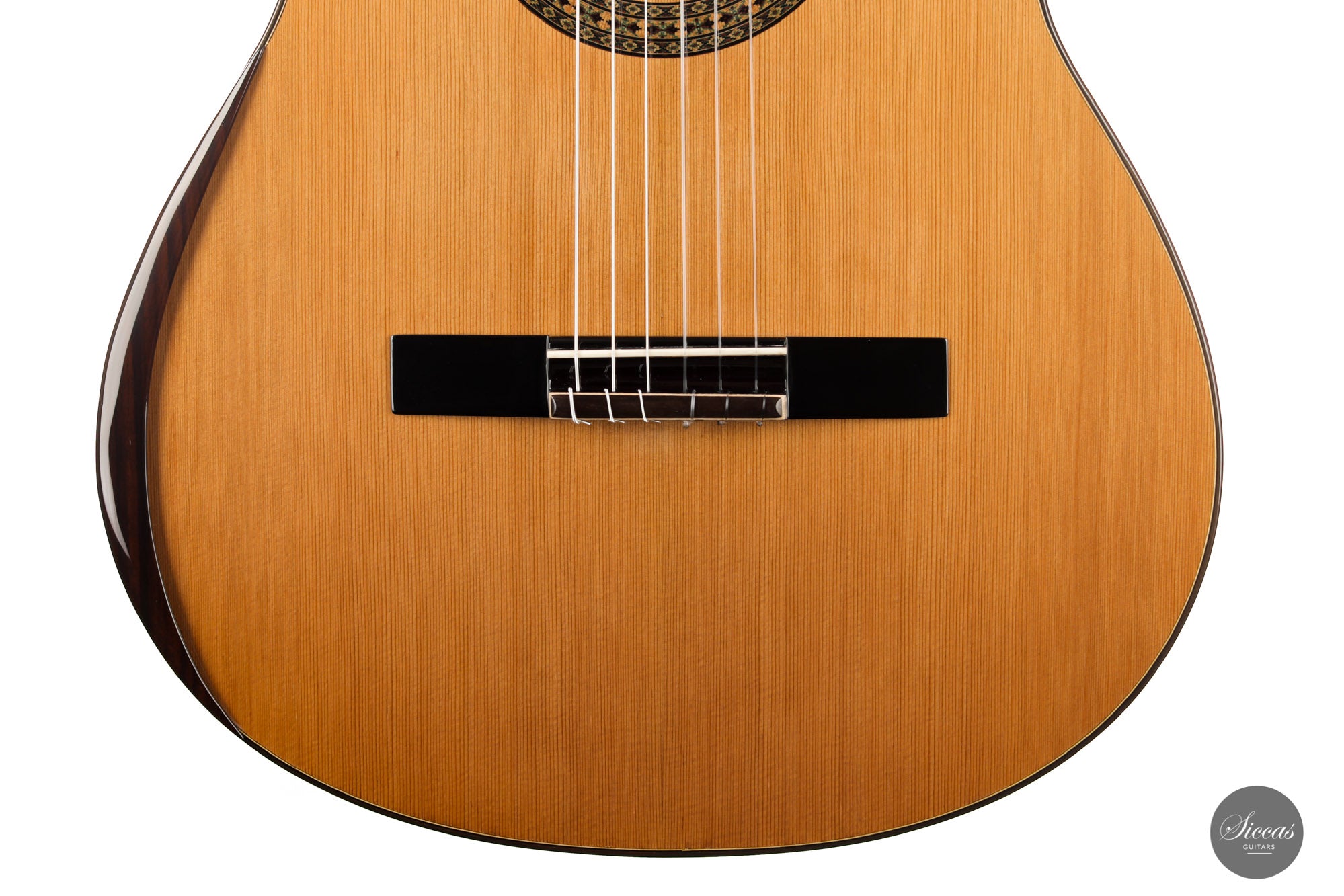 This double-top guitar built by the Czech luthier Jan Schneider is a fantastic instrument in its price category. Built with the players' comfort and the public's delight in mind, this guitar is designed to be a reliable, powerful, and comfortable concert instrument. Using no carbon nor Nomex for, the double top is obtained by milling the first layer of cedar to reduce its weight, and then doubling it with a second thinner piece of cedar to get a resonant and resistant soundboard. This extra light construction, paired with overall care for lightness in the choice of the wood, makes for a very responsive, powerful, and spontaneous instrument. For the playing comfort, Jan Schneider opted for an elevated fingerboard along with an ergonomic fretboard radius, a satin neck, and an armrest. Sound wise, this guitar truly impresses by its almost endless seeming sustain, impressive volume, and warm tone.