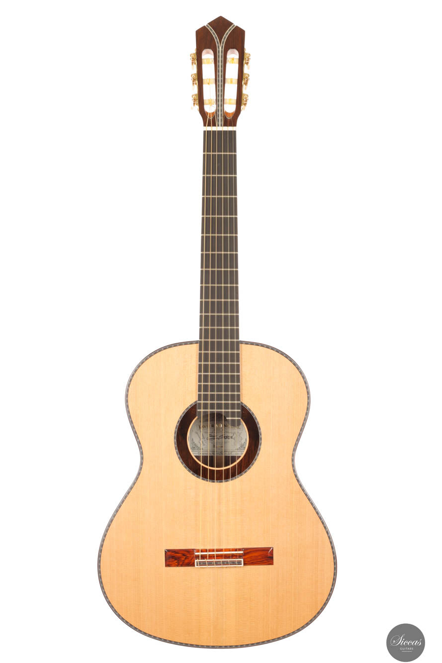 Diese Konzertgitarre, die den Namen „Deseada“ trägt, zeichnet sich durch ihre solide Leistung aus, die reiche Obertöne und ein ausreichendes Volumen aufweist, um verschiedene Veranstaltungsorte zu füllen, während sie ihren unverkennbaren spanischen Charakter beibehält. Entworfen für eine einfache Bespielbarkeit, ermöglicht sie Musikern, komfortabel über längere Zeiträume zu performen, was sie zu einer zuverlässigen Option sowohl für Übungs- als auch für Auftrittssituationen macht. Die Entwicklung der Deseada markiert eine bemerkenswerte Zusammenarbeit mit Joaquín Clerch, einem gefeierten Lehrer, Komponisten und Gitarrenvirtuosen, dessen Fachkenntnisse das Design und die akustischen Eigenschaften maßgeblich geprägt haben. Diese Partnerschaft unterstreicht ein tiefes Engagement für Exzellenz, erkennbar an der sorgfältigen Handwerkskunst der Gitarre und ihrem überzeugenden Klangprofil. Javier Menguals Hingabe, traditionelles Handwerk mit technischer Innovation zu verbinden, resultiert in Instrumenten, die mit der Essenz der spanischen Gitarrentradition schwingen, jedoch den Anforderungen moderner Künstler gerecht werden. Angesehene Interpreten wie Julia Trintschuck und Ali Arango haben die Deseada als ihr Hauptkonzertinstrument gewählt, was ihren Status unter den besten Spielern weltweit hervorhebt.