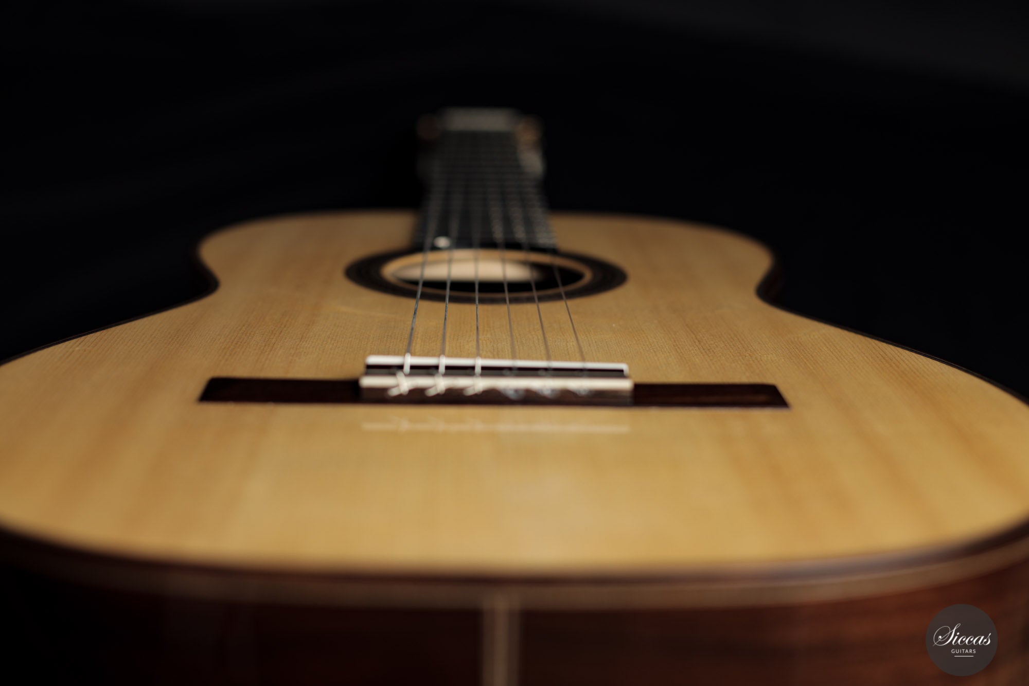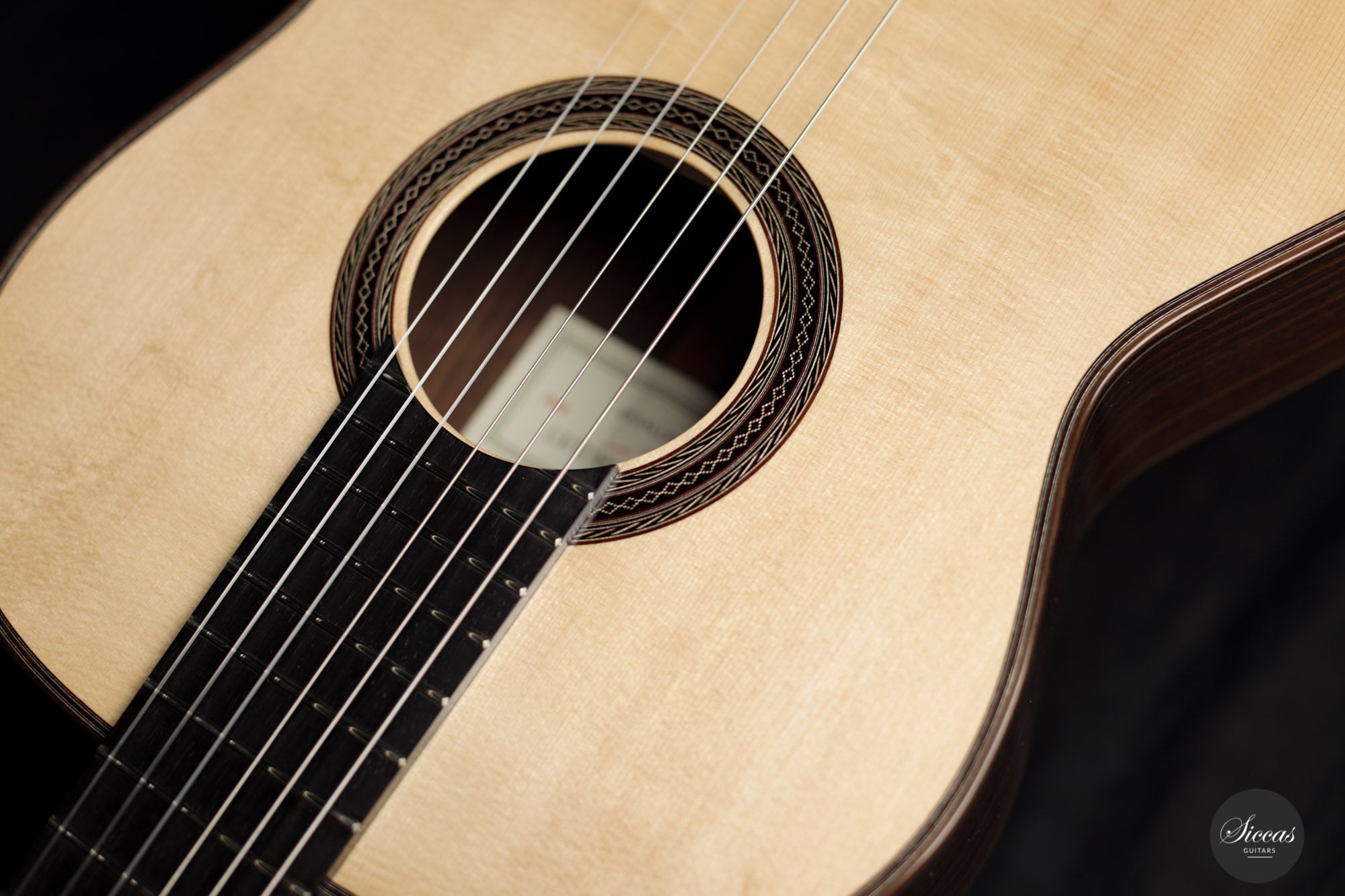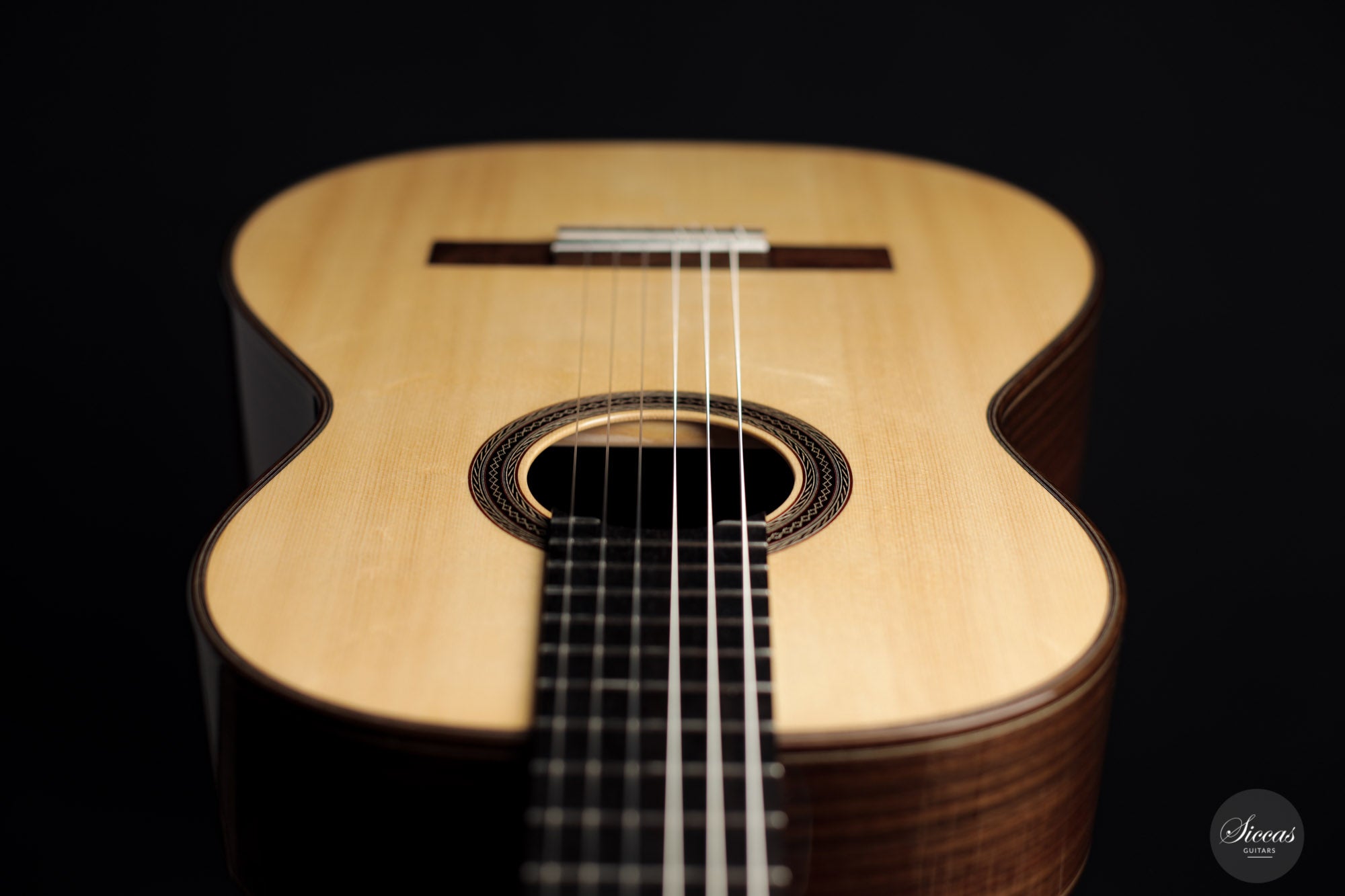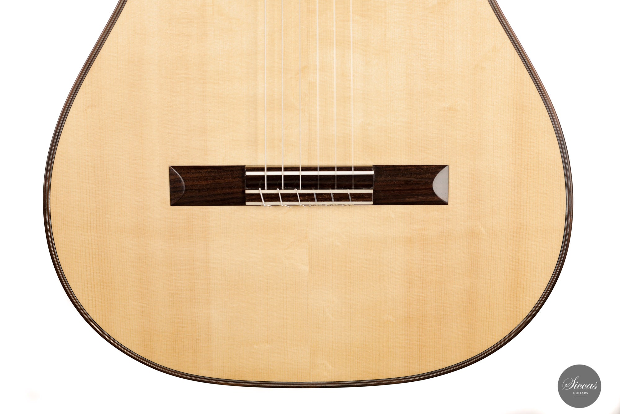 This model by Jean Marquet is based on a German guitar from 1937. A particularly striking detail is the hazel spruce top, which displays beautiful grain and accentuates the overall classy and elegant design. This "Belgian beauty" also has a lot to offer in terms of sound. This traditionally built instrument is comparatively lightweight and as a guitarist, one gets very direct feedback from the entire body when playing. It is a classical guitar with great sound volume, impressive bass, crystal clear trebles, and an abundance of overtones that give the guitar a full-bodied and interesting sound character. It is a great pleasure to play this guitar, not only because of its great playability but also because it rewards the player with many timbres and inspiring musical moments.