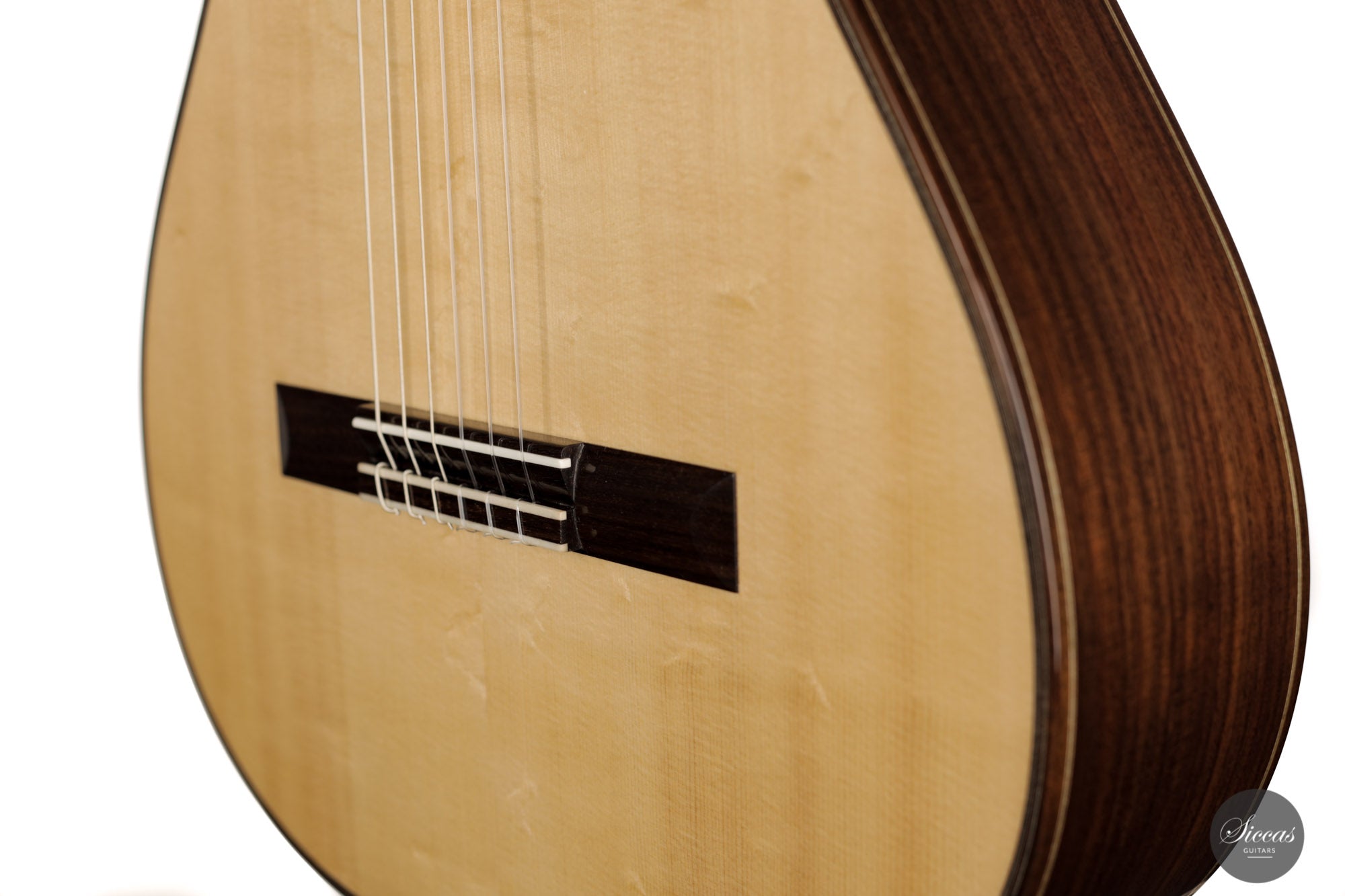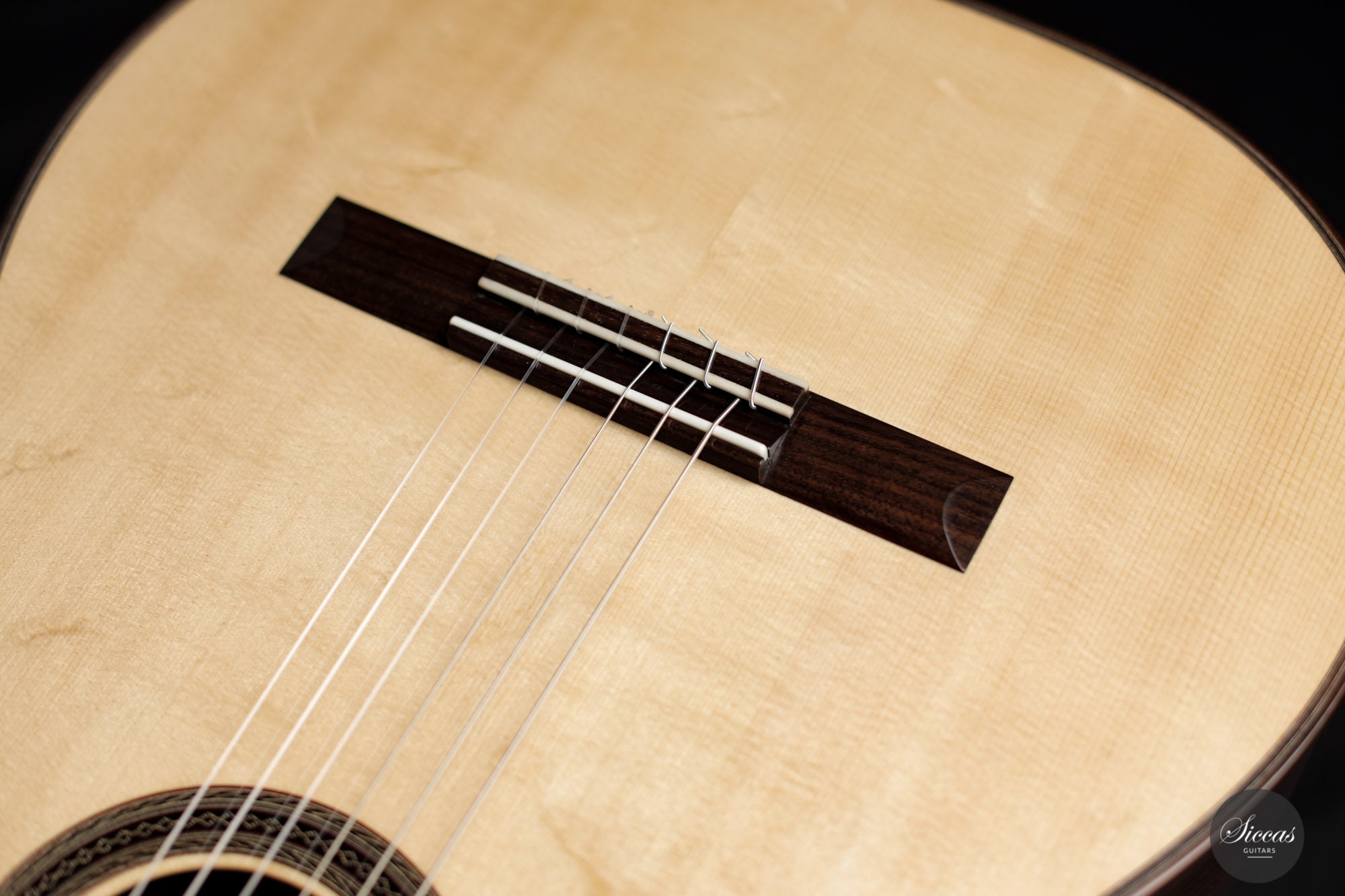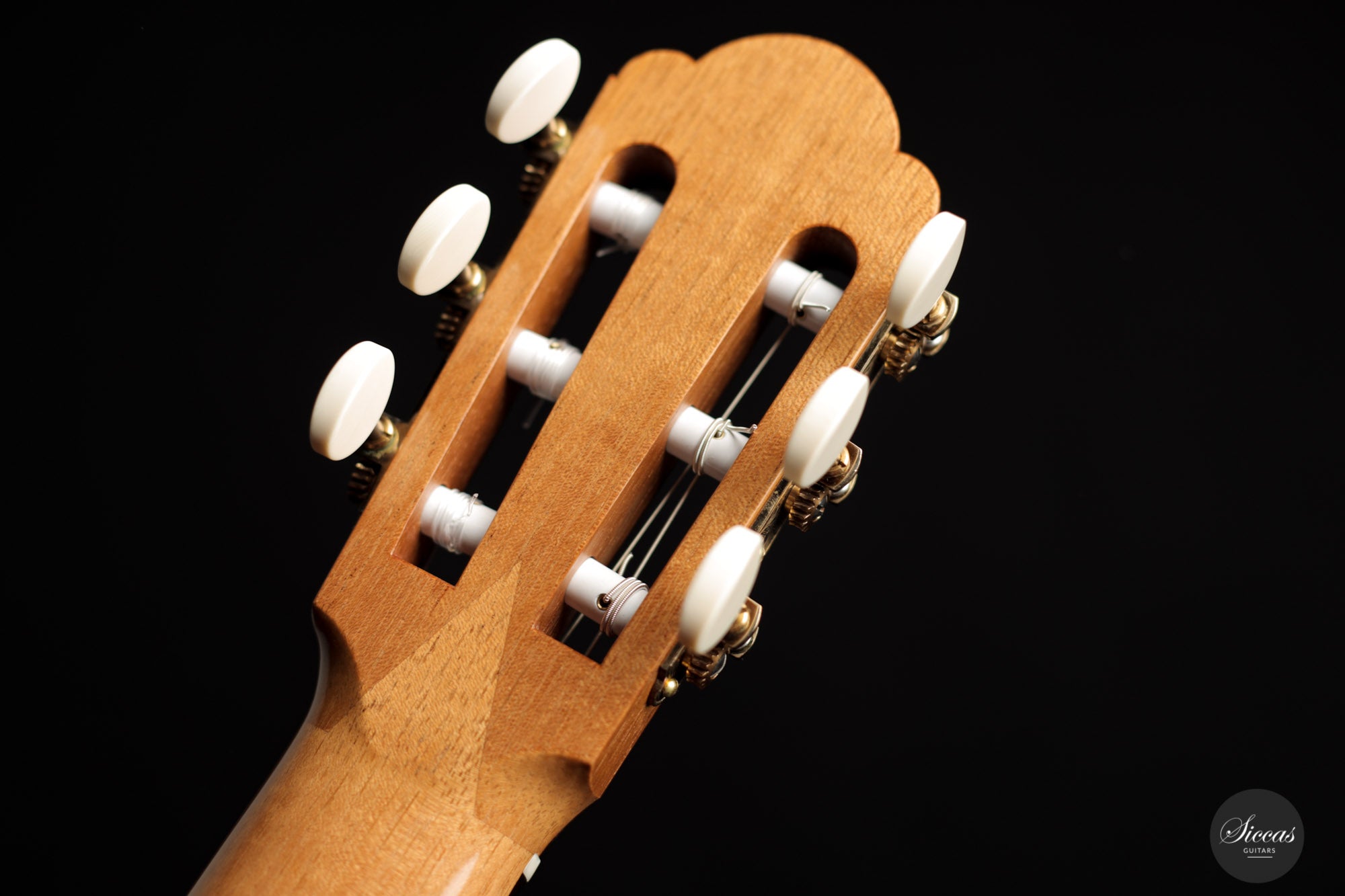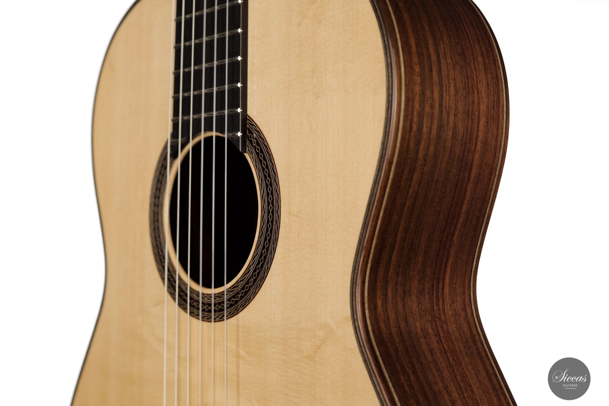 This model by Jean Marquet is based on a German guitar from 1937. A particularly striking detail is the hazel spruce top, which displays beautiful grain and accentuates the overall classy and elegant design. This "Belgian beauty" also has a lot to offer in terms of sound. This traditionally built instrument is comparatively lightweight and as a guitarist, one gets very direct feedback from the entire body when playing. It is a classical guitar with great sound volume, impressive bass, crystal clear trebles, and an abundance of overtones that give the guitar a full-bodied and interesting sound character. It is a great pleasure to play this guitar, not only because of its great playability but also because it rewards the player with many timbres and inspiring musical moments.