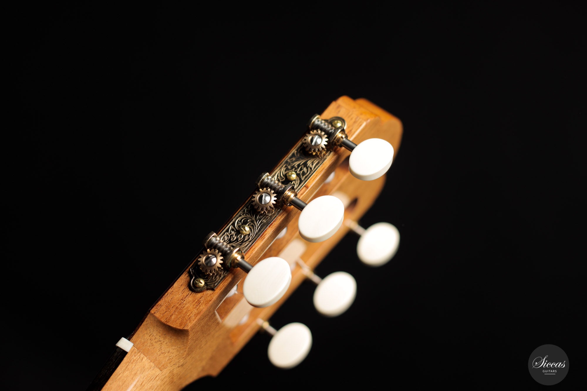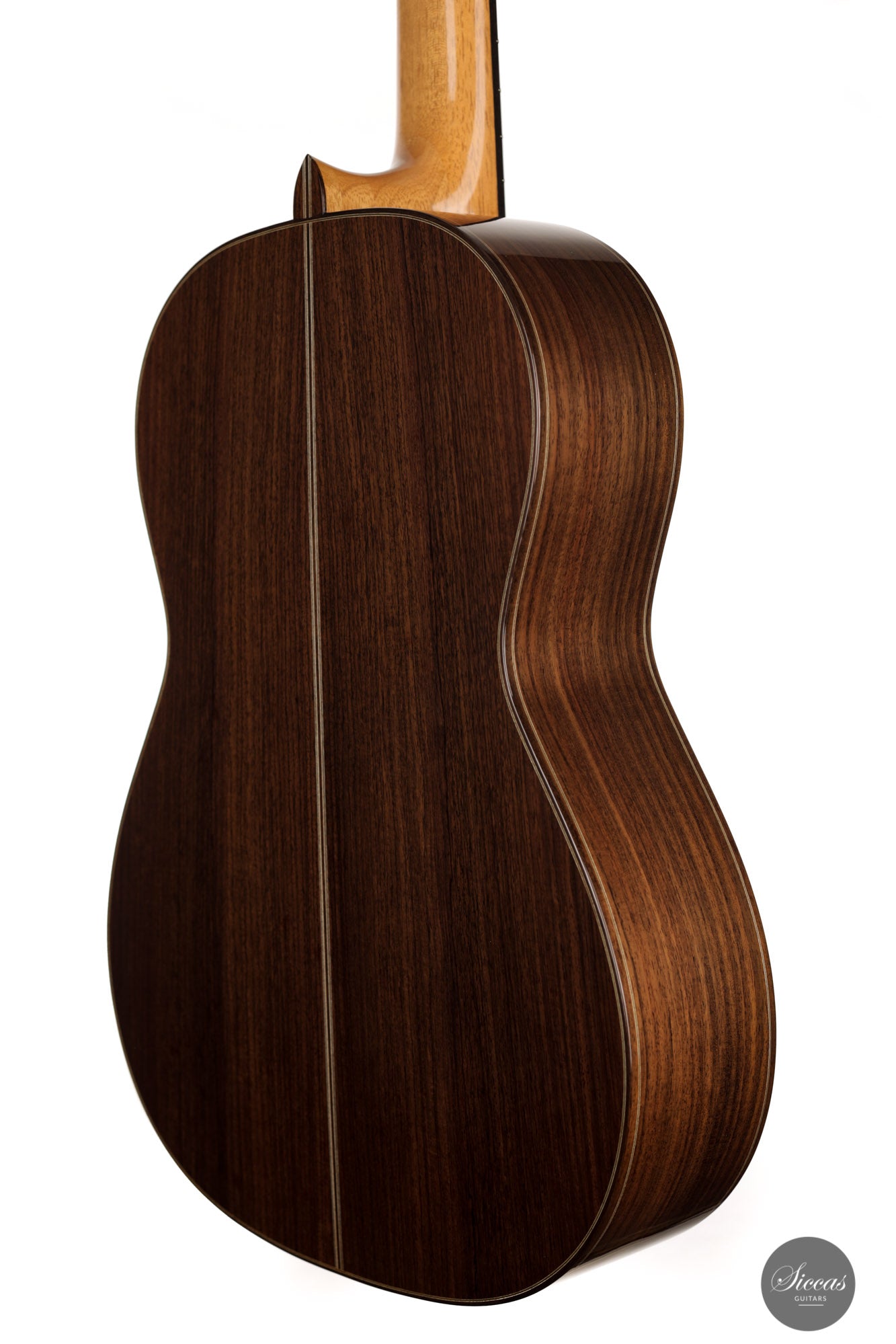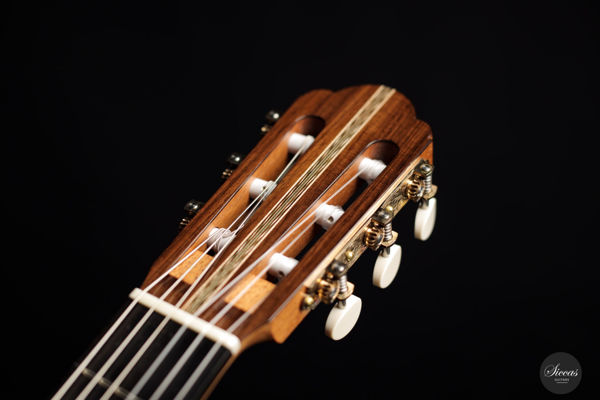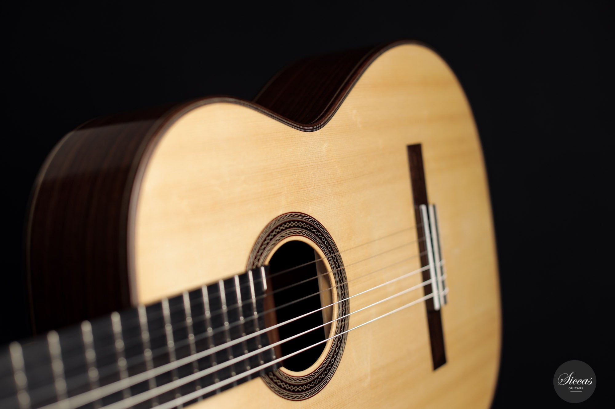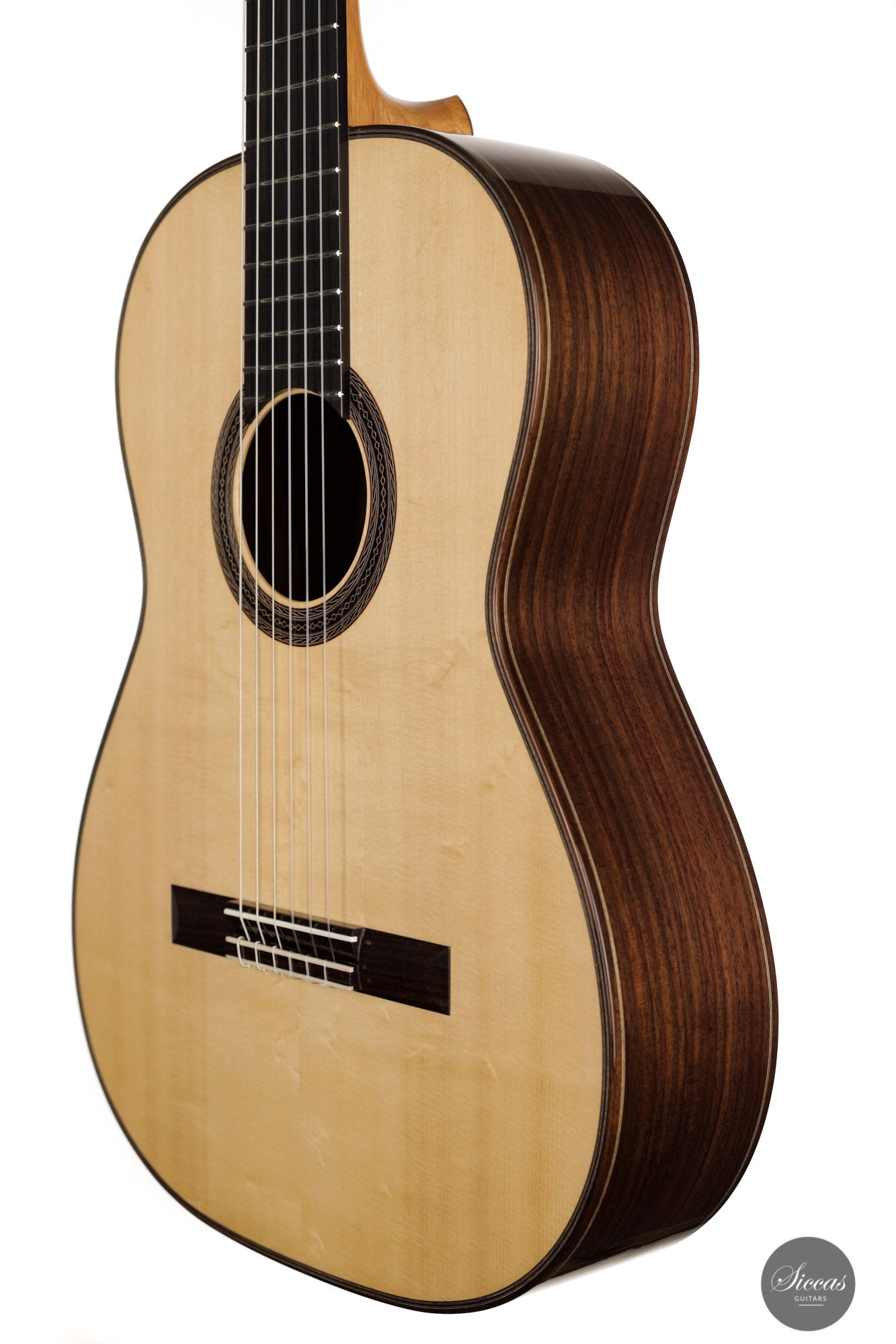 This model by Jean Marquet is based on a German guitar from 1937. A particularly striking detail is the hazel spruce top, which displays beautiful grain and accentuates the overall classy and elegant design. This "Belgian beauty" also has a lot to offer in terms of sound. This traditionally built instrument is comparatively lightweight and as a guitarist, one gets very direct feedback from the entire body when playing. It is a classical guitar with great sound volume, impressive bass, crystal clear trebles, and an abundance of overtones that give the guitar a full-bodied and interesting sound character. It is a great pleasure to play this guitar, not only because of its great playability but also because it rewards the player with many timbres and inspiring musical moments.