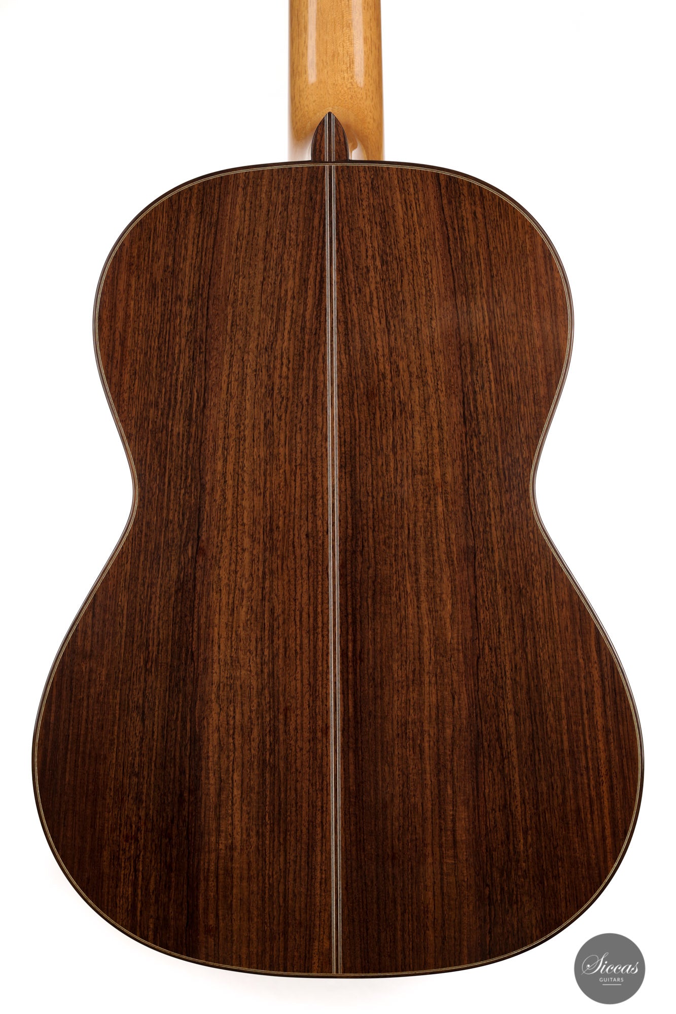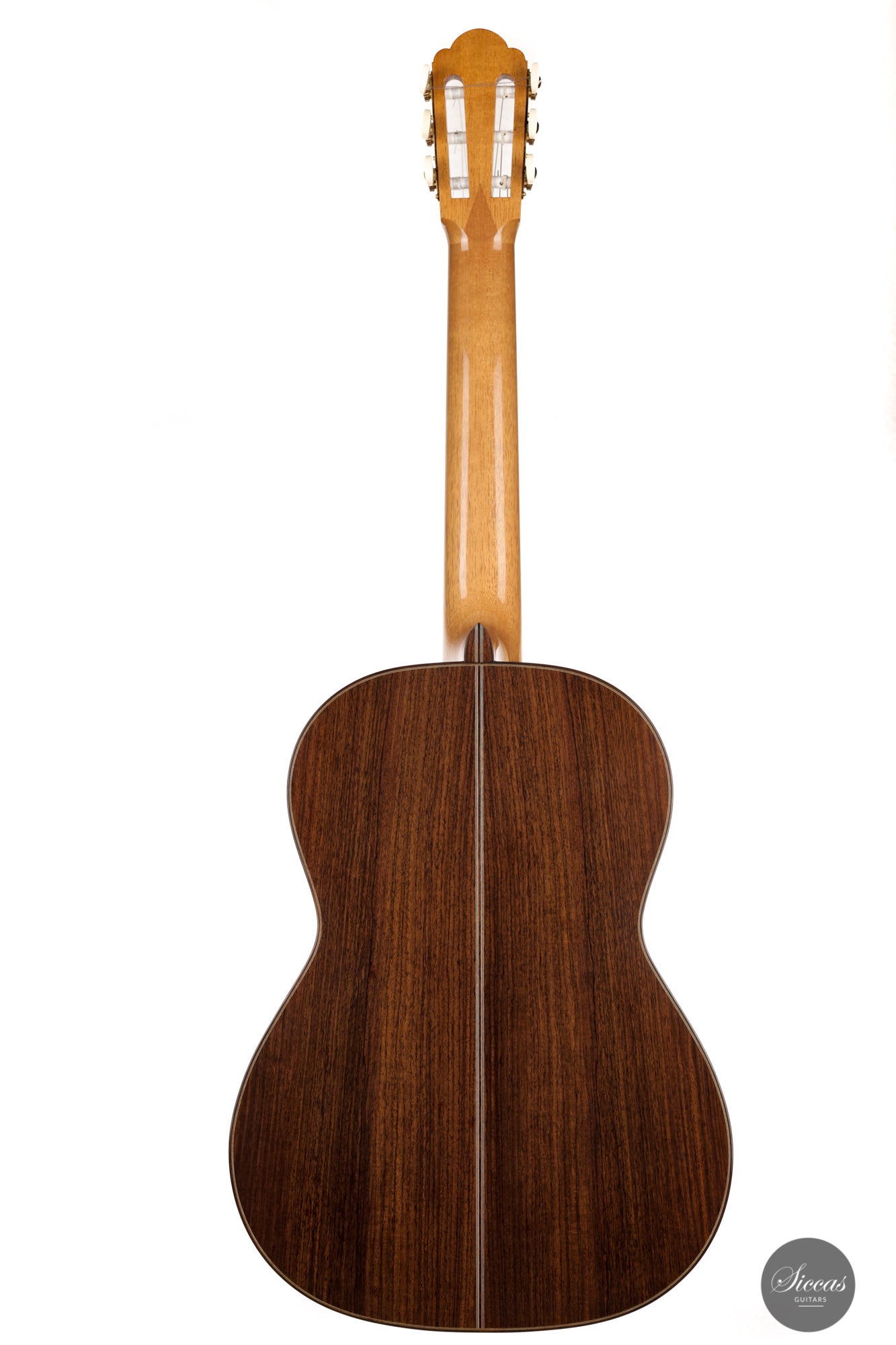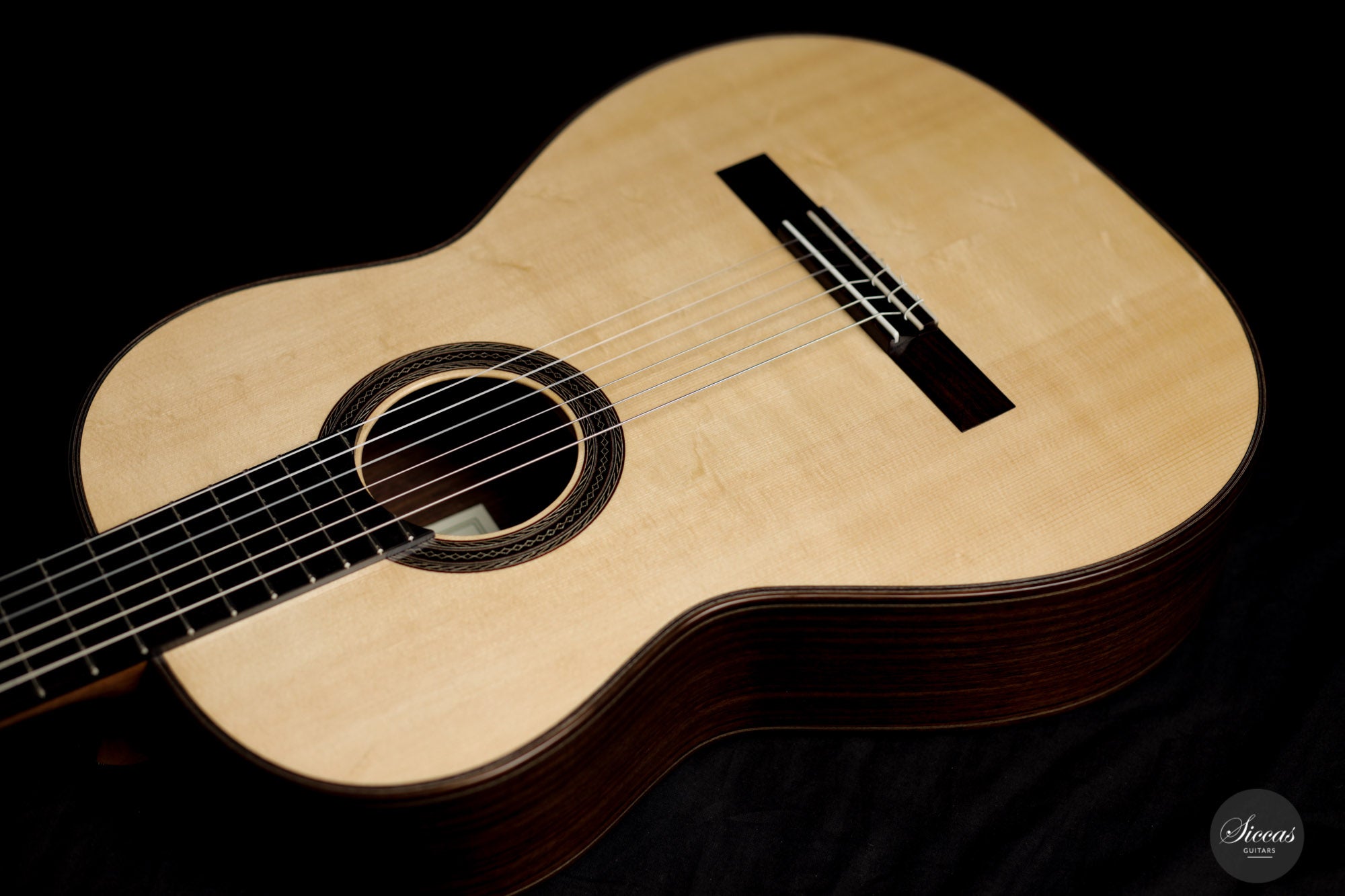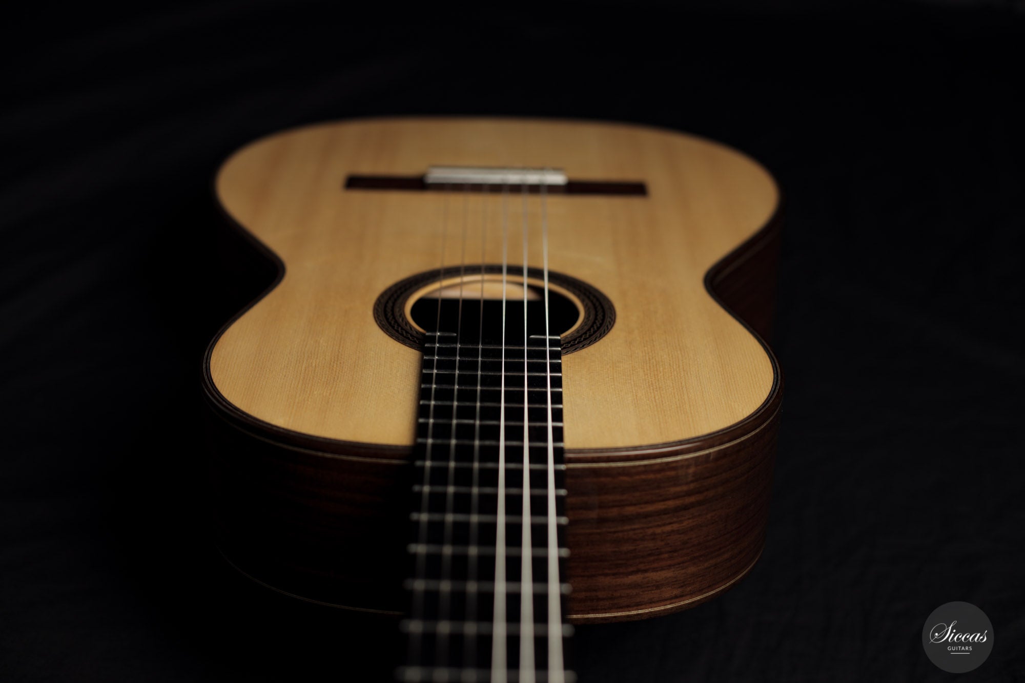 This model by Jean Marquet is based on a German guitar from 1937. A particularly striking detail is the hazel spruce top, which displays beautiful grain and accentuates the overall classy and elegant design. This "Belgian beauty" also has a lot to offer in terms of sound. This traditionally built instrument is comparatively lightweight and as a guitarist, one gets very direct feedback from the entire body when playing. It is a classical guitar with great sound volume, impressive bass, crystal clear trebles, and an abundance of overtones that give the guitar a full-bodied and interesting sound character. It is a great pleasure to play this guitar, not only because of its great playability but also because it rewards the player with many timbres and inspiring musical moments.