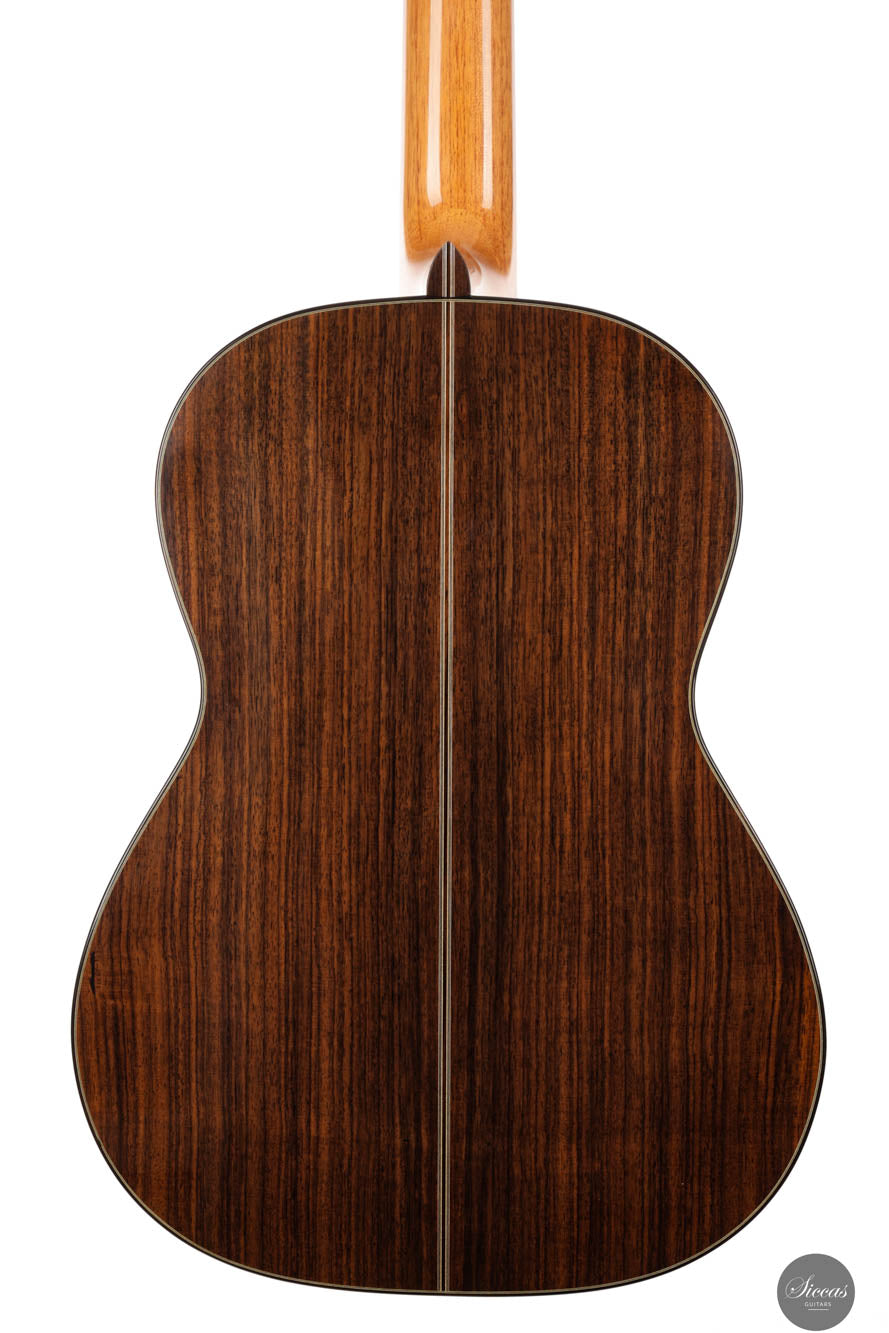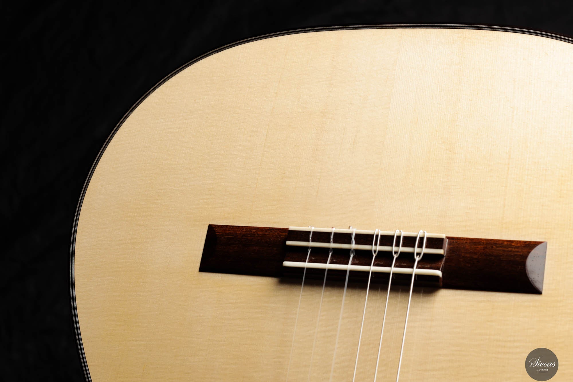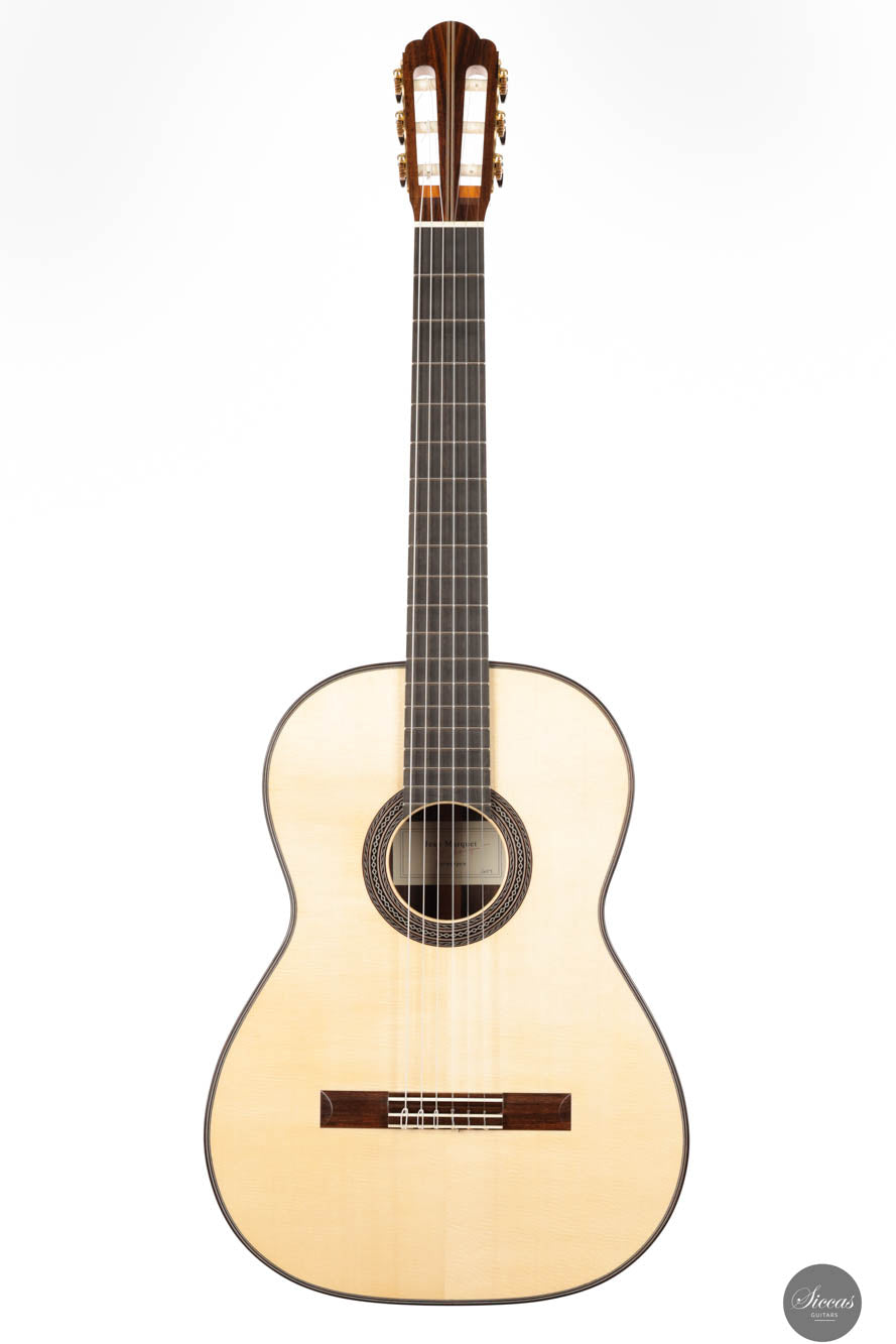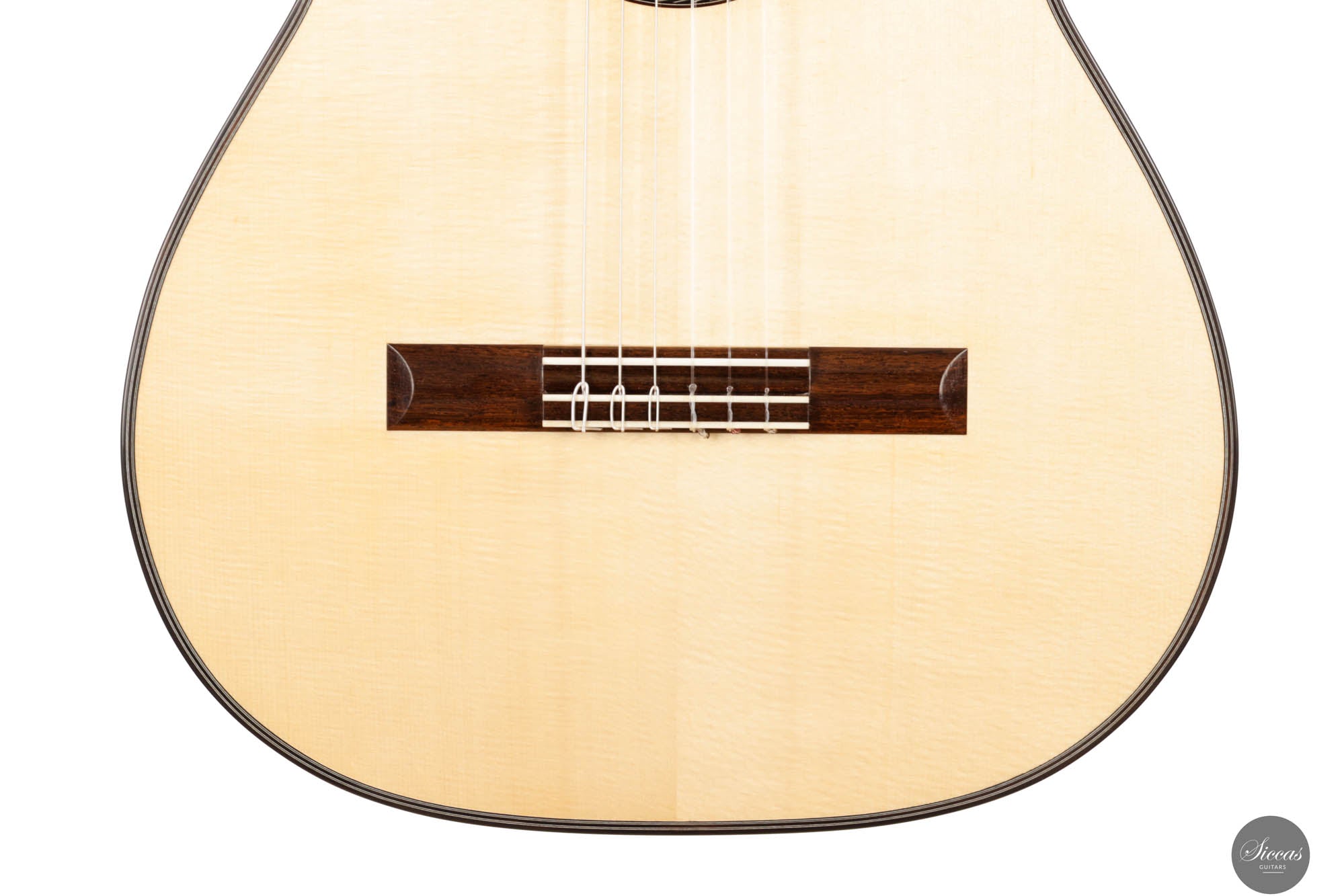 Diese exquisite "Belgische Schönheit" ist eine traditionell gebaute klassische Gitarre, die nicht nur durch ihren ästhetischen Charme, sondern auch durch ihre bemerkenswerte Klangqualität auffällt. Trotz ihrer vergleichsweise leichten Bauweise bietet sie ein sofortiges und greifbares Feedback an den Spieler und resoniert durch ihren gesamten Körper. Die Gitarre besticht durch ein hervorragendes Klangvolumen, gekennzeichnet durch beeindruckende Bässe und kristallklare Höhen, ergänzt durch eine Fülle von Obertönen, die ihren vollmundigen und faszinierenden Klangcharakter bereichern. Ihre Bespielbarkeit ist außergewöhnlich und bietet ein lohnendes Erlebnis mit einer Vielzahl von Klangfarben und inspirierenden musikalischen Momenten. Die Fichtenschalldecke zeichnet sich durch ein einzigartiges Design mit einem Querbalken über den Fächerbeleistungen aus, das an den Stil von Friederich erinnert, und die Seiten sind mit jeweils fünf Streben verstärkt, was zu einem steiferen Körper und einer lineareren Projektion führt. Der großartige Sustain und die lange, singende Stimme jeder Note machen sie zur idealen Wahl sowohl für technisch versierte Spieler als auch für jüngere Musiker, die ein Instrument suchen, das ihre Leistung unterstützt und verstärkt.