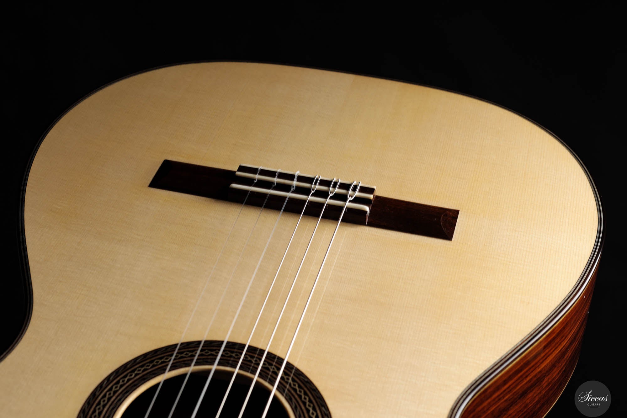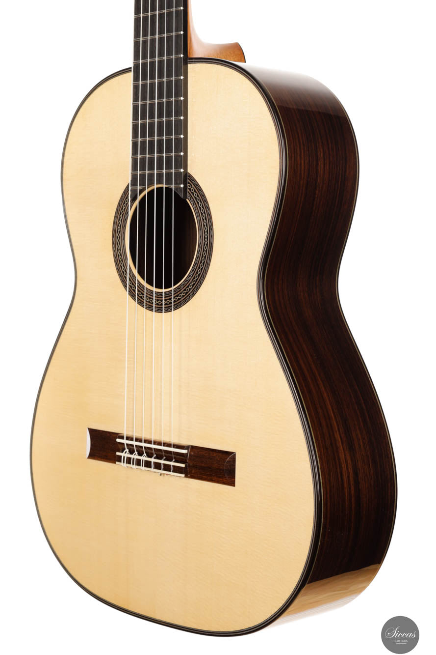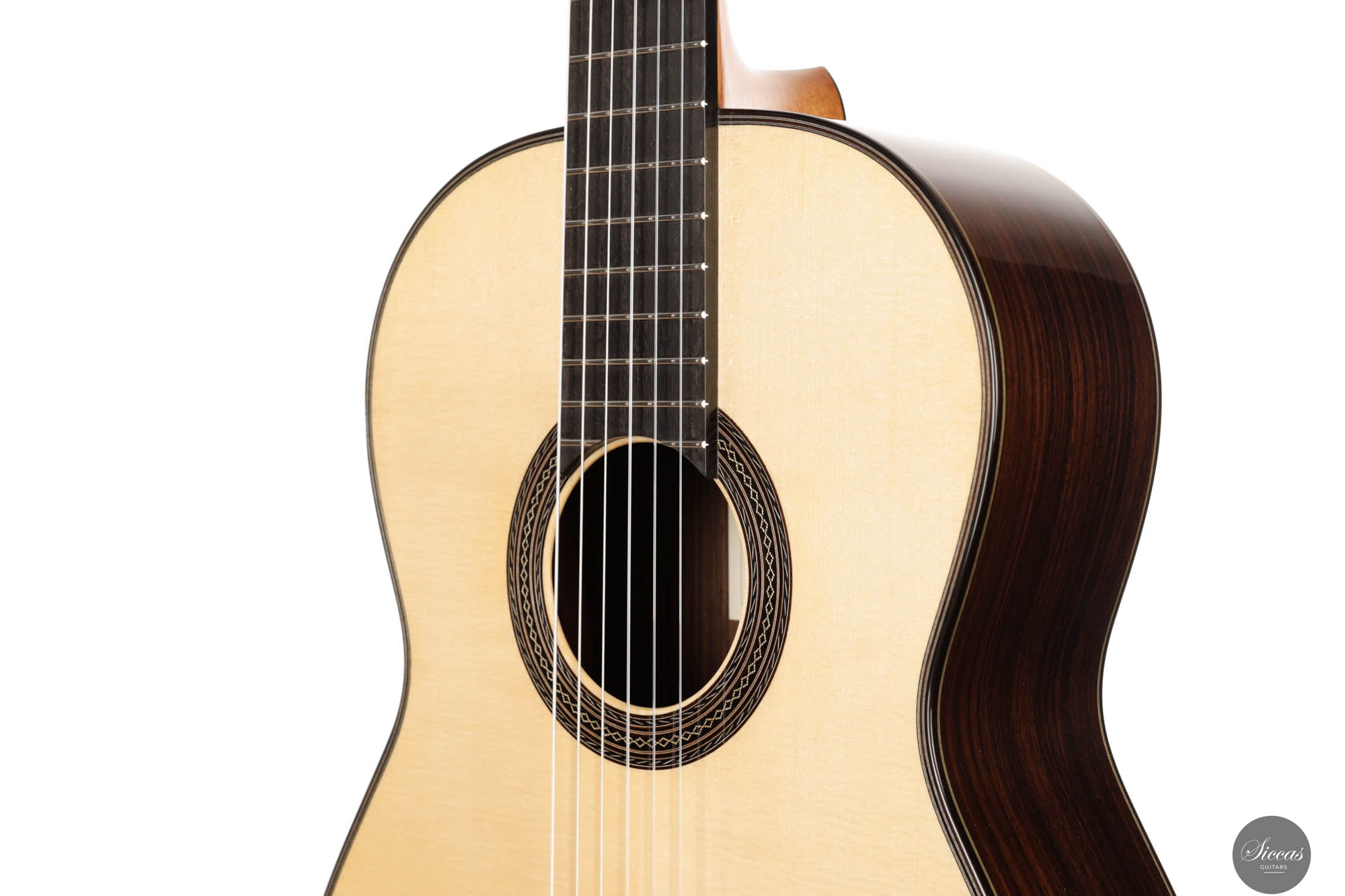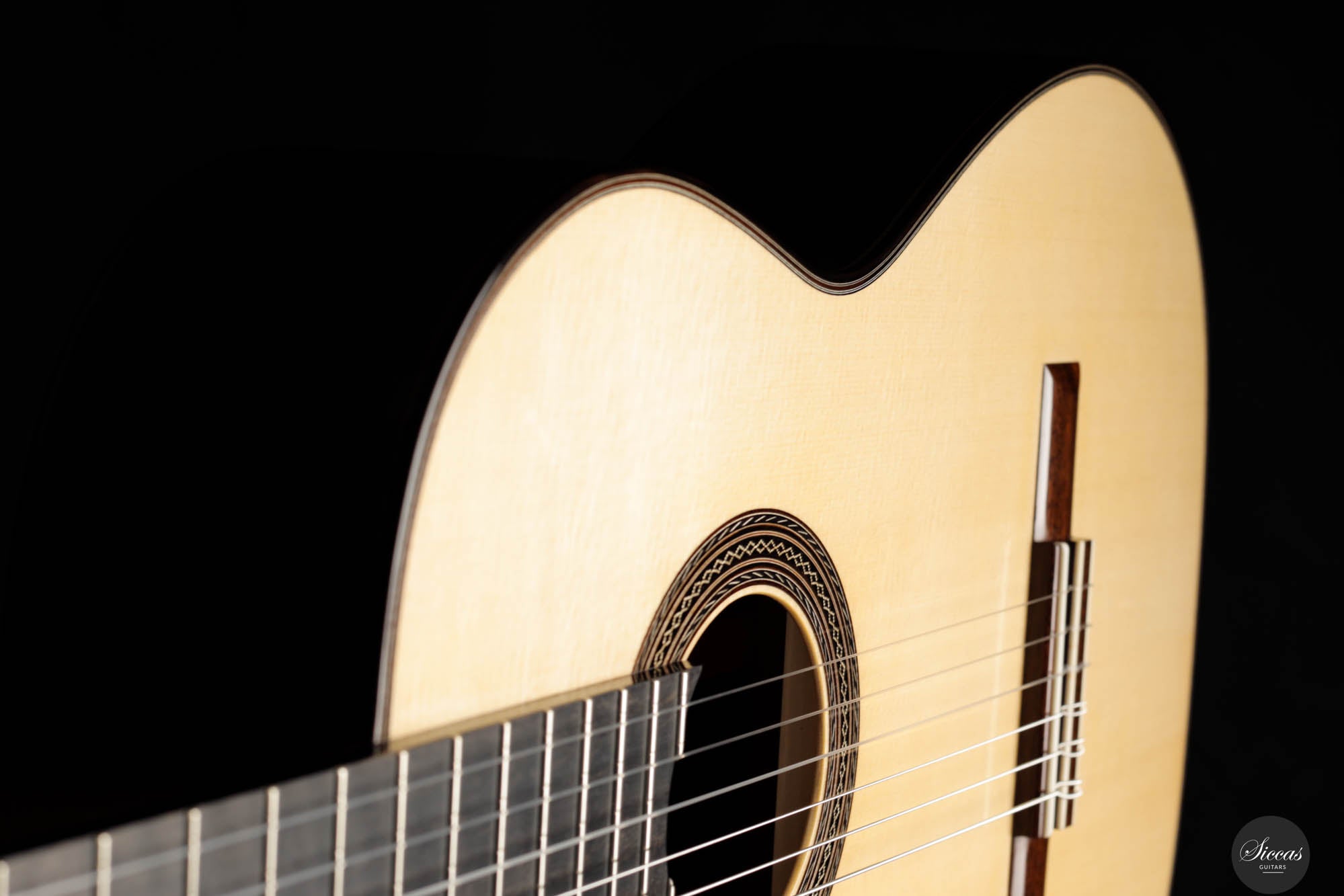 Diese exquisite "Belgische Schönheit" ist eine traditionell gebaute klassische Gitarre, die nicht nur durch ihren ästhetischen Charme, sondern auch durch ihre bemerkenswerte Klangqualität auffällt. Trotz ihrer vergleichsweise leichten Bauweise bietet sie ein sofortiges und greifbares Feedback an den Spieler und resoniert durch ihren gesamten Körper. Die Gitarre besticht durch ein hervorragendes Klangvolumen, gekennzeichnet durch beeindruckende Bässe und kristallklare Höhen, ergänzt durch eine Fülle von Obertönen, die ihren vollmundigen und faszinierenden Klangcharakter bereichern. Ihre Bespielbarkeit ist außergewöhnlich und bietet ein lohnendes Erlebnis mit einer Vielzahl von Klangfarben und inspirierenden musikalischen Momenten. Die Fichtenschalldecke zeichnet sich durch ein einzigartiges Design mit einem Querbalken über den Fächerbeleistungen aus, das an den Stil von Friederich erinnert, und die Seiten sind mit jeweils fünf Streben verstärkt, was zu einem steiferen Körper und einer lineareren Projektion führt. Der großartige Sustain und die lange, singende Stimme jeder Note machen sie zur idealen Wahl sowohl für technisch versierte Spieler als auch für jüngere Musiker, die ein Instrument suchen, das ihre Leistung unterstützt und verstärkt.