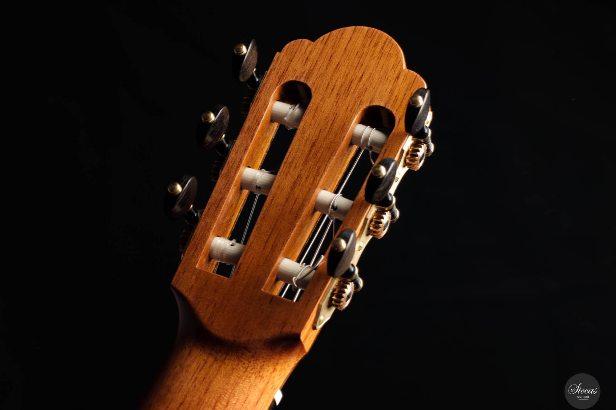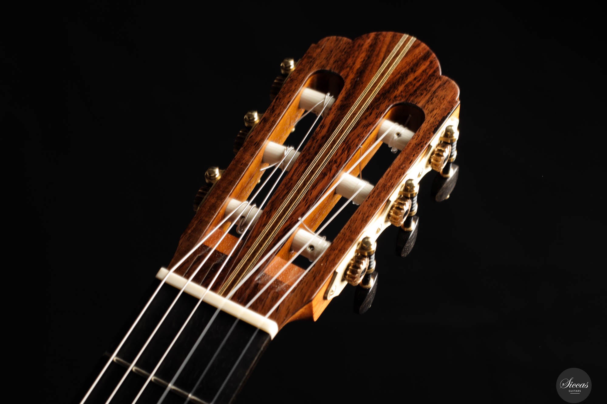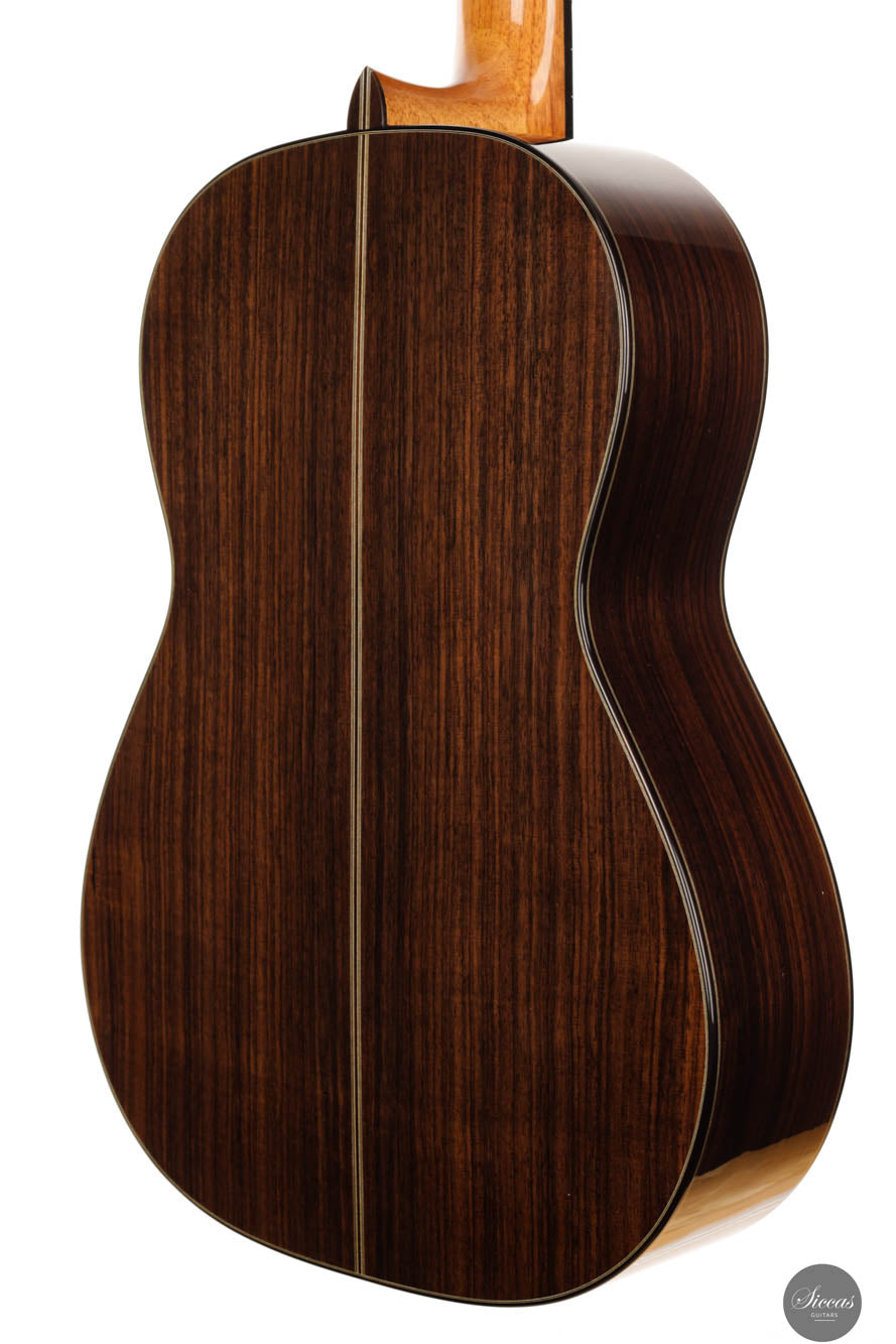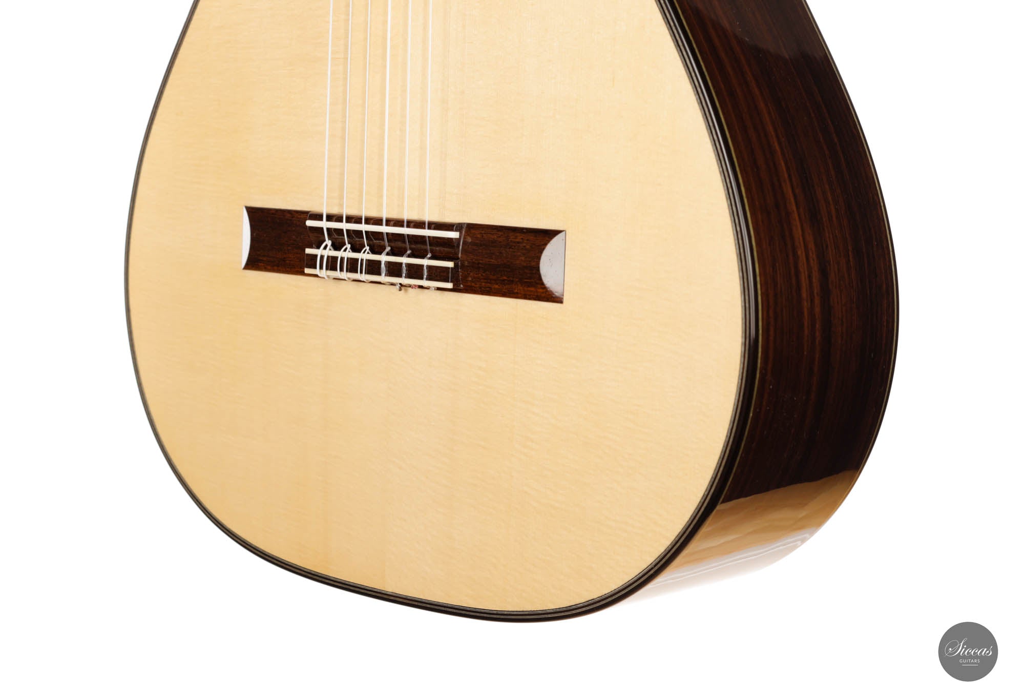 Diese exquisite "Belgische Schönheit" ist eine traditionell gebaute klassische Gitarre, die nicht nur durch ihren ästhetischen Charme, sondern auch durch ihre bemerkenswerte Klangqualität auffällt. Trotz ihrer vergleichsweise leichten Bauweise bietet sie ein sofortiges und greifbares Feedback an den Spieler und resoniert durch ihren gesamten Körper. Die Gitarre besticht durch ein hervorragendes Klangvolumen, gekennzeichnet durch beeindruckende Bässe und kristallklare Höhen, ergänzt durch eine Fülle von Obertönen, die ihren vollmundigen und faszinierenden Klangcharakter bereichern. Ihre Bespielbarkeit ist außergewöhnlich und bietet ein lohnendes Erlebnis mit einer Vielzahl von Klangfarben und inspirierenden musikalischen Momenten. Die Fichtenschalldecke zeichnet sich durch ein einzigartiges Design mit einem Querbalken über den Fächerbeleistungen aus, das an den Stil von Friederich erinnert, und die Seiten sind mit jeweils fünf Streben verstärkt, was zu einem steiferen Körper und einer lineareren Projektion führt. Der großartige Sustain und die lange, singende Stimme jeder Note machen sie zur idealen Wahl sowohl für technisch versierte Spieler als auch für jüngere Musiker, die ein Instrument suchen, das ihre Leistung unterstützt und verstärkt.