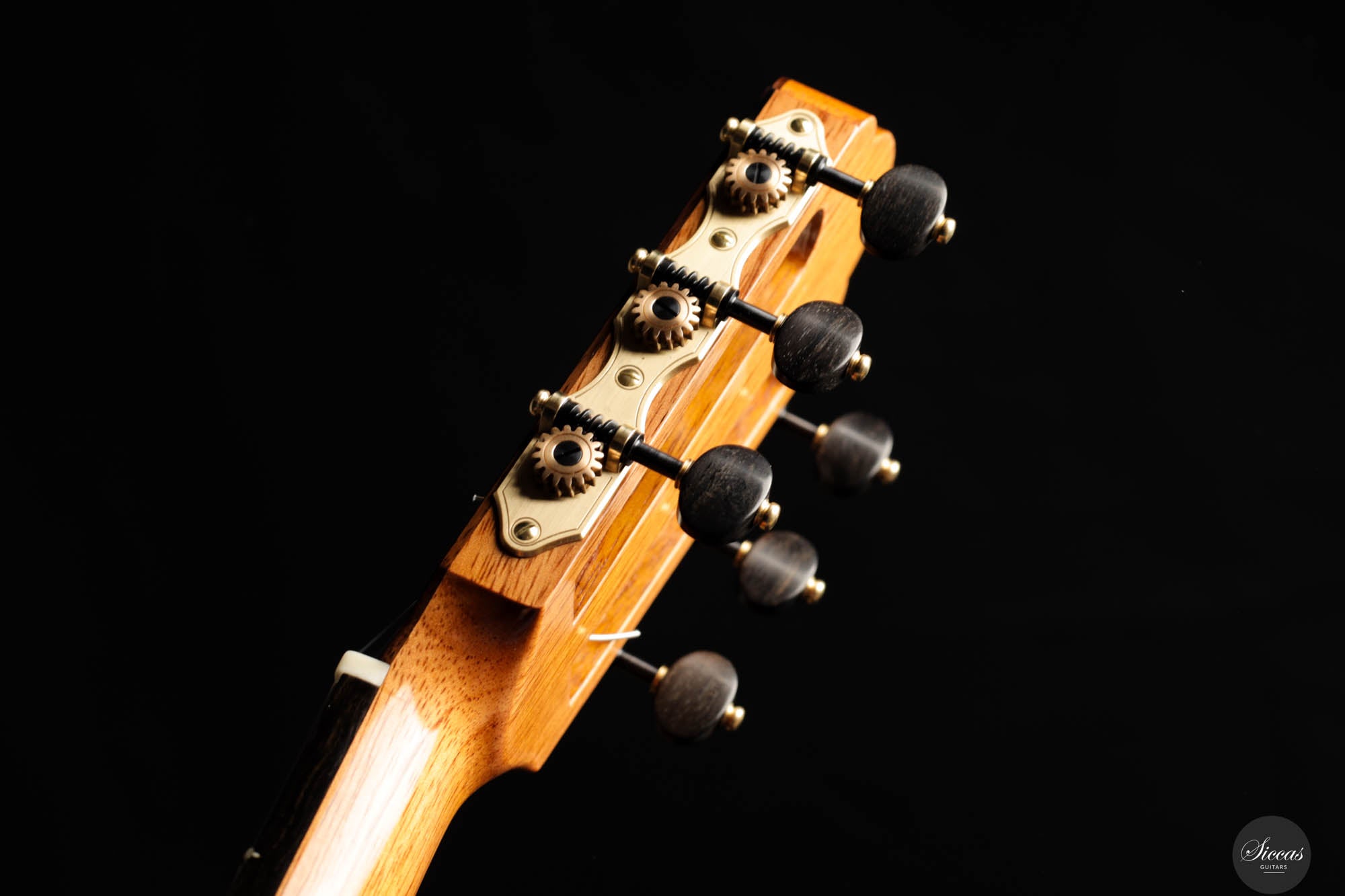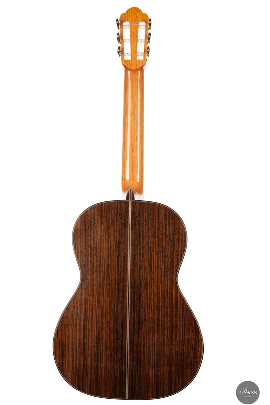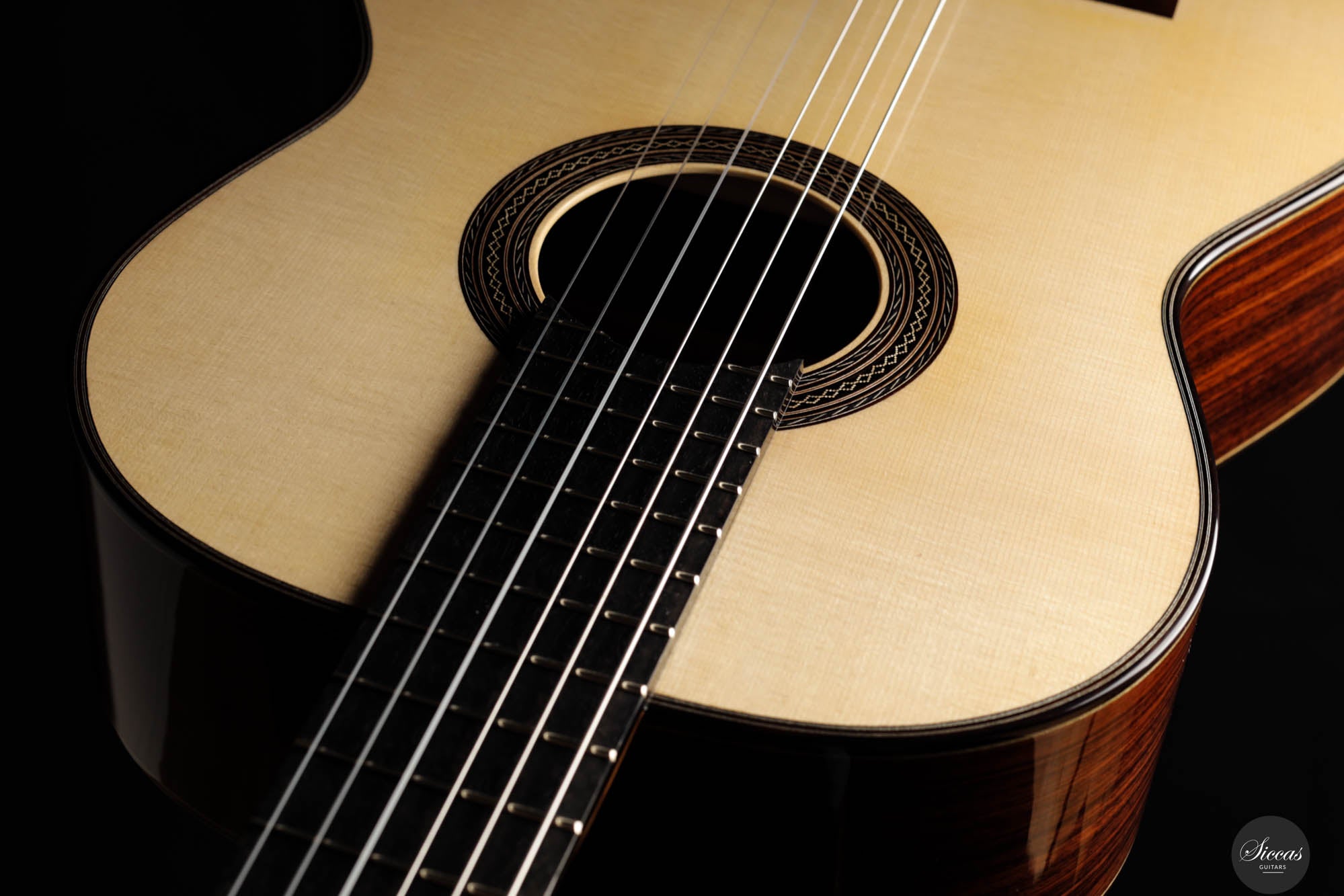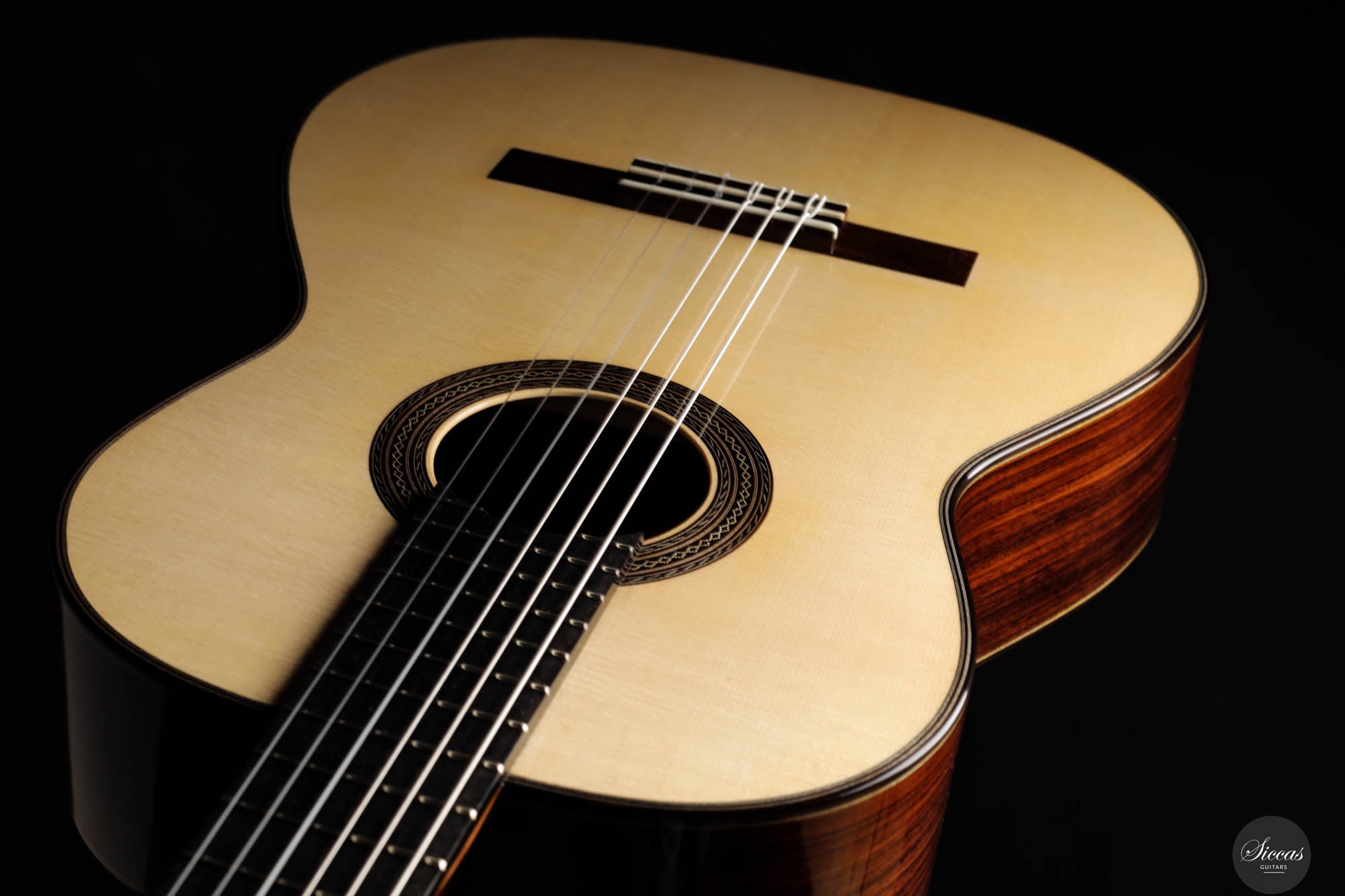 Diese exquisite "Belgische Schönheit" ist eine traditionell gebaute klassische Gitarre, die nicht nur durch ihren ästhetischen Charme, sondern auch durch ihre bemerkenswerte Klangqualität auffällt. Trotz ihrer vergleichsweise leichten Bauweise bietet sie ein sofortiges und greifbares Feedback an den Spieler und resoniert durch ihren gesamten Körper. Die Gitarre besticht durch ein hervorragendes Klangvolumen, gekennzeichnet durch beeindruckende Bässe und kristallklare Höhen, ergänzt durch eine Fülle von Obertönen, die ihren vollmundigen und faszinierenden Klangcharakter bereichern. Ihre Bespielbarkeit ist außergewöhnlich und bietet ein lohnendes Erlebnis mit einer Vielzahl von Klangfarben und inspirierenden musikalischen Momenten. Die Fichtenschalldecke zeichnet sich durch ein einzigartiges Design mit einem Querbalken über den Fächerbeleistungen aus, das an den Stil von Friederich erinnert, und die Seiten sind mit jeweils fünf Streben verstärkt, was zu einem steiferen Körper und einer lineareren Projektion führt. Der großartige Sustain und die lange, singende Stimme jeder Note machen sie zur idealen Wahl sowohl für technisch versierte Spieler als auch für jüngere Musiker, die ein Instrument suchen, das ihre Leistung unterstützt und verstärkt.