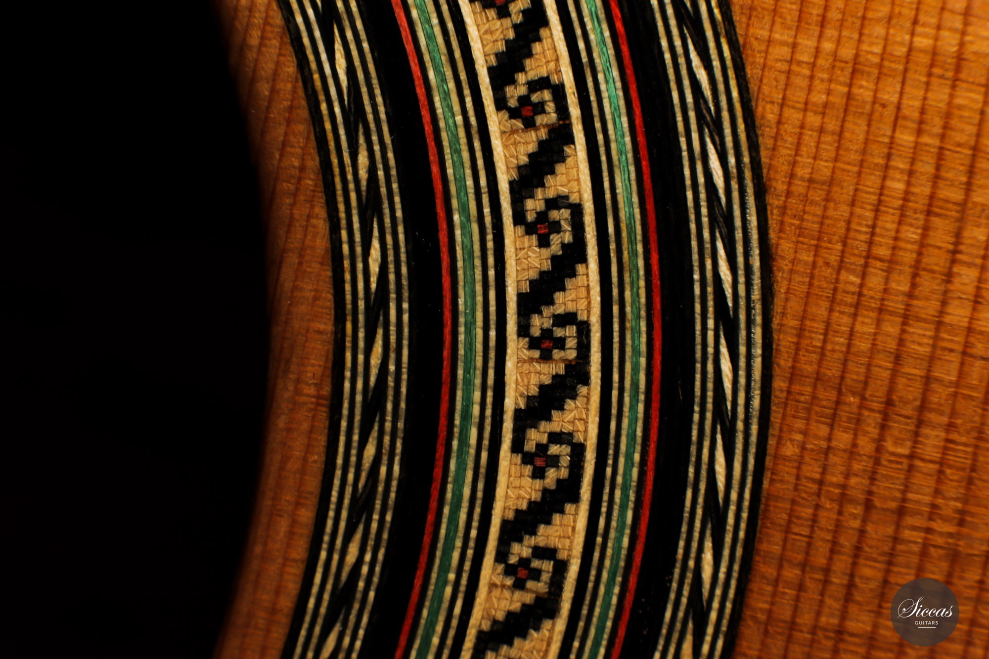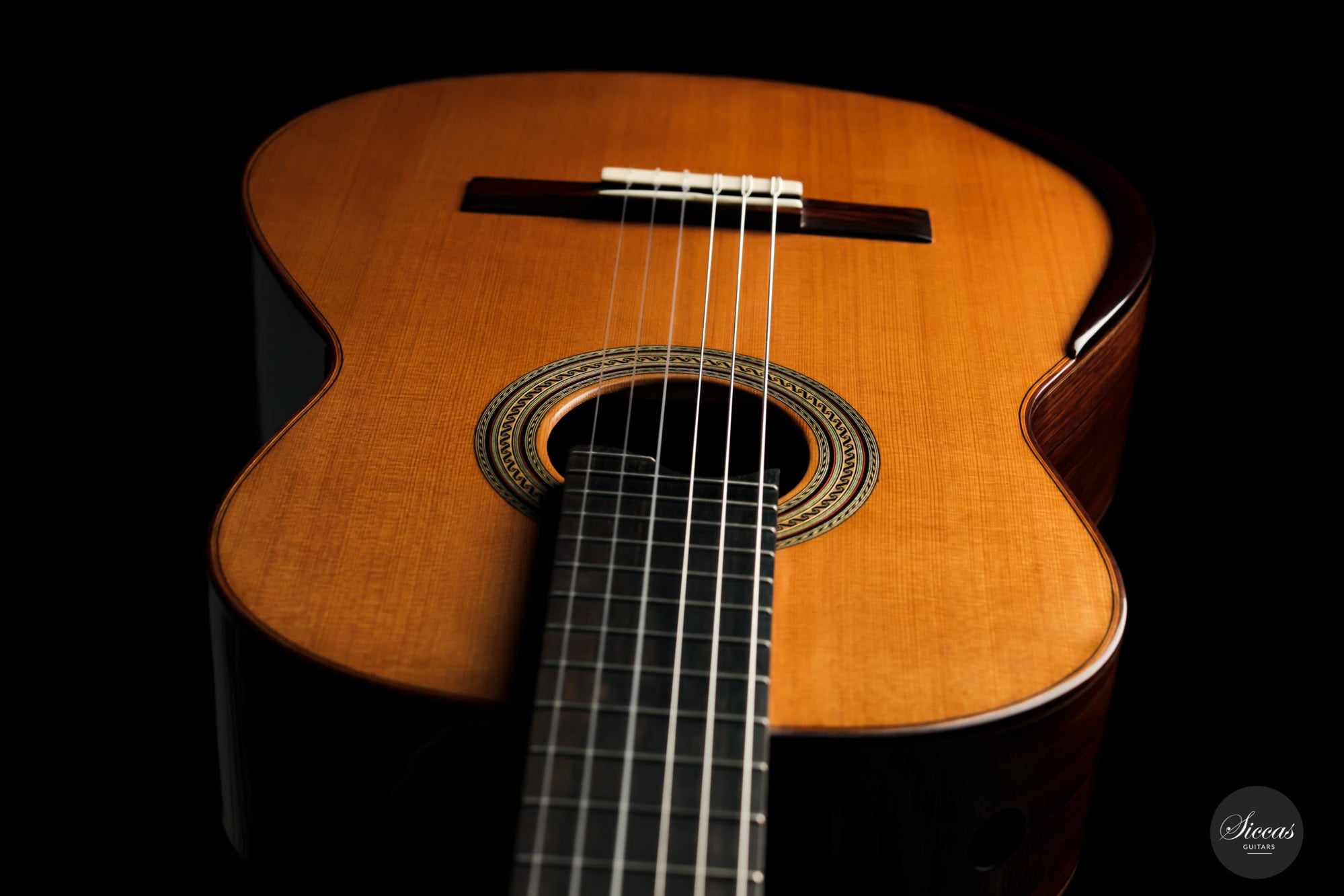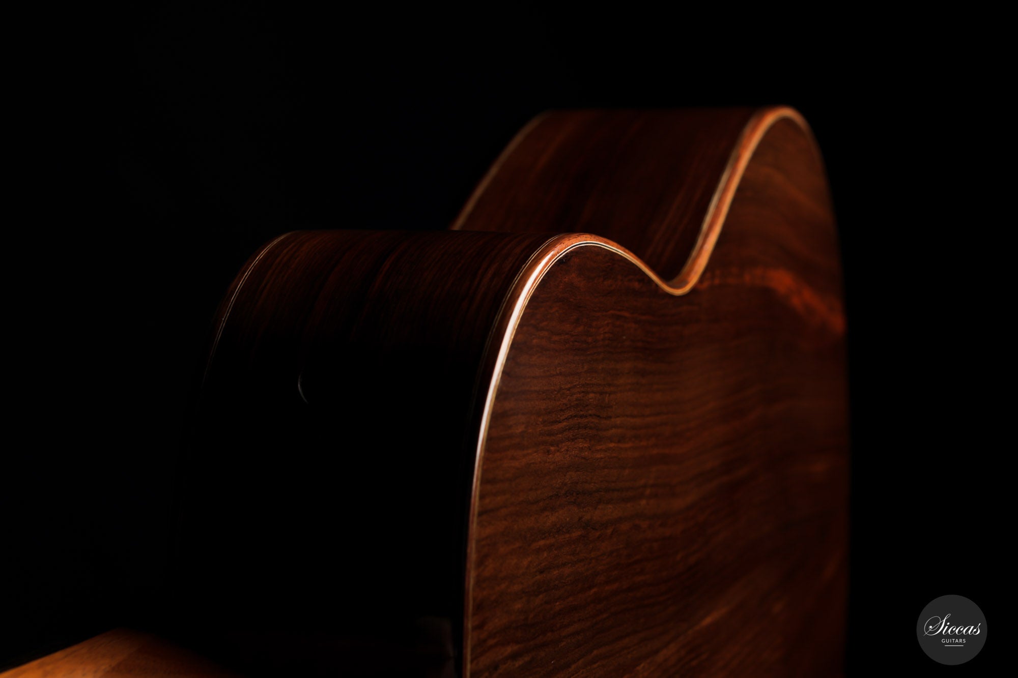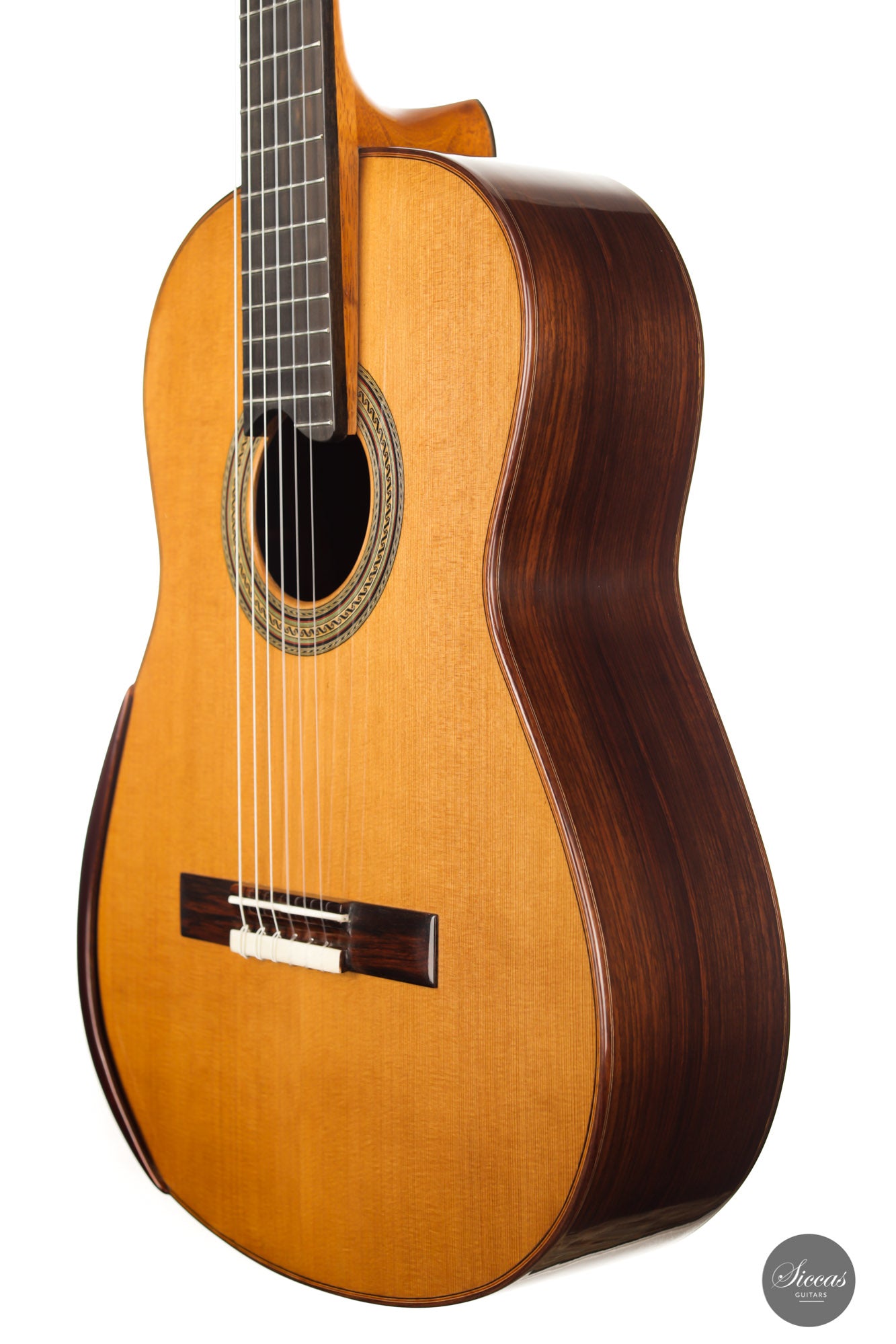 For this guitar, he used a Nomex core for most of the soundboard surface and a balsa core for the bridge area. This unique approach provides all the benefits of double-top construction, such as tonal volume, direct response and a wider dynamic range, plus an extra organic and natural touch to the sound. There is a small additional sound port on the side of the guitar that can help the musician to play more dynamically and gives them direct feedback, a very nice feature. The raised fingerboard is helpful when playing in the upper registers of the fretboard. The cedar top gives this guitar a dark and smooth tonal character with a comprehensive richness. The rich and gritty treble, coupled with rich basses, make for a powerful instrument that is by no means overwhelming but very inspiring for the guitarist.
