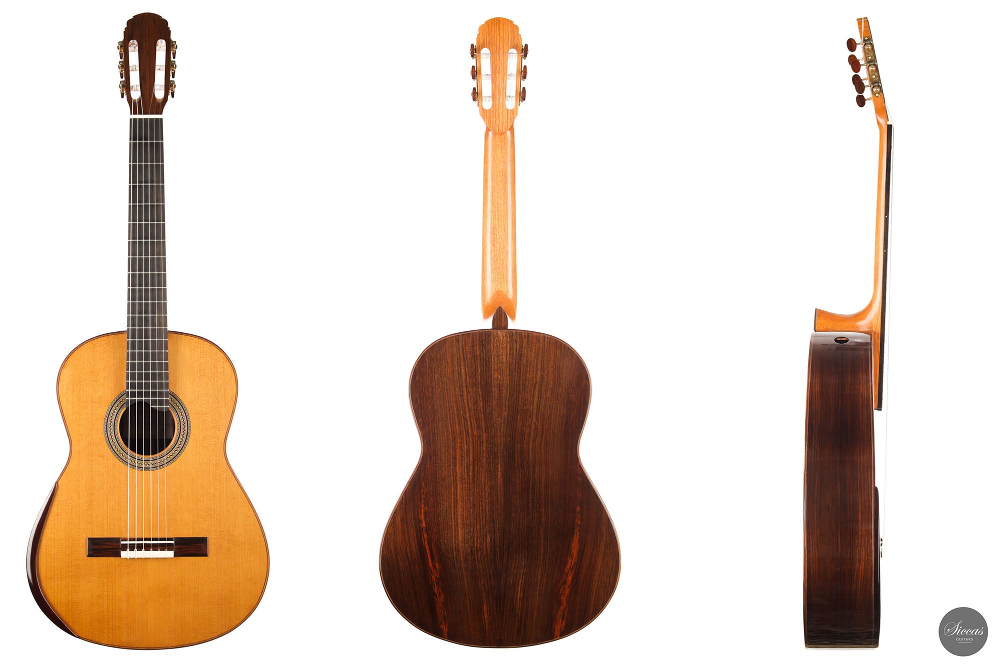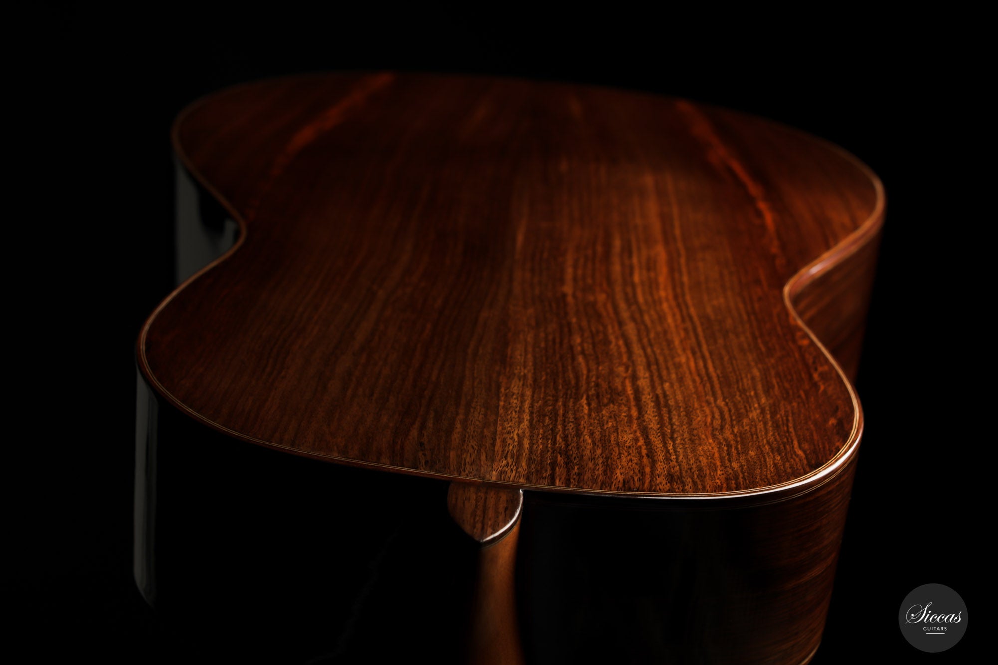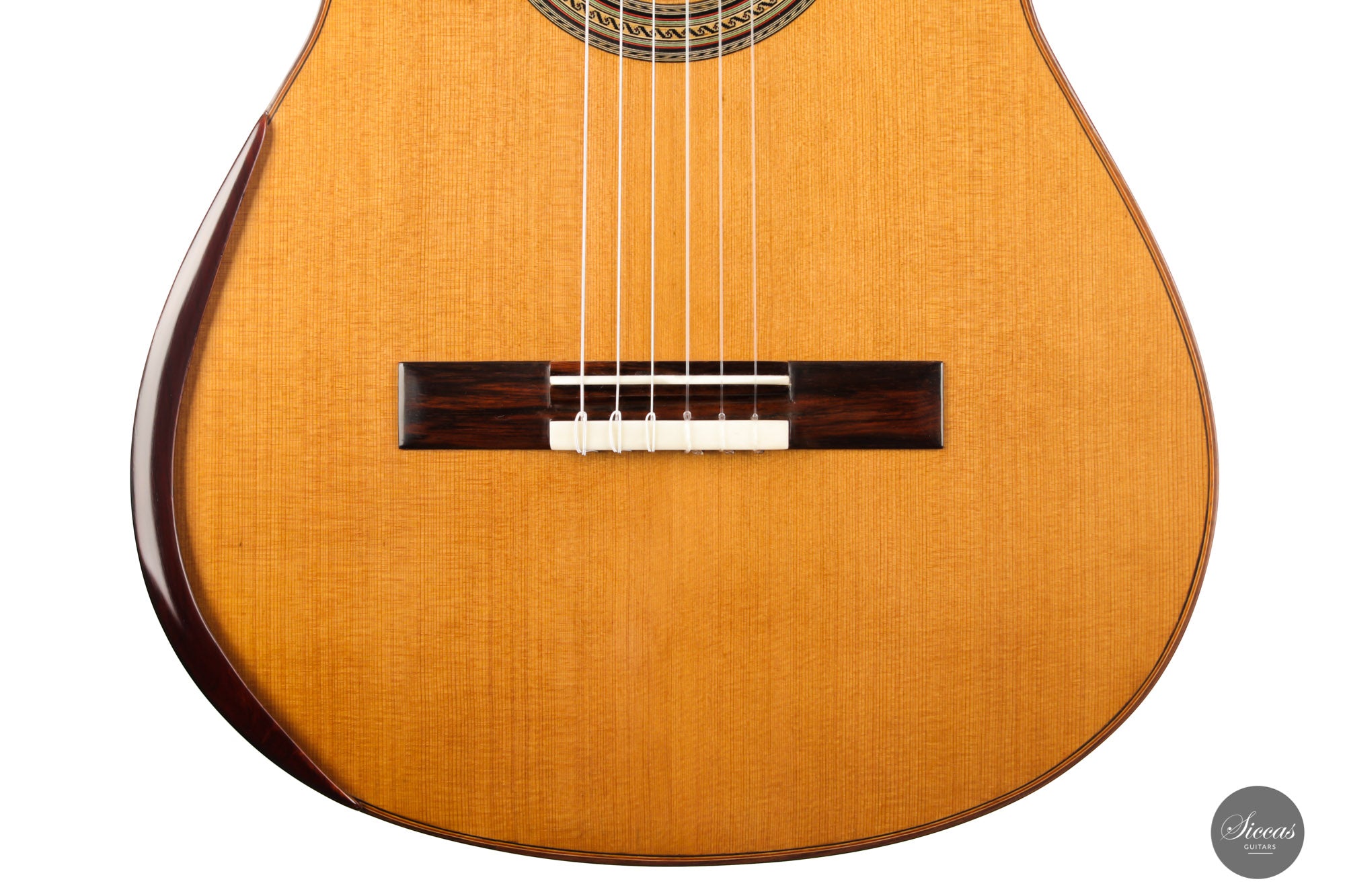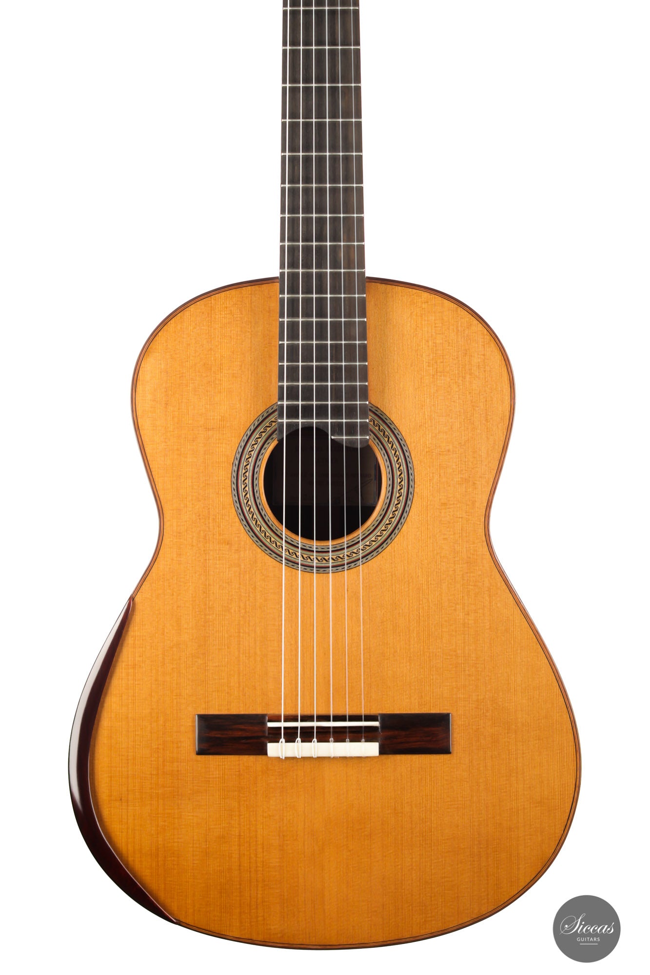 For this guitar, he used a Nomex core for most of the soundboard surface and a balsa core for the bridge area. This unique approach provides all the benefits of double-top construction, such as tonal volume, direct response and a wider dynamic range, plus an extra organic and natural touch to the sound. There is a small additional sound port on the side of the guitar that can help the musician to play more dynamically and gives them direct feedback, a very nice feature. The raised fingerboard is helpful when playing in the upper registers of the fretboard. The cedar top gives this guitar a dark and smooth tonal character with a comprehensive richness. The rich and gritty treble, coupled with rich basses, make for a powerful instrument that is by no means overwhelming but very inspiring for the guitarist.