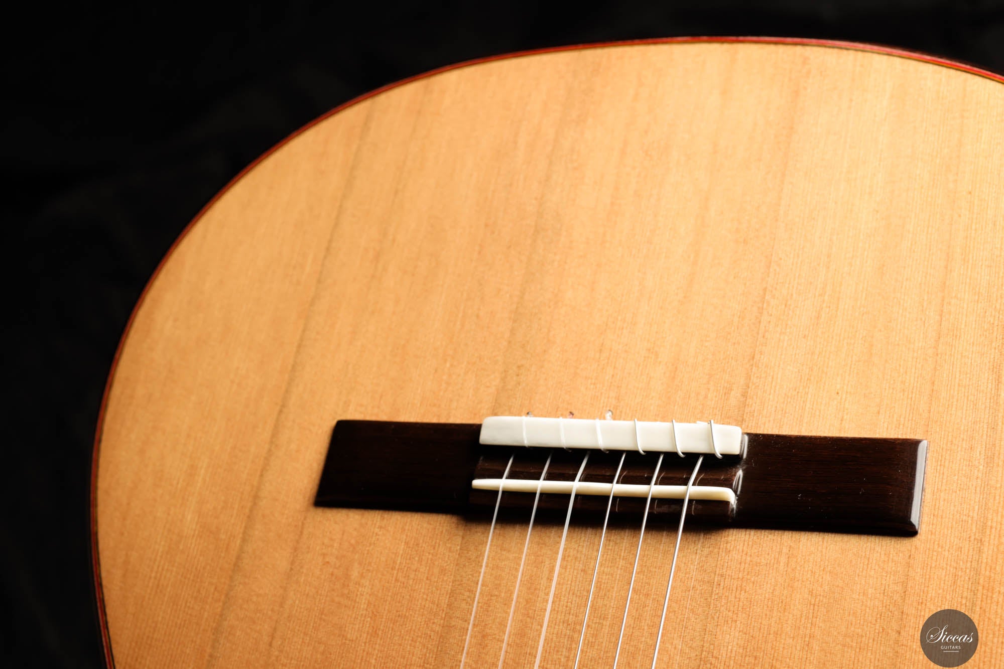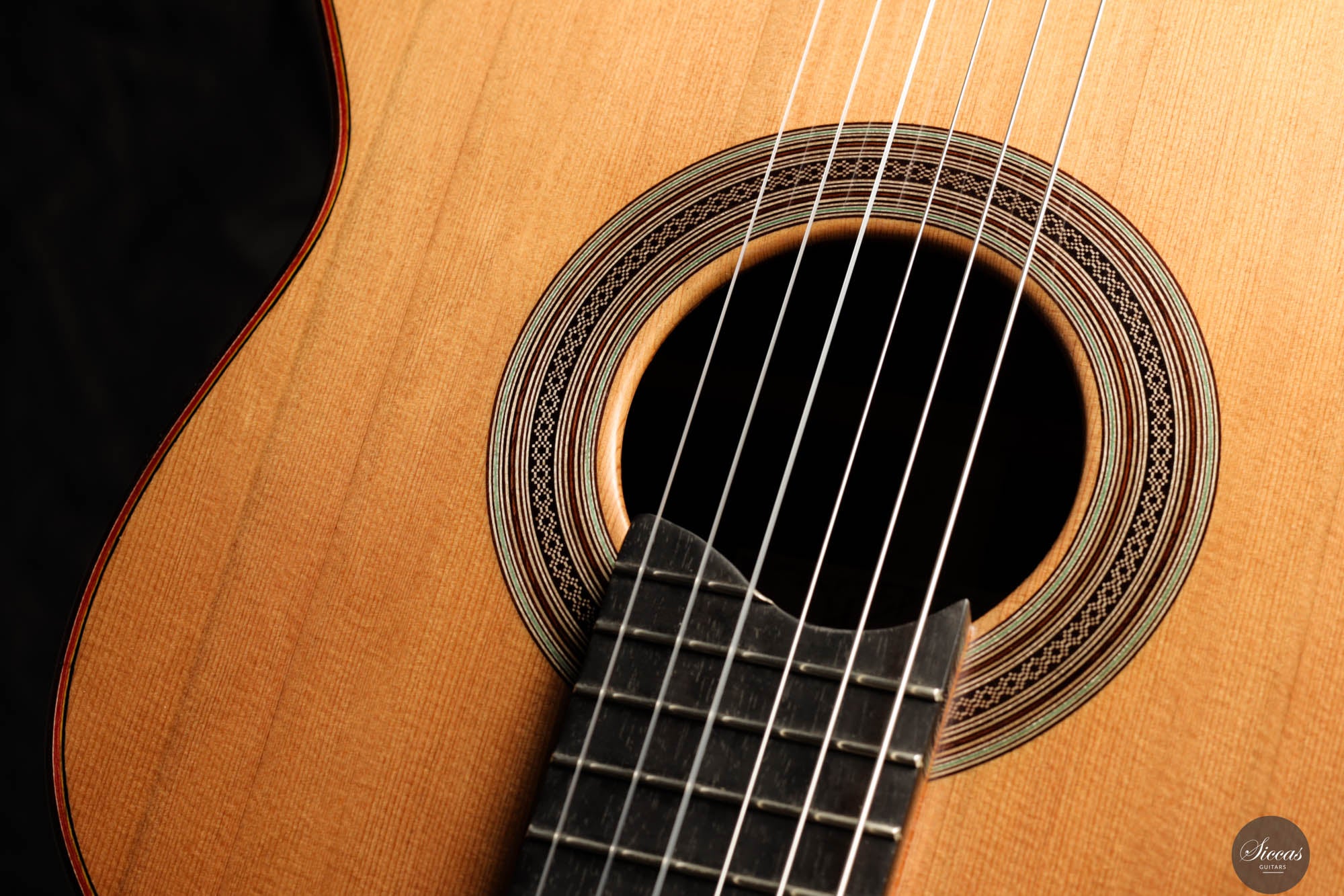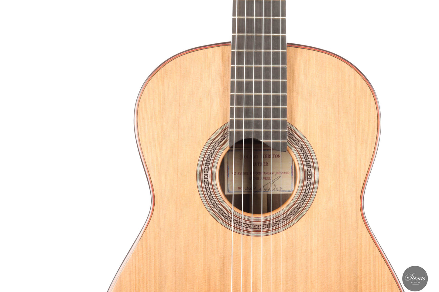 Jean-Noël Lebreton ist ein französischer Gitarrenbauer, der in der Nähe von Avrillé in Frankreich lebt. Nach seinem erfolgreichen Studium am College of Furniture in London von 1989 bis 1993 eröffnete er 1997 seine erste Werkstatt. Seitdem hat er sich auf den Bau von Doppel-Top-Konzertgitarren spezialisiert und erkundet die vielfältigen Möglichkeiten, die diese raffinierte Technik bietet. Interessanterweise verwendet er sowohl Nomex-Kern- als auch Balsa-Kern-Techniken, um die Resonanzbereiche der Decke abzustimmen und einen einzigartigen Klang zu erzielen. Diese Gitarre aus dem Jahr 2024, mit der Nummer 47-197, verfügt über eine Doppel-Top-Konstruktion mit einer Zederndecke sowie doppeltem Boden und Zargen aus indischem Palisander. Das erhöhte Griffbrett erleichtert das Spiel in den höheren Registern des Griffbretts. Die kraftvollen und leicht rauen Höhen ergänzen die klaren und präzisen Bässe, was zu einem ausdrucksstarken Klang führt. Diese Gitarre ist ein inspirierendes Instrument, das durch seine Klangqualität und Spielbarkeit begeistert, ohne dabei überwältigend zu wirken.