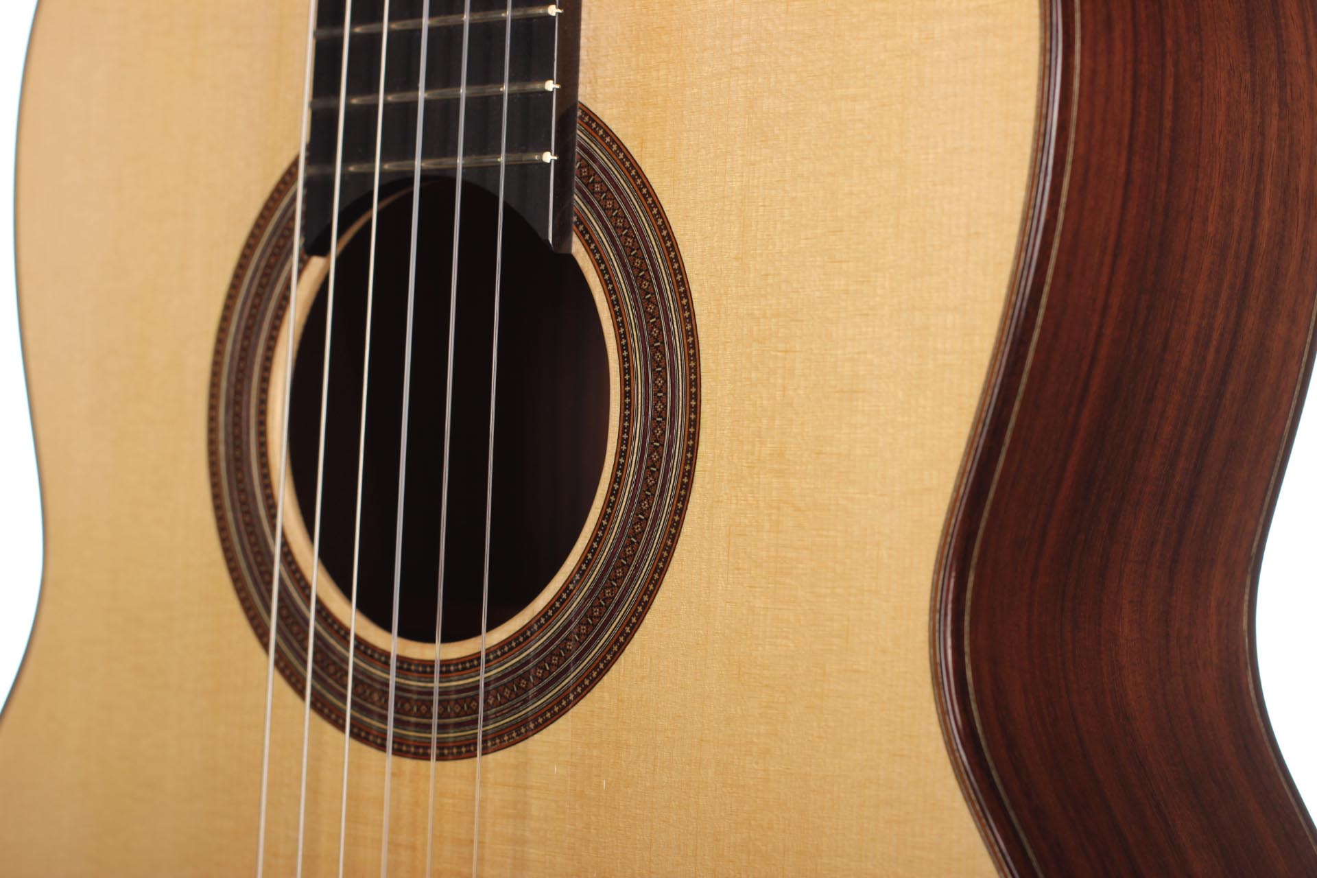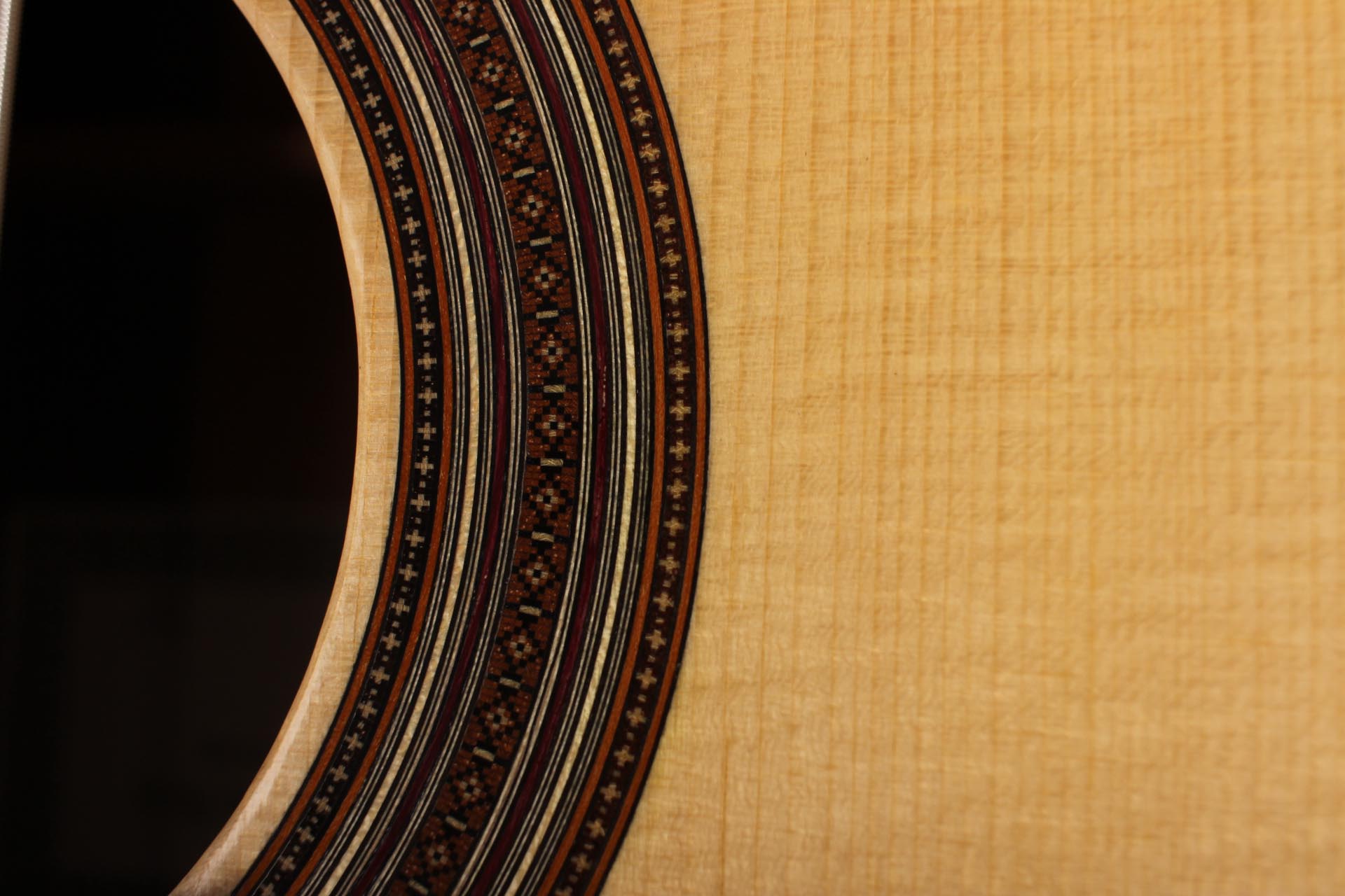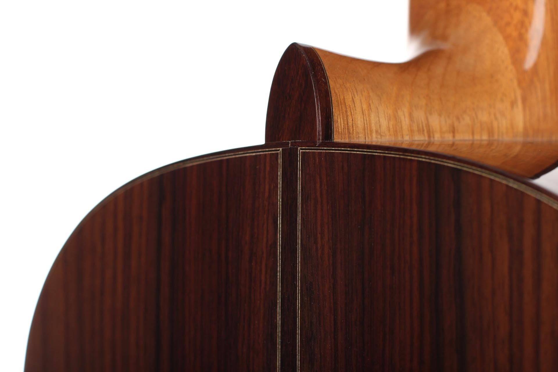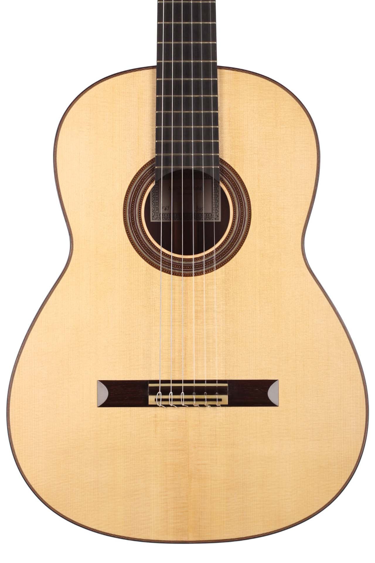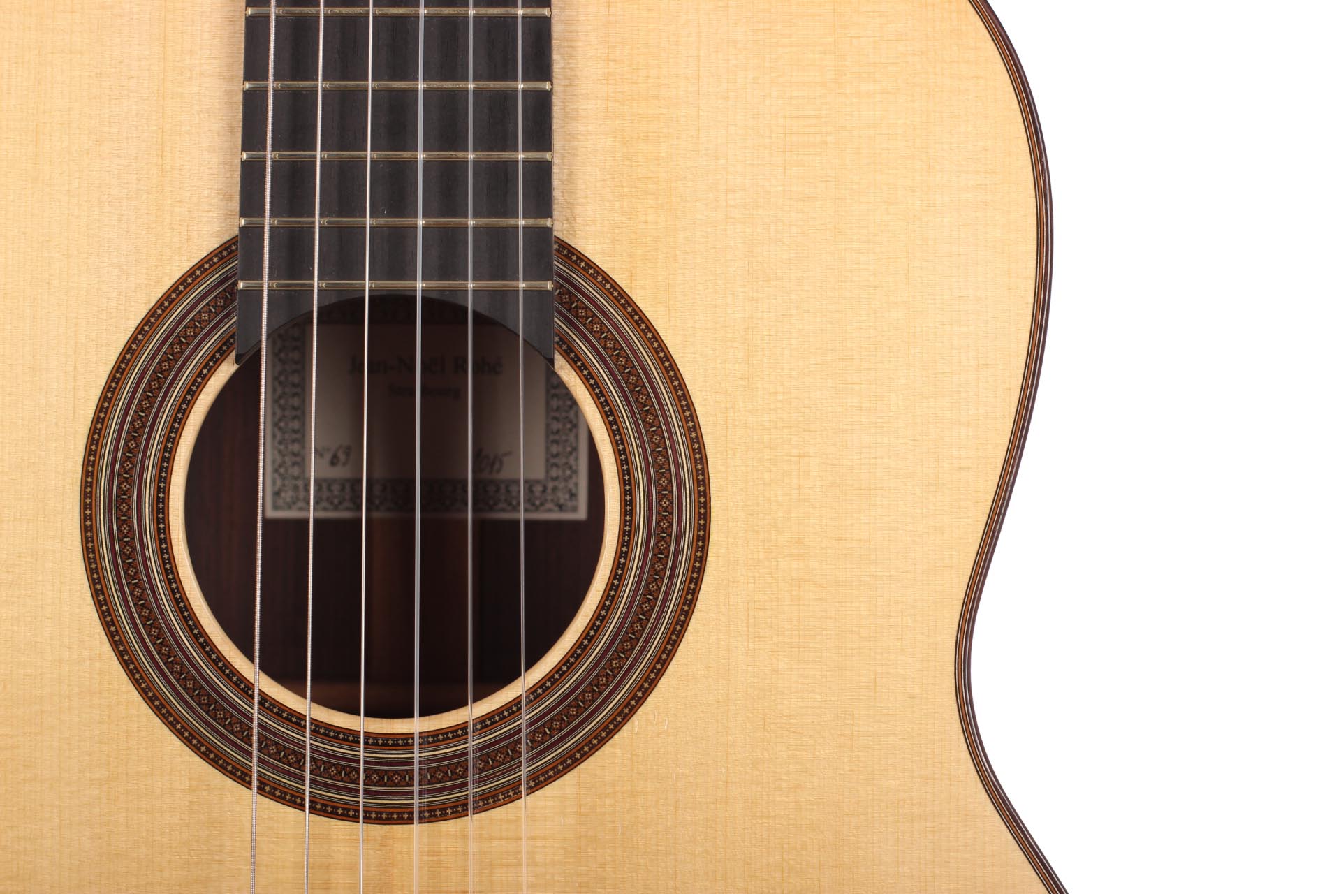 Jean-Noël Rohé studierte Instrumentenbau am Sherwood College in Newark (England) bei Tony Johnson und Roy Courtnall. Im Jahr 2004 erhielt er die Auszeichnung 'Un des Meilleur Ouvrier de France'. Jean-Noël steht ganz in der Tradition französischer Gitarrenbauer wie etwa Daniel Friederich und Dominique Field. Aufgrund der sehr hohen Nachfrage hat er eine Warteliste von acht Jahren und er baut 10 Gitarren im Jahr. Diese Gitarre wurde 2015 gebaut und hat eine wunderschöne Fichtendecke. Boden und Zargen sind aus indischem Palisander gefertigt. Veredelt wurde die Gitarre mit einer Schellackhandpolitur. Die Gitarre hat minimale Spielspuren. Unterhalb des Stegs befindet sich eine kleine Kerbe, welche durch eine am Knüpfsteg durchgerutschte Saite entstand. Die Mechaniken sind von Klaus Scheller. Eine Hiscox Pro II Koffer ist inklusive.
