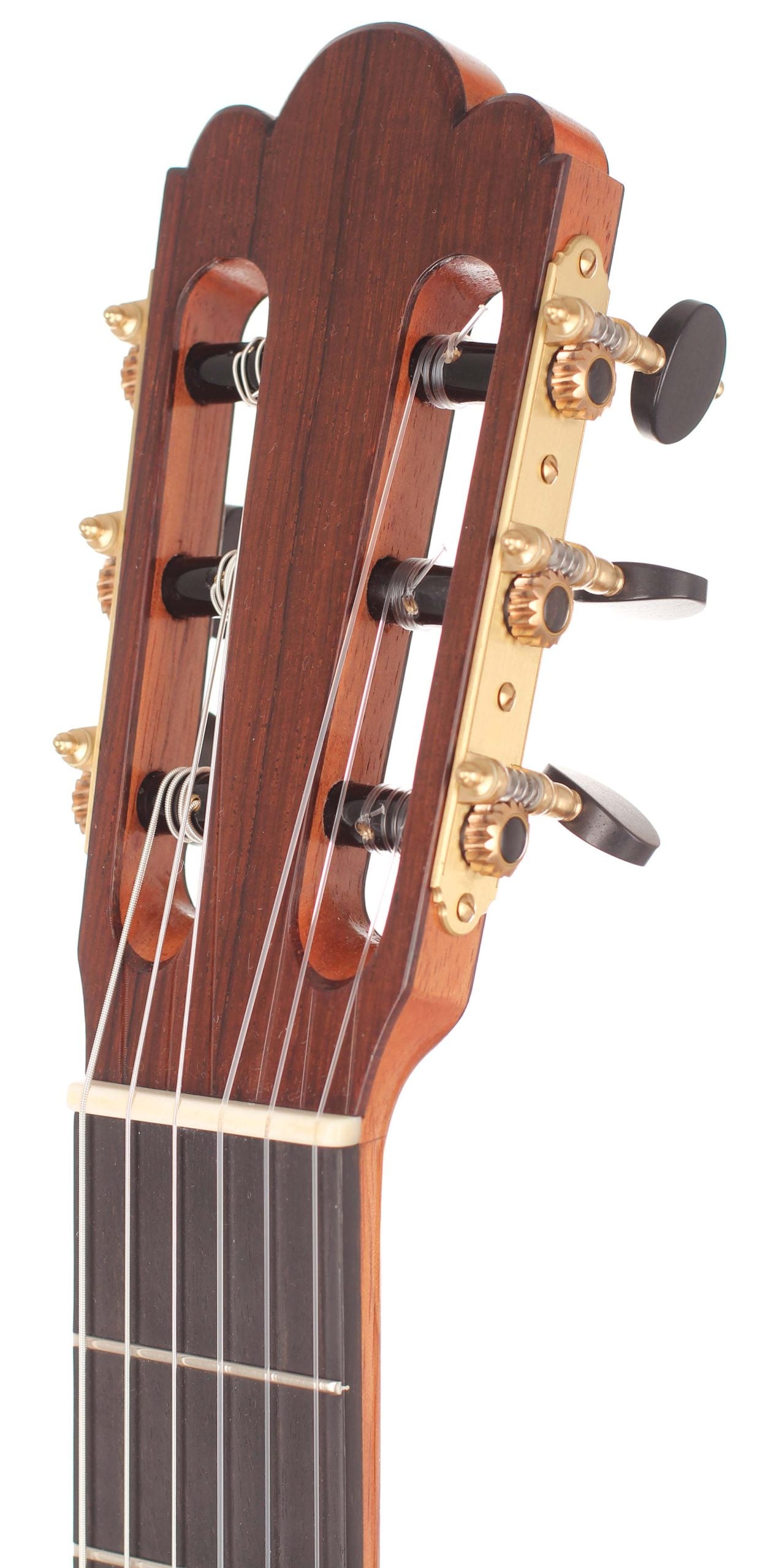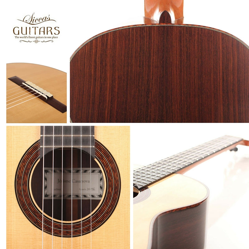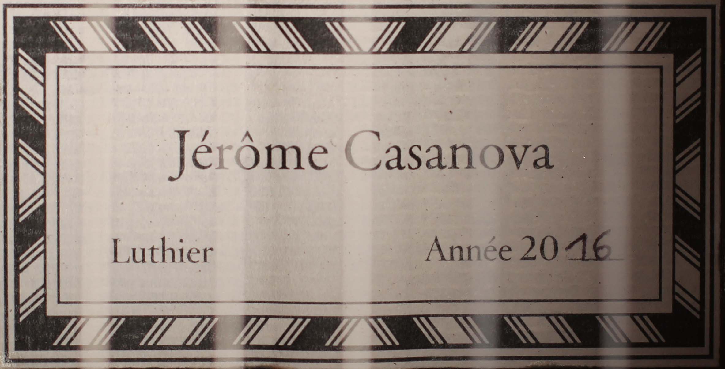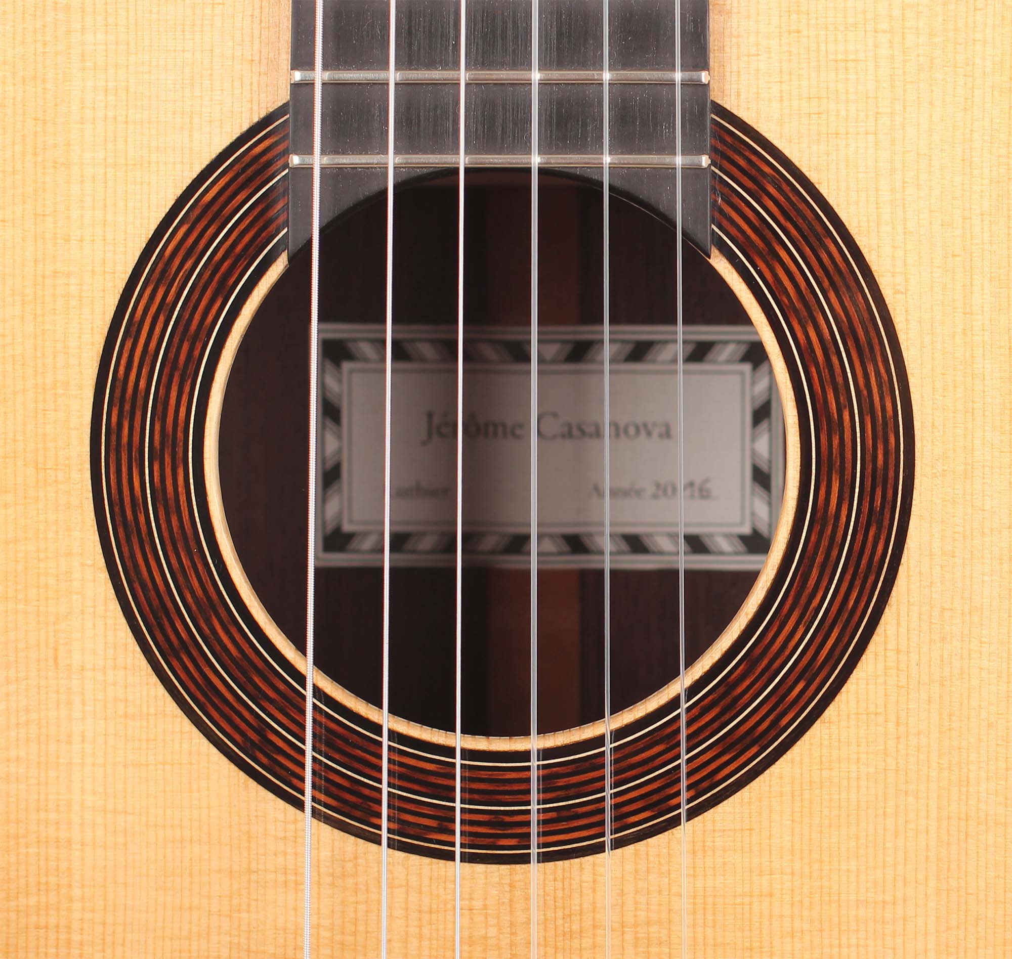 Jérôme Casanova ist ein französischer Gitarrenbauer, der 2003 seine eigene Werkstatt eröffnet hat. Er baut drei bis vier Gitarren im Jahr und widmet sich die übrige Arbeitszeit der Restaurierung von Zupfinstrumenten. Diese Gitarre von Jérôme hat eine Fichtendecke und ist traditionell beleistet. Boden und Zargen sind aus feinsten indischen Palisander gefertigt. Wunderschön ist ebenso das Schlangenholz Binding, das die Decke und den Boden umrahmt. Der Klang ist sehr voluminös und hat sehr viel Projektionskraft. Der Diskant klingt klar und brillant und weißt keine Schwächen auf. Was besonders auffällt, ist die leichte Bespielbarkeit der Gitarre. Veredelt wurde die Gitarre mit einer Schellack Handpolitur und Mechaniken von Alessi.