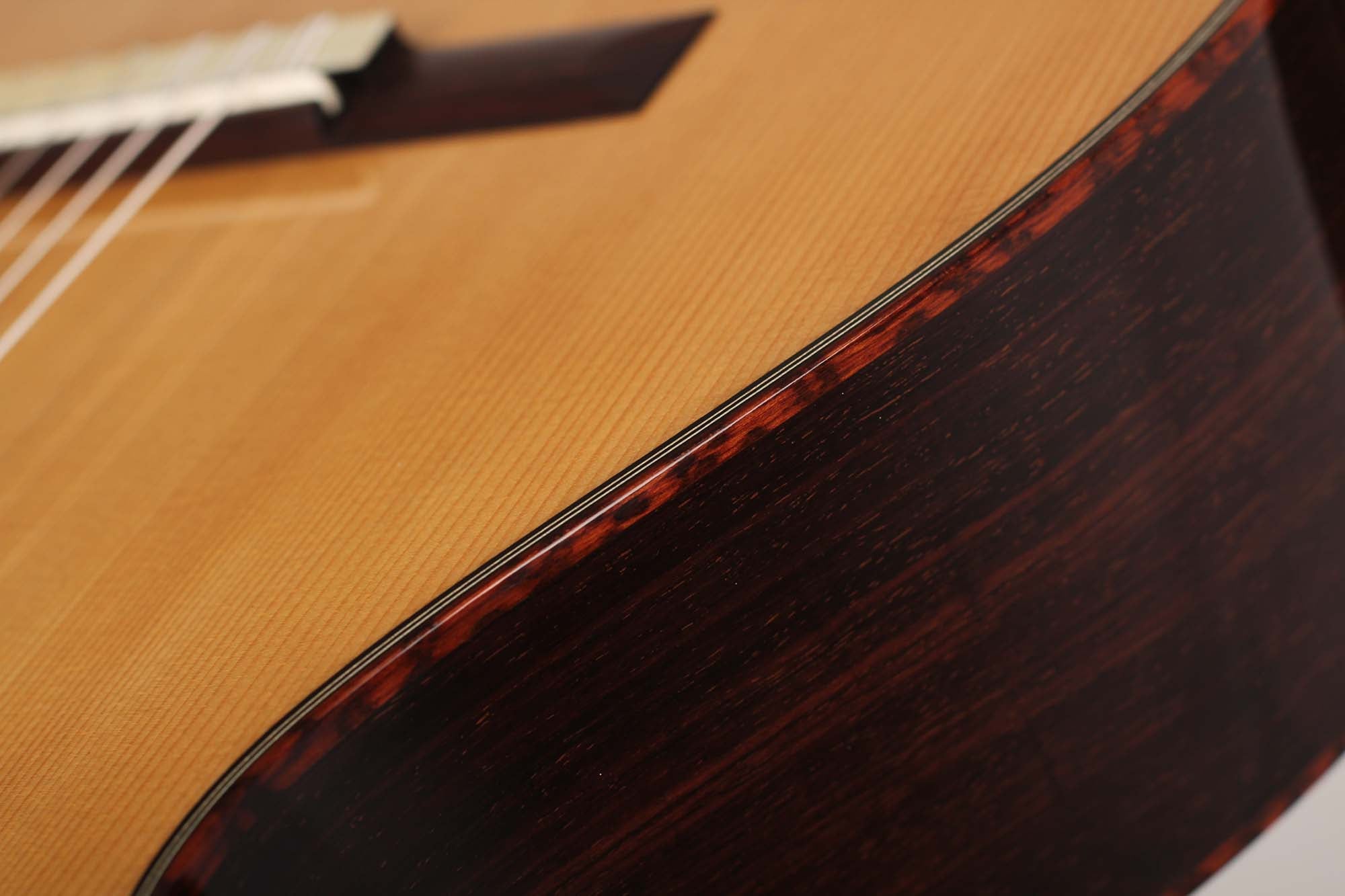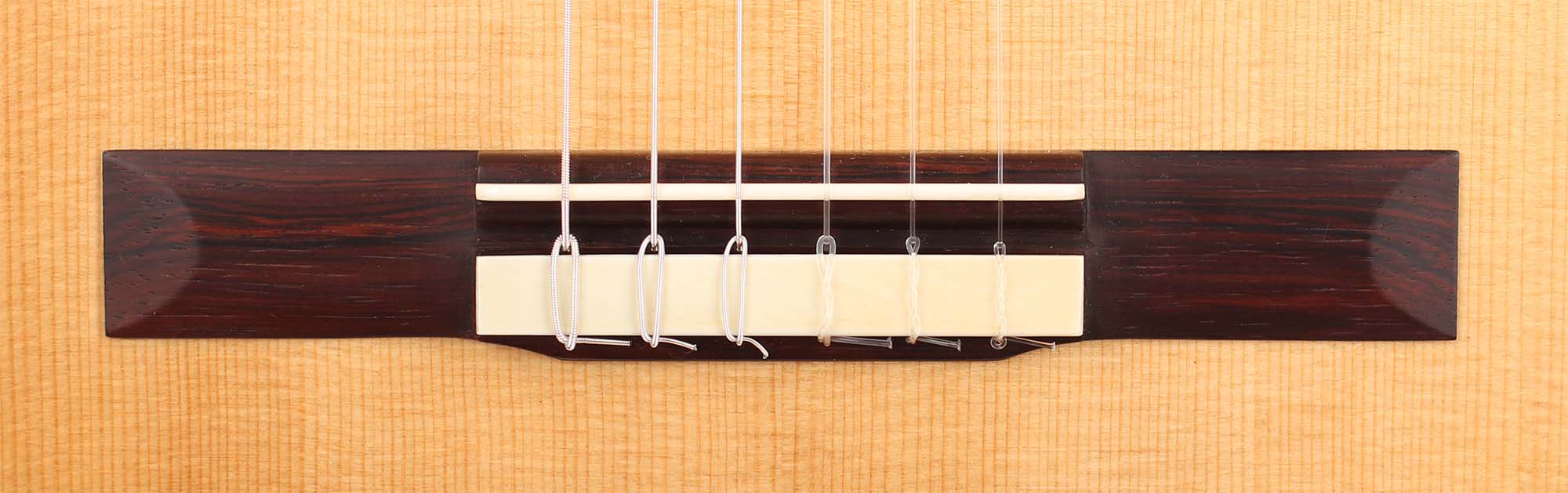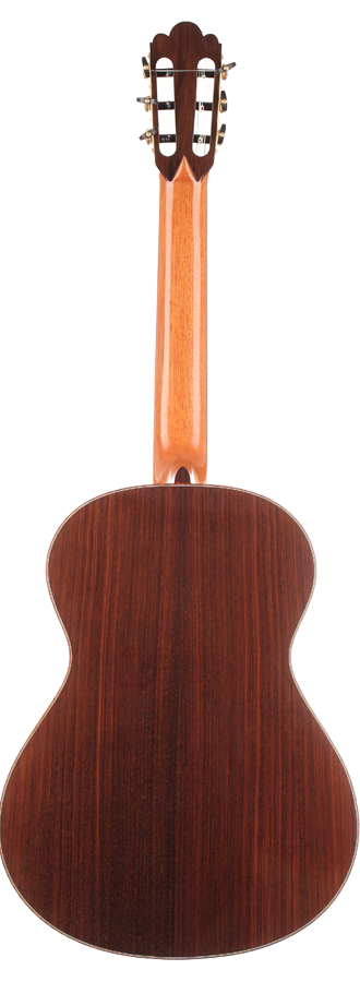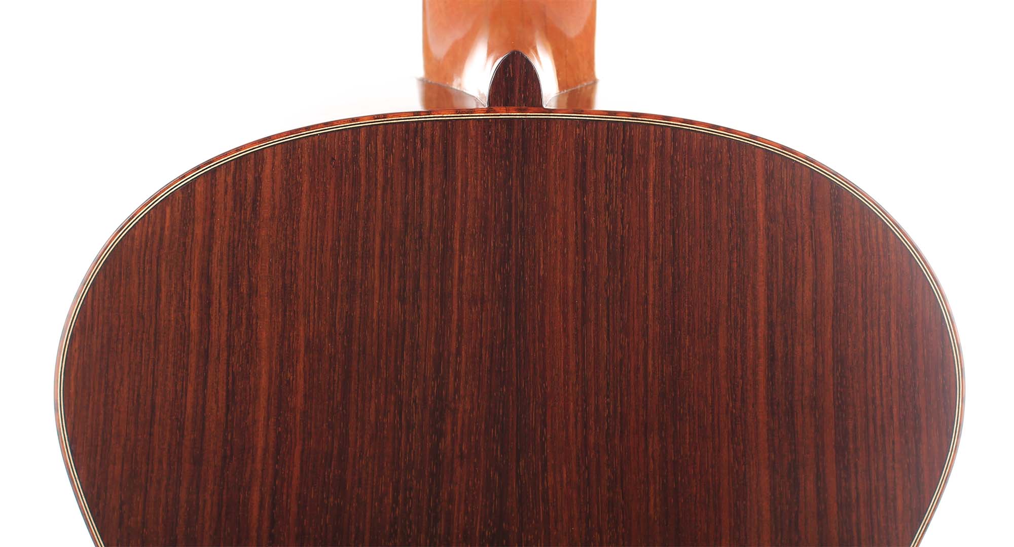 Jérôme Casanova ist ein französischer Gitarrenbauer, der 2003 seine eigene Werkstatt eröffnet hat. Er baut drei bis vier Gitarren im Jahr und widmet sich die übrige Arbeitszeit der Restaurierung von Zupfinstrumenten. Diese Gitarre von Jérôme hat eine Fichtendecke und ist traditionell beleistet. Boden und Zargen sind aus feinsten indischen Palisander gefertigt. Wunderschön ist ebenso das Schlangenholz Binding, das die Decke und den Boden umrahmt. Der Klang ist sehr voluminös und hat sehr viel Projektionskraft. Der Diskant klingt klar und brillant und weißt keine Schwächen auf. Was besonders auffällt, ist die leichte Bespielbarkeit der Gitarre. Veredelt wurde die Gitarre mit einer Schellack Handpolitur und Mechaniken von Alessi.