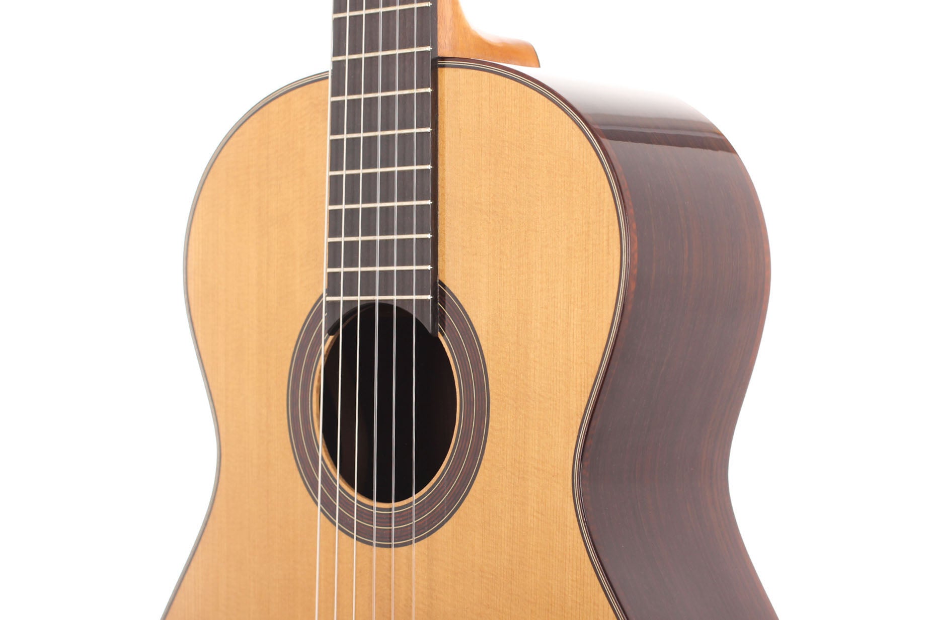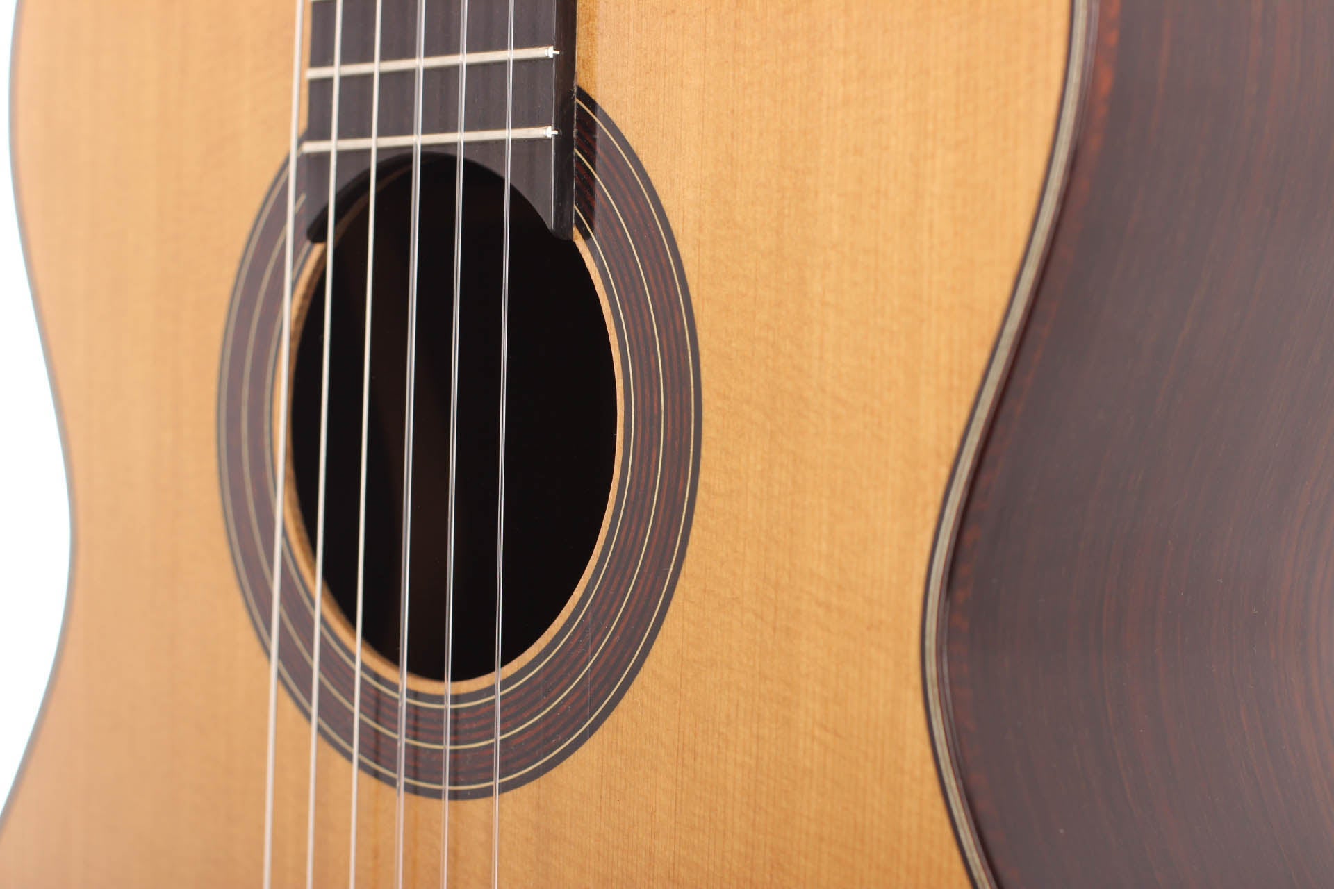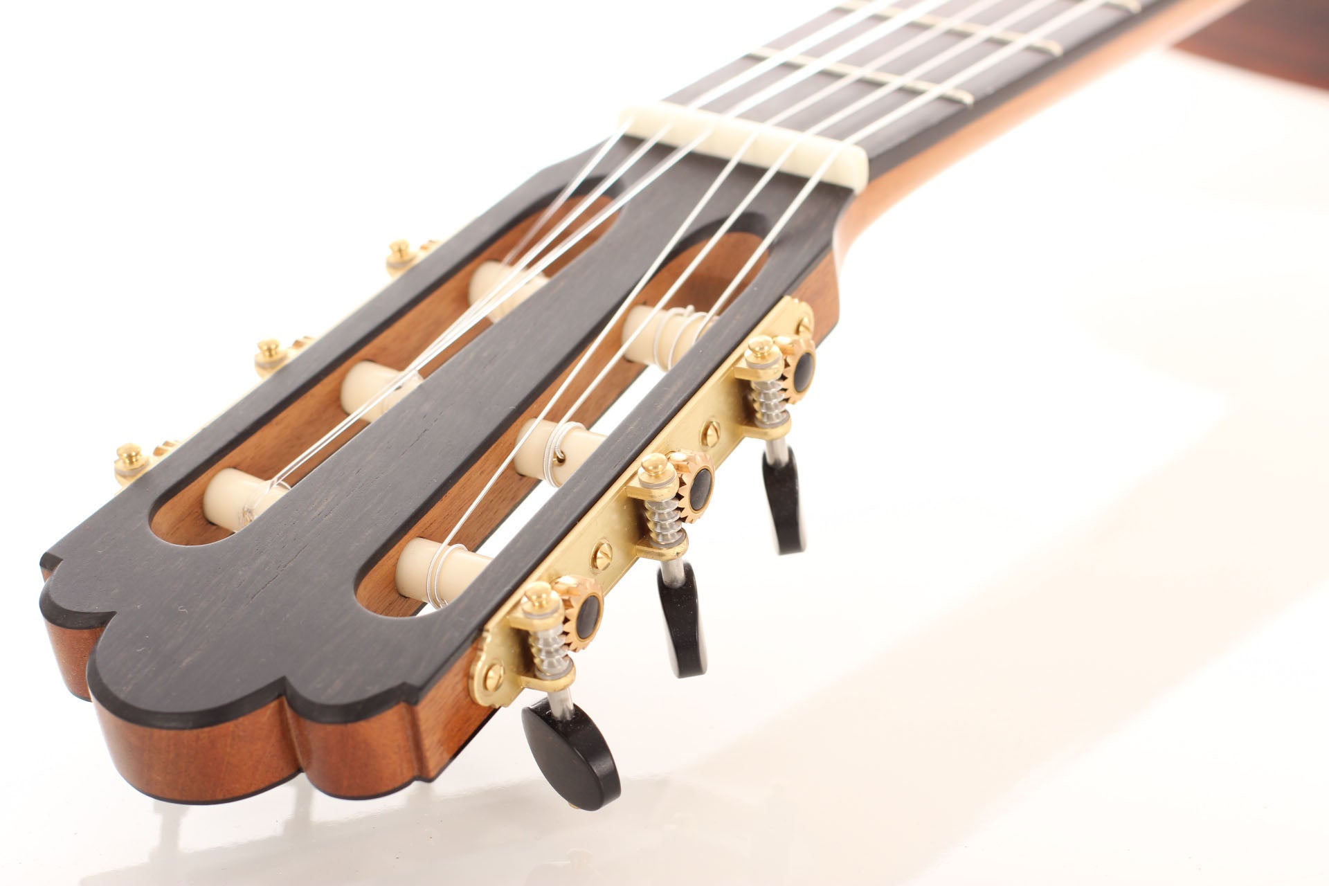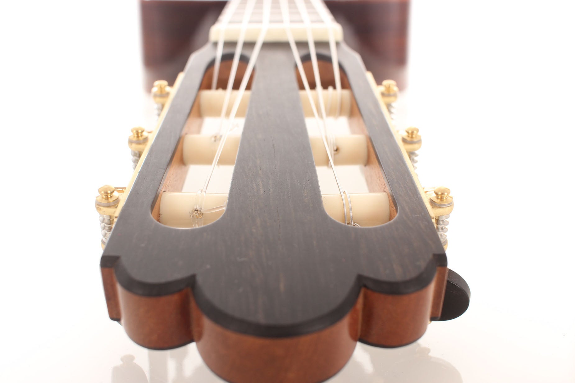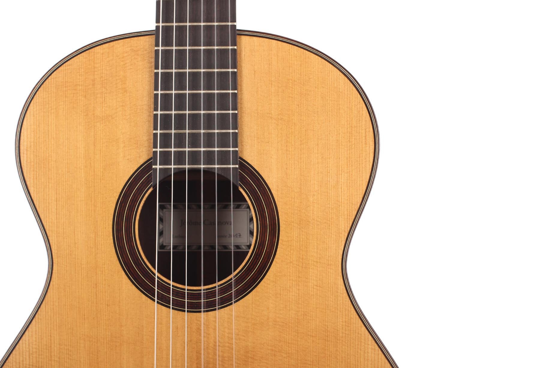 Jérôme Casanova ist ein französischer Gitarrenbauer, der 2003 seine eigene Werkstatt eröffnet hat. Er baut drei bis vier Gitarren im Jahr und widmet sich die übrige Arbeitszeit der Restaurierung von Zupfinstrumenten. Diese Gitarre von Jérôme hat eine Fichtendecke und ist traditionell beleistet. Boden und Zargen sind aus feinsten indischen Palisander gefertigt. Wunderschön ist ebenso das Schlangenholz Binding, das die Decke und den Boden umrahmt. Der Klang ist sehr voluminös und hat sehr viel Projektionskraft. Der Diskant klingt klar und brillant und weißt keine Schwächen auf. Was besonders auffällt, ist die leichte Bespielbarkeit der Gitarre. Veredelt wurde die Gitarre mit einer Schellack Handpolitur und Mechaniken von Alessi. Ein Hiscox Pro II Hartschalenkoffer ist inklusive.