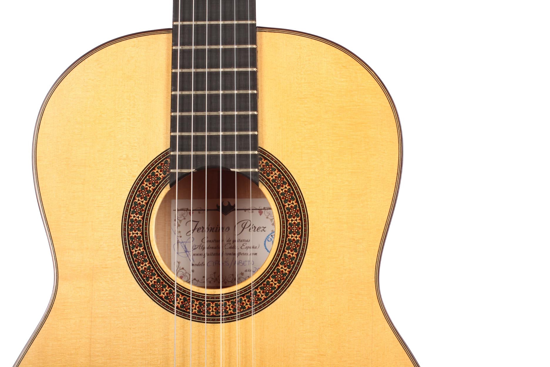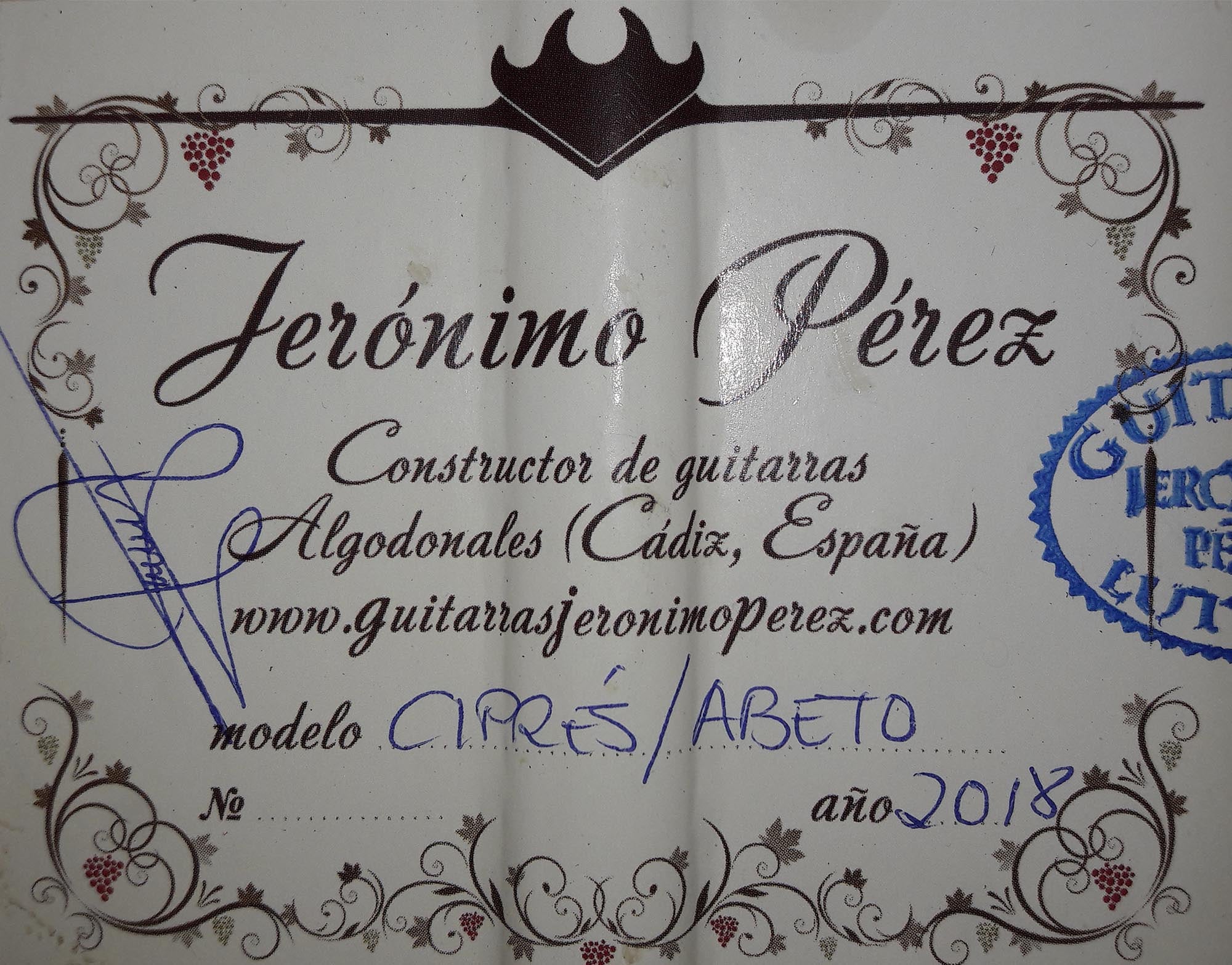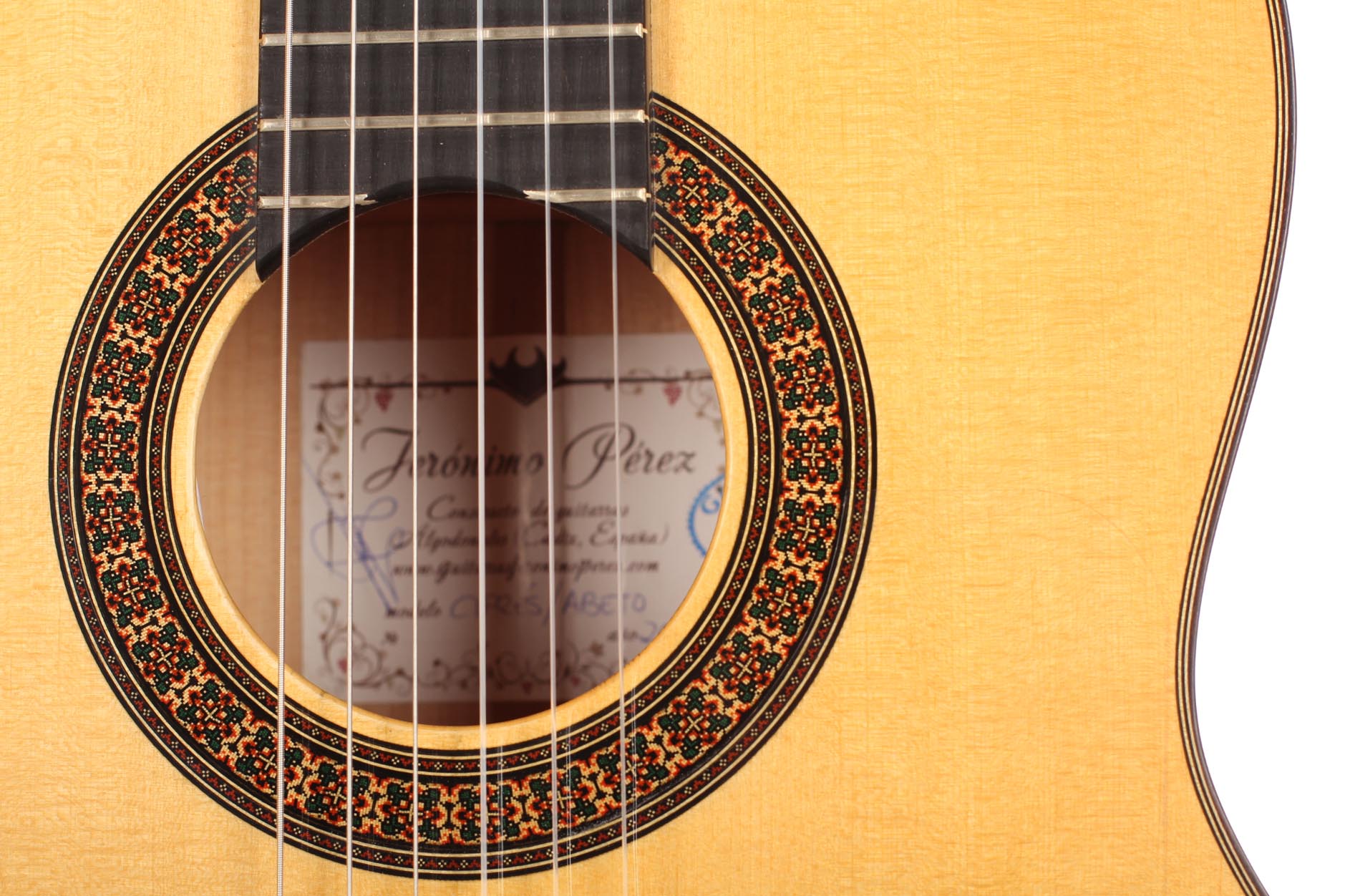 Diese Flamenco Gitarre wurde von Jerónimo Pérez de Algodonales in Cadiz hergestellt. Viele Gitarristen wie beispielsweise Antonio Rey, Paco Cepero, Diego del Morao, Miguel Salado, Bolita, Jesús Guerrero und Antonio Moya haben auf der Suche nach einem schönen Instrument in Jerónimo Pérez‘ Werkstatt halt gemacht.