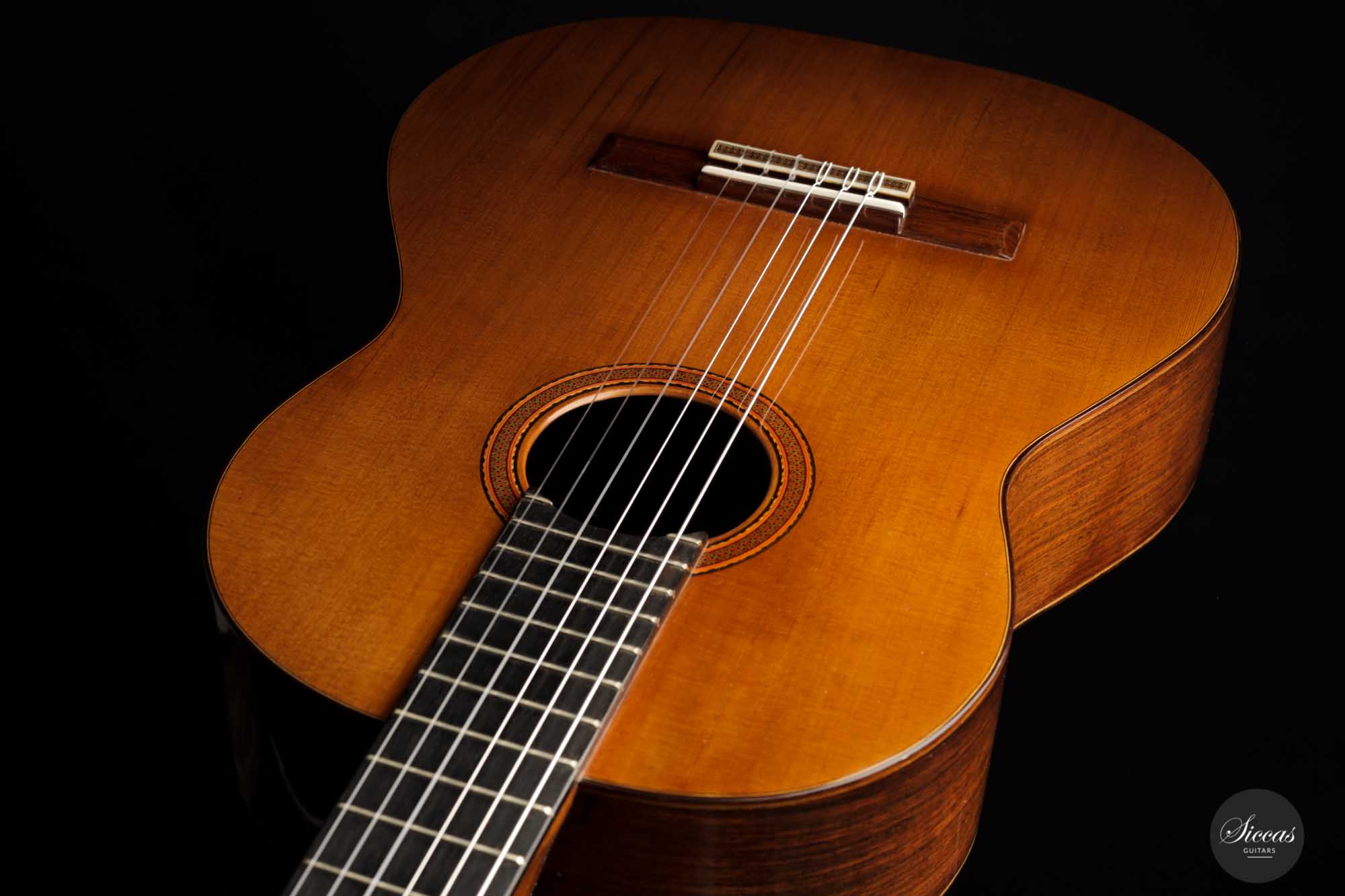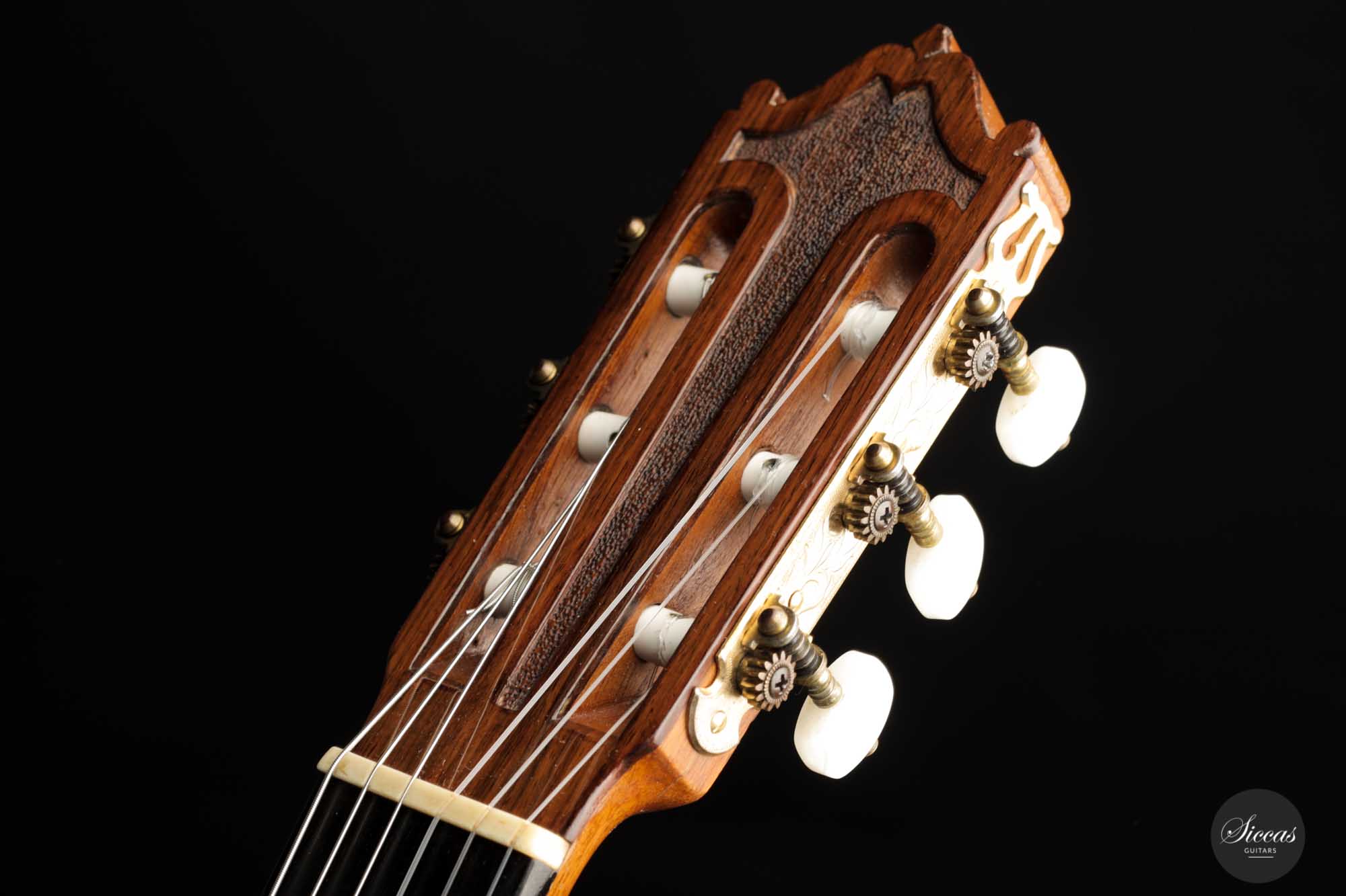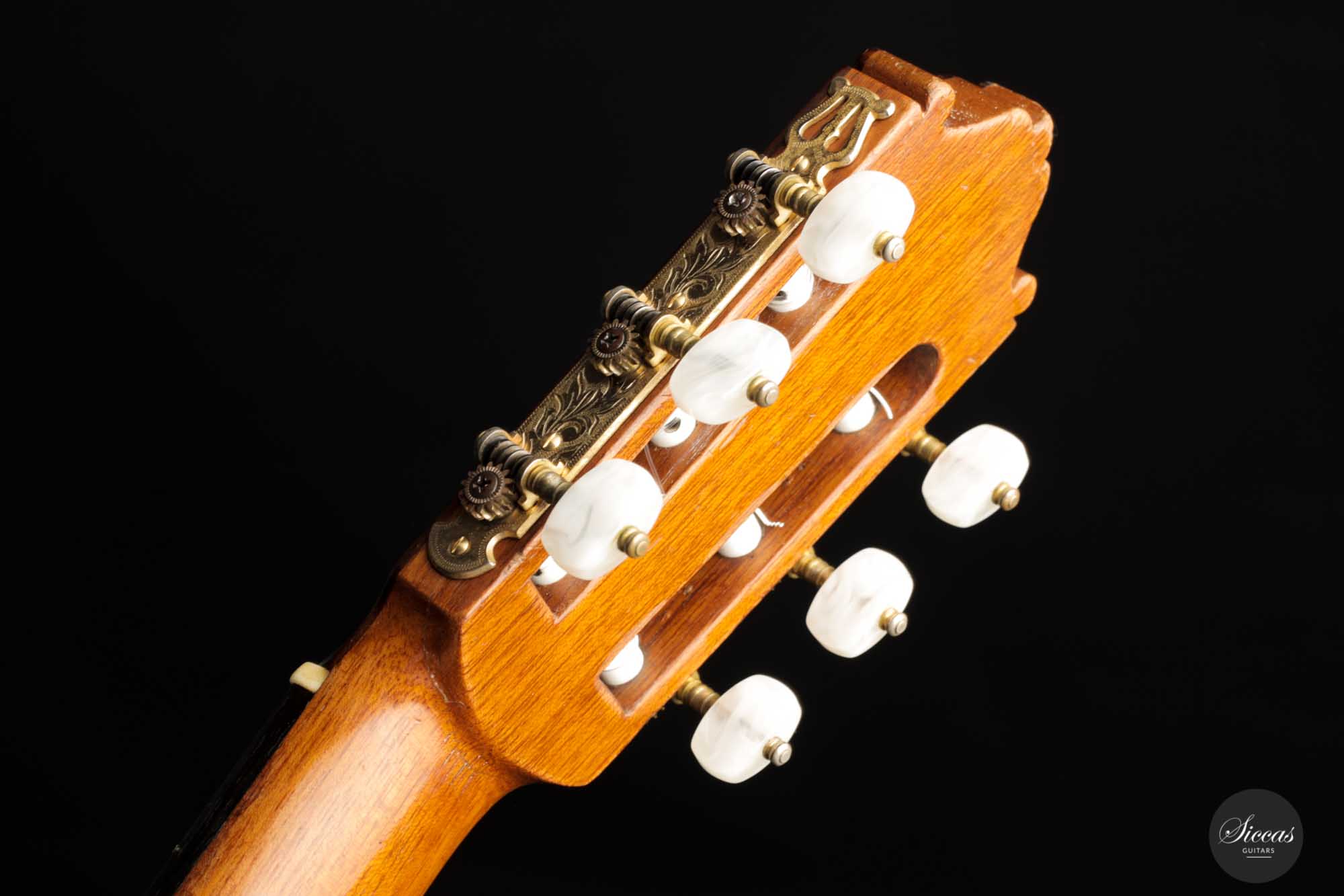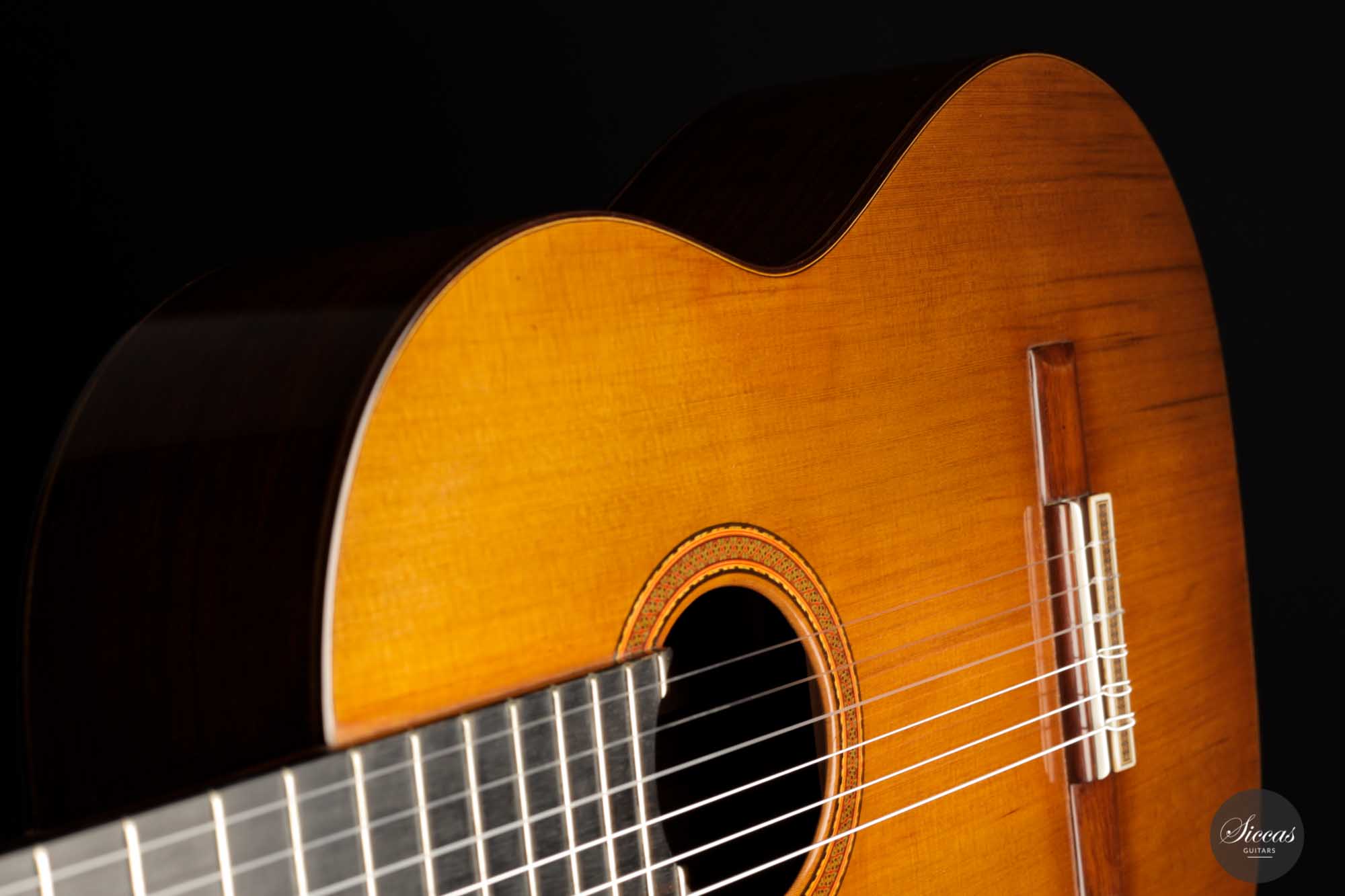 Diese 1971 gebaute Jesús Belezar Garcia Nummer 109 ist in jeder Hinsicht ein ganz besonderes Instrument. Sie war im Besitz des berühmten Komponisten Sr. Don. Francisco Zapata, und es liegt die Kopie eines faszinierenden Briefwechsels zwischen dem Komponisten und dem Gitarrenbauer diesem Instrument bei. Die Decke dieser Gitarre ist aus einer gleichmäßigen roten Zeder und Boden und Zargen aus zweiteiligem indischem Palisander. Das einzigartige Beleistungsmuster, das einen schräg verlaufenden Harmoniebalken vom Schallloch bis zum unteren Diskantbund aufweist, verleiht der Diskantseite der Decke, welche die Höhen kontrolliert, zusätzliche Steifigkeit. Dieses wunderschöne Instrument besitzt eine geschmackvolle Ästhetik und ist von Jesús Belezar Garcia im Inneren der Decke handsigniert. Der Zustand ist sehr gut, mit nur einem fachmännisch reparierten Haarriss auf der Decke, einer kleinen Restauration am Kopf und einem Haarriss an der unteren Seite der Zarge. Die Schellackpolitur wurde aufgefrischt, und die Gitarre ist in einem ausgezeichneten Spiel- und sammelwürdigen Zustand. Obwohl sie eine Zederndecke hat, klingt diese Gitarre wie eine exzellente Fichtendecke mit kristalliner Klarheit und einem breiten Klangfarbenspektrum. Das Timbre reagiert sofort auf den Anschlag des Spielers und diese spanische Schönheit bietet auch ein großes Volumen durch alle Register.