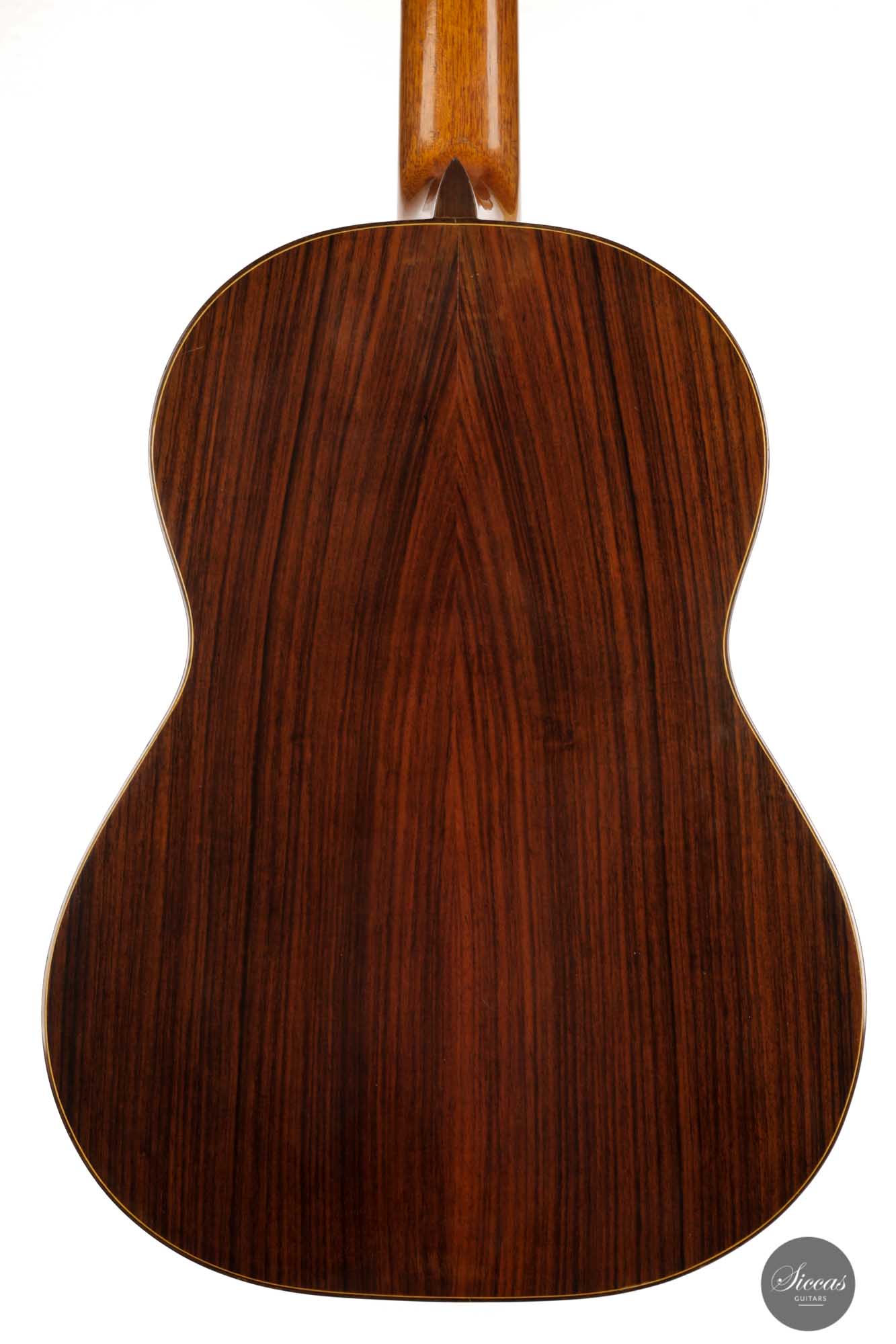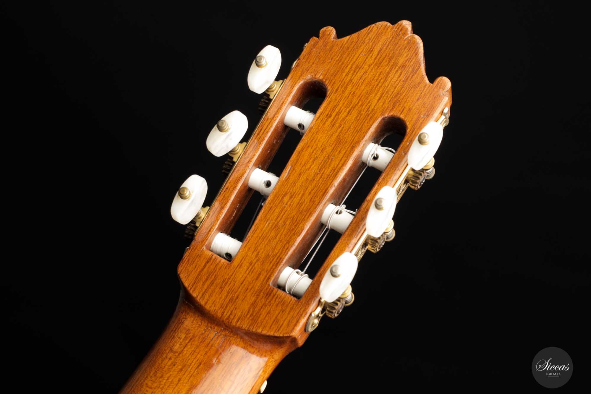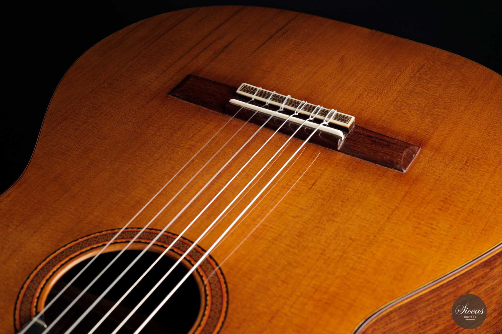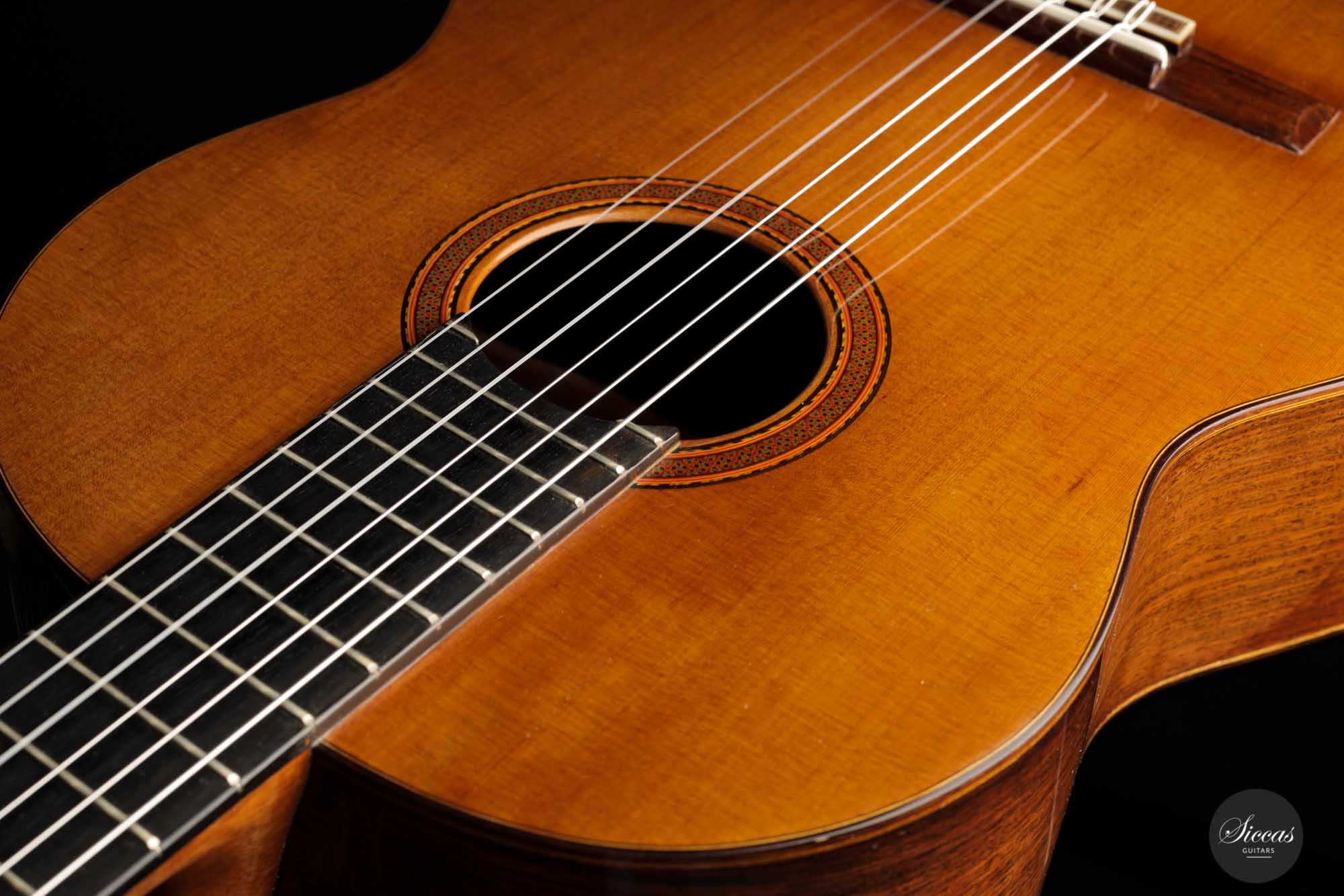 Diese 1971 gebaute Jesús Belezar Garcia Nummer 109 ist in jeder Hinsicht ein ganz besonderes Instrument. Sie war im Besitz des berühmten Komponisten Sr. Don. Francisco Zapata, und es liegt die Kopie eines faszinierenden Briefwechsels zwischen dem Komponisten und dem Gitarrenbauer diesem Instrument bei. Die Decke dieser Gitarre ist aus einer gleichmäßigen roten Zeder und Boden und Zargen aus zweiteiligem indischem Palisander. Das einzigartige Beleistungsmuster, das einen schräg verlaufenden Harmoniebalken vom Schallloch bis zum unteren Diskantbund aufweist, verleiht der Diskantseite der Decke, welche die Höhen kontrolliert, zusätzliche Steifigkeit. Dieses wunderschöne Instrument besitzt eine geschmackvolle Ästhetik und ist von Jesús Belezar Garcia im Inneren der Decke handsigniert. Der Zustand ist sehr gut, mit nur einem fachmännisch reparierten Haarriss auf der Decke, einer kleinen Restauration am Kopf und einem Haarriss an der unteren Seite der Zarge. Die Schellackpolitur wurde aufgefrischt, und die Gitarre ist in einem ausgezeichneten Spiel- und sammelwürdigen Zustand. Obwohl sie eine Zederndecke hat, klingt diese Gitarre wie eine exzellente Fichtendecke mit kristalliner Klarheit und einem breiten Klangfarbenspektrum. Das Timbre reagiert sofort auf den Anschlag des Spielers und diese spanische Schönheit bietet auch ein großes Volumen durch alle Register.