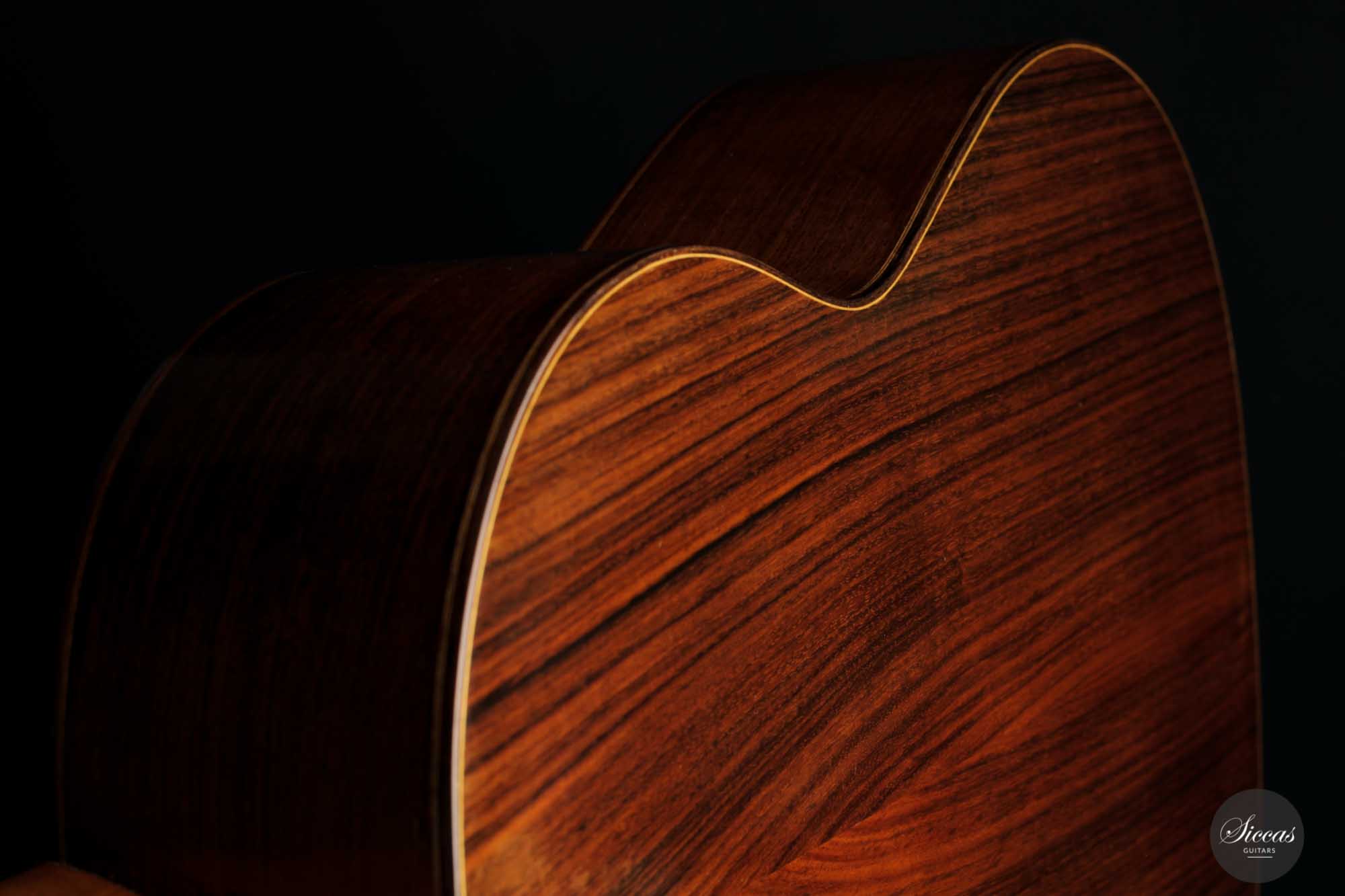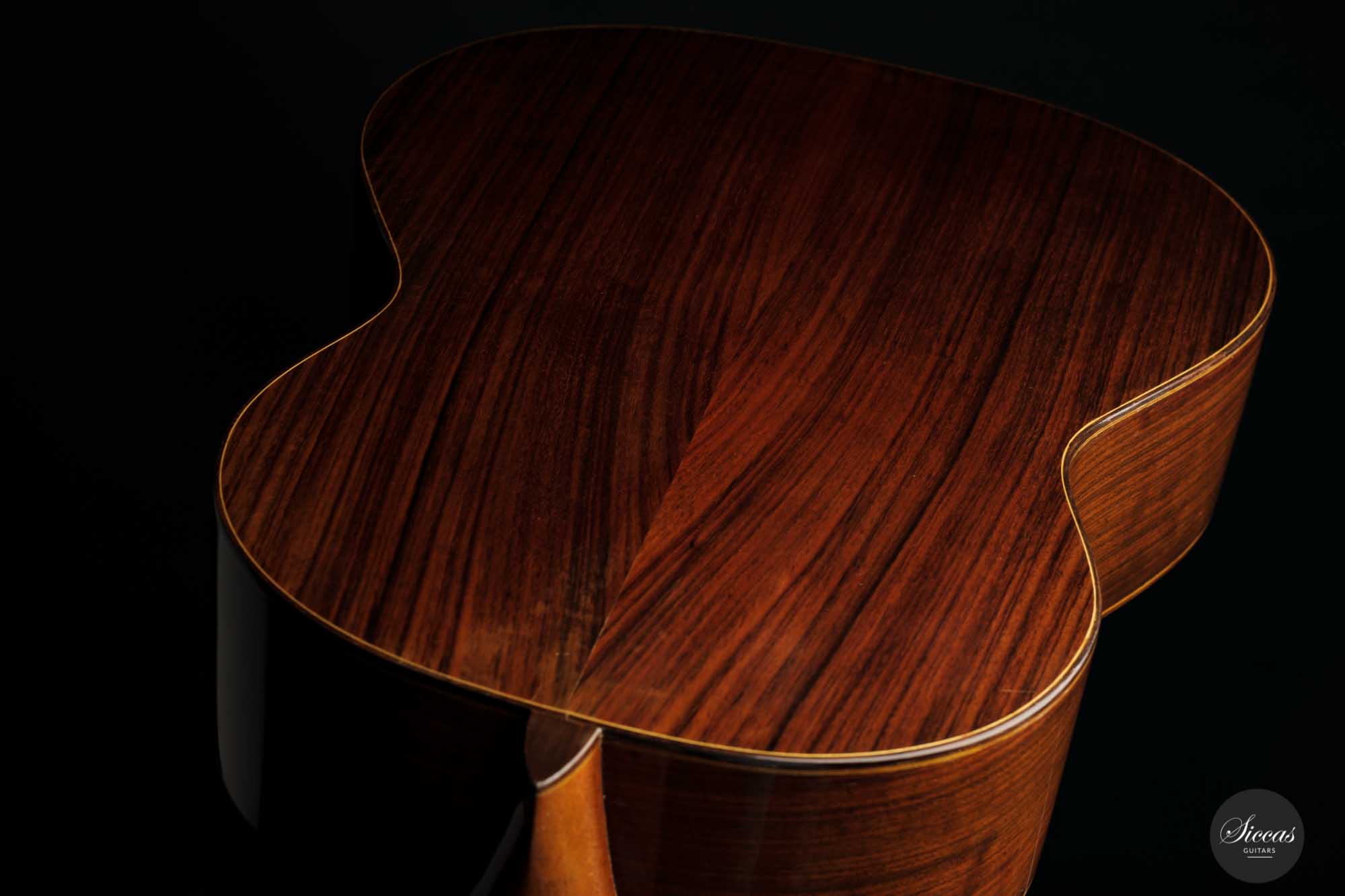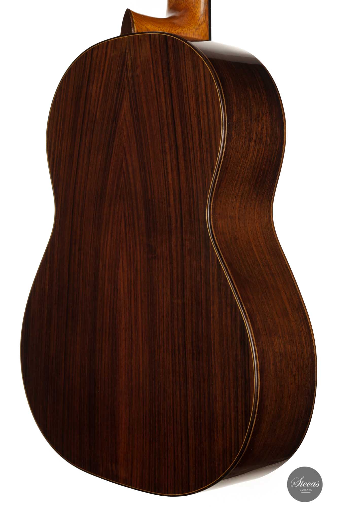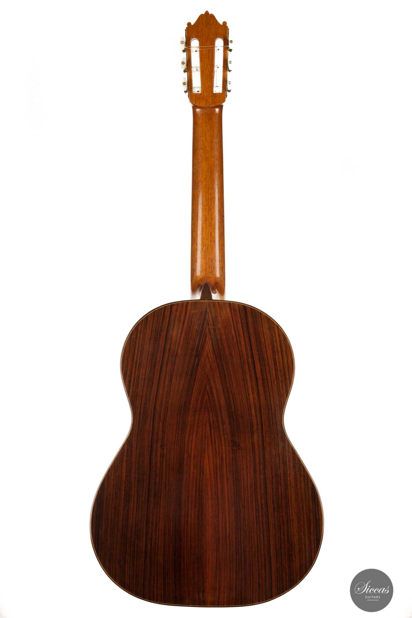 Diese 1971 gebaute Jesús Belezar Garcia Nummer 109 ist in jeder Hinsicht ein ganz besonderes Instrument. Sie war im Besitz des berühmten Komponisten Sr. Don. Francisco Zapata, und es liegt die Kopie eines faszinierenden Briefwechsels zwischen dem Komponisten und dem Gitarrenbauer diesem Instrument bei. Die Decke dieser Gitarre ist aus einer gleichmäßigen roten Zeder und Boden und Zargen aus zweiteiligem indischem Palisander. Das einzigartige Beleistungsmuster, das einen schräg verlaufenden Harmoniebalken vom Schallloch bis zum unteren Diskantbund aufweist, verleiht der Diskantseite der Decke, welche die Höhen kontrolliert, zusätzliche Steifigkeit. Dieses wunderschöne Instrument besitzt eine geschmackvolle Ästhetik und ist von Jesús Belezar Garcia im Inneren der Decke handsigniert. Der Zustand ist sehr gut, mit nur einem fachmännisch reparierten Haarriss auf der Decke, einer kleinen Restauration am Kopf und einem Haarriss an der unteren Seite der Zarge. Die Schellackpolitur wurde aufgefrischt, und die Gitarre ist in einem ausgezeichneten Spiel- und sammelwürdigen Zustand. Obwohl sie eine Zederndecke hat, klingt diese Gitarre wie eine exzellente Fichtendecke mit kristalliner Klarheit und einem breiten Klangfarbenspektrum. Das Timbre reagiert sofort auf den Anschlag des Spielers und diese spanische Schönheit bietet auch ein großes Volumen durch alle Register.