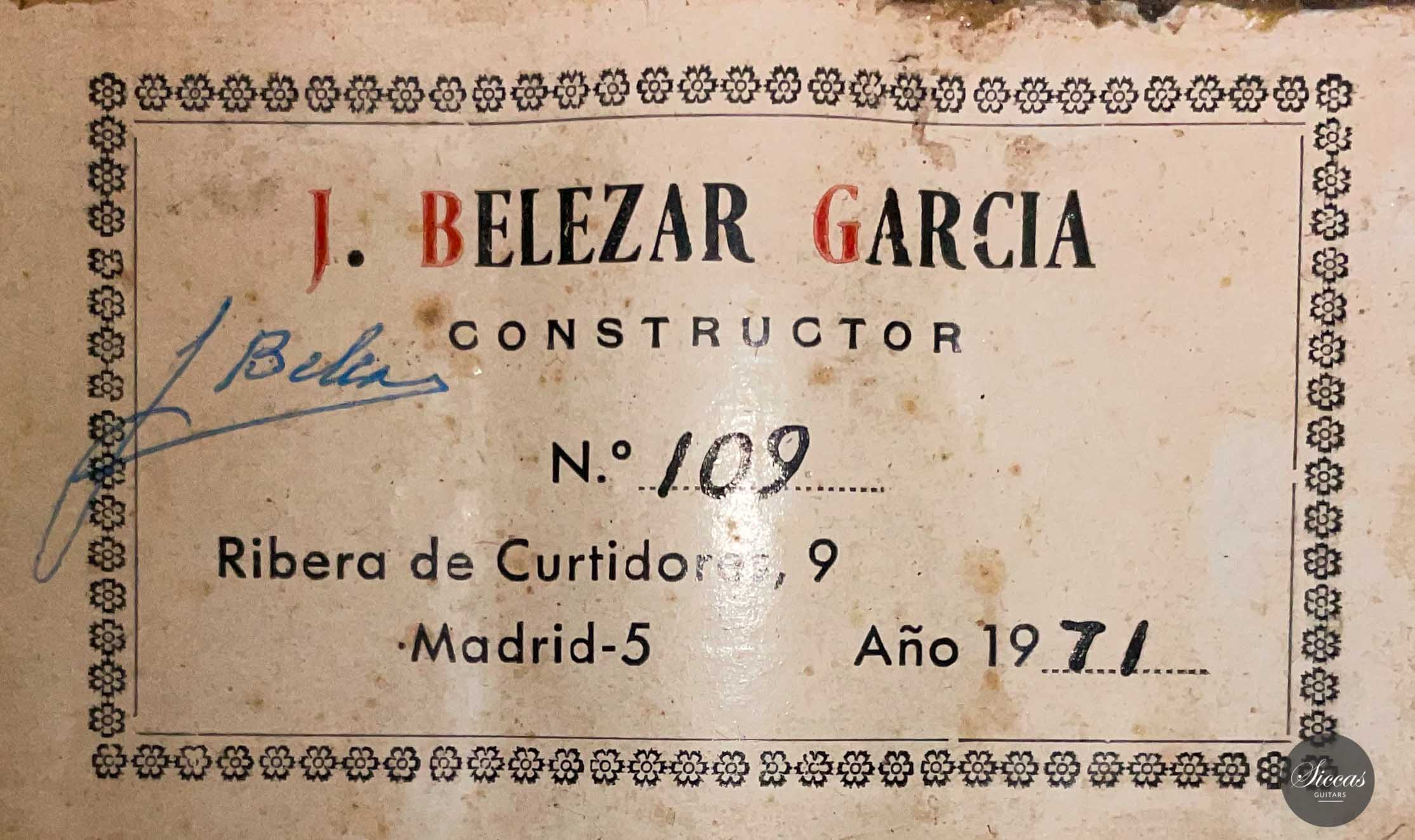 Jesús Belezar Garcia (1920-1986) war ein spanischer Gitarrenbauer, dessen Gitarren äußerst selten sind. Mit nur 83 gefertigten Gitarren in seiner kurzen, aber erfolgreichen Karriere ist Jesús Belezar Garcia eine faszinierende Persönlichkeit in der Szene der Madrider Gitarrenbaukunst der zweiten Hälfte des zwanzigsten Jahrhunderts. 1945 heiratete er Emilia Hernandez und wurde so zum Schwiegersohn des berühmten Gitarrenbauers Manuel Hernandez, dem Partner von Victoriano Aguado in der heute berühmten Werkstatt Hernandez y Aguado. Victoriano Aguado teilte Jesús Belezar Garcias Leidenschaft für die Gitarre, und die Hingabe der beiden Männer für das Instrument spielte eine entscheidende Rolle bei der Gründung von HyA als Vollzeit-Gitarrenbauer. Jesús Belezar Garcia arbeitete von 1965 bis 1968 in der Werkstatt von HyA, bevor er seine eigene Werkstatt eröffnete. Seine geschnitzte Kopfplatte, ein auffälliges Merkmal seiner Gitarren, wurde von Victoriano Aguado entworfen und ihm zum Geschenk gemacht. Jesús Belezar Garcia begann seine Produktion mit der Nummer 100, und angesichts der minimalen Anzahl verfügbarer Gitarren gehören Jesús Belezar Garcias Instrumente zu den gefragtesten Gitarren des zwanzigsten Jahrhunderts.