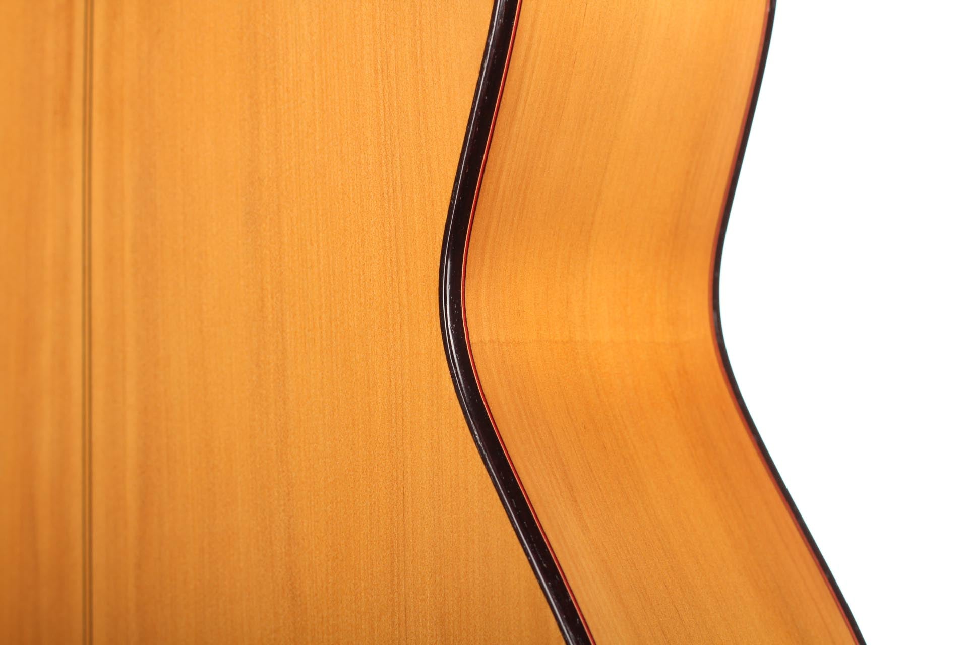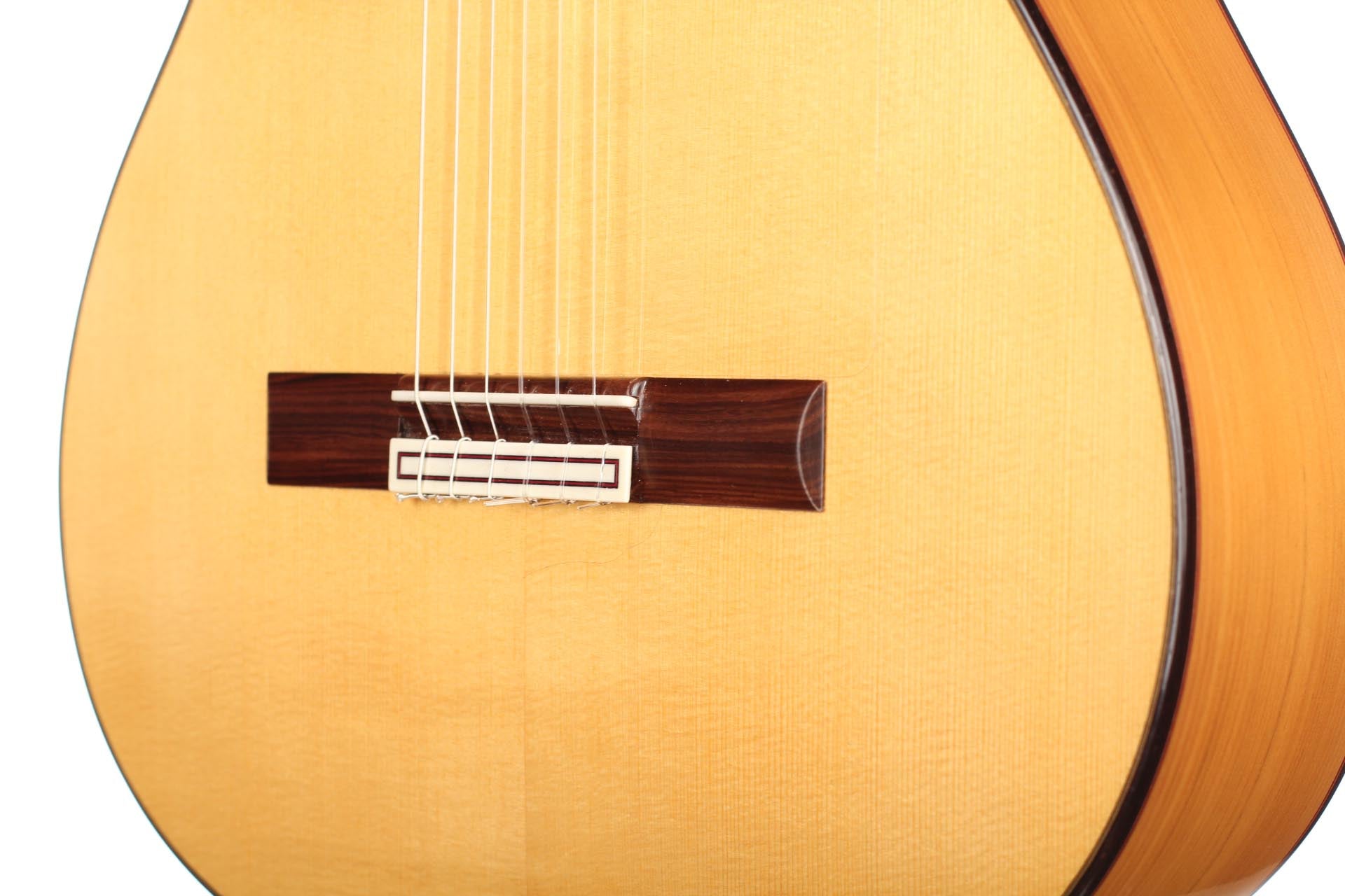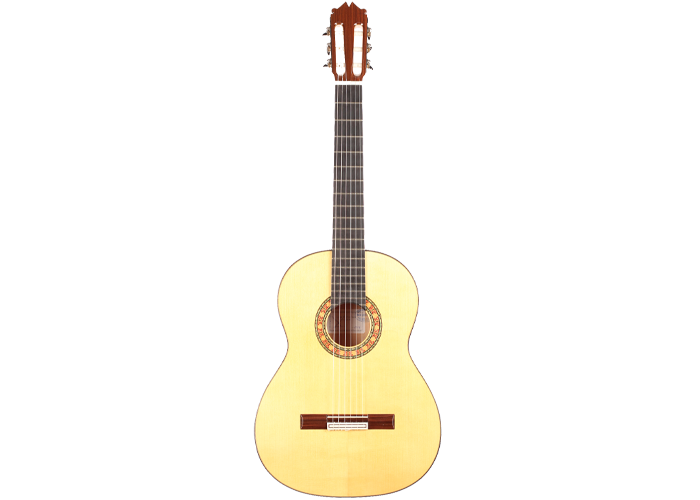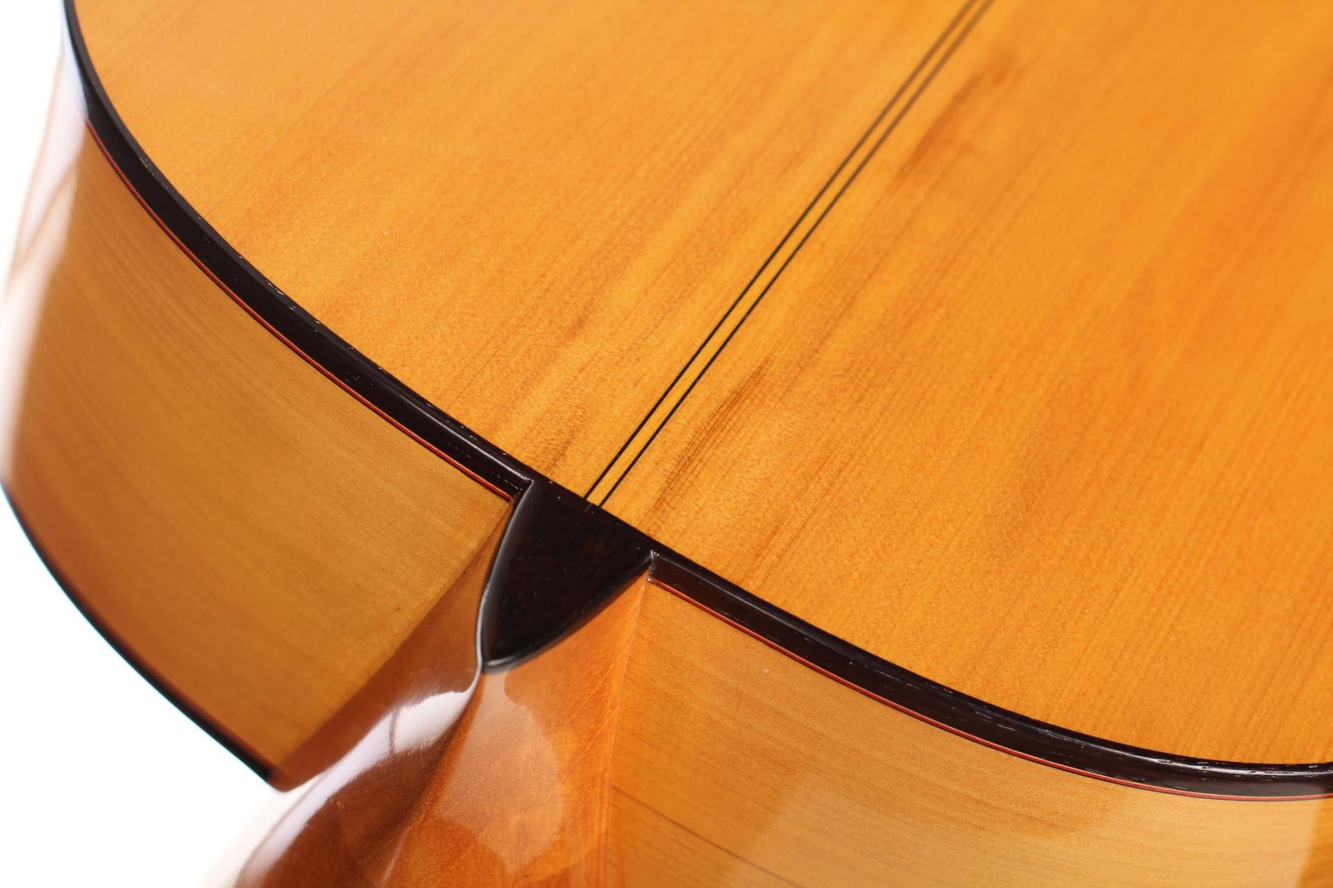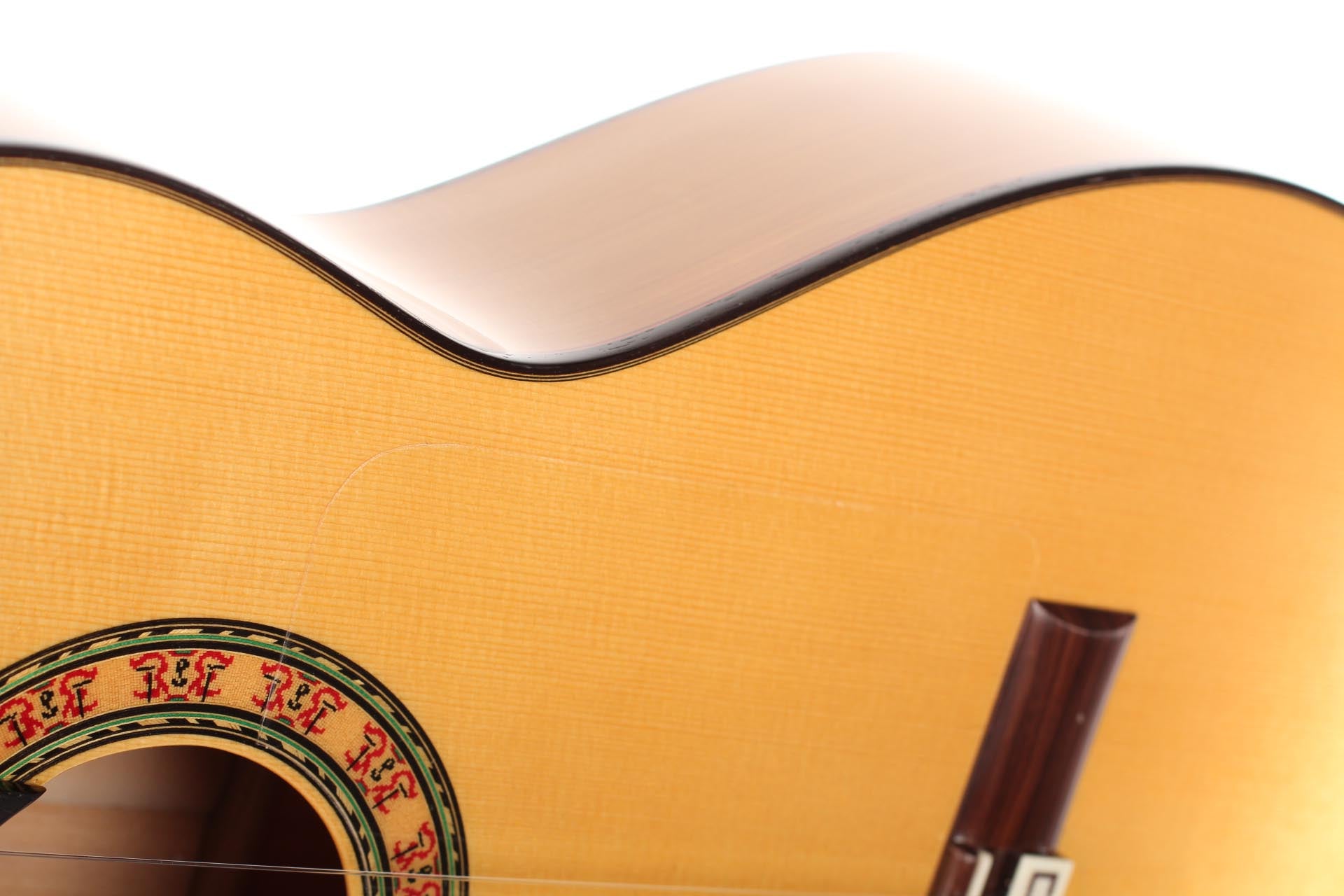 The top is made of German spruce and back/sides are made of beautiful best quality Spanish cypress. The very accentuated flamenco sound has great volume and is very powerful. The trebles are very clear and brilliant while being very balanced between basses and trebles. The tuners are made by Fustero. A hard-shell case is included. This guitar is Cites-free (CF).