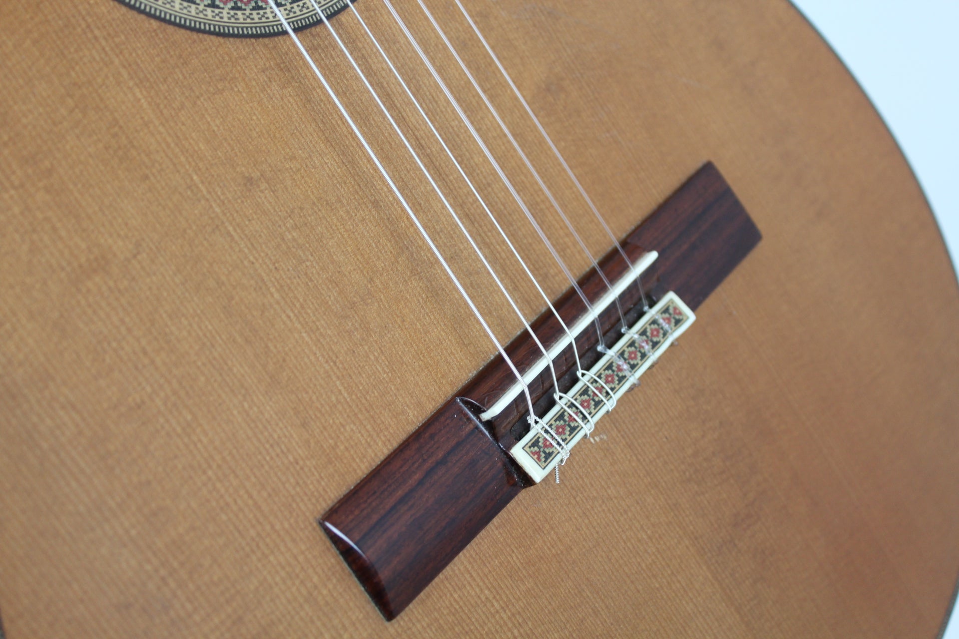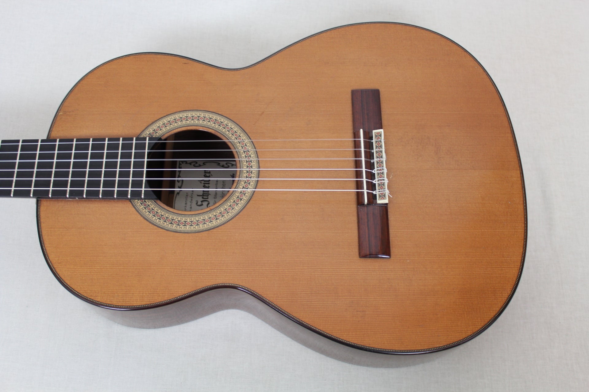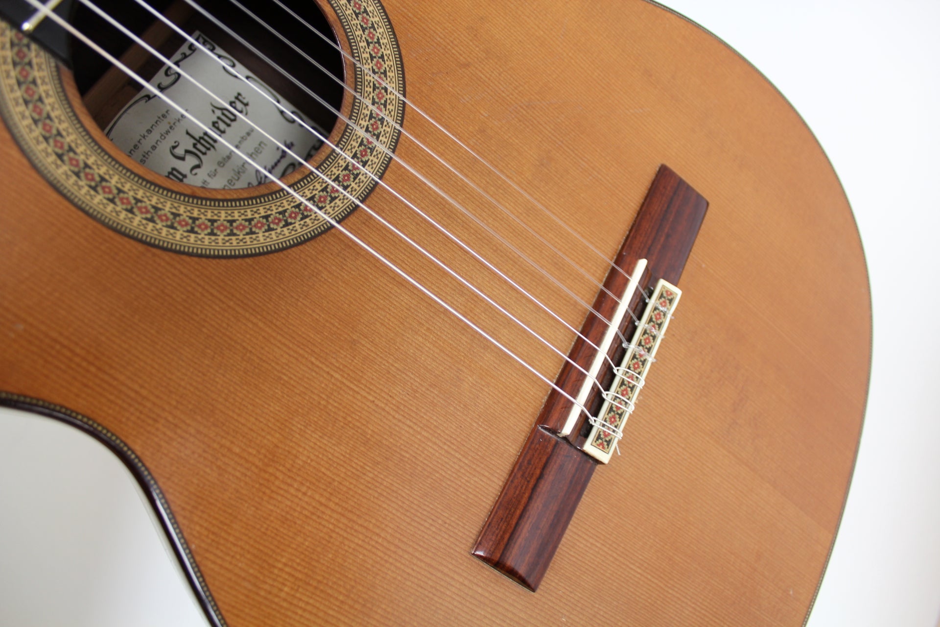 This is a classical guitar made by the German luthier Joachim Schneider in 1989. Joachim was born in 1939 in Markneukirchen and started to work at the workshop of his grandfather Willy Blahowetz. In 1961 he finished his training at the Chamber of Crafts with the "Meisterprüfung". One year later he took over his grandfather's workshop. He received many international awards for his craftmanship. This guitar has a cedar top and back and sides are made of Indian rosewood. The sound is nice and balanced with warm bases and smooth trebles giving the guitar a typical cedar sound. Intonation and playability are perfect on this 25 years old guitar.