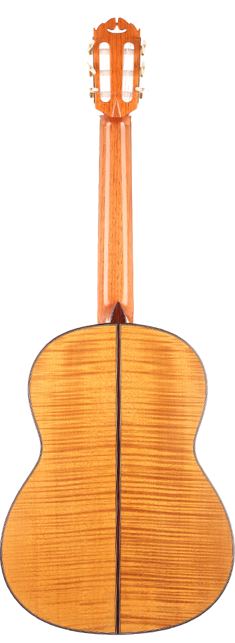 Diese Gitarre wurde von Joachim Schneider im Jahr 2001 gebaut. Joachim wurde 1939 in Markneukirchen geboren und begann zunächst in Instrumentenbauatelier seiner Großvaters Willy Blahowetz zu arbeiten. 1961 schloss er seine Ausbildung mit der Meisterprüfung ab und begann im Jahr darauf im Atelier seines Vaters zu arbeiten. Viele internationale Preise wurden ihm im Laufe seiner Karriere für die Auszeichnung seiner Handwerkskunst überreicht. Diese Gitarre hat eine Fichtendecke. Der Boden und die Zargen sind aus herrlich geflammtem Ahorn. Der Klang kann als ausgeglichen beschrieben werden. Die Bässe sind warm und der Diskant kling silbrig/lyrisch. Die Gitarre befindet sich in sehr gutem Zustand. Es sind lediglich kleinere Spielspuren sichtbar und unterhalb des Stegs befindet sich eine kleine Macke, die durch eine durchgerutschte Saite entstand. Die Mechaniken sind von Rubner. Ein Hartschalenkoffer ist inklusive.