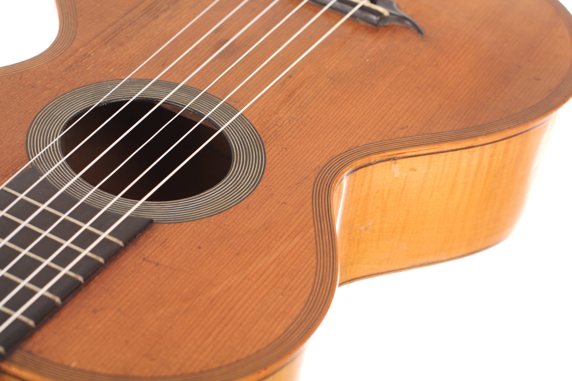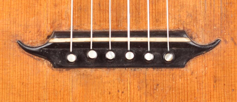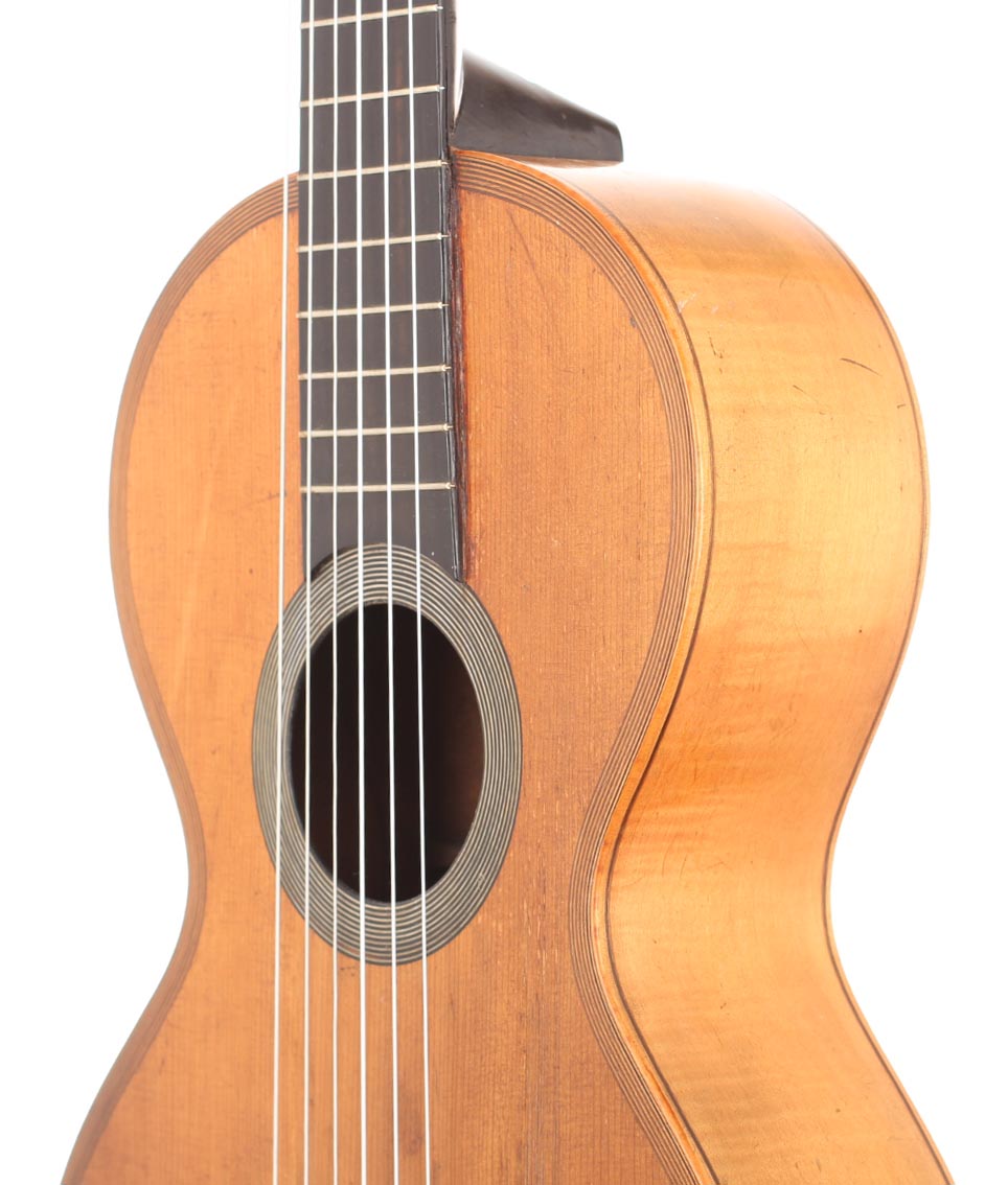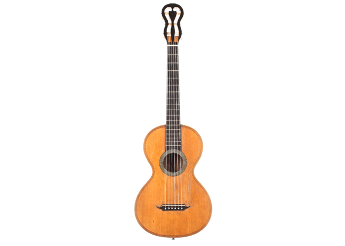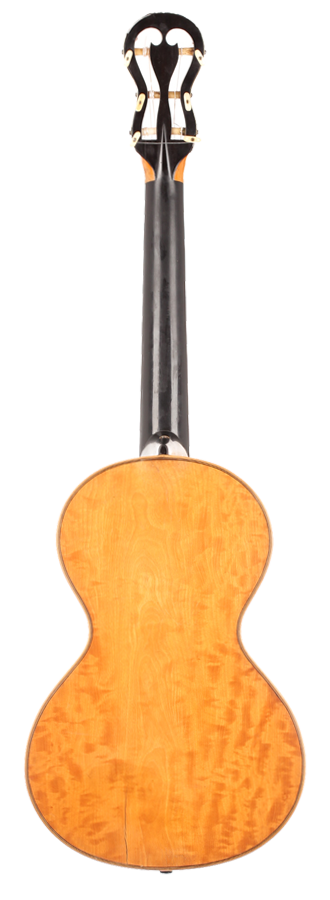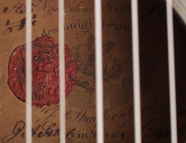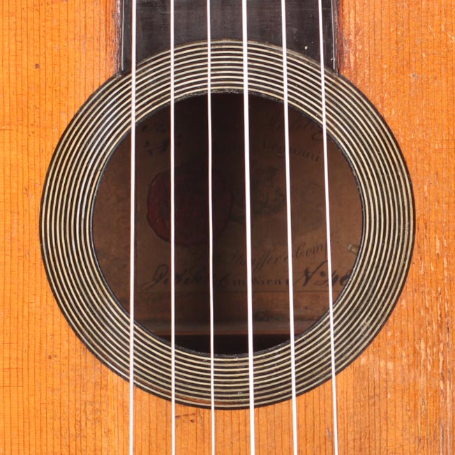 This wonderful guitar, constructed by Johann Georg Stauffer represents a very special model that is inspired by French romantic guitars. Because of the design and the serial number on the label this guitar can be assigned to the year 1827/28. The top is made of spruce wood and it is coated with a clear varnish. The sound hole is decorated with light and dark veneers. The guitar’s bridge is designed in a plain and modest manner. The sides are made of maple and the one-piece back is made of satinwood.