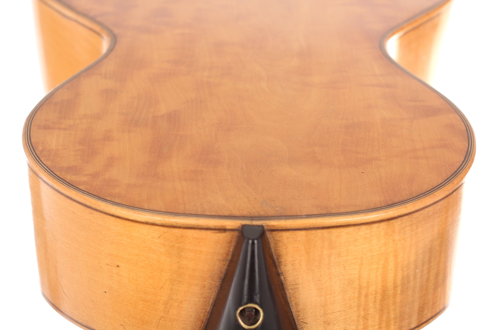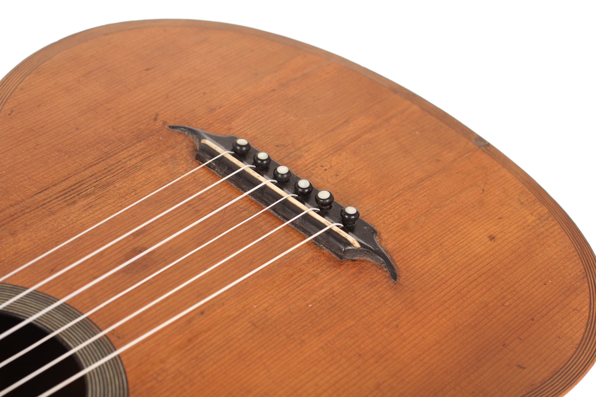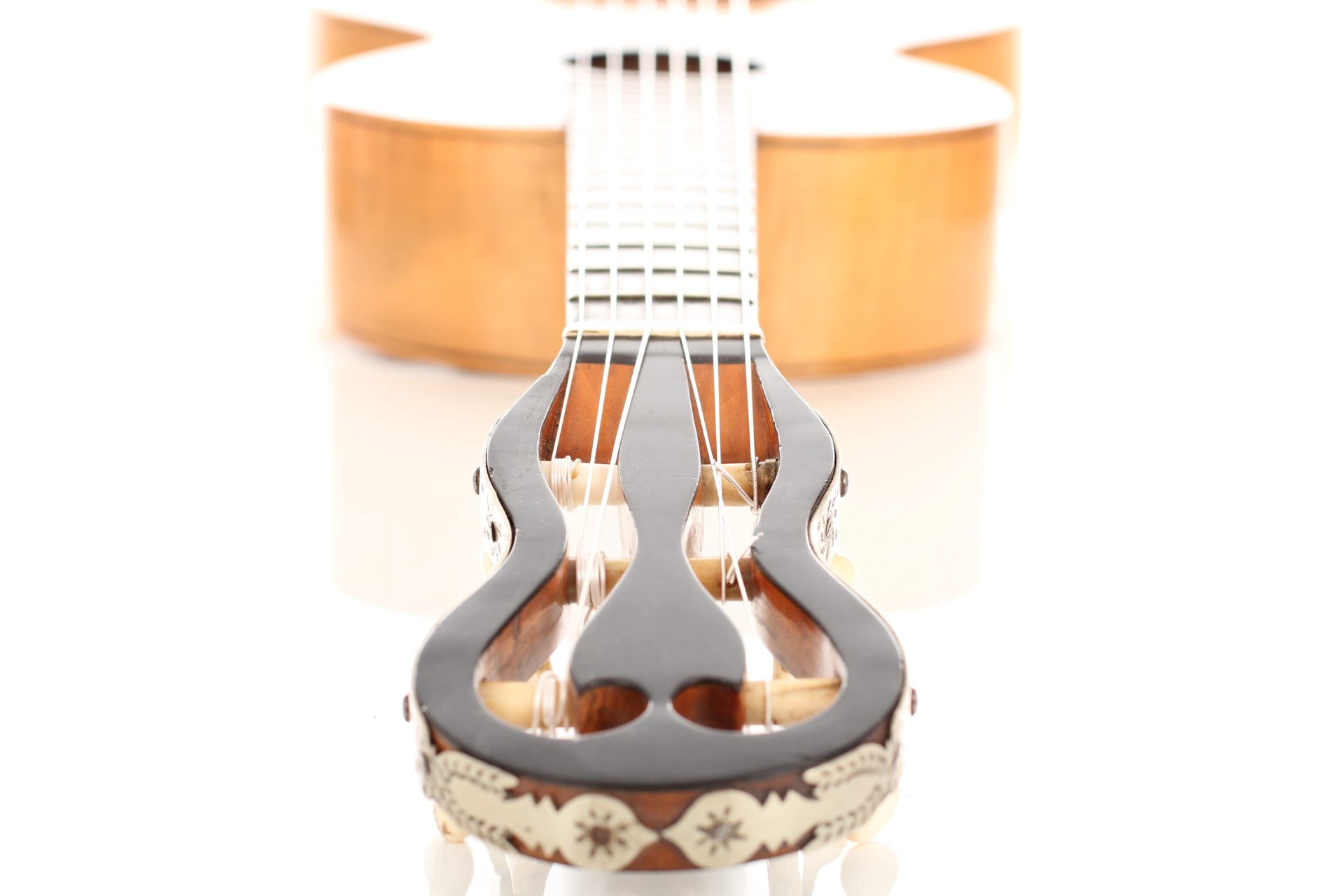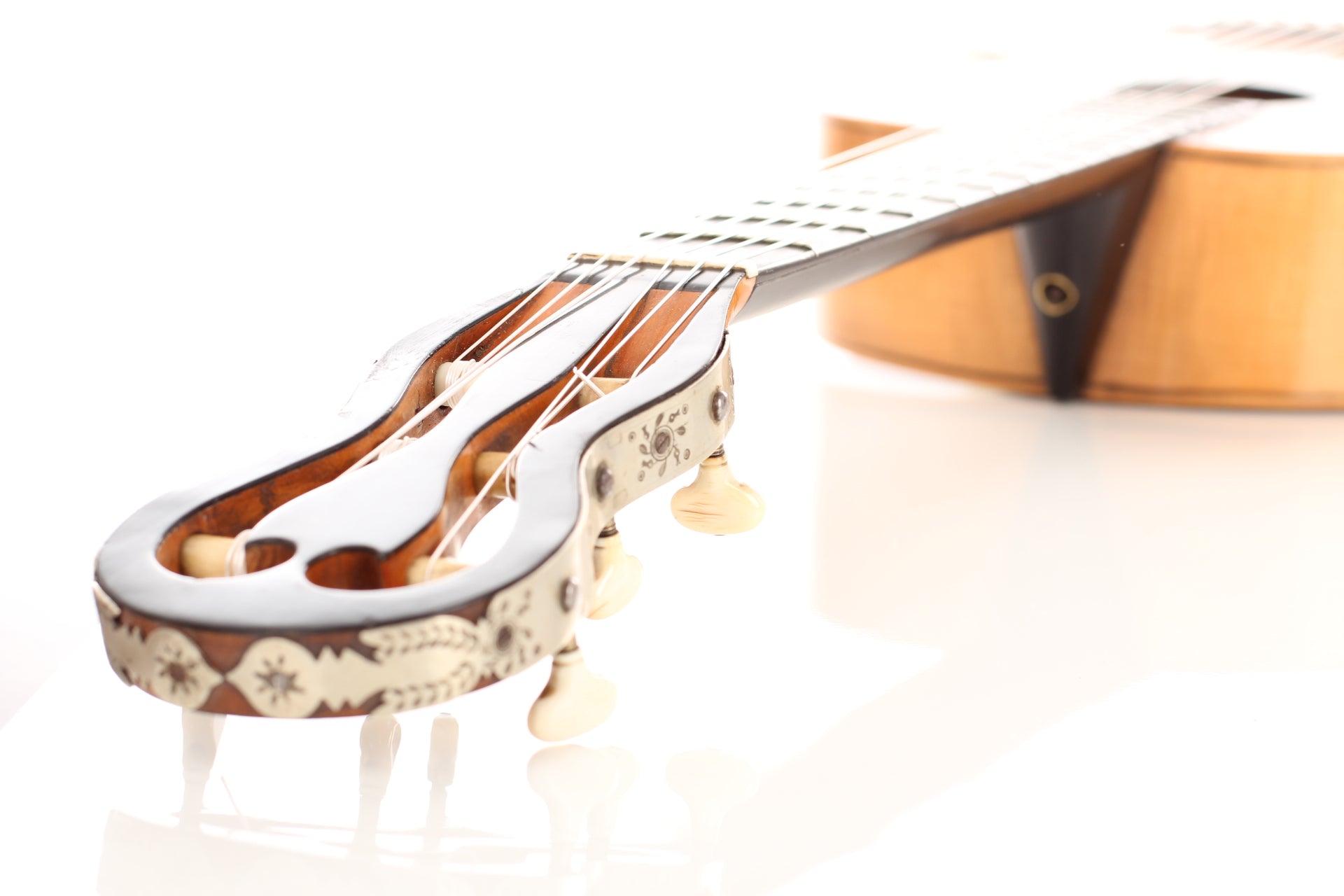 This wonderful guitar, constructed by Johann Georg Stauffer represents a very special model that is inspired by French romantic guitars. Because of the design and the serial number on the label this guitar can be assigned to the year 1827/28. The top is made of spruce wood and it is coated with a clear varnish. The sound hole is decorated with light and dark veneers. The guitar’s bridge is designed in a plain and modest manner. The sides are made of maple and the one-piece back is made of satinwood.