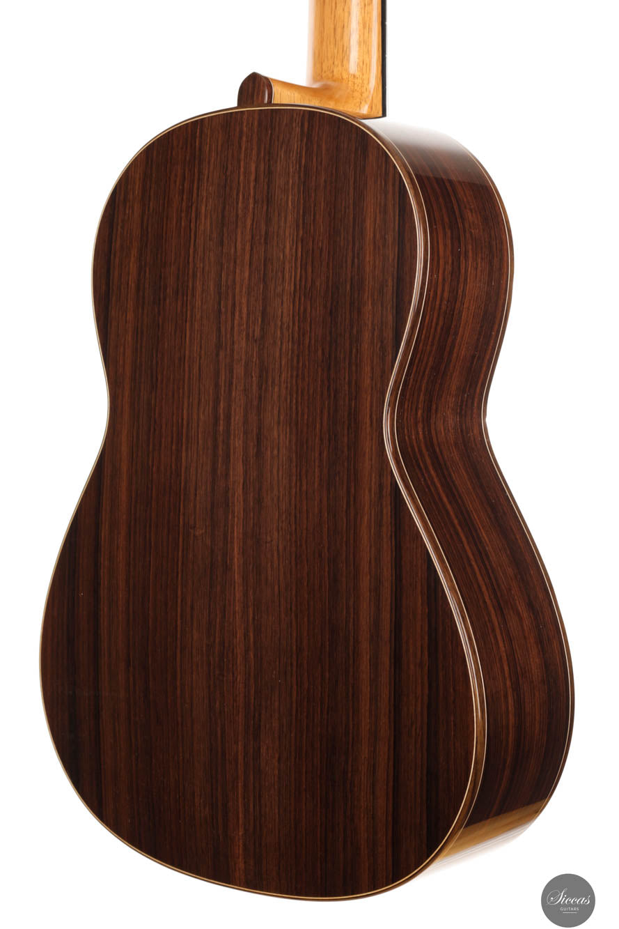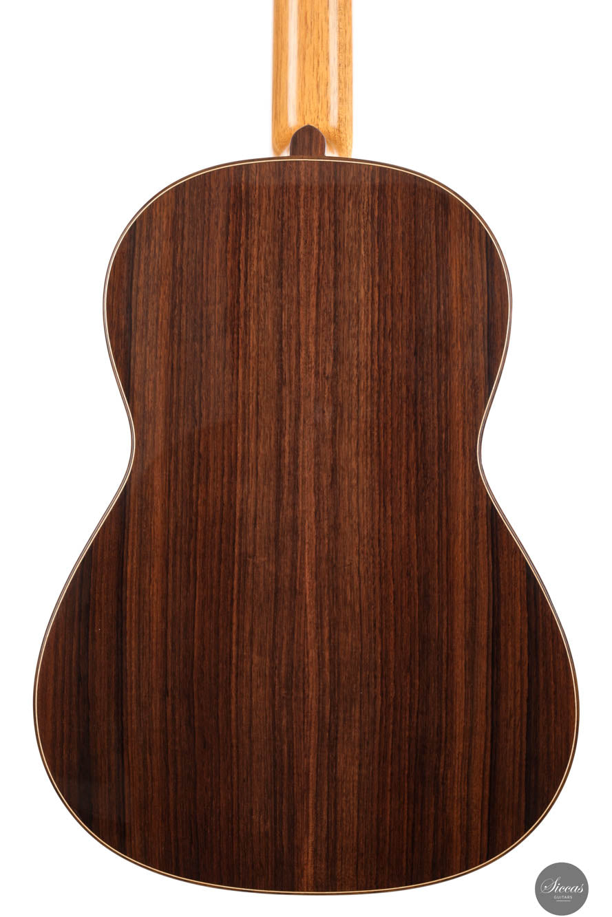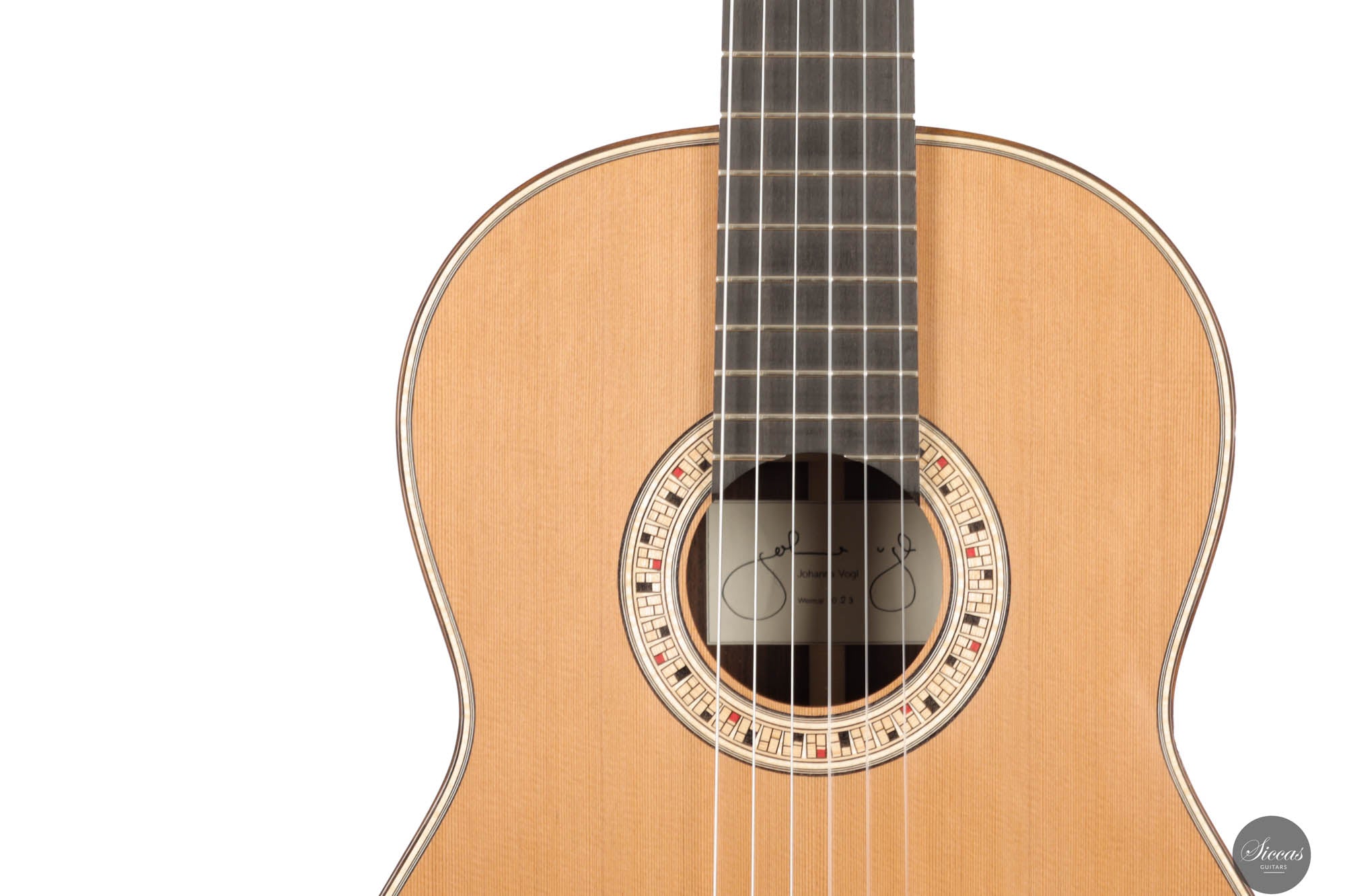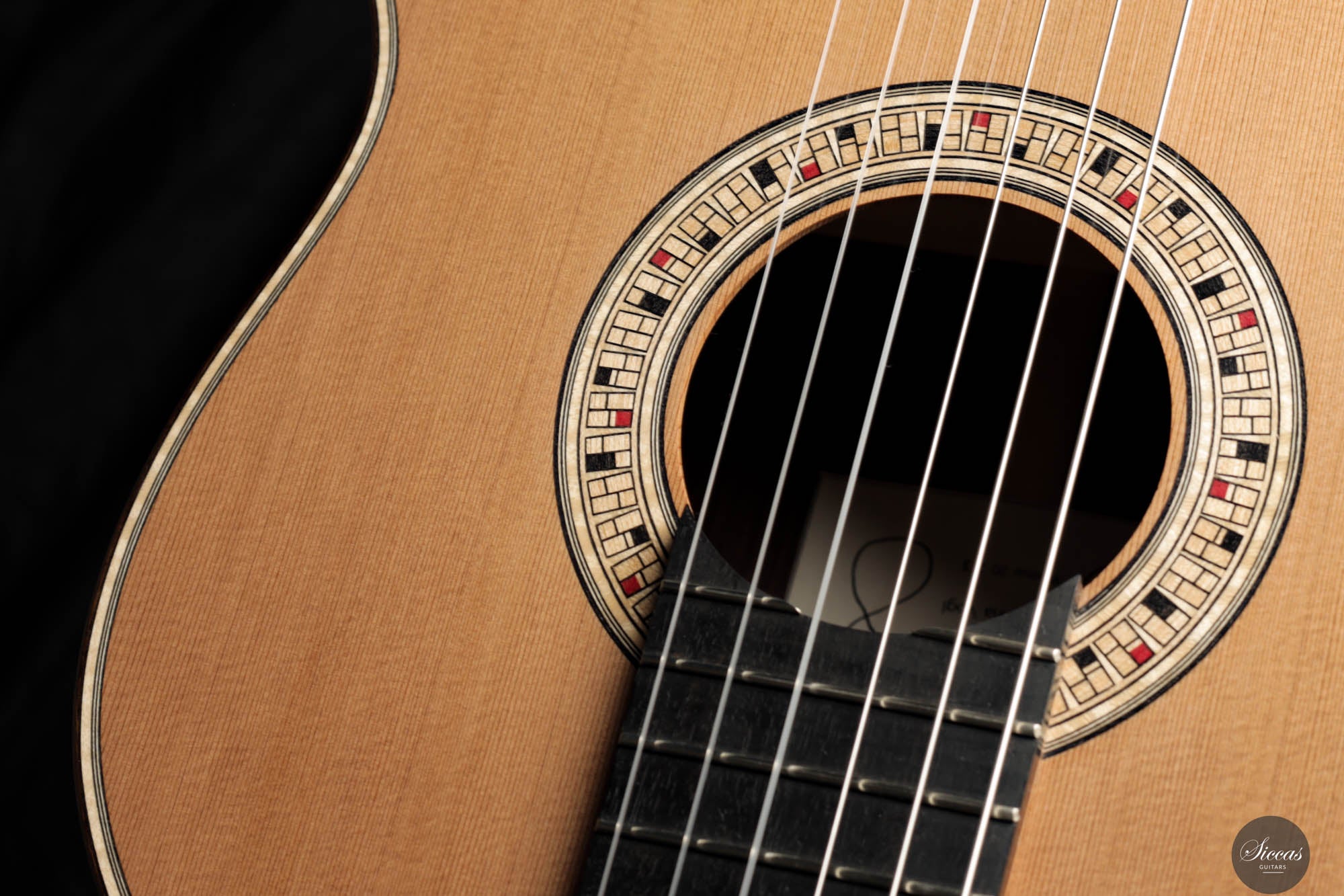 Die 2023er Johanna Vogl Gitarre erstrahlt als leuchtendes Beispiel dafür, wie traditionelles spanisches Gitarrenhandwerk wunderschön mit modernen Innovationen verschmolzen werden kann, um eine Konzertklassikgitarre zu kreieren, die sowohl mit Geschichte als auch mit zeitgenössischer Kunstfertigkeit resoniert. Inspiriert vom verehrten Gitarrenbauer Jose L. Romanillos, hat Johanna Vogl geschickt ein Instrument geschaffen, das zeitloses Design verkörpert und gleichzeitig moderne Fortschritte im Gitarrenbau umarmt. Die auf E/F abgestimmte Zedern-Schalldecke verleiht den Bassklängen eine sowohl tiefe als auch fesselnde Lebenskraft. Diese tiefe und eindringliche Klangqualität bereichert die Resonanz der Gitarre und macht sie zu einem herausragenden Instrument. Diese reichen Bässe werden durch Höhen ergänzt, die mit kristallklarer Klarheit glänzen und eine ausgewogene und charmante Präsenz im gesamten Klangspektrum der Gitarre schaffen. Diese sorgfältige Balance des Klangs gewährleistet ein fesselndes Erlebnis sowohl für Spieler als auch für Zuhörer und zeigt Vogls außergewöhnliches Können bei der Stimmgebung des Instruments.
