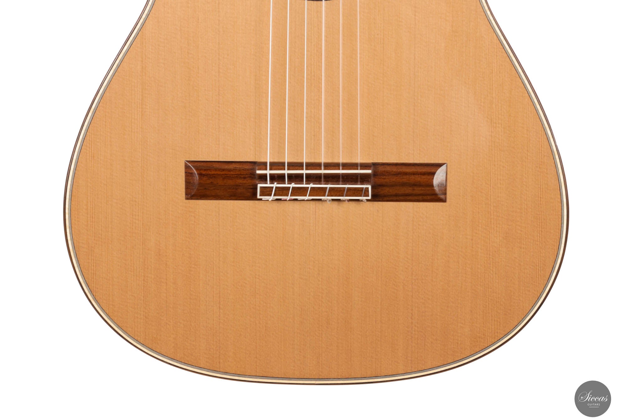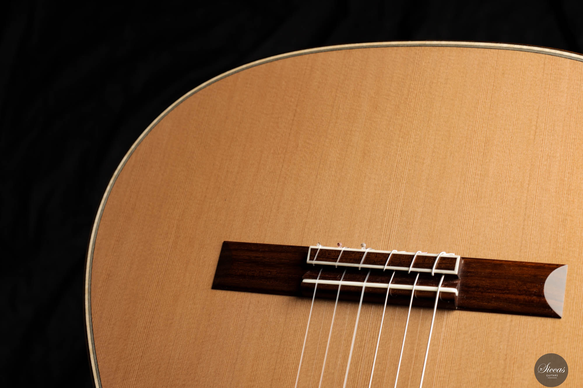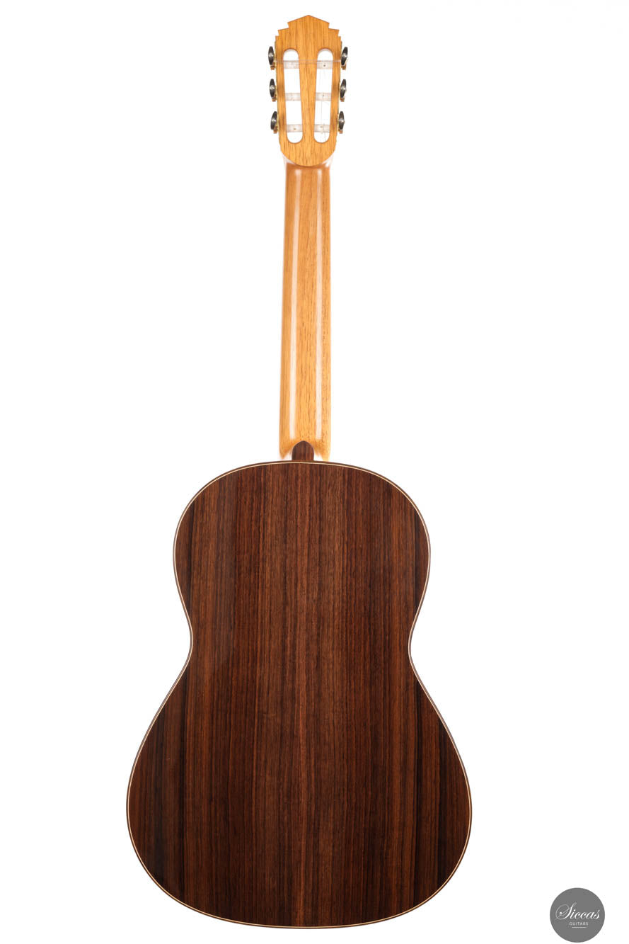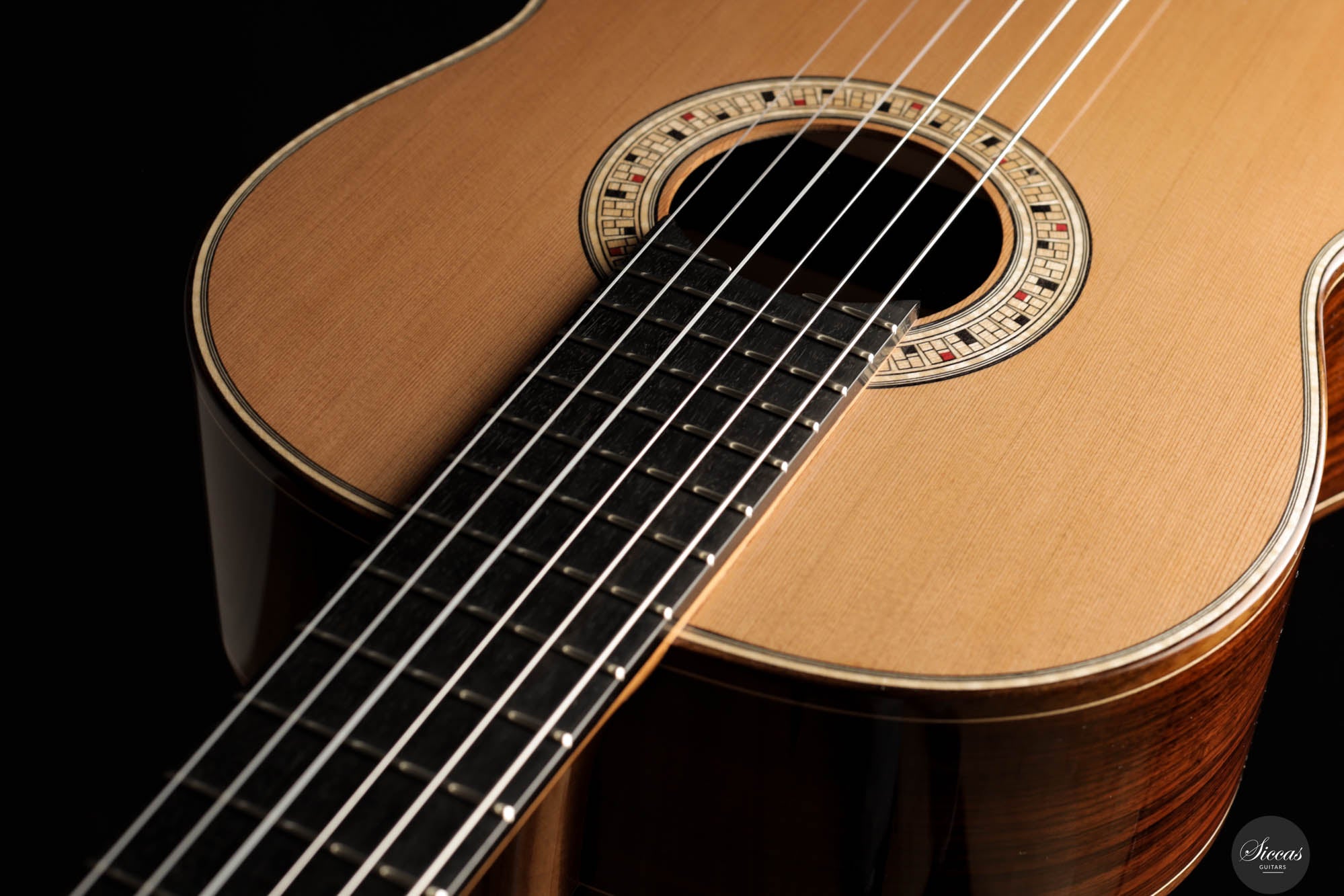 Die 2023er Johanna Vogl Gitarre erstrahlt als leuchtendes Beispiel dafür, wie traditionelles spanisches Gitarrenhandwerk wunderschön mit modernen Innovationen verschmolzen werden kann, um eine Konzertklassikgitarre zu kreieren, die sowohl mit Geschichte als auch mit zeitgenössischer Kunstfertigkeit resoniert. Inspiriert vom verehrten Gitarrenbauer Jose L. Romanillos, hat Johanna Vogl geschickt ein Instrument geschaffen, das zeitloses Design verkörpert und gleichzeitig moderne Fortschritte im Gitarrenbau umarmt. Die auf E/F abgestimmte Zedern-Schalldecke verleiht den Bassklängen eine sowohl tiefe als auch fesselnde Lebenskraft. Diese tiefe und eindringliche Klangqualität bereichert die Resonanz der Gitarre und macht sie zu einem herausragenden Instrument. Diese reichen Bässe werden durch Höhen ergänzt, die mit kristallklarer Klarheit glänzen und eine ausgewogene und charmante Präsenz im gesamten Klangspektrum der Gitarre schaffen. Diese sorgfältige Balance des Klangs gewährleistet ein fesselndes Erlebnis sowohl für Spieler als auch für Zuhörer und zeigt Vogls außergewöhnliches Können bei der Stimmgebung des Instruments.