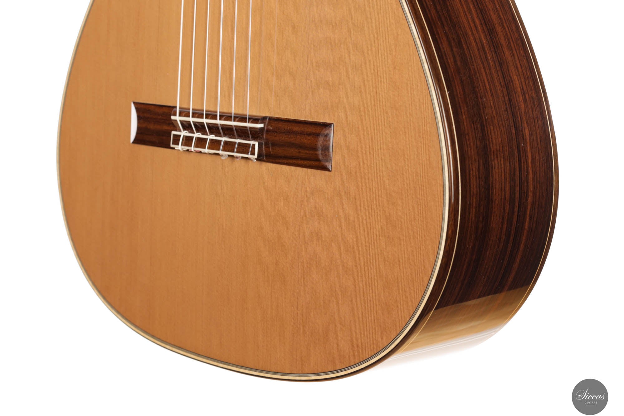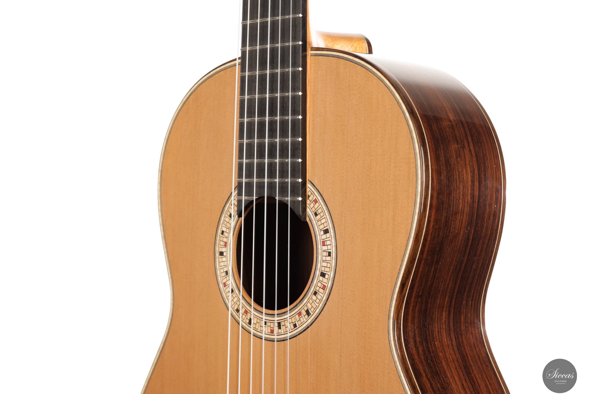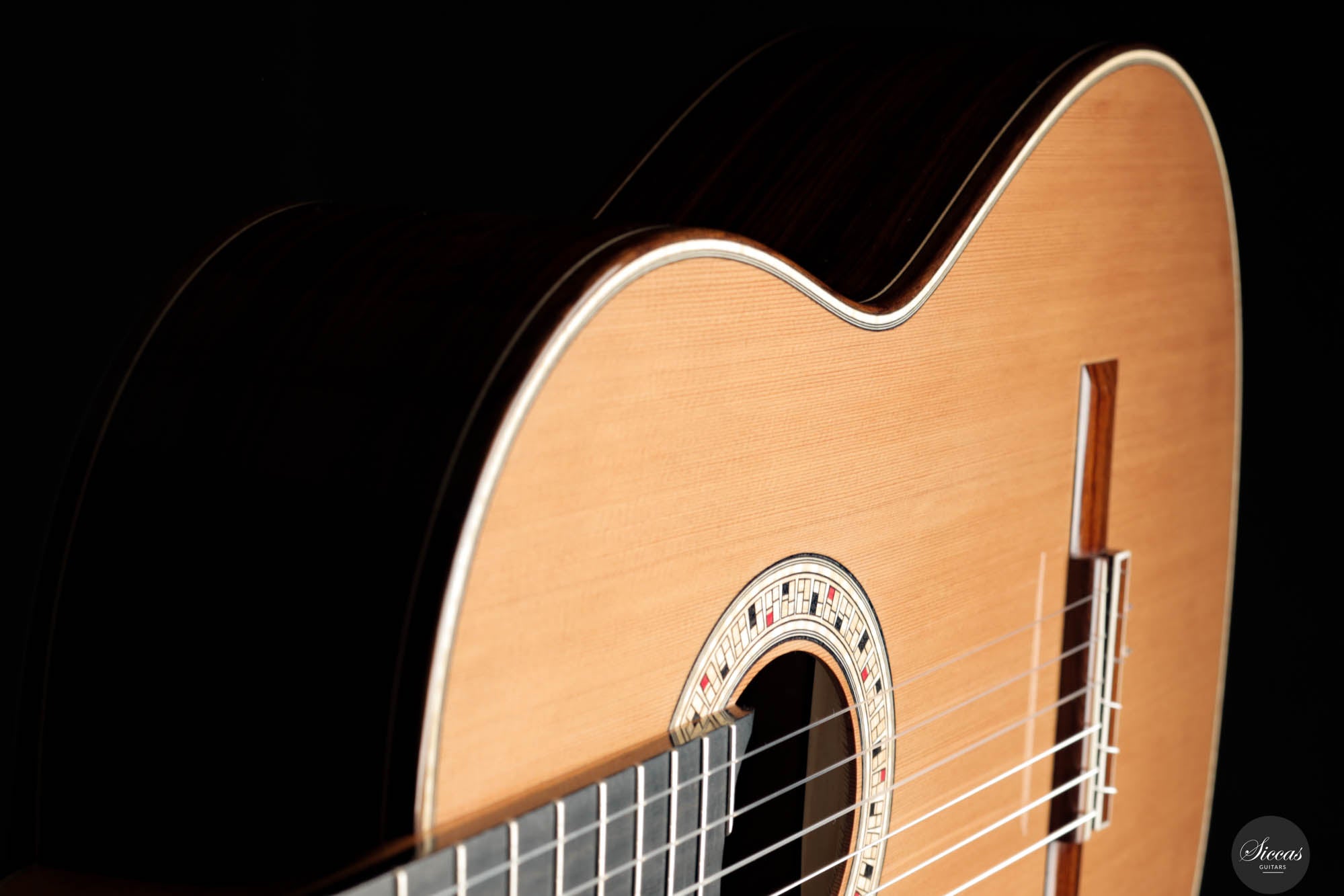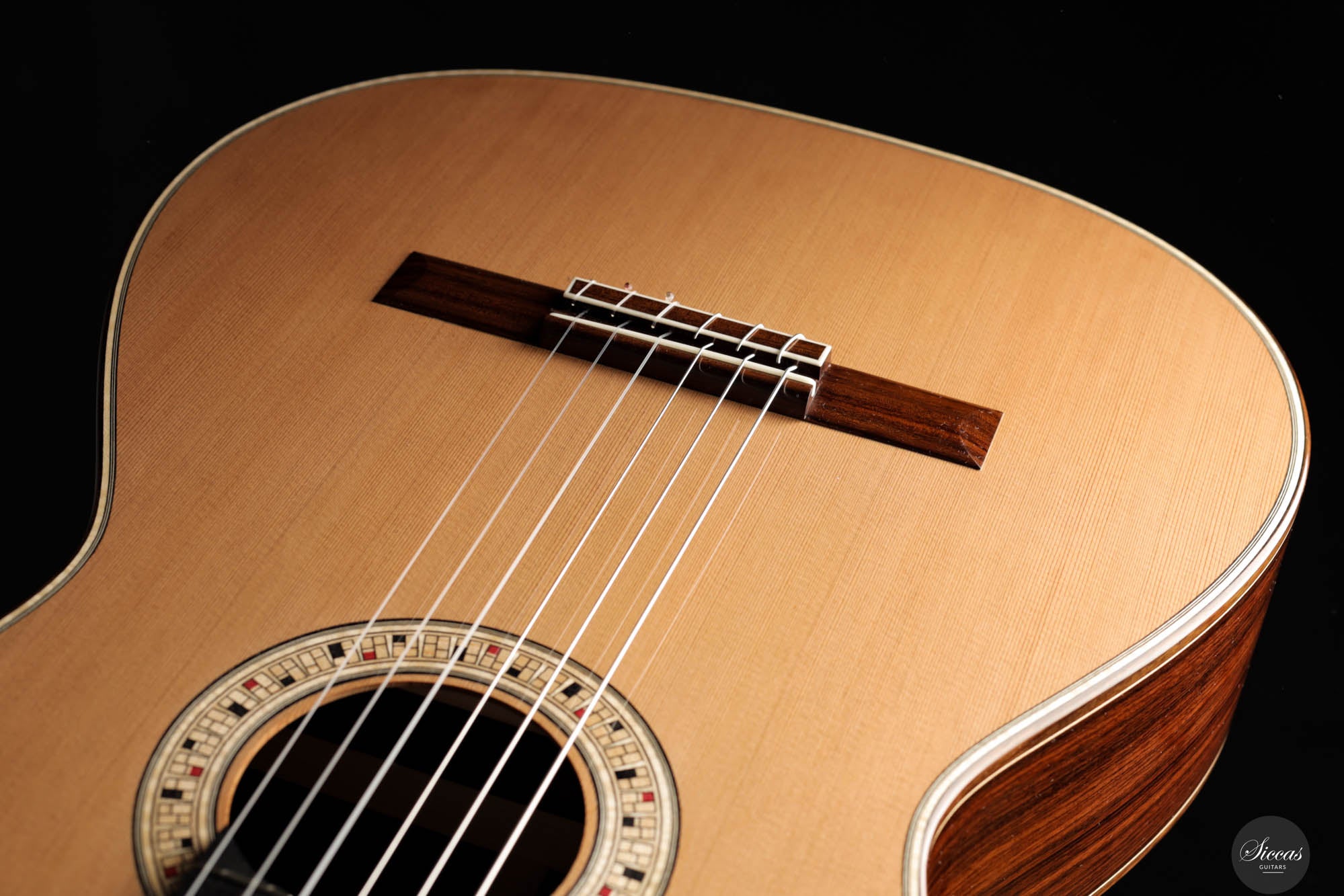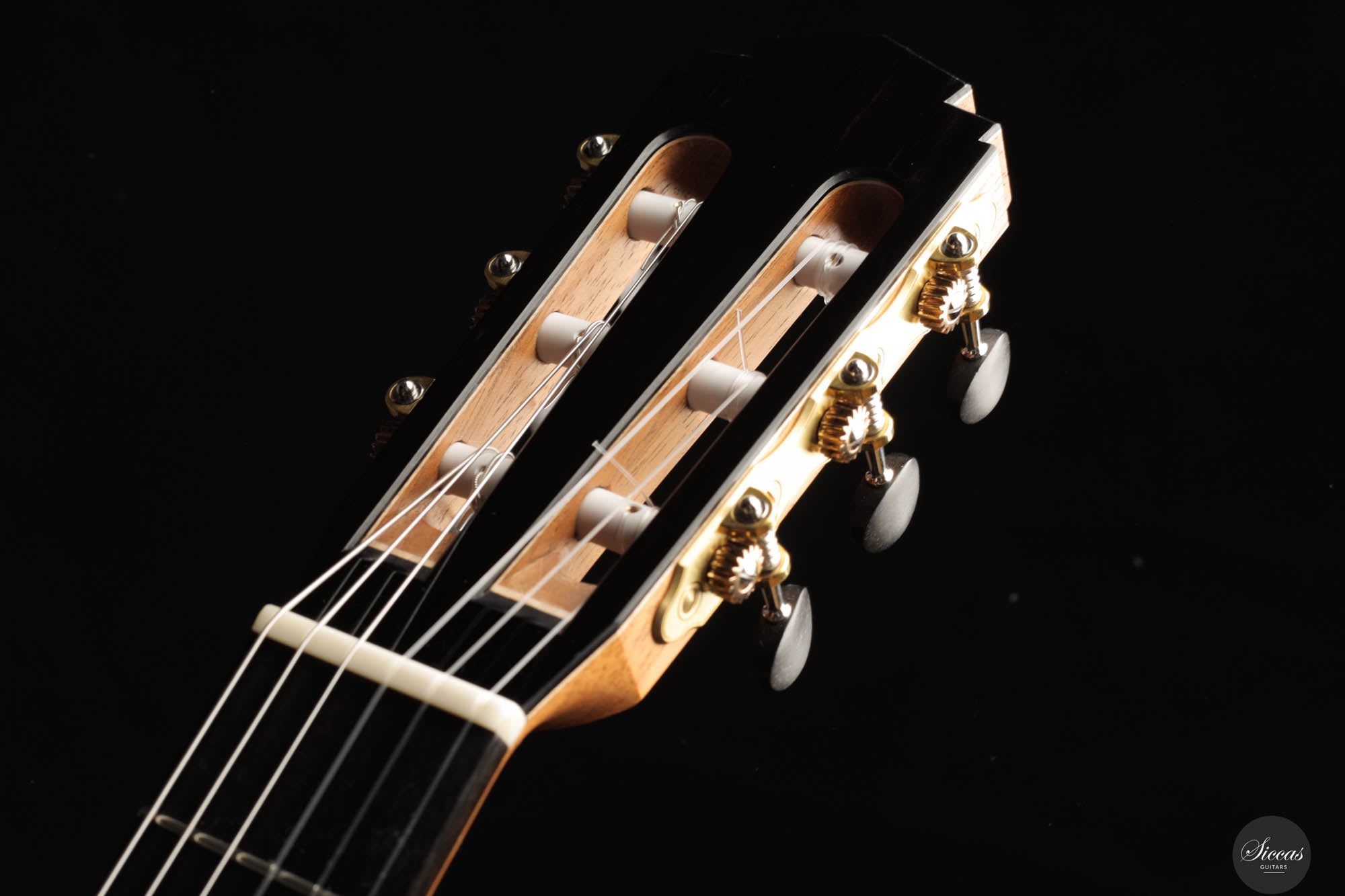 Die 2023er Johanna Vogl Gitarre erstrahlt als leuchtendes Beispiel dafür, wie traditionelles spanisches Gitarrenhandwerk wunderschön mit modernen Innovationen verschmolzen werden kann, um eine Konzertklassikgitarre zu kreieren, die sowohl mit Geschichte als auch mit zeitgenössischer Kunstfertigkeit resoniert. Inspiriert vom verehrten Gitarrenbauer Jose L. Romanillos, hat Johanna Vogl geschickt ein Instrument geschaffen, das zeitloses Design verkörpert und gleichzeitig moderne Fortschritte im Gitarrenbau umarmt. Die auf E/F abgestimmte Zedern-Schalldecke verleiht den Bassklängen eine sowohl tiefe als auch fesselnde Lebenskraft. Diese tiefe und eindringliche Klangqualität bereichert die Resonanz der Gitarre und macht sie zu einem herausragenden Instrument. Diese reichen Bässe werden durch Höhen ergänzt, die mit kristallklarer Klarheit glänzen und eine ausgewogene und charmante Präsenz im gesamten Klangspektrum der Gitarre schaffen. Diese sorgfältige Balance des Klangs gewährleistet ein fesselndes Erlebnis sowohl für Spieler als auch für Zuhörer und zeigt Vogls außergewöhnliches Können bei der Stimmgebung des Instruments.