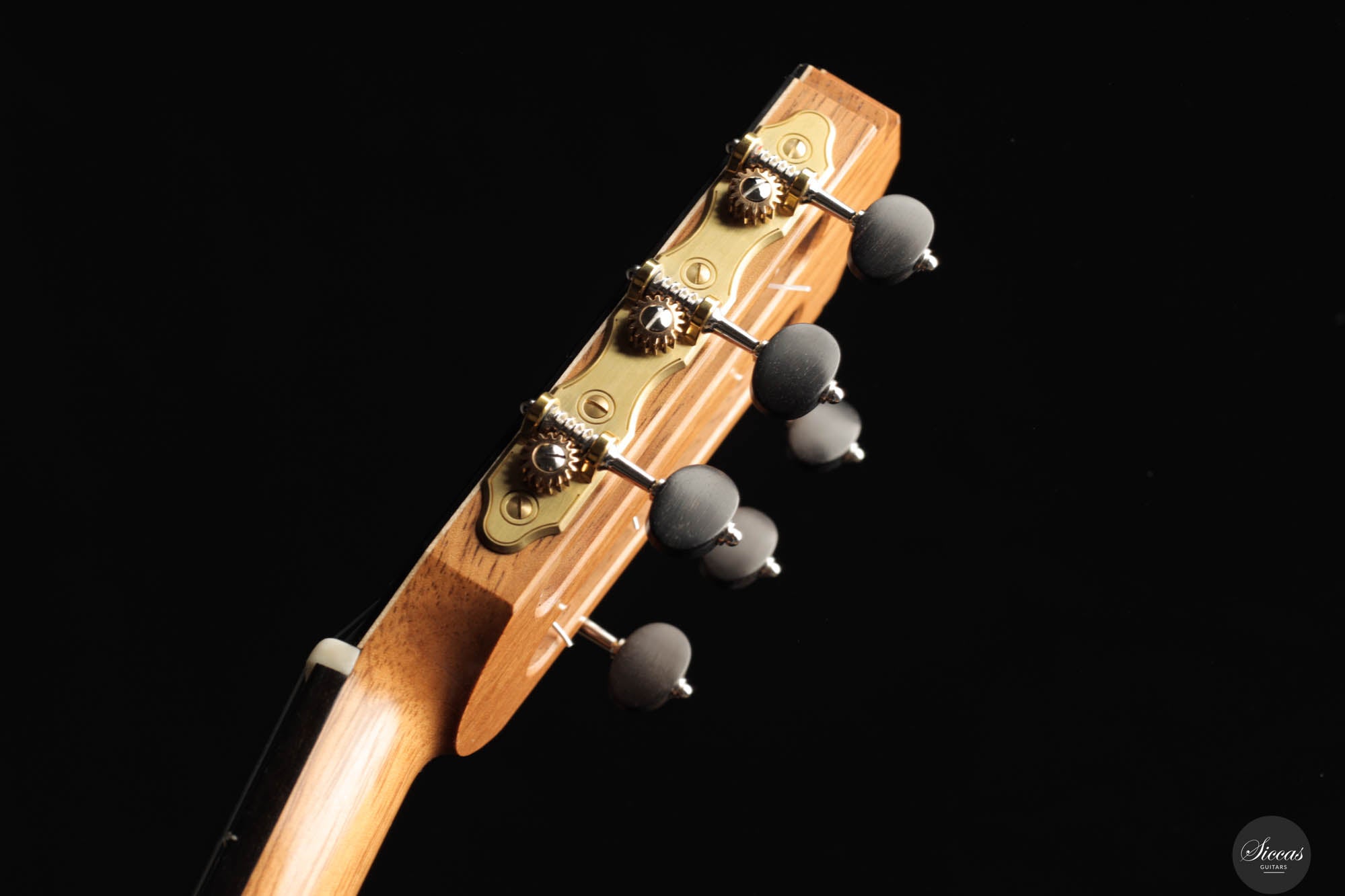 Jenseits ihrer klanglichen Eigenschaften bietet die Johanna Vogl Gitarre hervorragende Bespielbarkeit und Vielseitigkeit. Das erhöhte Griffbrett ist ein bemerkenswertes Merkmal, das die Spielbarkeit verbessert und es Gitarristen ermöglicht, mühelos komplexe musikalische Passagen zu meistern. Dieses Designelement, kombiniert mit dem beeindruckenden Volumen und der Projektion der Gitarre, stellt sicher, dass der Ausdruck des Musikers in jedem Aufführungsumfeld mit Klarheit und Wirkung vermittelt wird. Die Ästhetik dieser Gitarre ist so raffiniert wie ihr Klang, gekennzeichnet durch eine minimalistische Eleganz. Die geschmackvolle Einfachheit des Rosetten- und Kopfplattendesigns verleiht ihr eine anspruchsvolle visuelle Anziehungskraft, die Vogls akribische Liebe zum Detail und ihr Engagement für die Schaffung optisch ansprechender Instrumente widerspiegelt. Diese subtilen, aber auffälligen Designelemente unterstreichen die handwerkliche Qualität und den ästhetischen Charme der Gitarre.