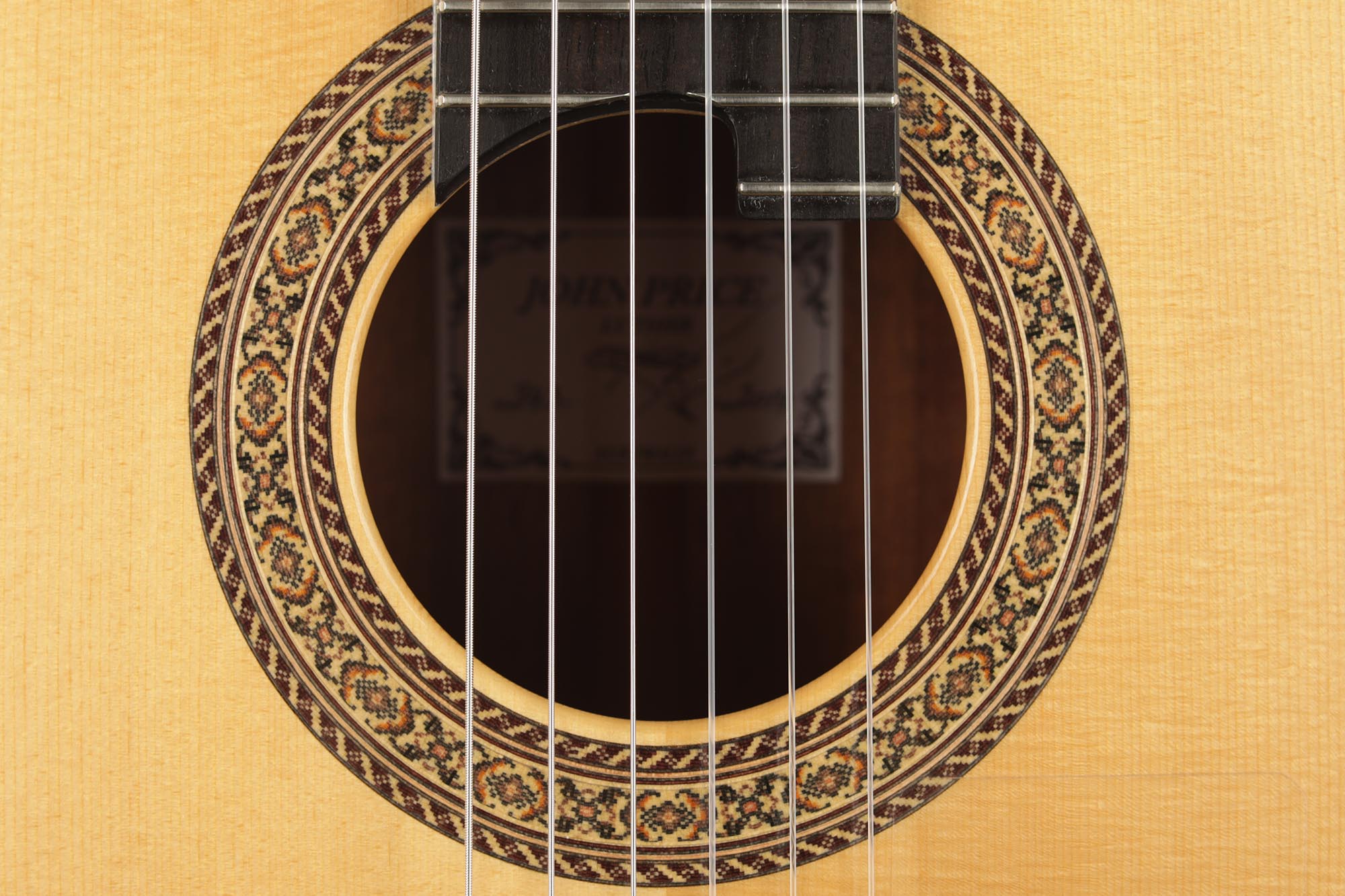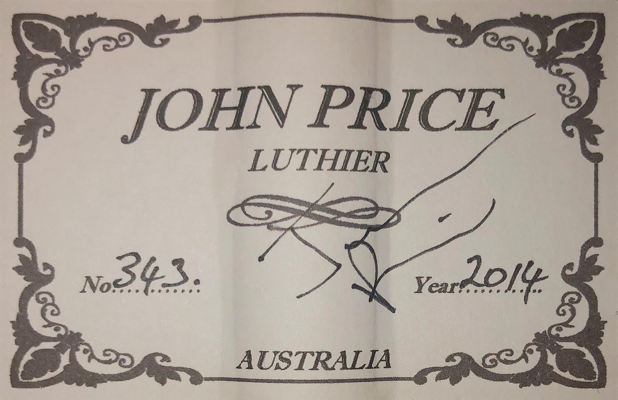 John Price nutzt sowohl seine musikalischen als auch seine Kenntnisse im Schreinerhandwerk und verfolgt beim Konzipieren und Bauen von Instrumenten einen sehr intuitiven Stil. Sein besonderer Ansatz bei der Konstruktion der Decke und der Gitterbeleistung verbessern das Volumen, den Tonumfang und die Nuancenvielfalt, was im modernen Gitarrenbau sehr gefragt ist. Laut Price werden durch die Verbindung dieser Art von Decke mit einem gewölbten, verstrebungsfreien Boden auch das Sustain und die Projektion erheblich verbessert. All diese Merkmale werden durch ein hervoragendes Setup ergänzt, was zu einem bemerkenswerten Spielkomfort führt und dem Interpreten viel Freiraum für musikalischen Ausdruck und Interpretation bietet.