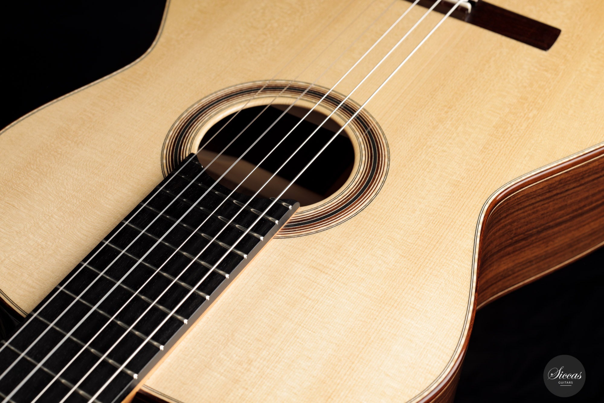 Viele Details wie das erhöhte Griffbrett, der leichte Radius des Griffbretts sowie die nüchterne und durchdachte Verzierung zeigen das moderne Engagement dieses Handwerkers.