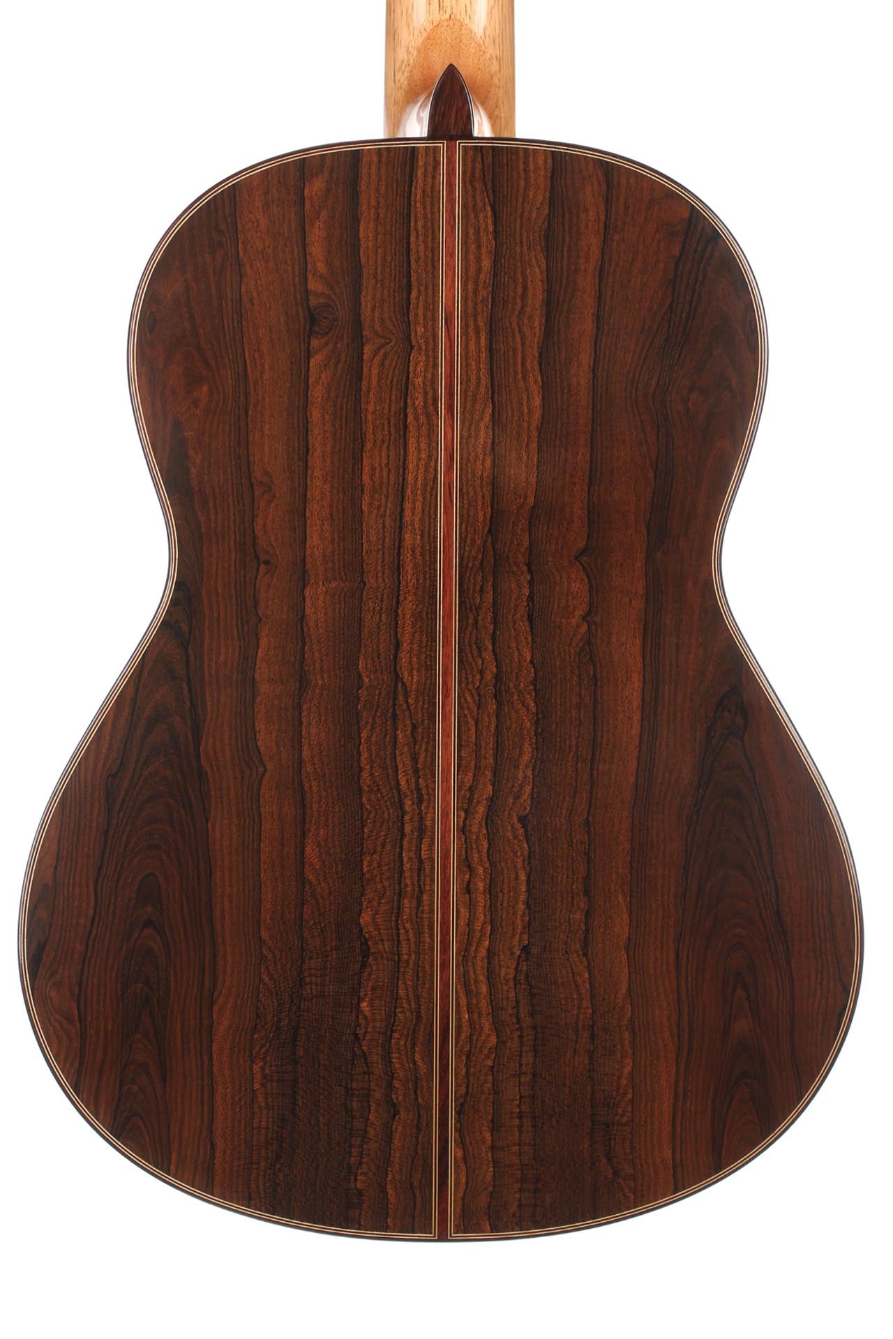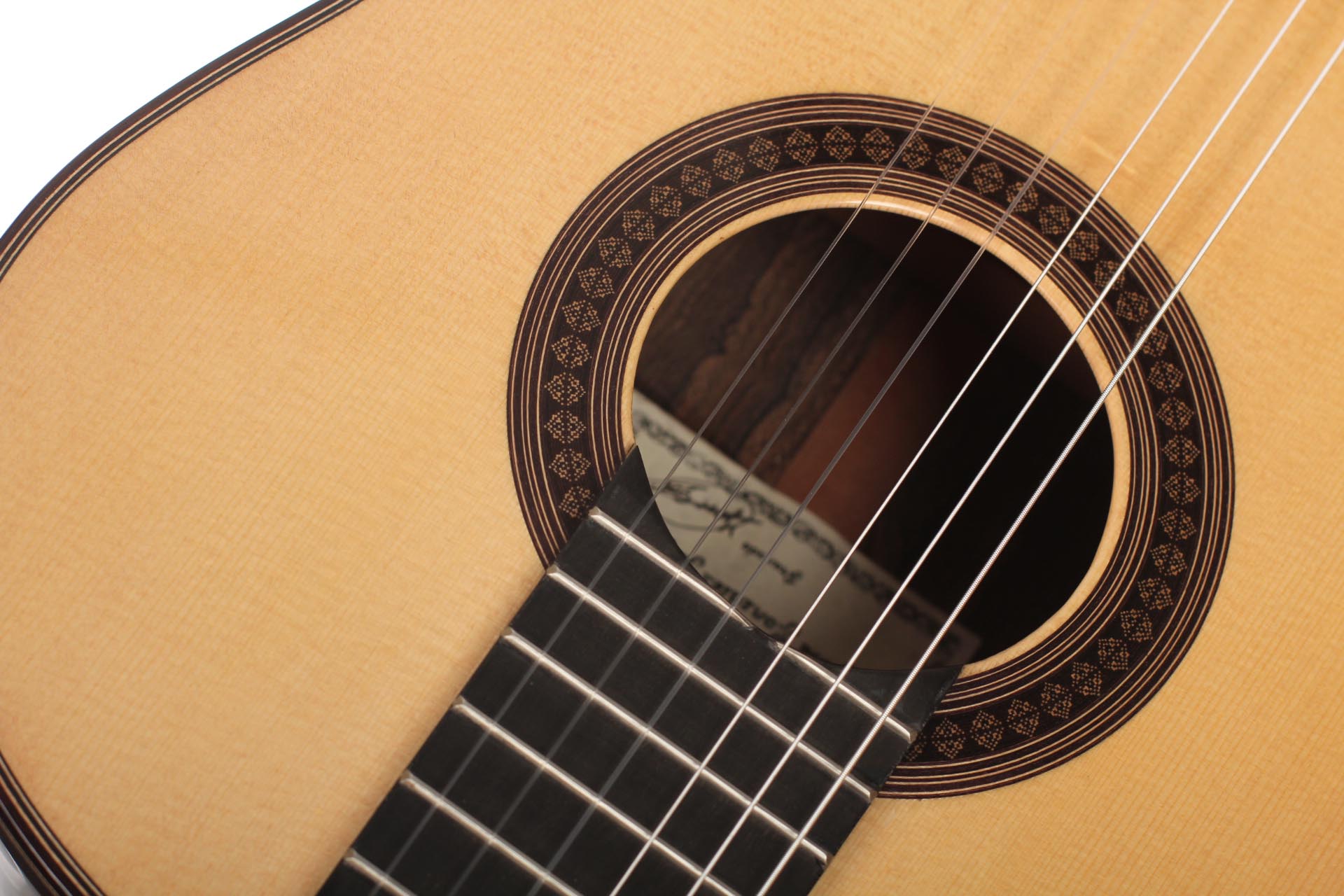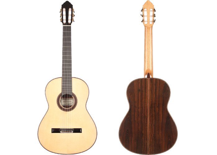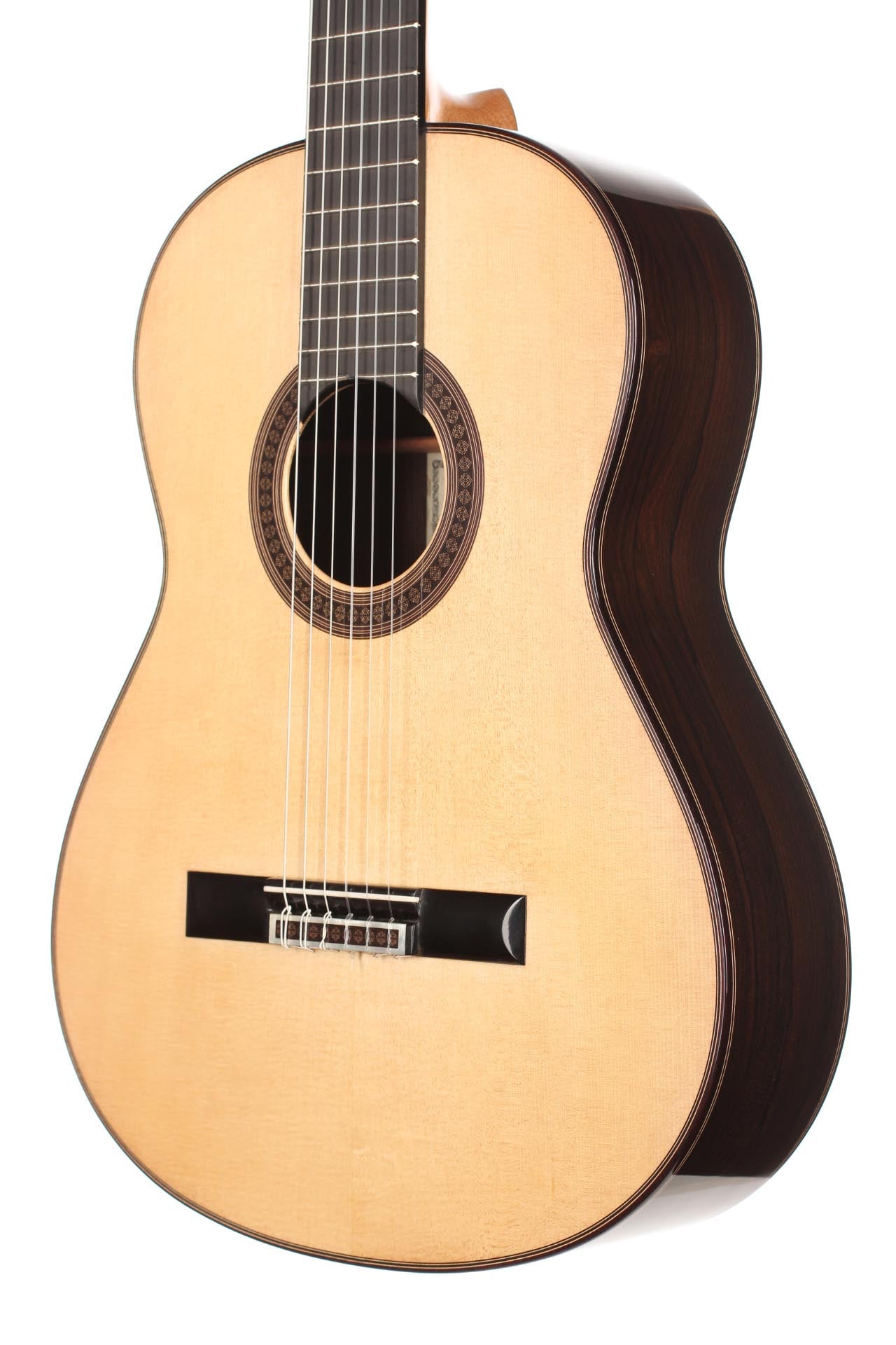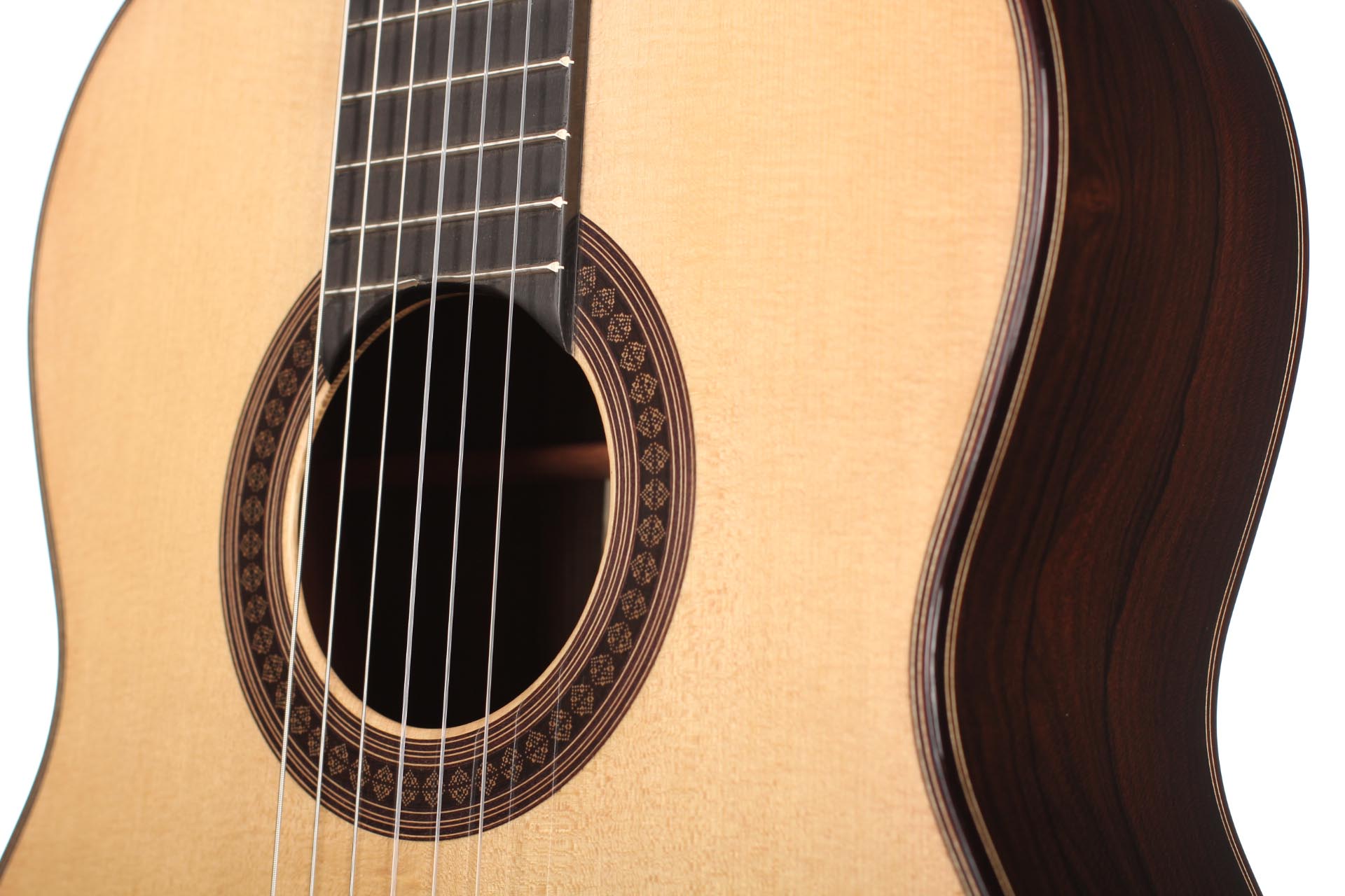 The German spruce top of this classical guitar has a straight veining, uniform and really strong through the entire surface. Back and side are made of the highest quality Ziricote. It is a beautiful guitar that is built very precisely. The balance, depth of bass and the clarity of treble and singing quality of this guitar makes it very joyful to play. The shellac finish is outstanding. A hard-shell case is included. This guitar is Cites-free (CF).