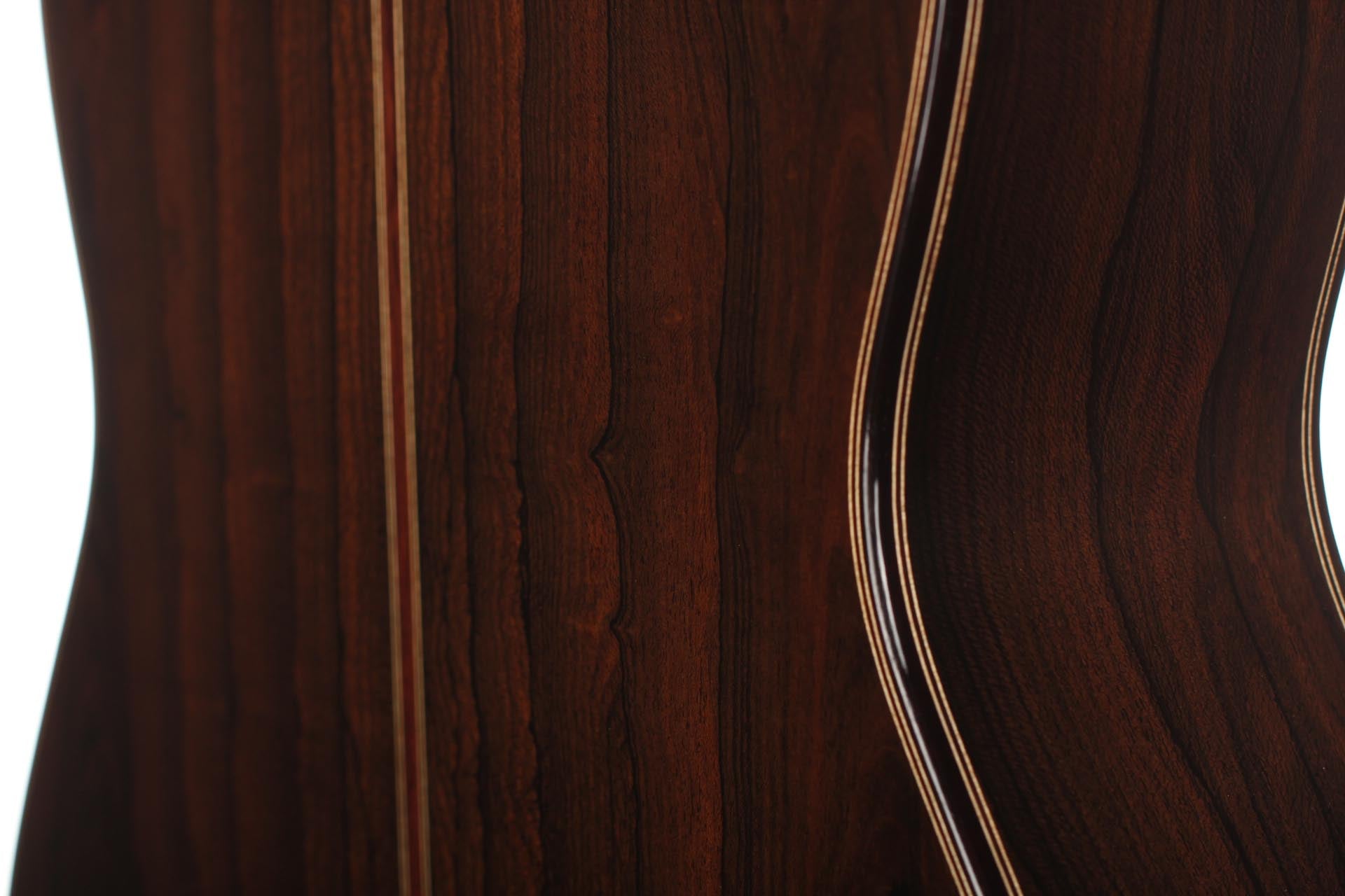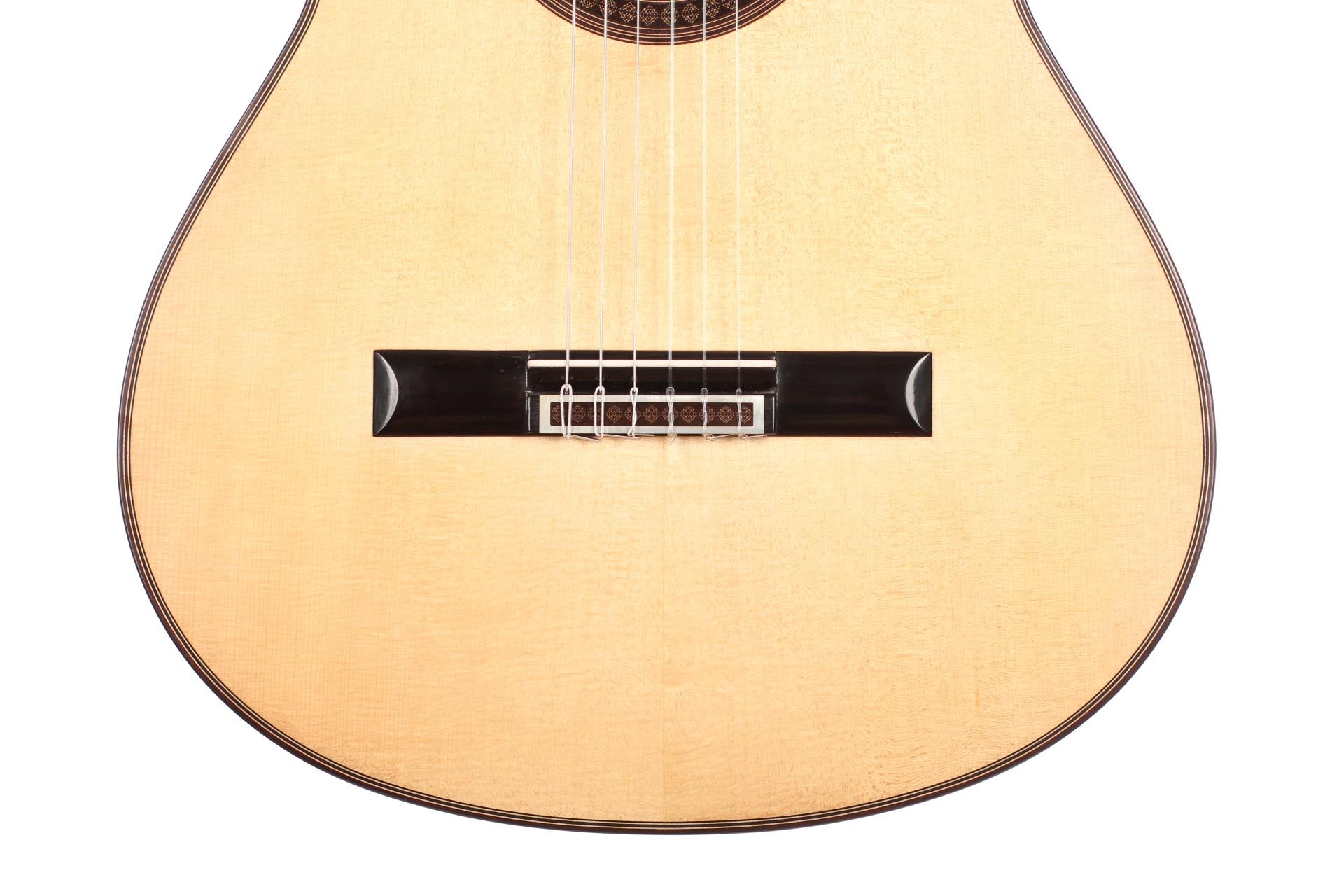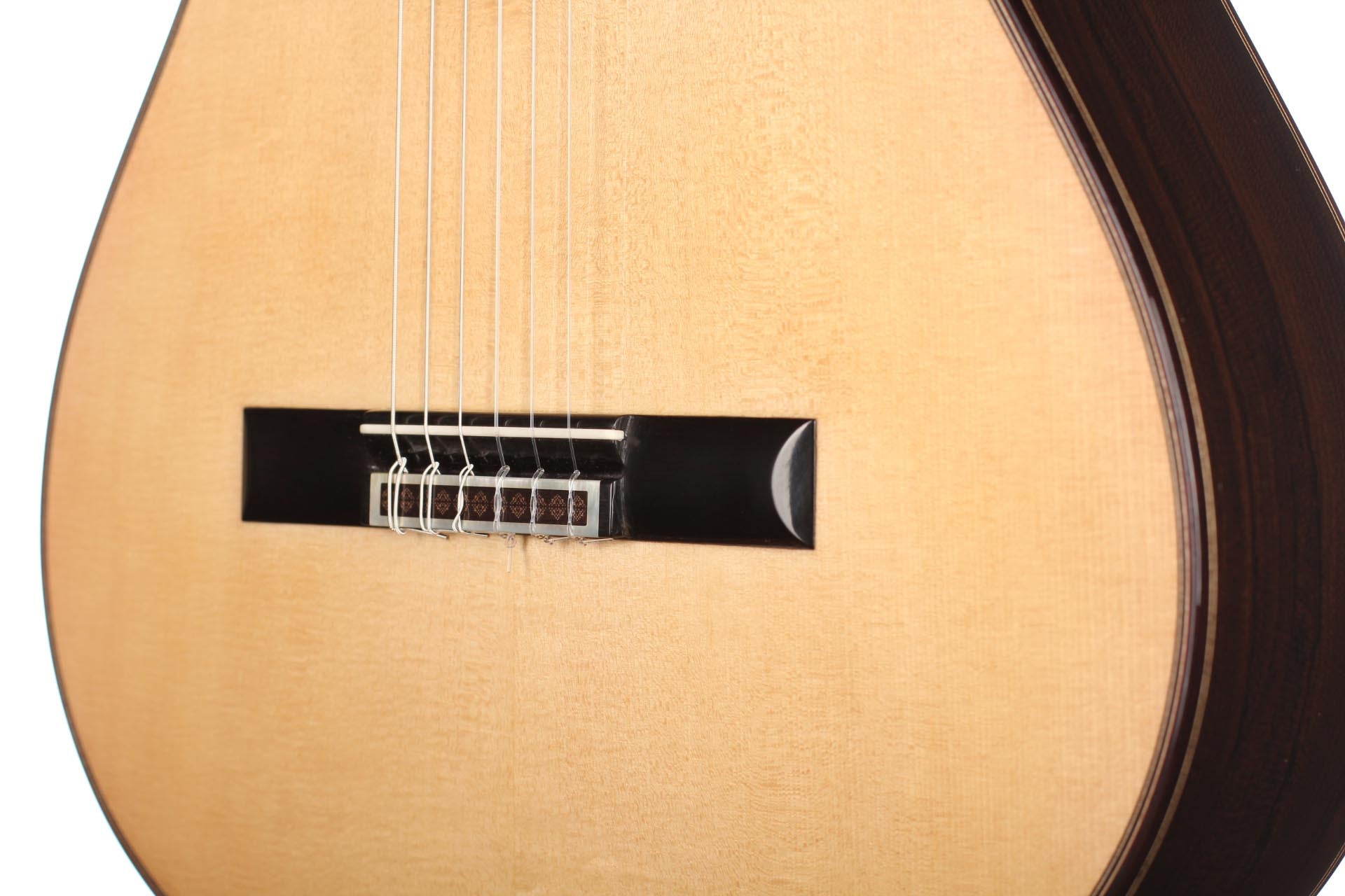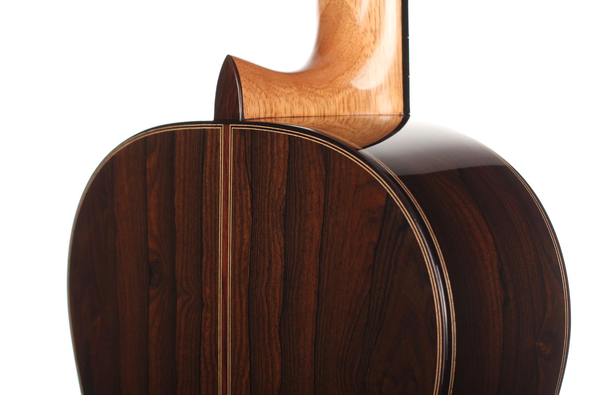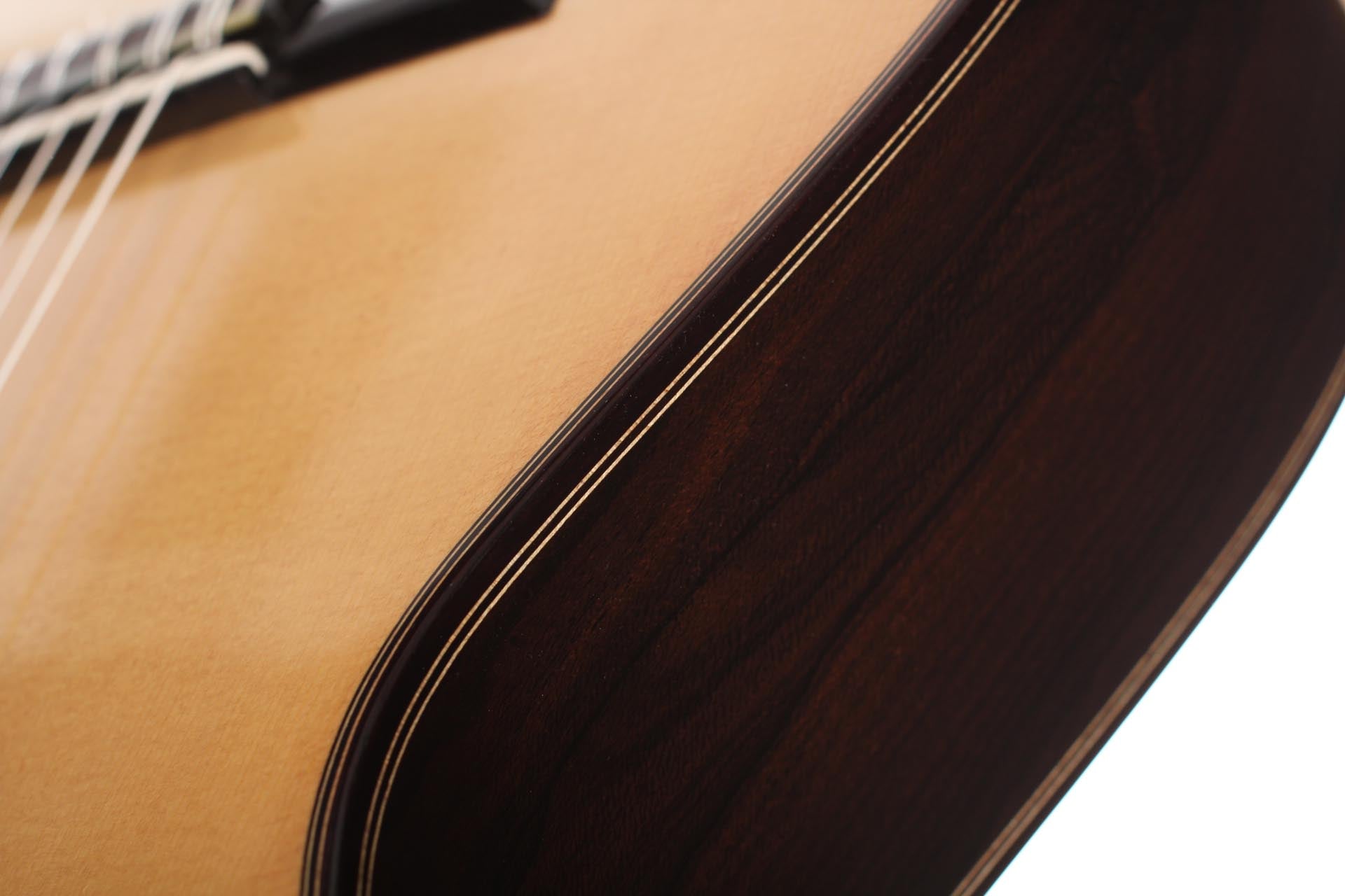 The German spruce top of this classical guitar has a straight veining, uniform and really strong through the entire surface. Back and side are made of the highest quality Ziricote. It is a beautiful guitar that is built very precisely. The balance, depth of bass and the clarity of treble and singing quality of this guitar makes it very joyful to play. The shellac finish is outstanding. A hard-shell case is included. This guitar is Cites-free (CF).
