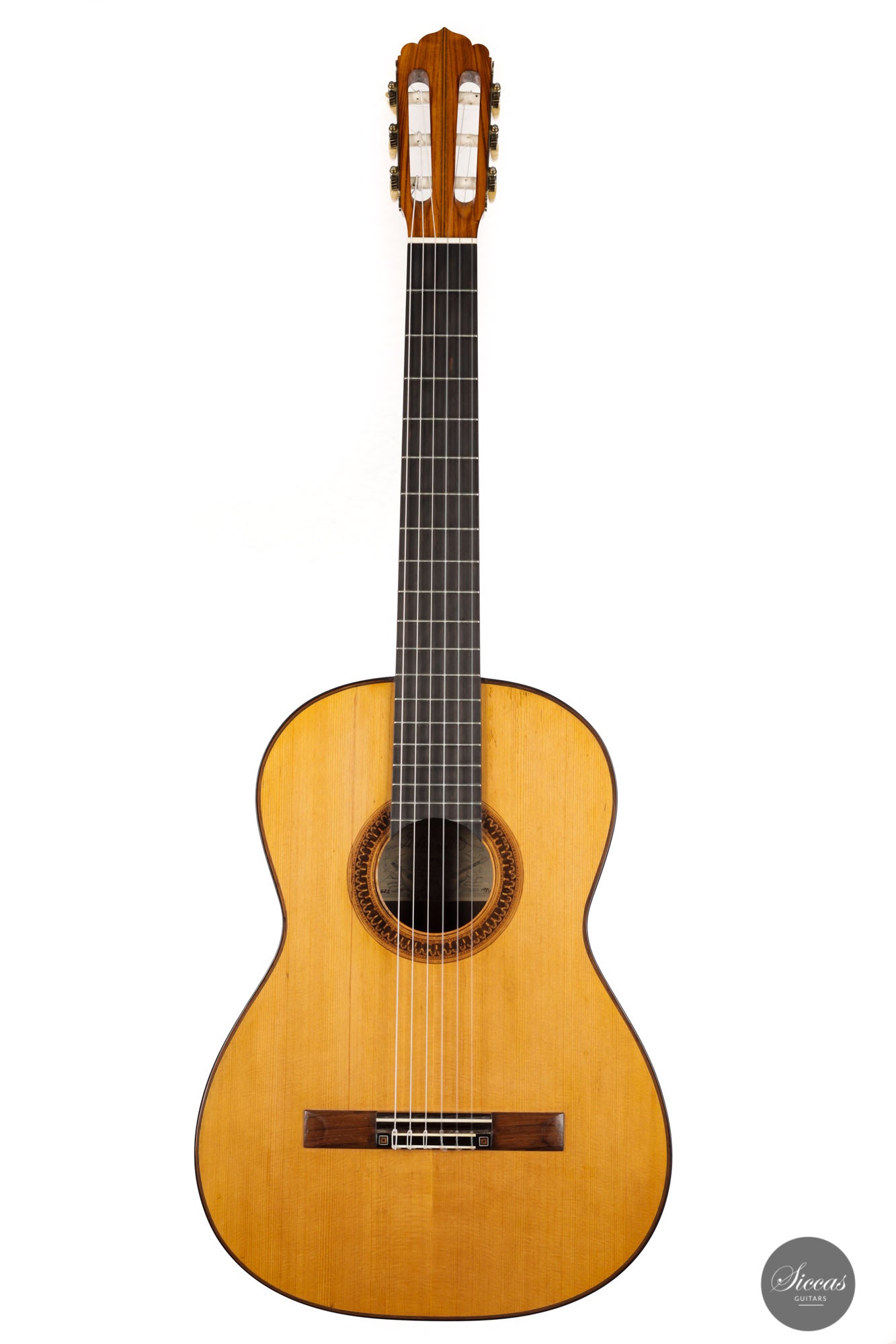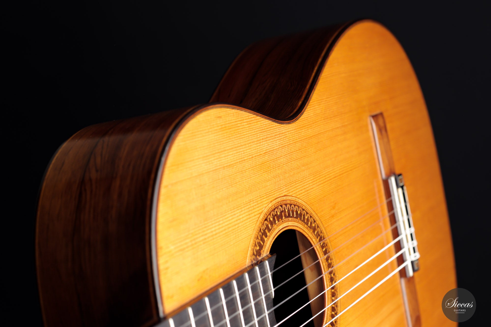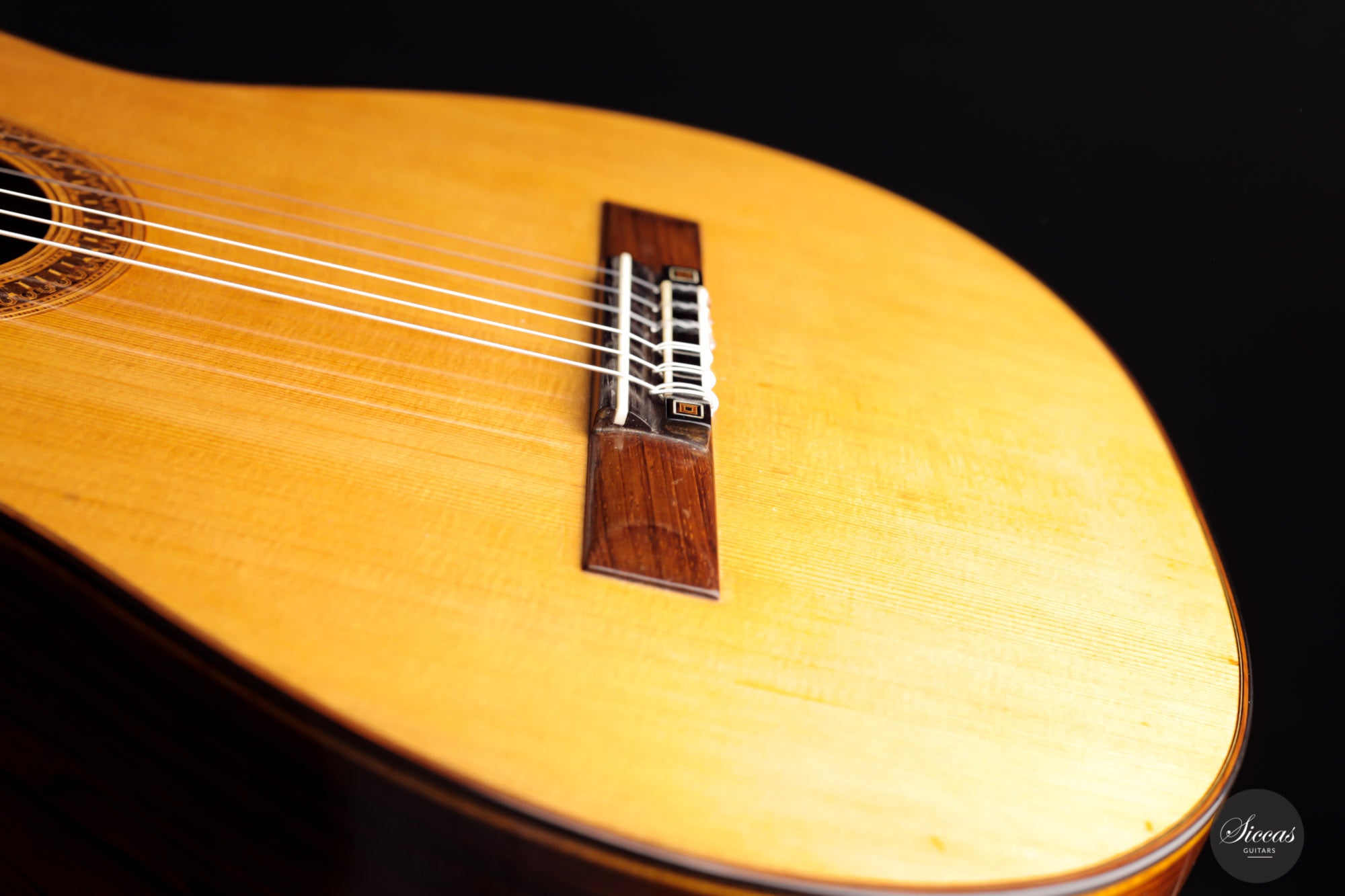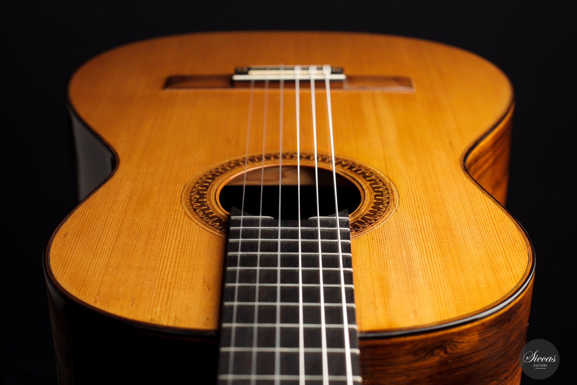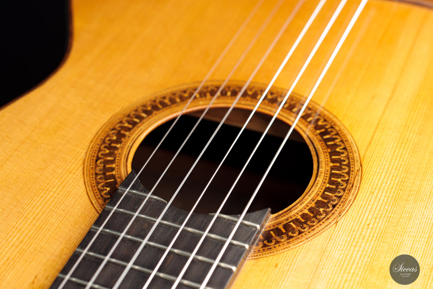 Die Decke der Gitarre weist einen professionell reparierten Riss auf, der vom dänischen Gitarrenbauer Kenneth Brögger stabilisiert wurde, sodass sich das Instrument in einem ausgezeichneten spielbaren Zustand befindet. Klanglich bietet diese Gitarre eine außergewöhnliche Klarheit und Ausgewogenheit über alle Register hinweg, mit einer atemberaubenden Subtilität in der Klangfarbe. Der Klang ist sowohl kraftvoll als auch raffiniert und verkörpert die reine spanische Tradition, die Romanillos perfektioniert hat. Dieses einzigartige Instrument ist ein seltenes und wertvolles Stück – ein Muss für anspruchsvolle Sammler und professionelle Musiker gleichermaßen.