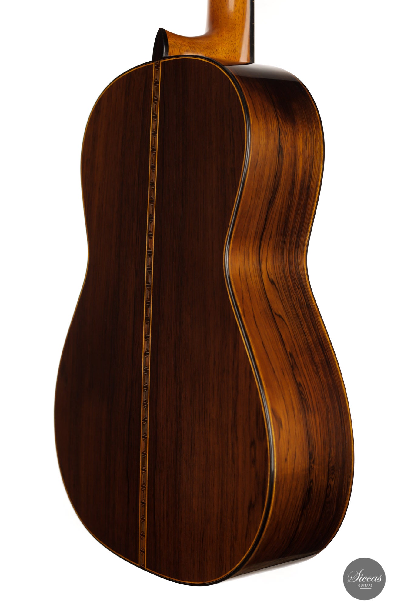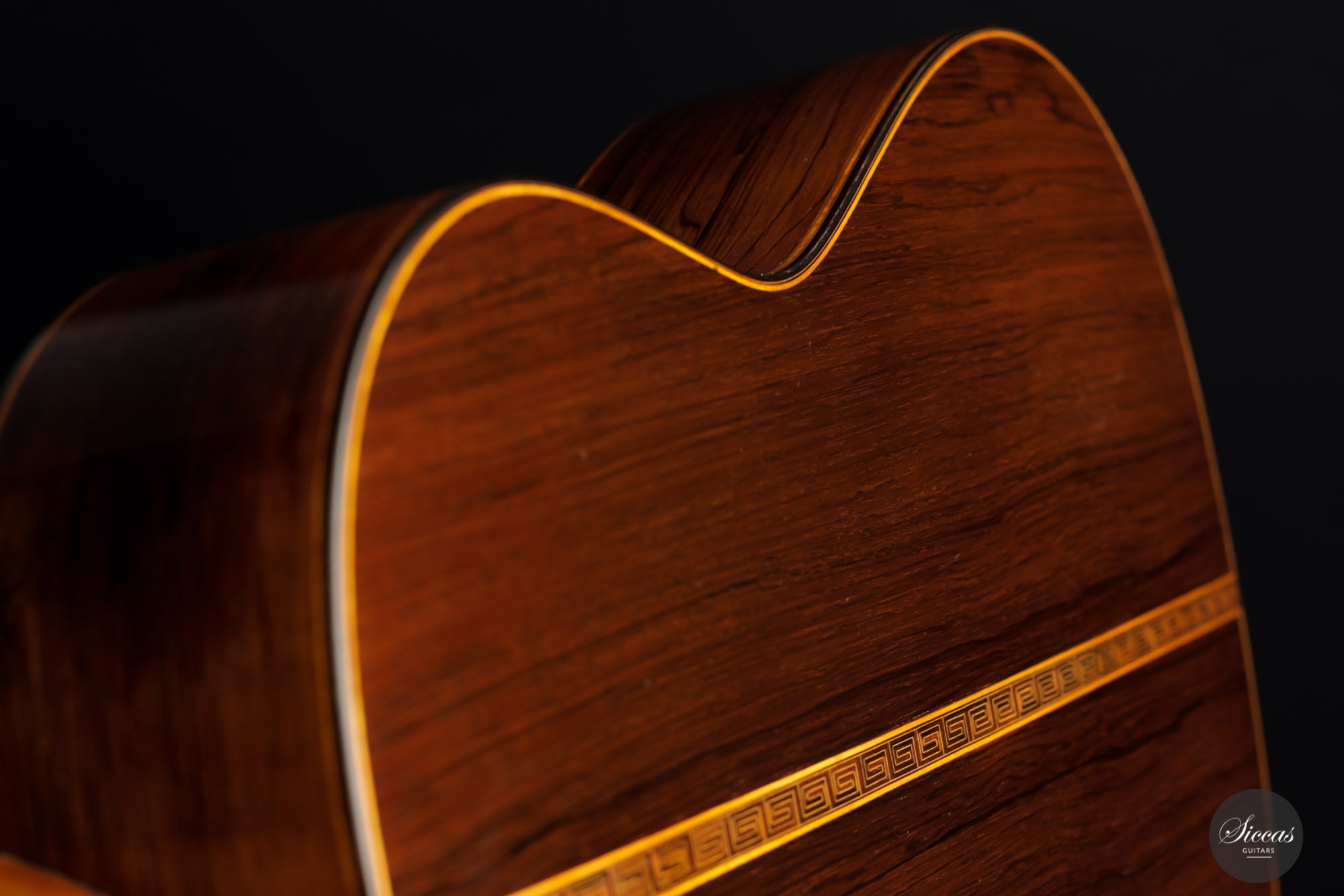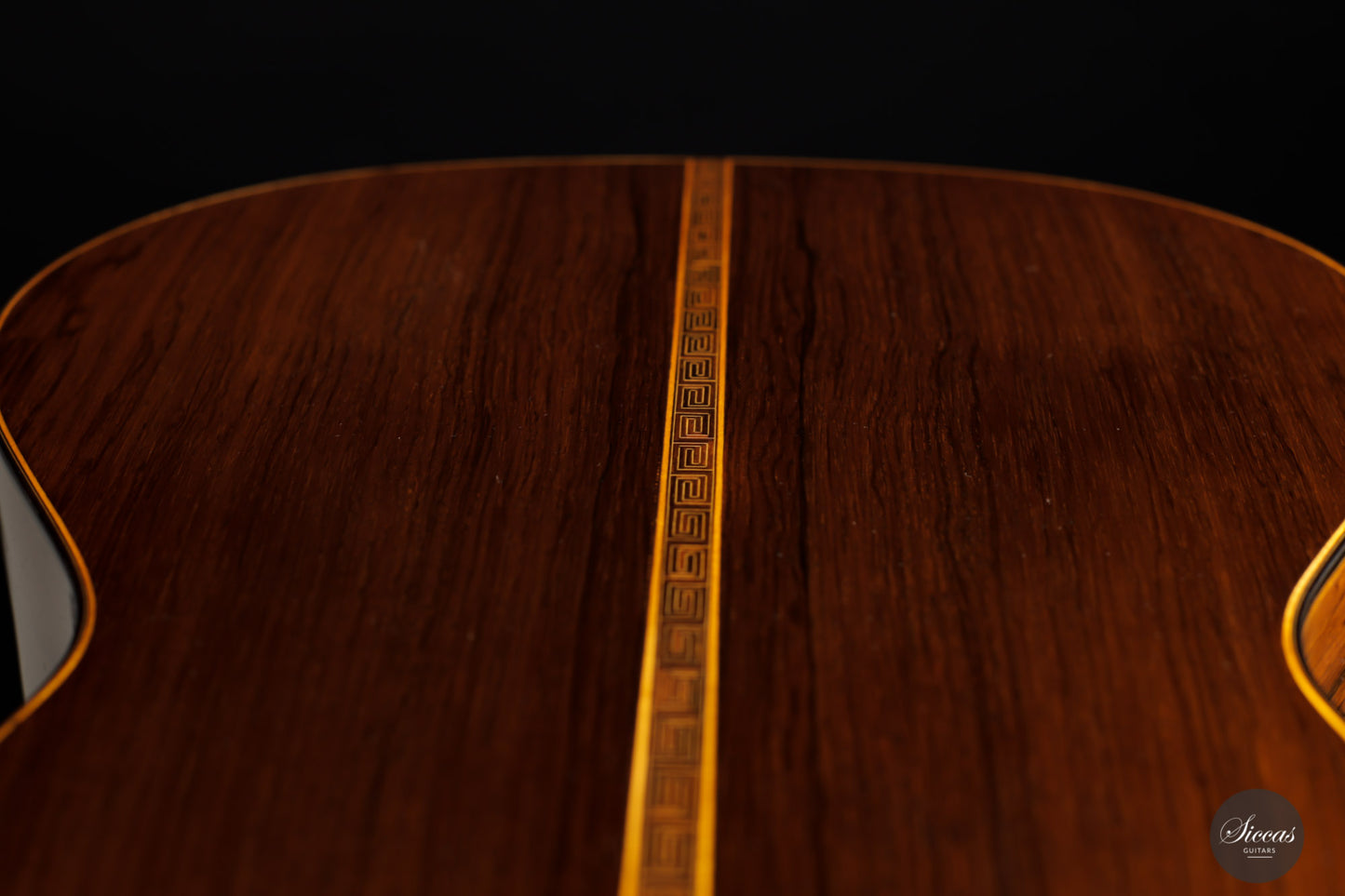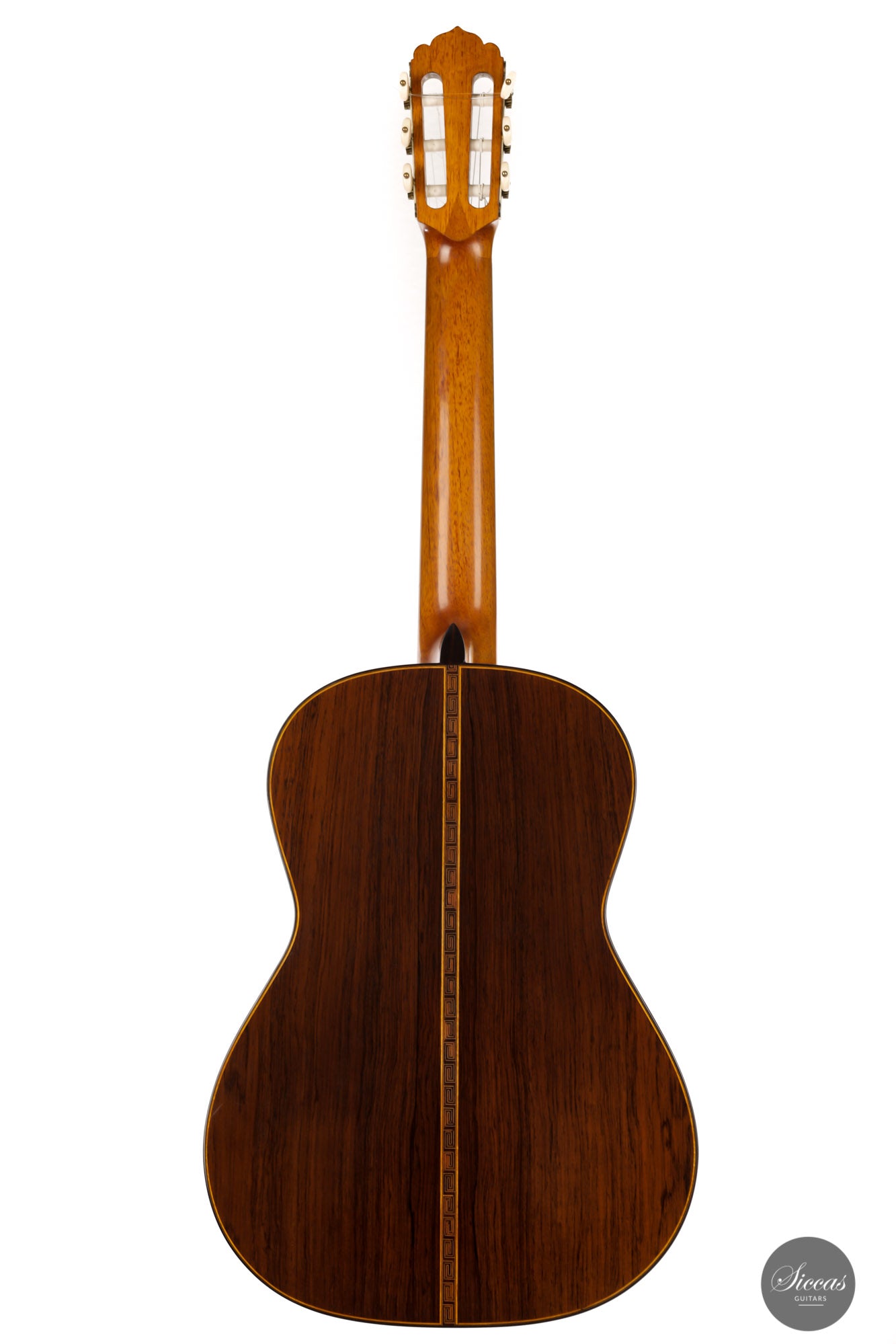 Diese atemberaubende Gitarre mit dem Namen *La Pagés* ist ein wahres Meisterwerk aus der gefeierten Schaffensperiode von Romanillos in den 1980er Jahren. Sie wurde 1984 in Semley gebaut und ist ein eindrucksvolles Zeugnis seiner Hingabe an Handwerkskunst und klangliche Exzellenz. Es handelt sich um eines der seltenen Modelle, das aus CITES-zertifiziertem brasilianischem Palisander für Boden und Zargen gefertigt wurde und mit einer kunstvollen Marketerie auf der Rückseite verziert ist, was ihre optische Eleganz noch unterstreicht.