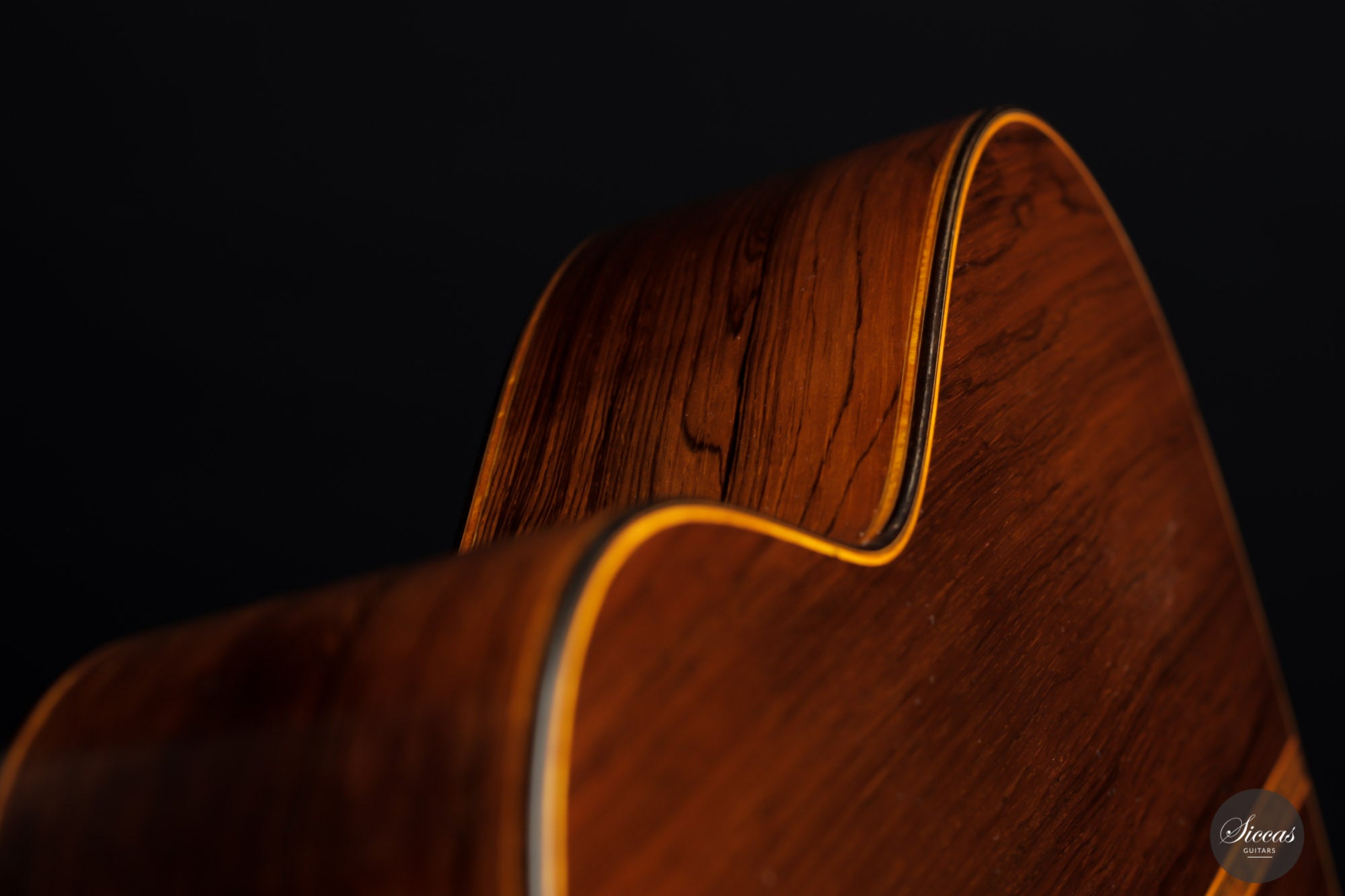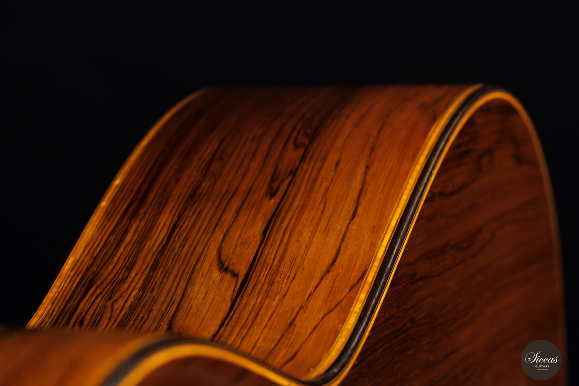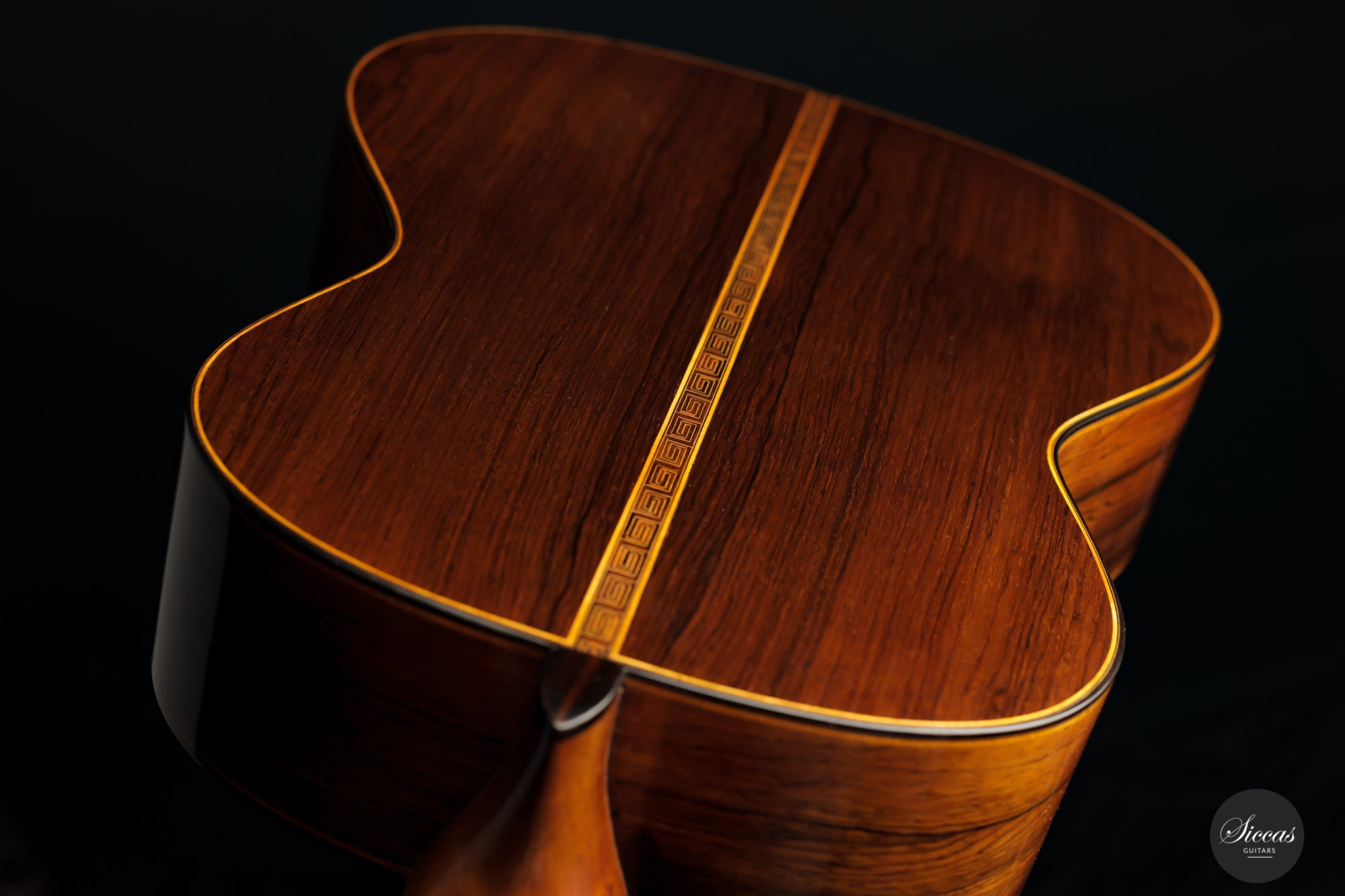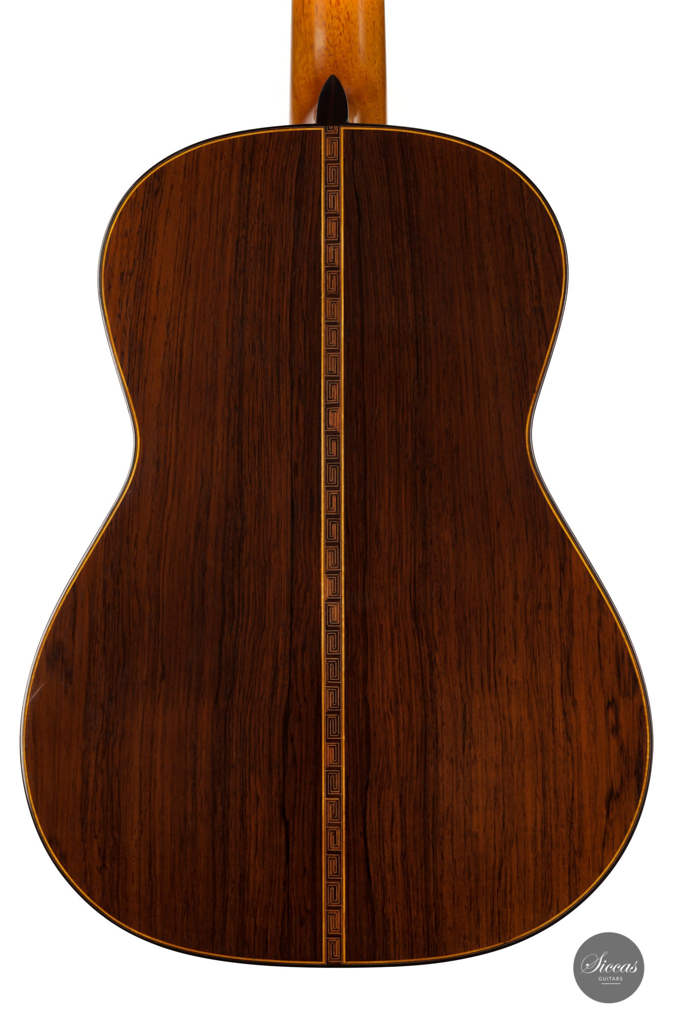 Diese atemberaubende Gitarre mit dem Namen *La Pagés* ist ein wahres Meisterwerk aus der gefeierten Schaffensperiode von Romanillos in den 1980er Jahren. Sie wurde 1984 in Semley gebaut und ist ein eindrucksvolles Zeugnis seiner Hingabe an Handwerkskunst und klangliche Exzellenz. Es handelt sich um eines der seltenen Modelle, das aus CITES-zertifiziertem brasilianischem Palisander für Boden und Zargen gefertigt wurde und mit einer kunstvollen Marketerie auf der Rückseite verziert ist, was ihre optische Eleganz noch unterstreicht.